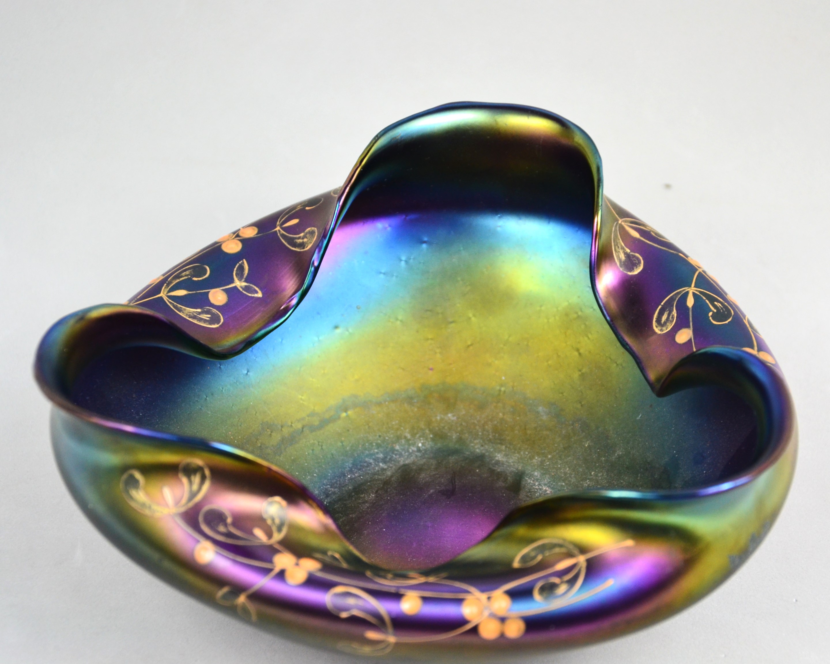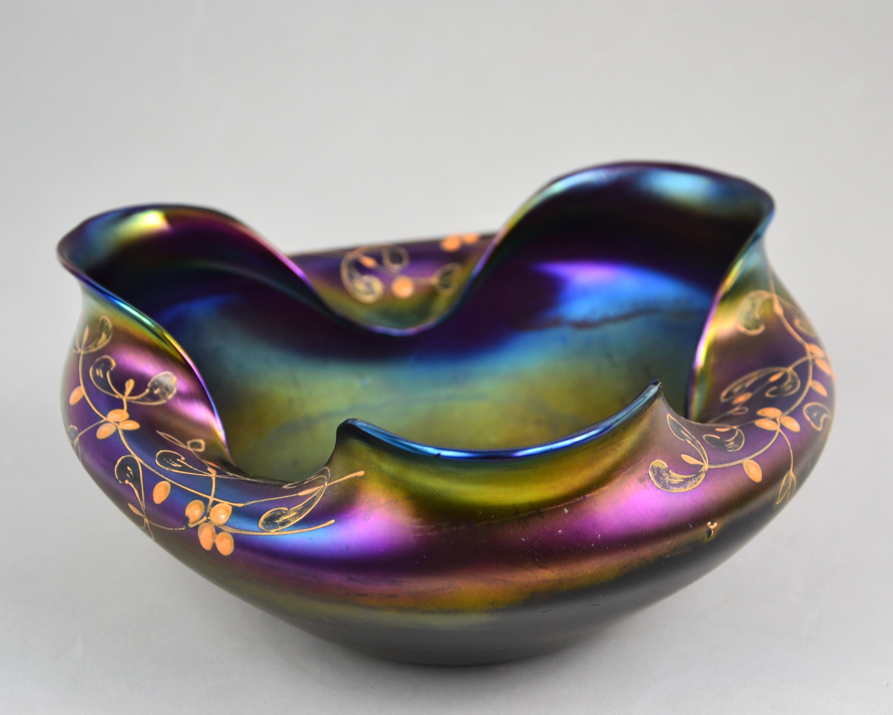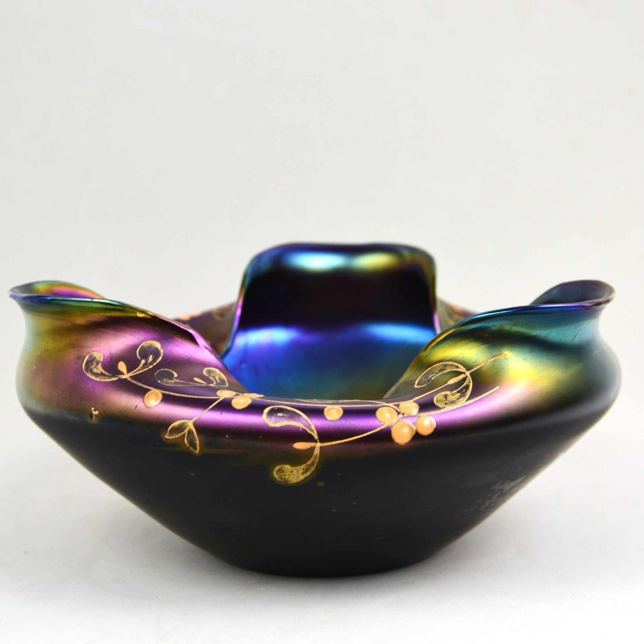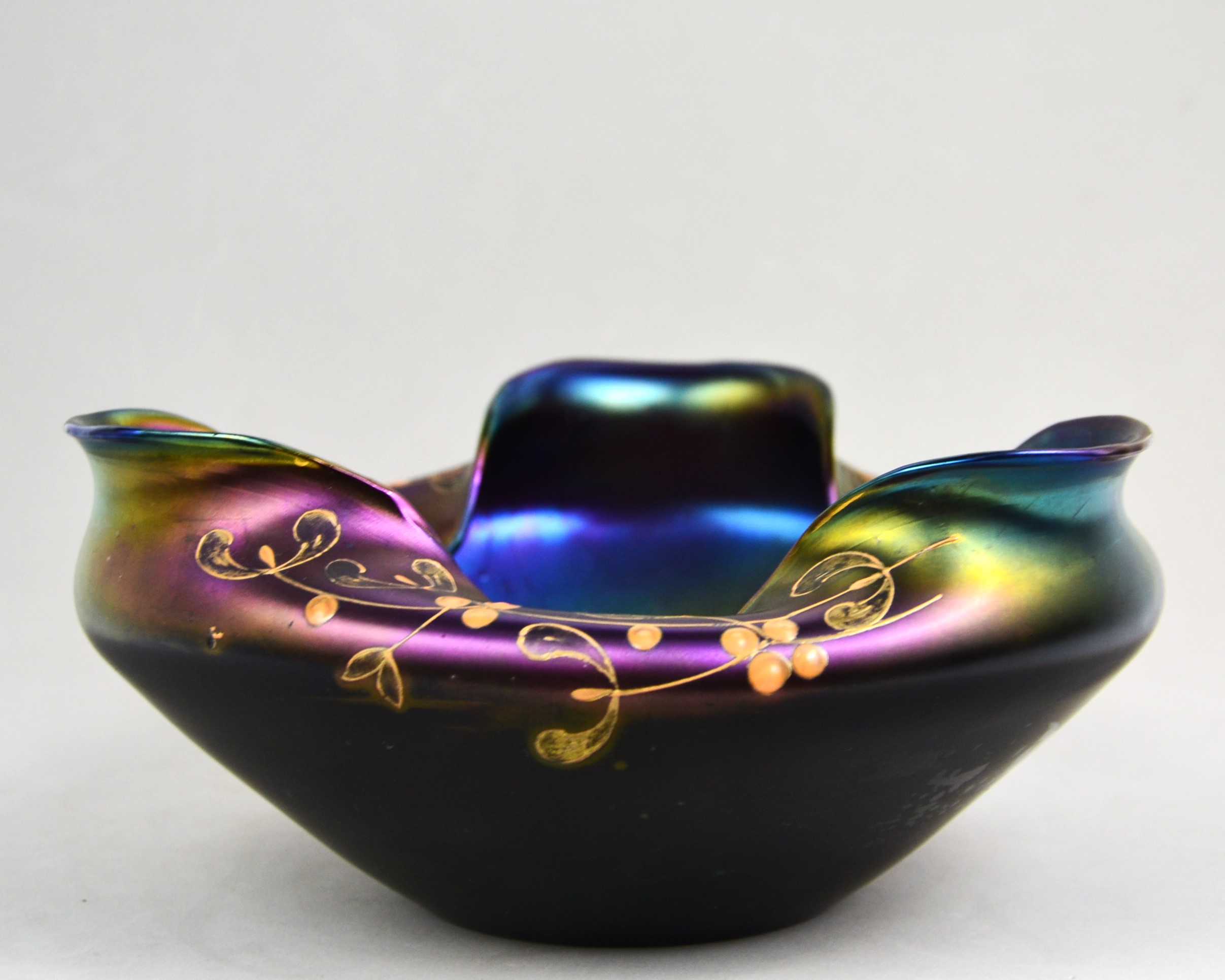 Misa iryzująca, fiolet i złote kwiaty, secesja ok.1900r Loetz Glass Bohemia ( ?)
