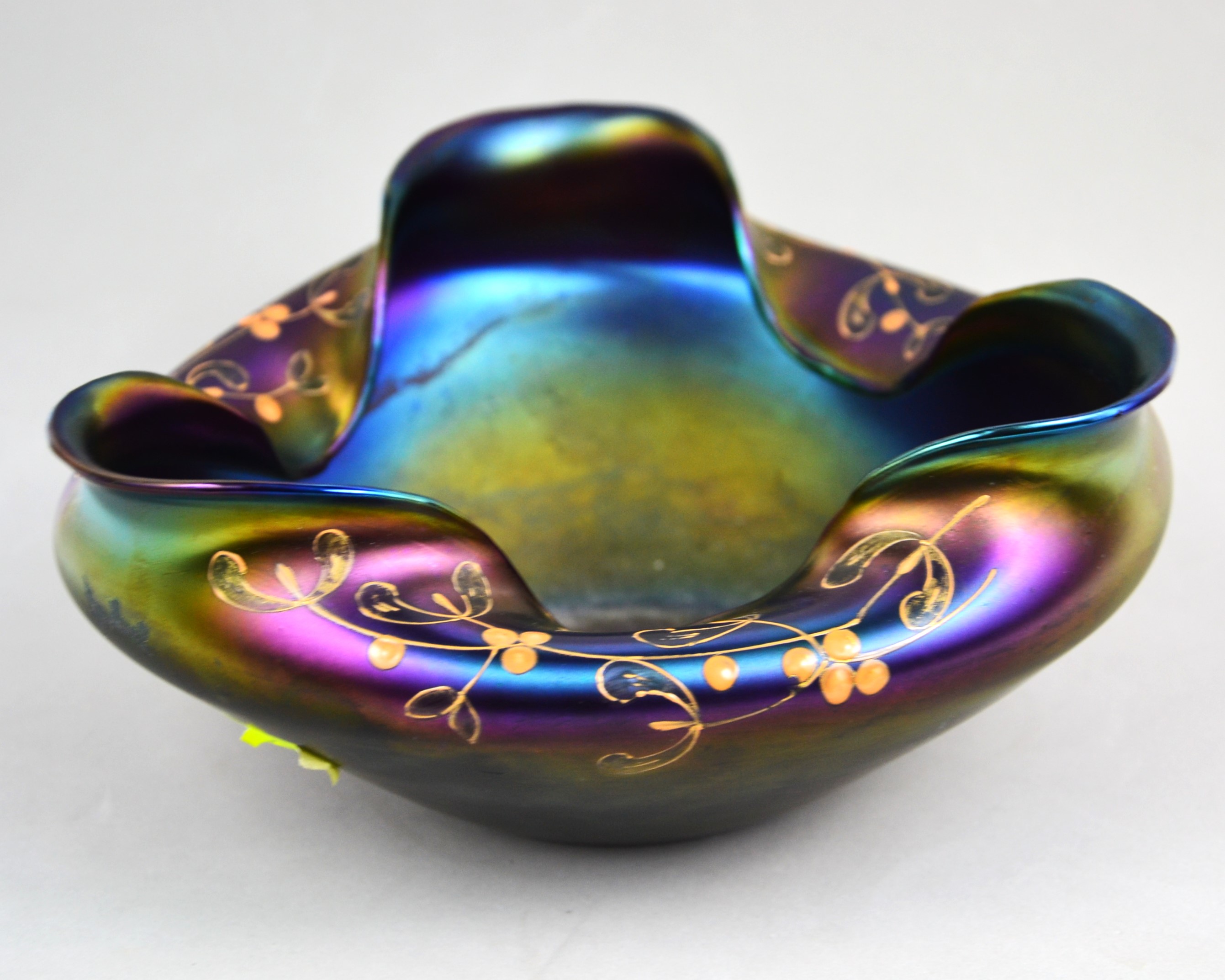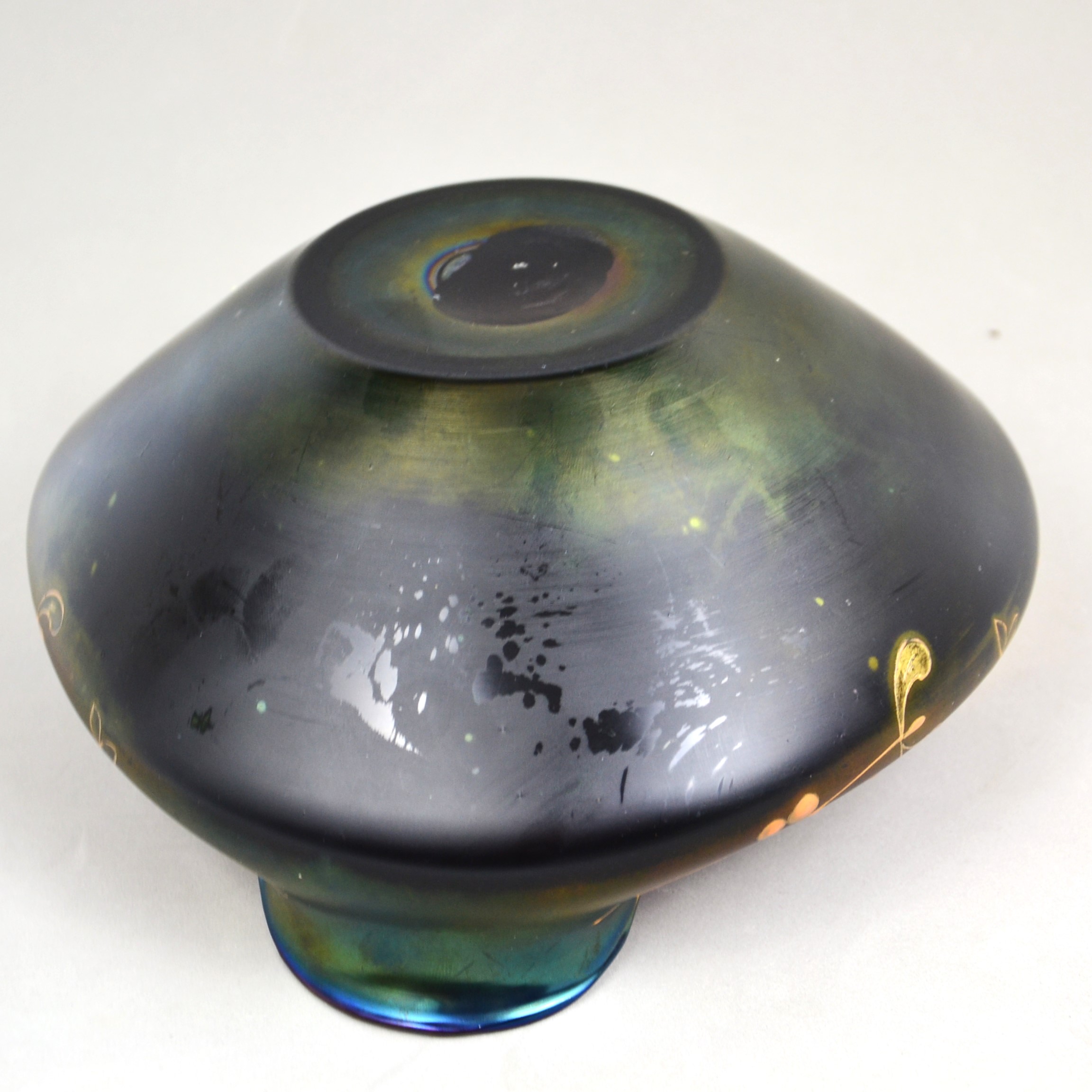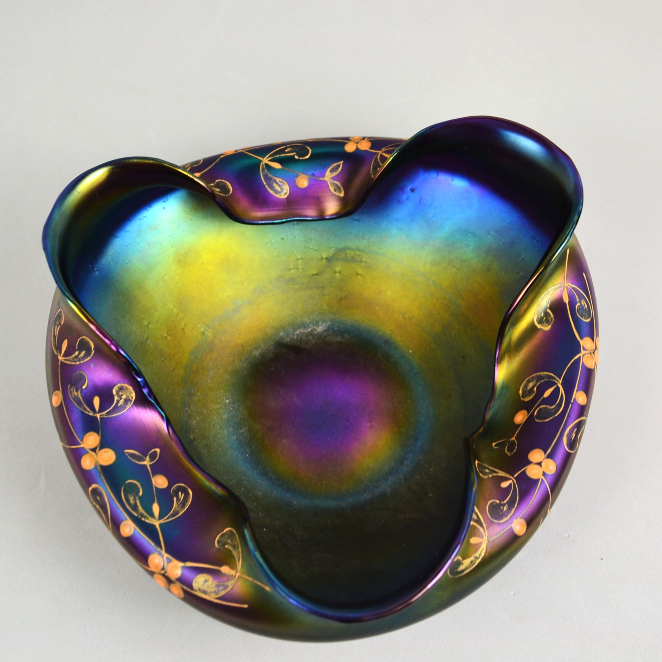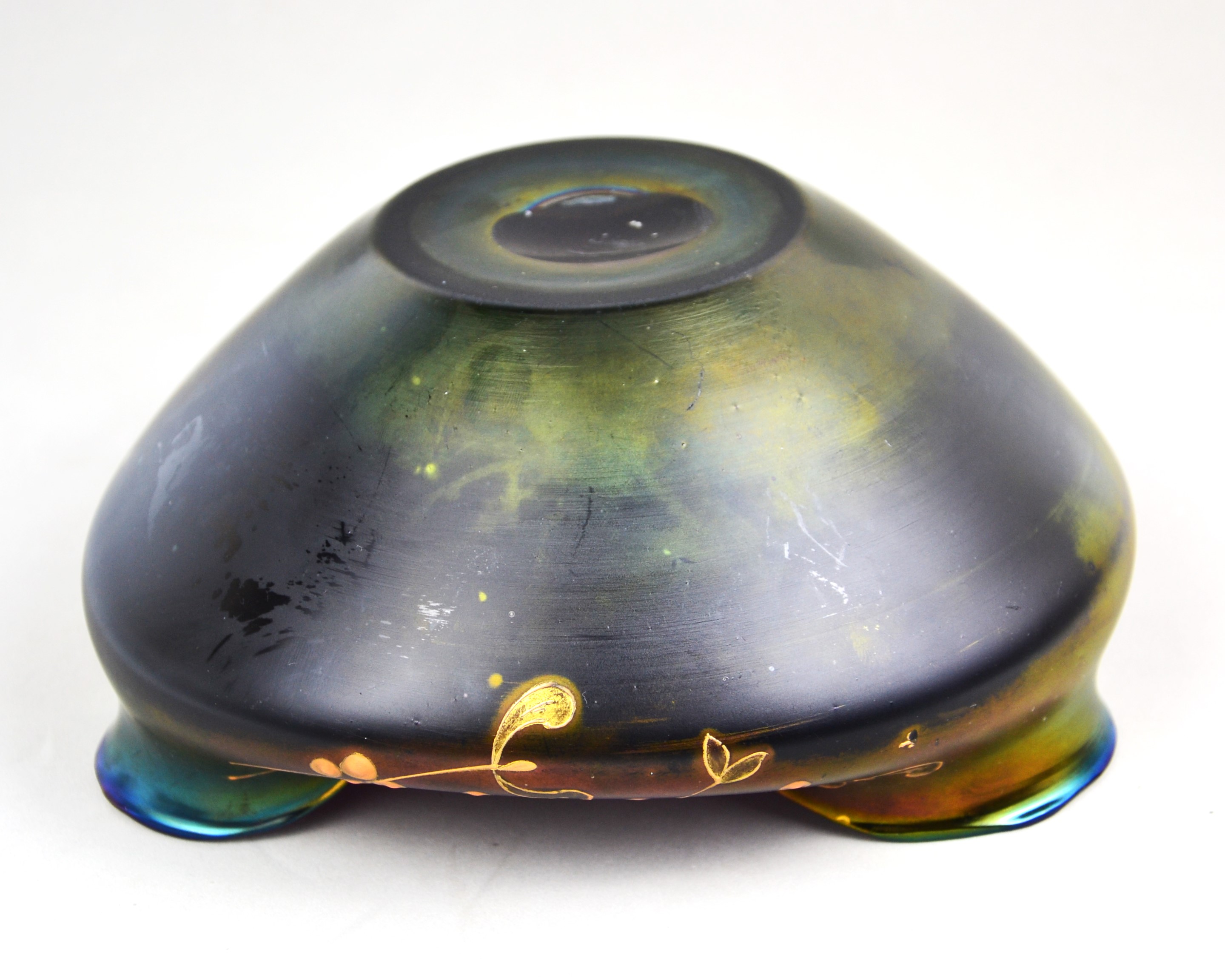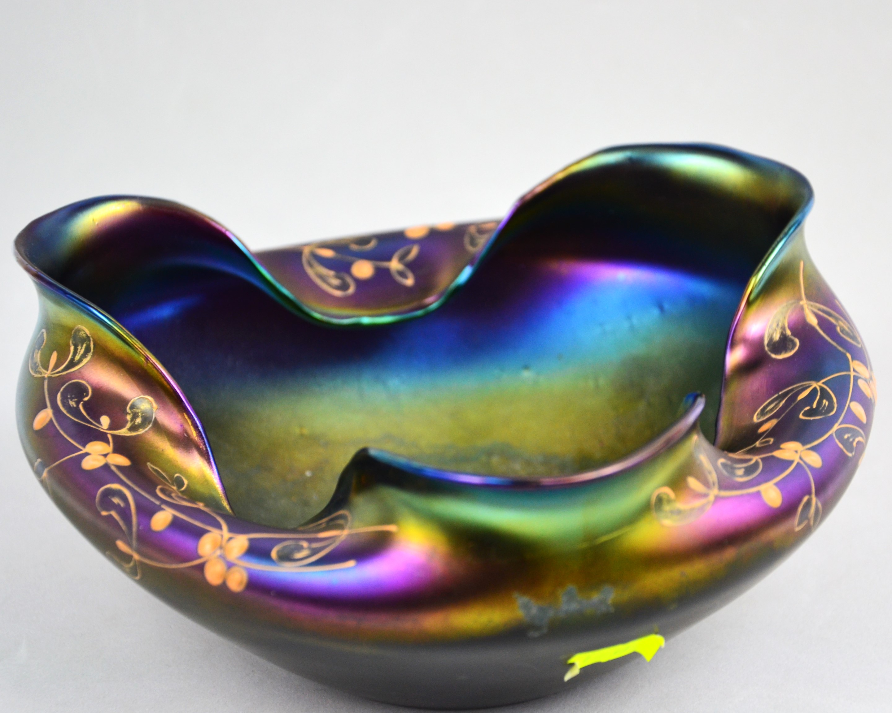 Misa iryzująca, fiolet i złote kwiaty, secesja ok.1900r Loetz Glass Bohemia ( ?)