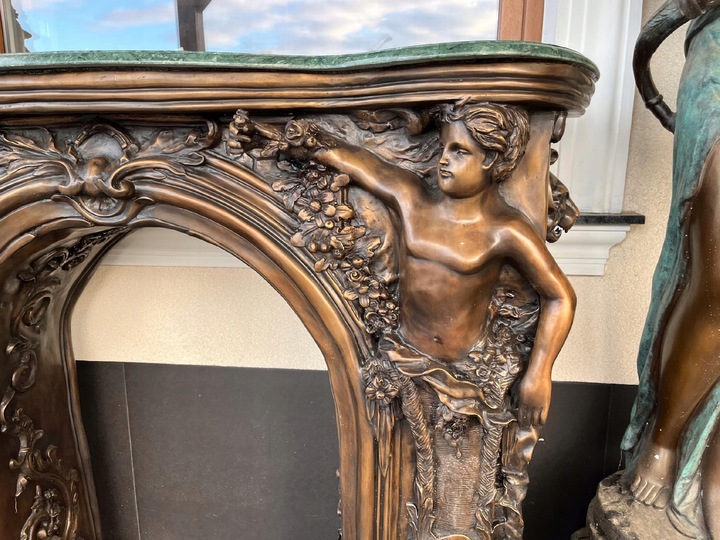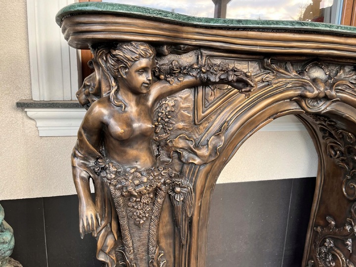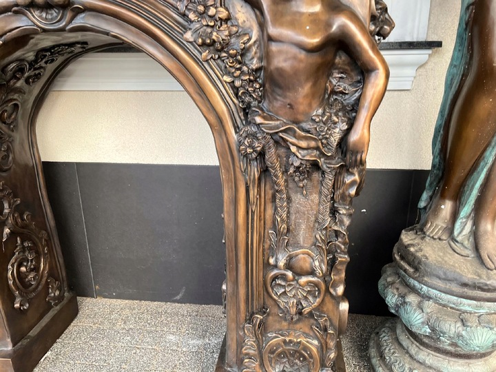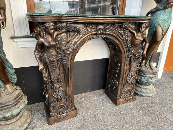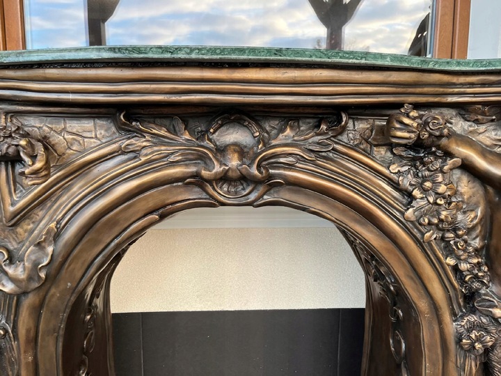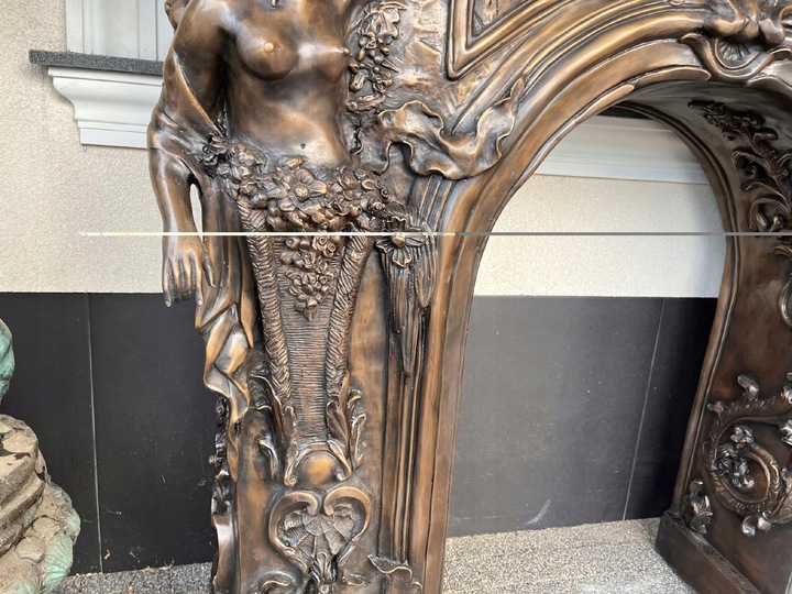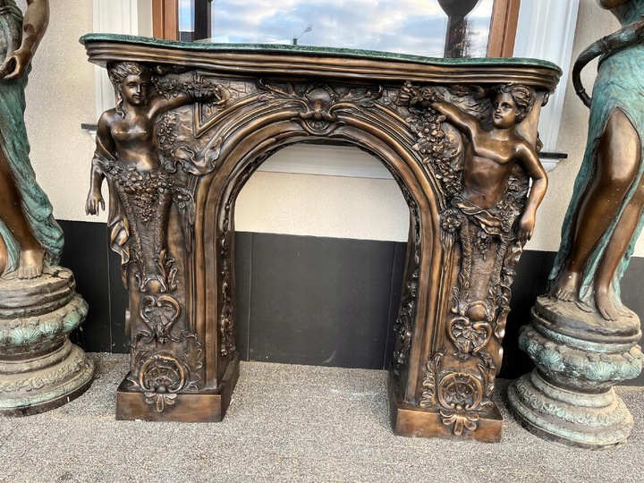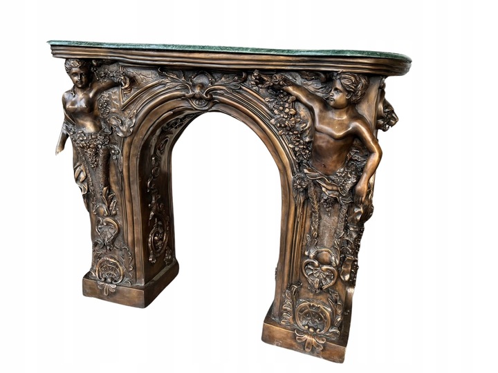 MONUMENTALNY KOMINEK Z BRĄZU postacie portal kominkowy