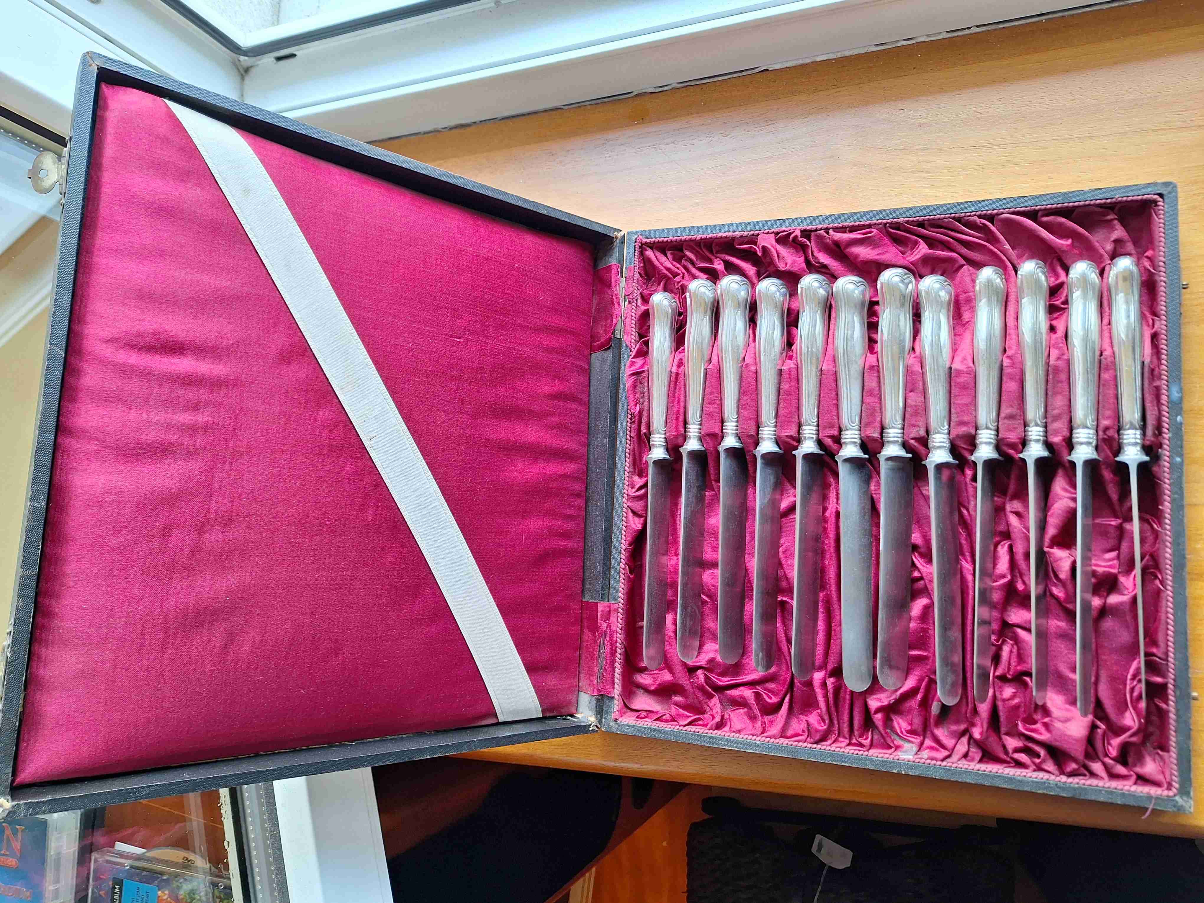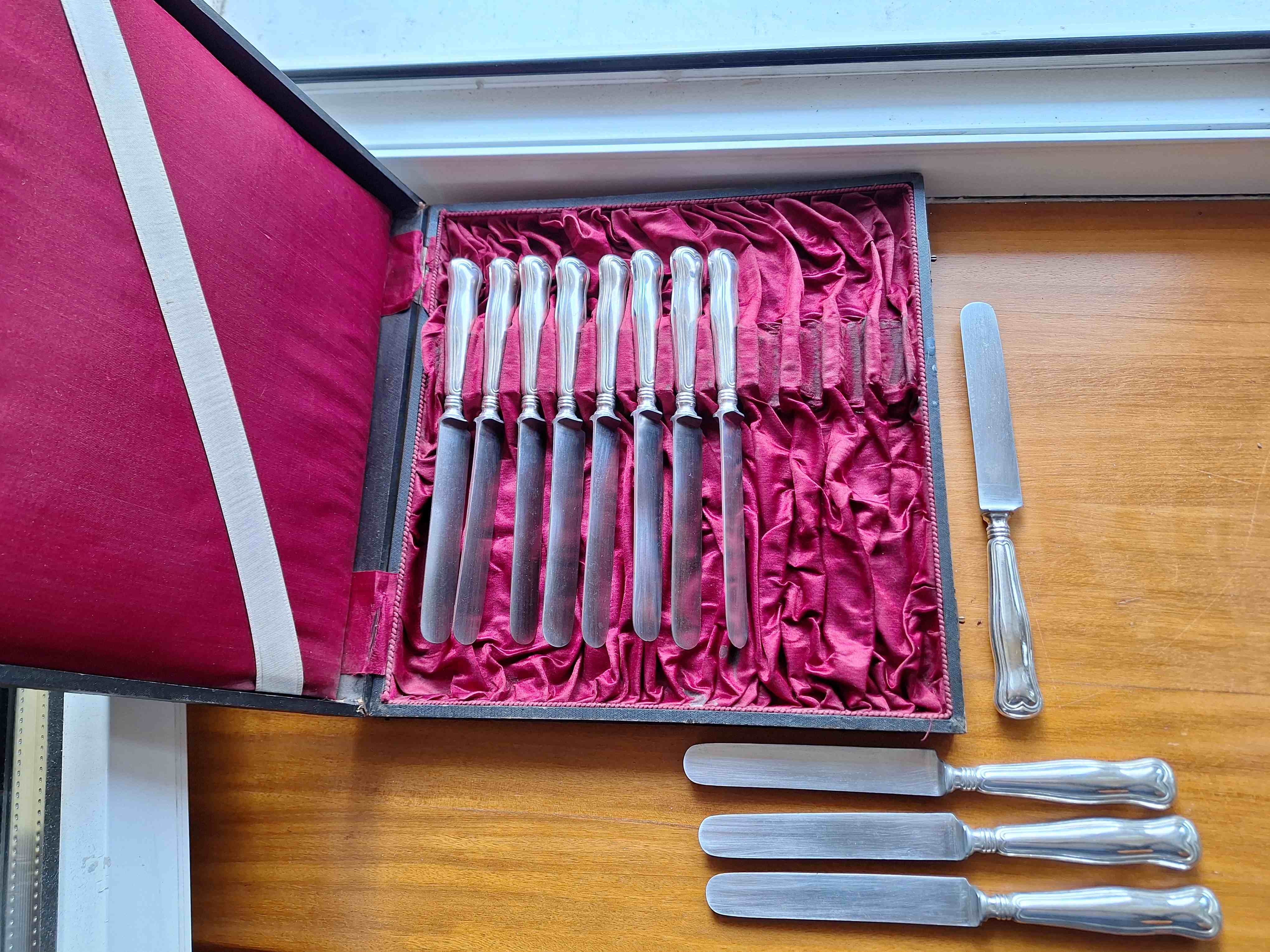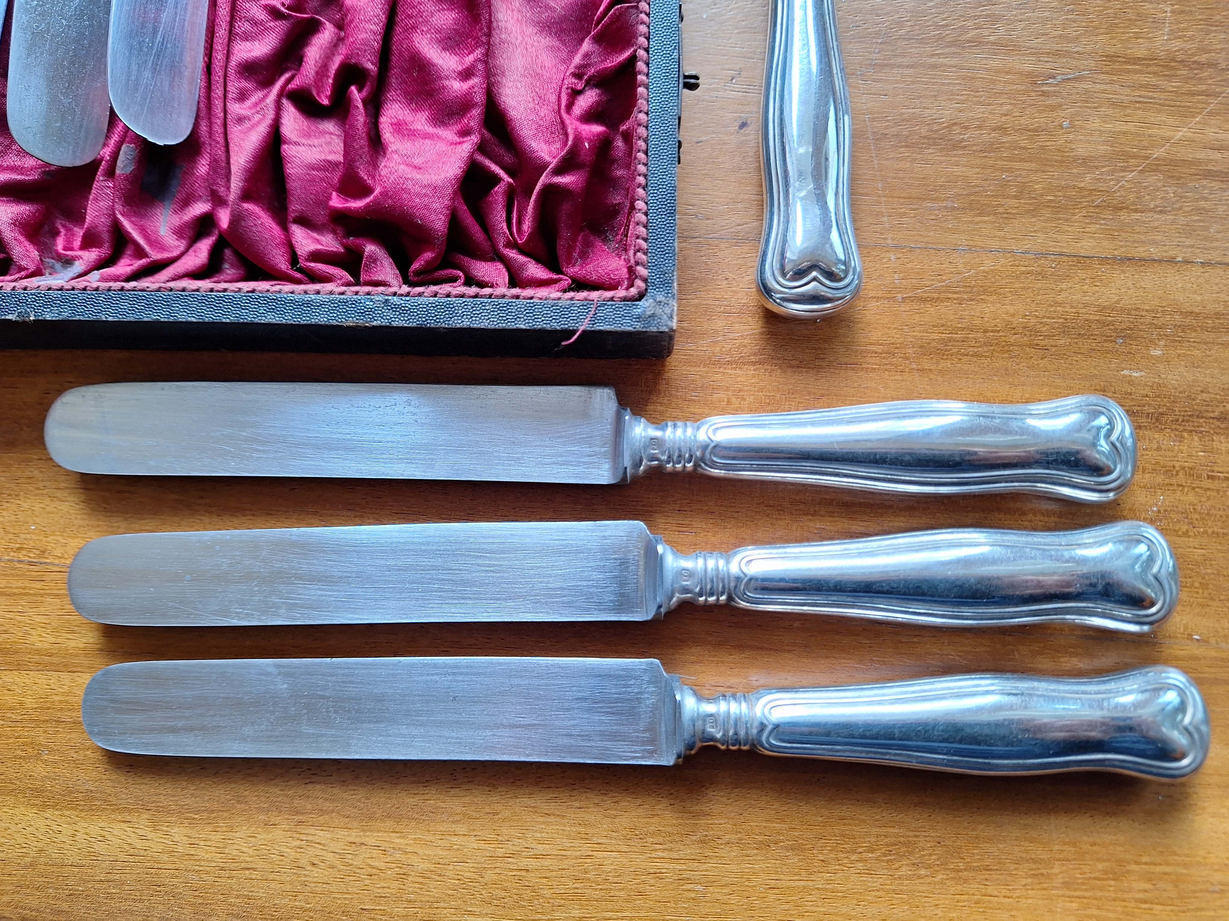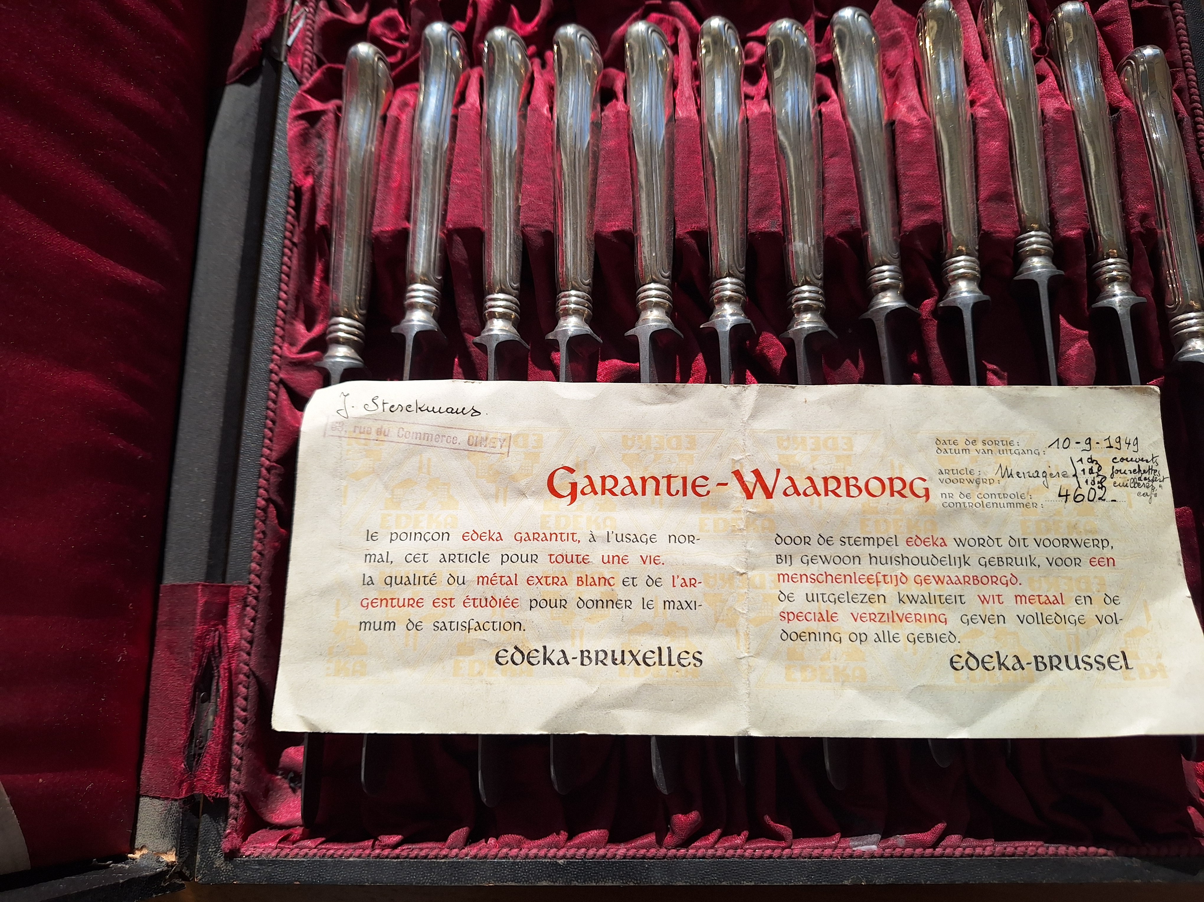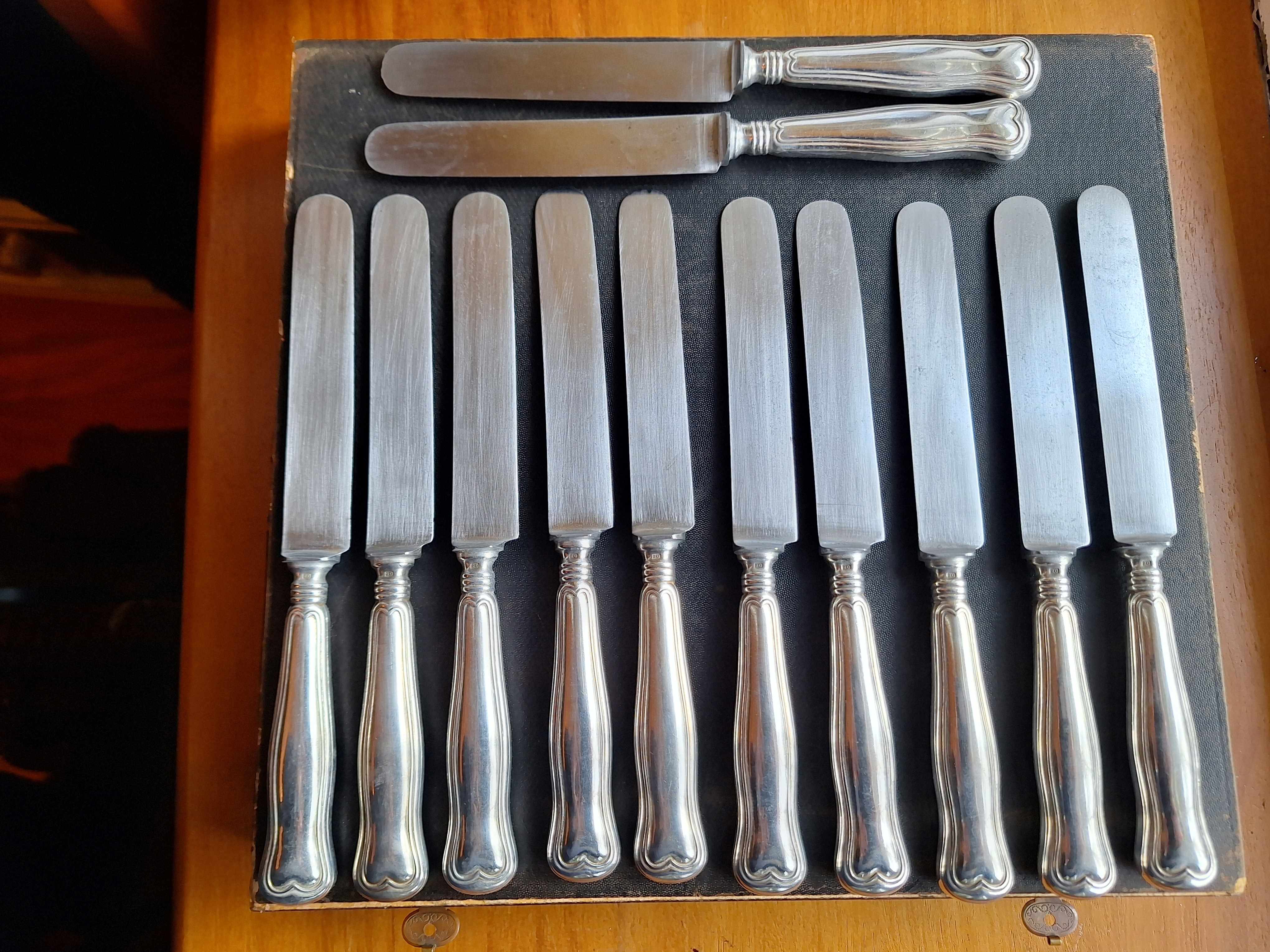 Poz. 846-2 : Nakrycia stołowe (plater): Noże Średnie – plater sygnowany (20), część zestawu sztućców z pracowni J.Sterekmans, Ciney, Belgia z 1949 roku // 12szt. w etui z certyfikatem