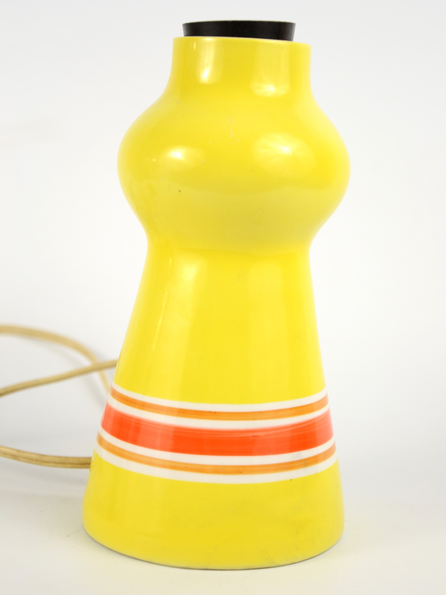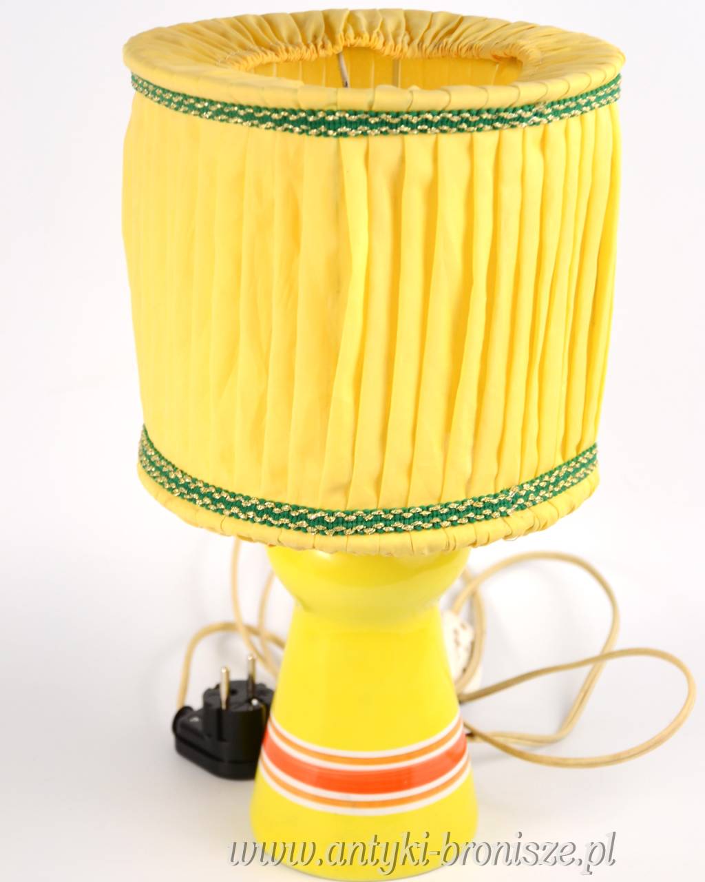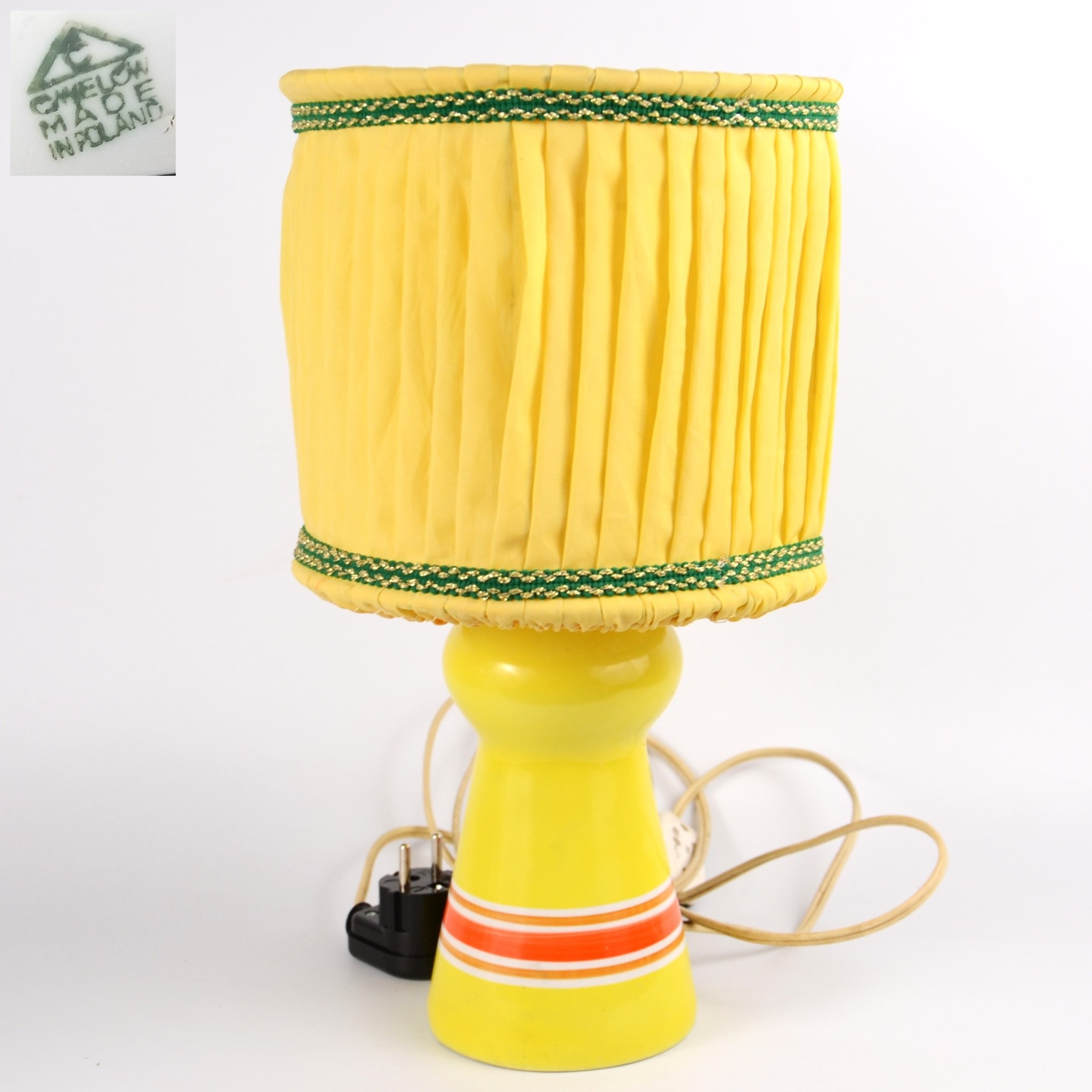 Designerska porcelanowa lampa stołowa z plisowanym abażurem, oryginalnym z epoki. Wyrób z lat 60tych sygnowany znakiem Zakładów Porcelany Stołowej Ćmielów. Ładna modernistyczna forma, żółta kolorystyka z biało pomarańczowymi paskami. Wzór bardzo rzadko spotykany na rynku antyków. Lampa sprawna, zachowana w bardzo dobrym stanie z minimalnymi śladami użytkowania, porcelana bez defektów. Wysokość maksymalna 37cm , wys. porcelanowego korpusu 20 cm. , średnica podstawy 11 cm. Designerów, kolekcjonerów pikasów i znawców tematu zachęcam do zakupu. Zdecydowanie polecam.