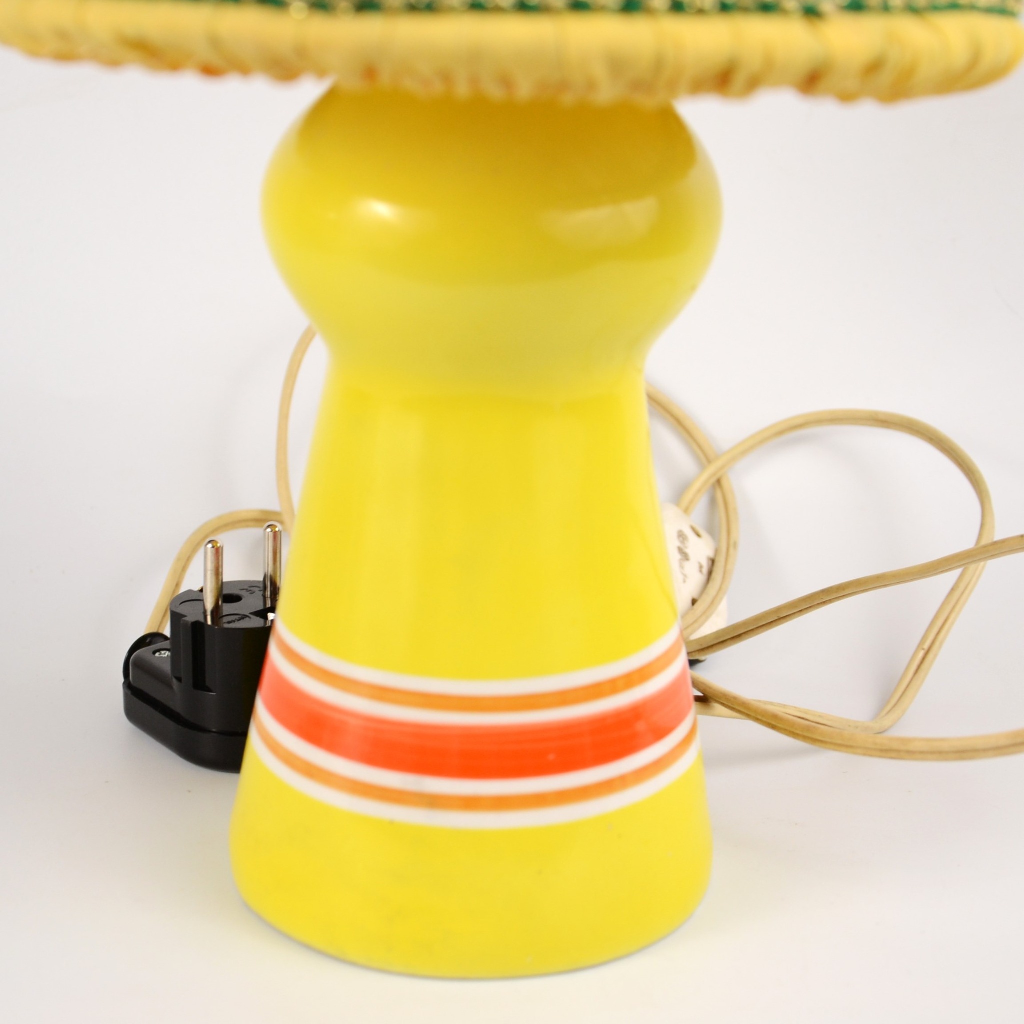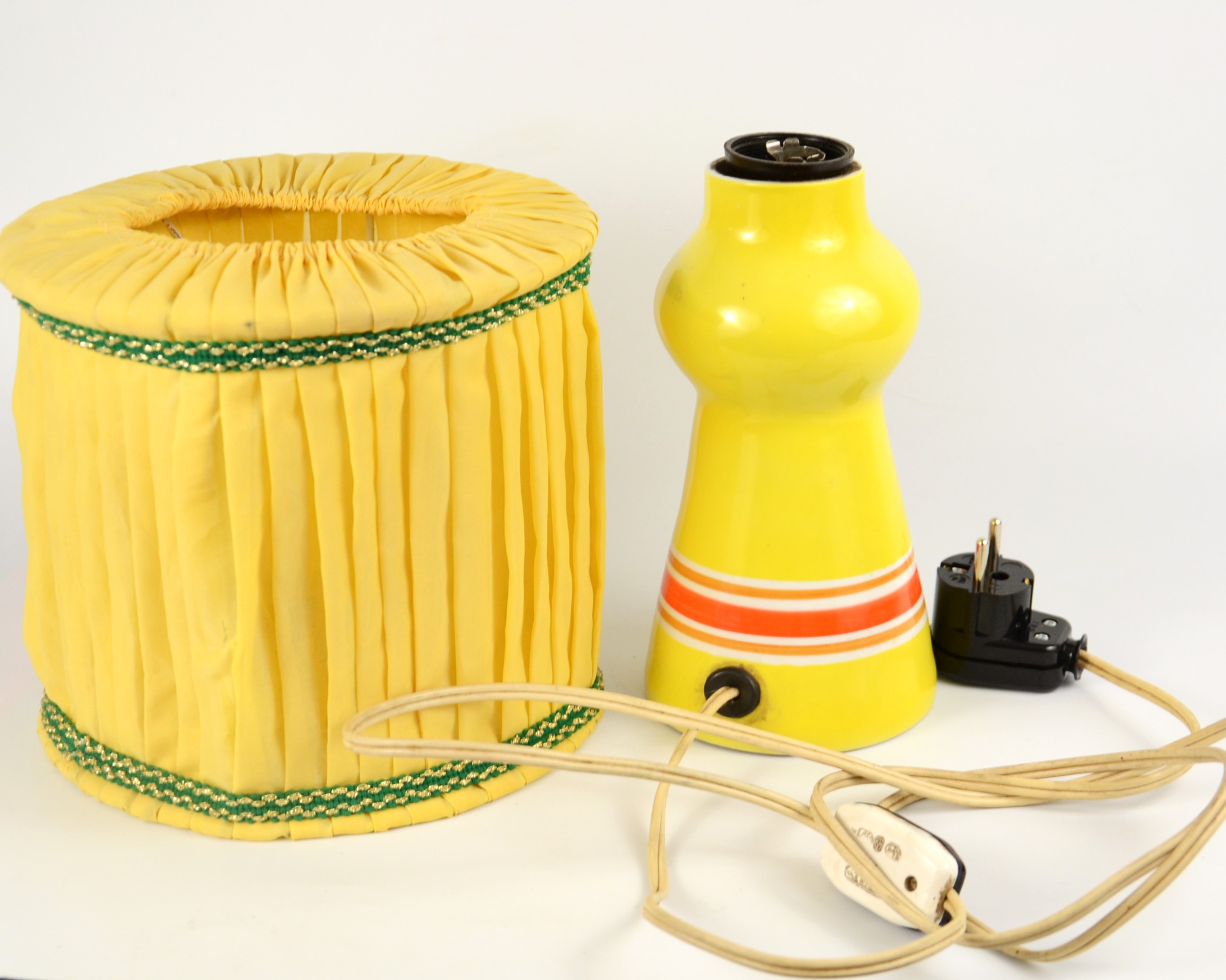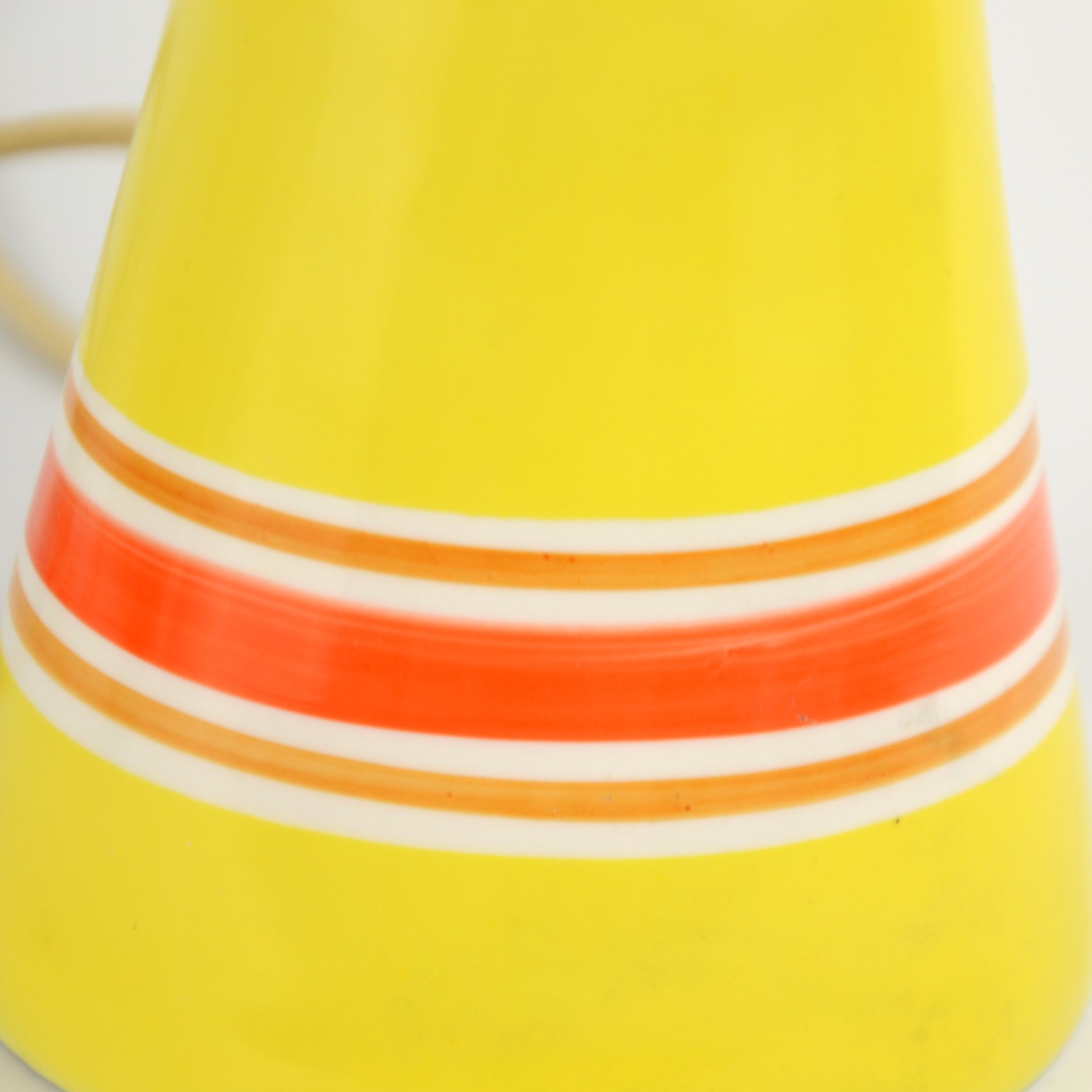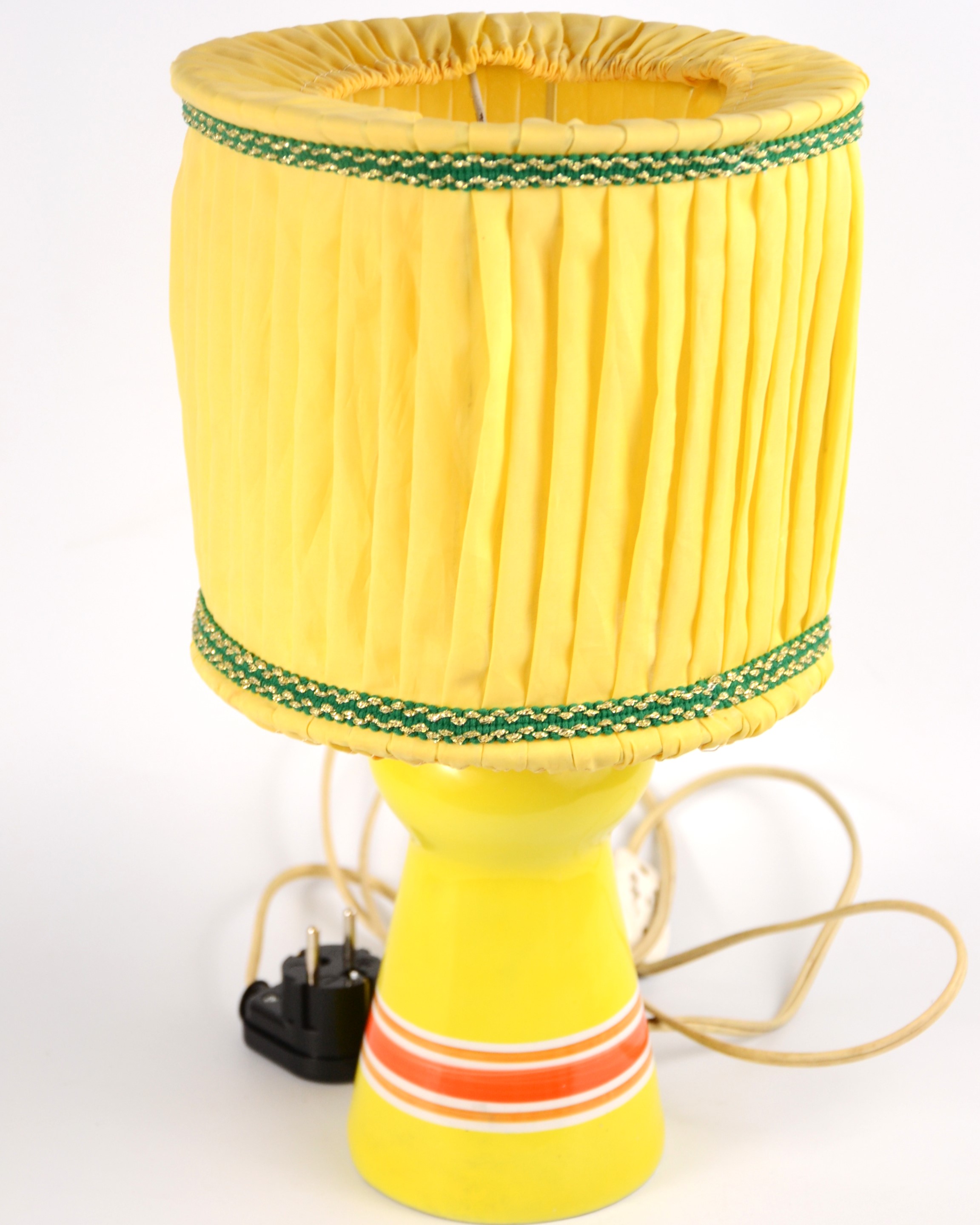 Designerska porcelanowa lampa stołowa z plisowanym abażurem, oryginalnym z epoki. Wyrób z lat 60tych sygnowany znakiem Zakładów Porcelany Stołowej Ćmielów. Ładna modernistyczna forma, żółta kolorystyka z biało pomarańczowymi paskami. Wzór bardzo rzadko spotykany na rynku antyków. Lampa sprawna, zachowana w bardzo dobrym stanie z minimalnymi śladami użytkowania, porcelana bez defektów. Wysokość maksymalna 37cm , wys. porcelanowego korpusu 20 cm. , średnica podstawy 11 cm. Designerów, kolekcjonerów pikasów i znawców tematu zachęcam do zakupu. Zdecydowanie polecam.