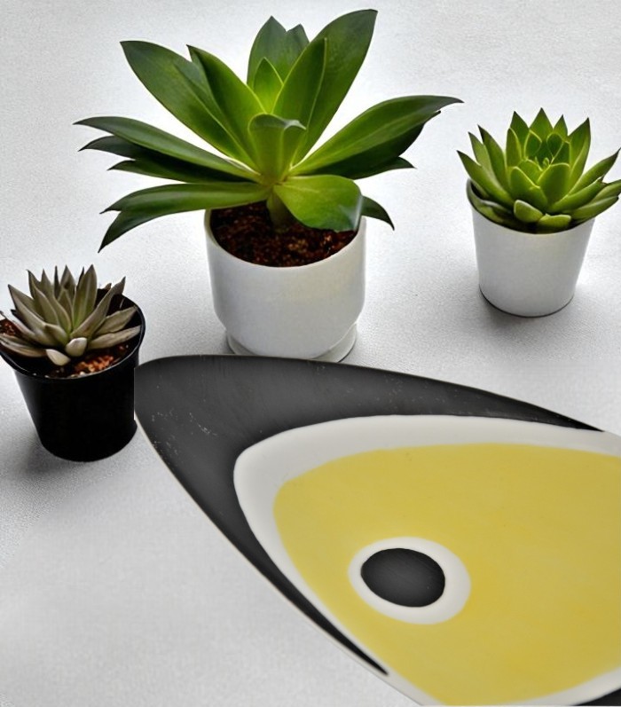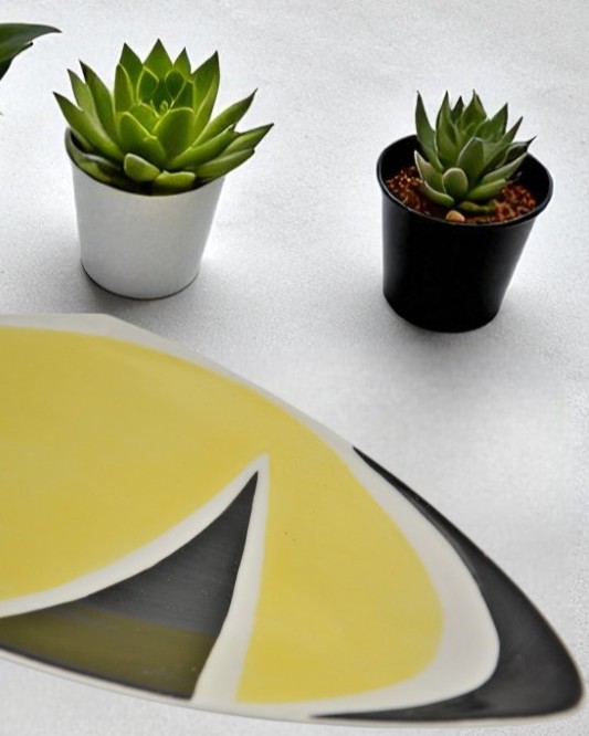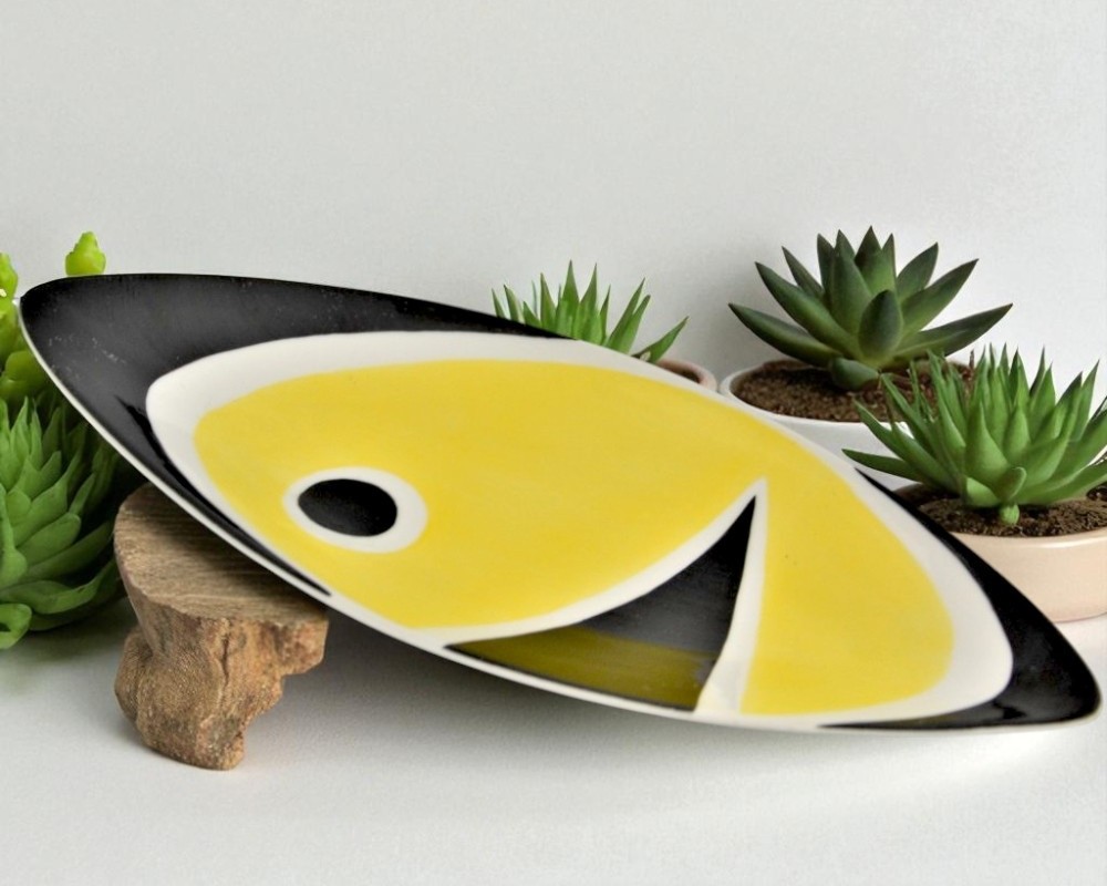 Oryginalna porcelanowa patera w kształcie łódki sygnowana znakiem węgierskiej wytwórni porcelany Zsolnay. Przykład wspaniałego wzornictwa z lat 60-tych, które obecnie przeżywa swój renesans. Jeden z projektów Jánosa Török (1932-1996) słynnego węgierskiego artysty ceramika i rzeźbiarza. Interesująca modernistyczna forma dekoracje a'la Picasso, kolorystyka biało żółto czarna. Wspaniała godna polecenia wiekowa, na topie, wykonana z wysokiej jakości porcelany renomowanej firmy. zachowana w bardzo dobrym stanie, niewielkie ślady użytkowania, drobne ryski na czarnej malaturze są bardziej widoczne na fotografiach niż w rzeczywistości . Wysokość 2,5 cm. średnica 11 cm. x 29 cm. Kolekcjonerów wszelkich pikasów, designerów i znawców tematu zachęcam do zakupu.