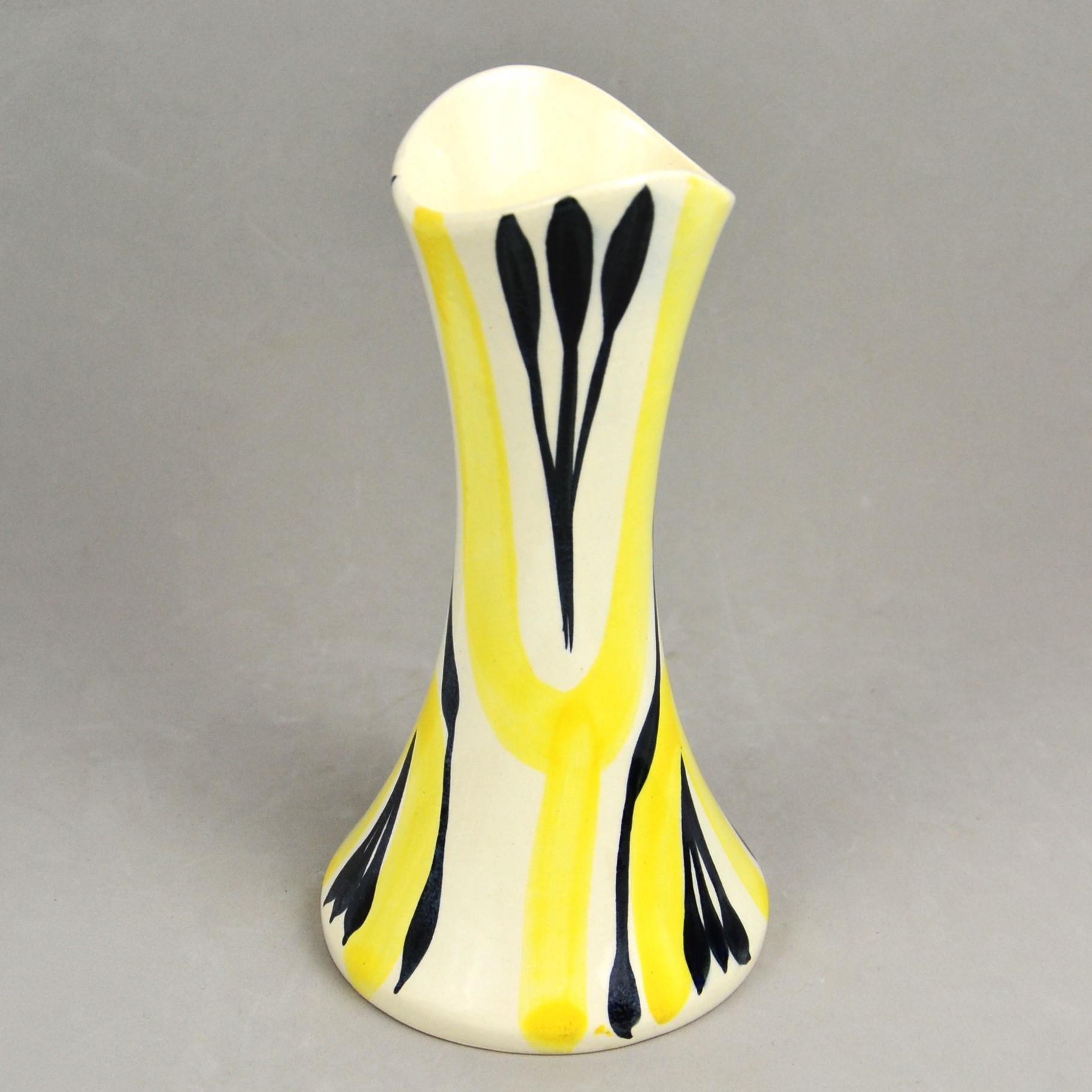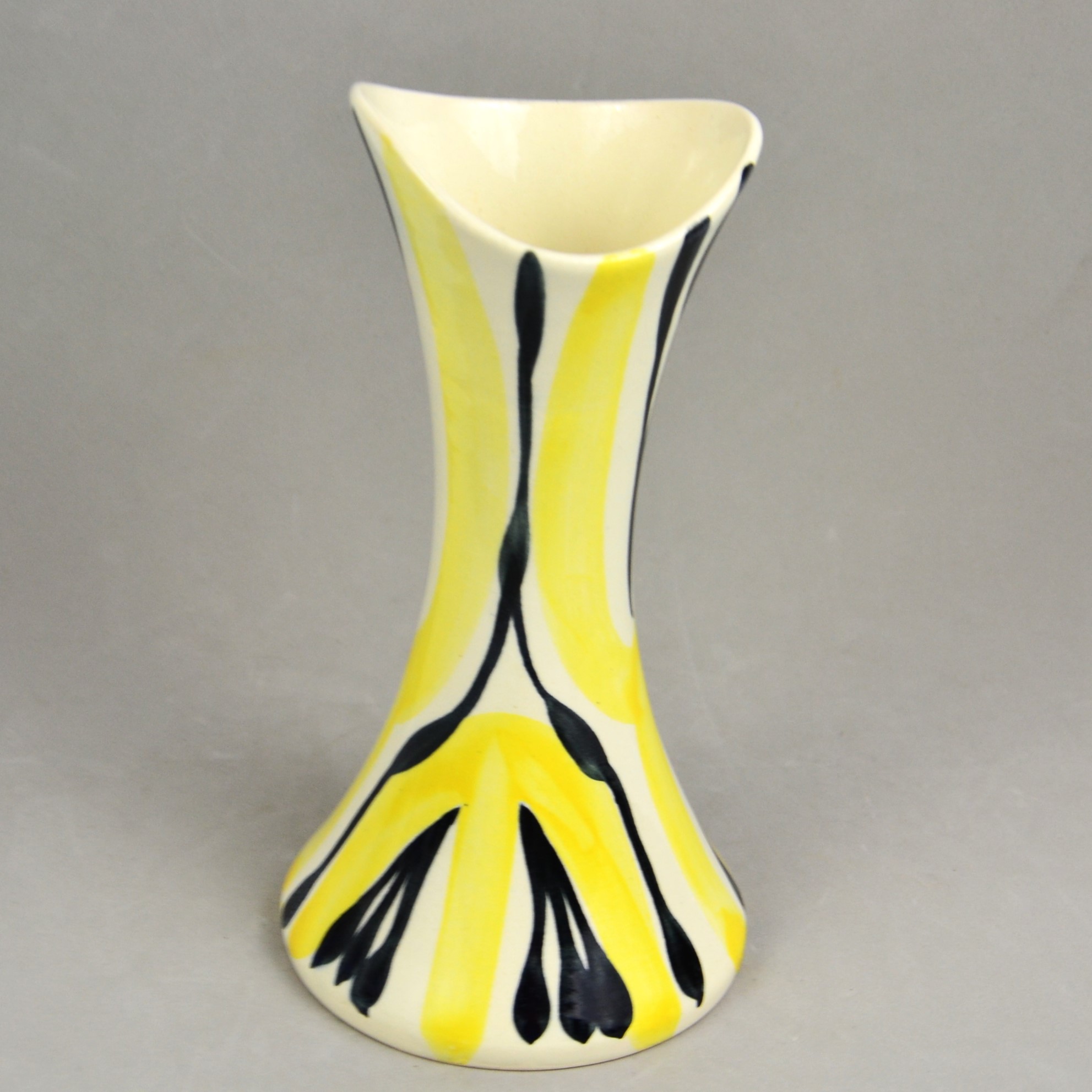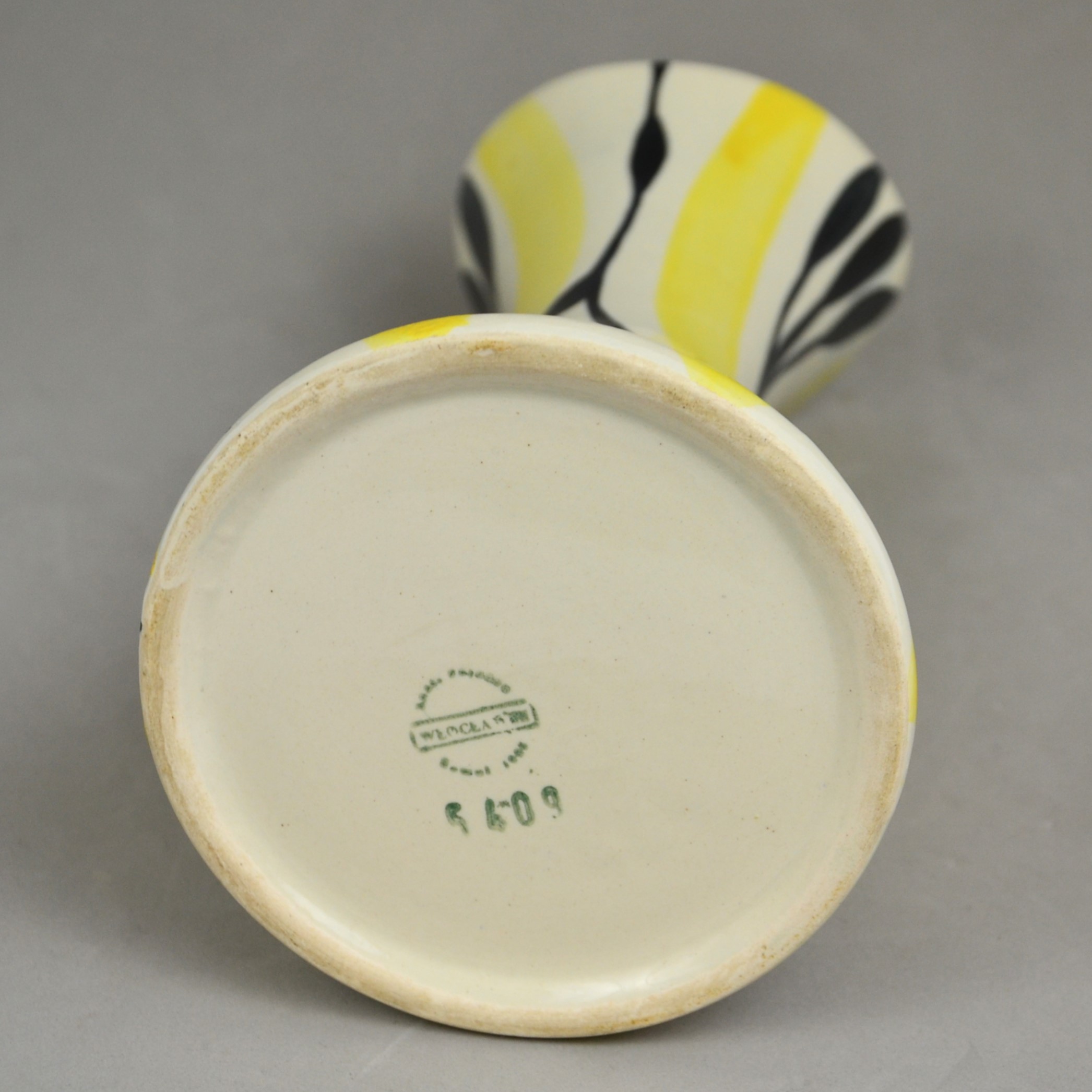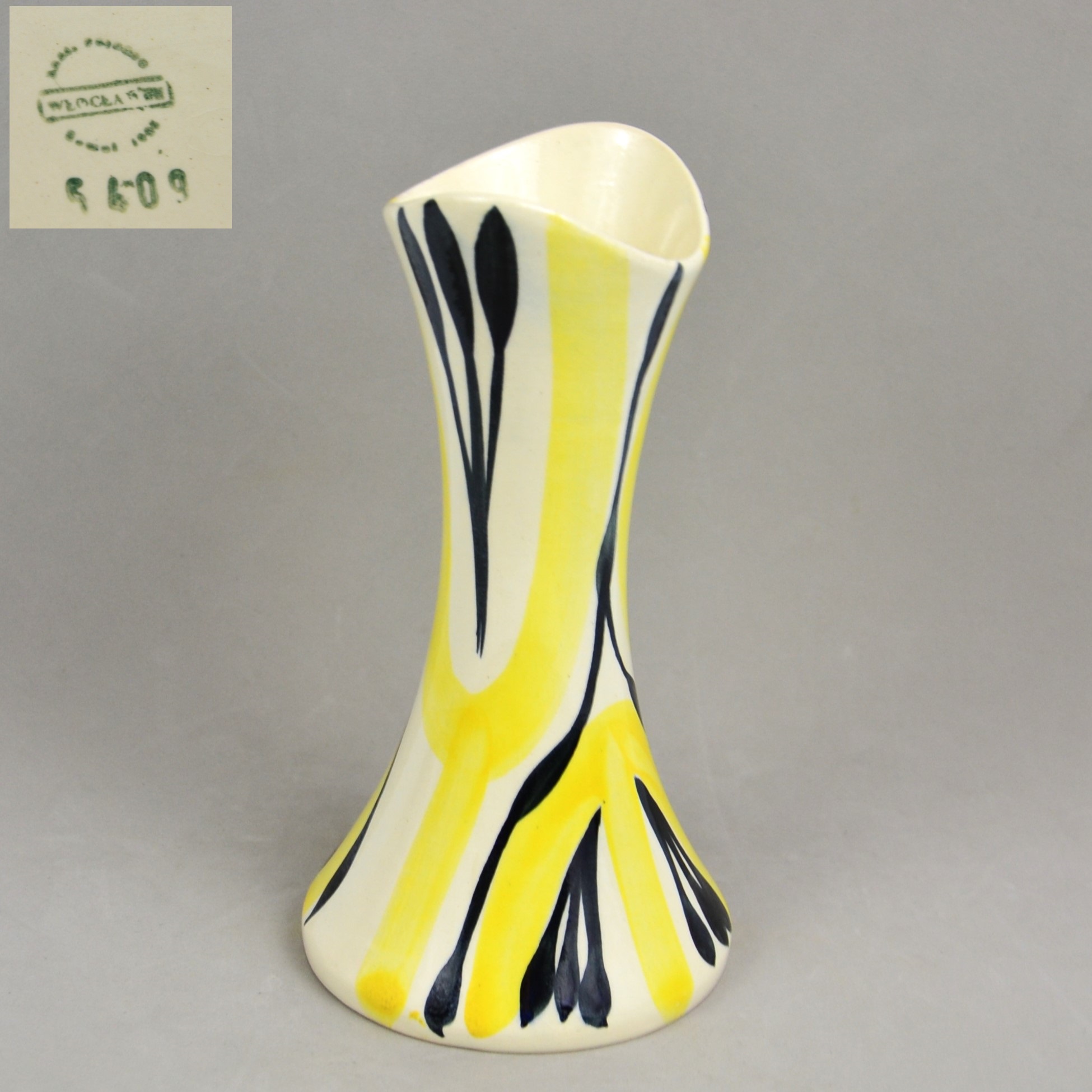 New Look do kolekcji pikasiaków Kolekcjonerski fajansowy wazon z 1960r projektant Jan Sowiński , wzór nr 424 (wg.Muzeum Ziemi Kujawskiej) Fabryka Fajansu Włocławek Wspaniały przykład polskiego designu połowy z XXw, modernistyczna, forma, kształt klepsydry, dekoracja a'la Picasso, żółto czarna kolorystyka. Wymiary: wys.20,5 cm., średnica podstawy 10,5 cm. stan ogólny bardzo dobry, minimalne ślady użytkowania. Wazon godny polecenia unikalny, wiekowy, na topie . Designerów, kolekcjonerów i znawców tematu zachęcam do zakupu.