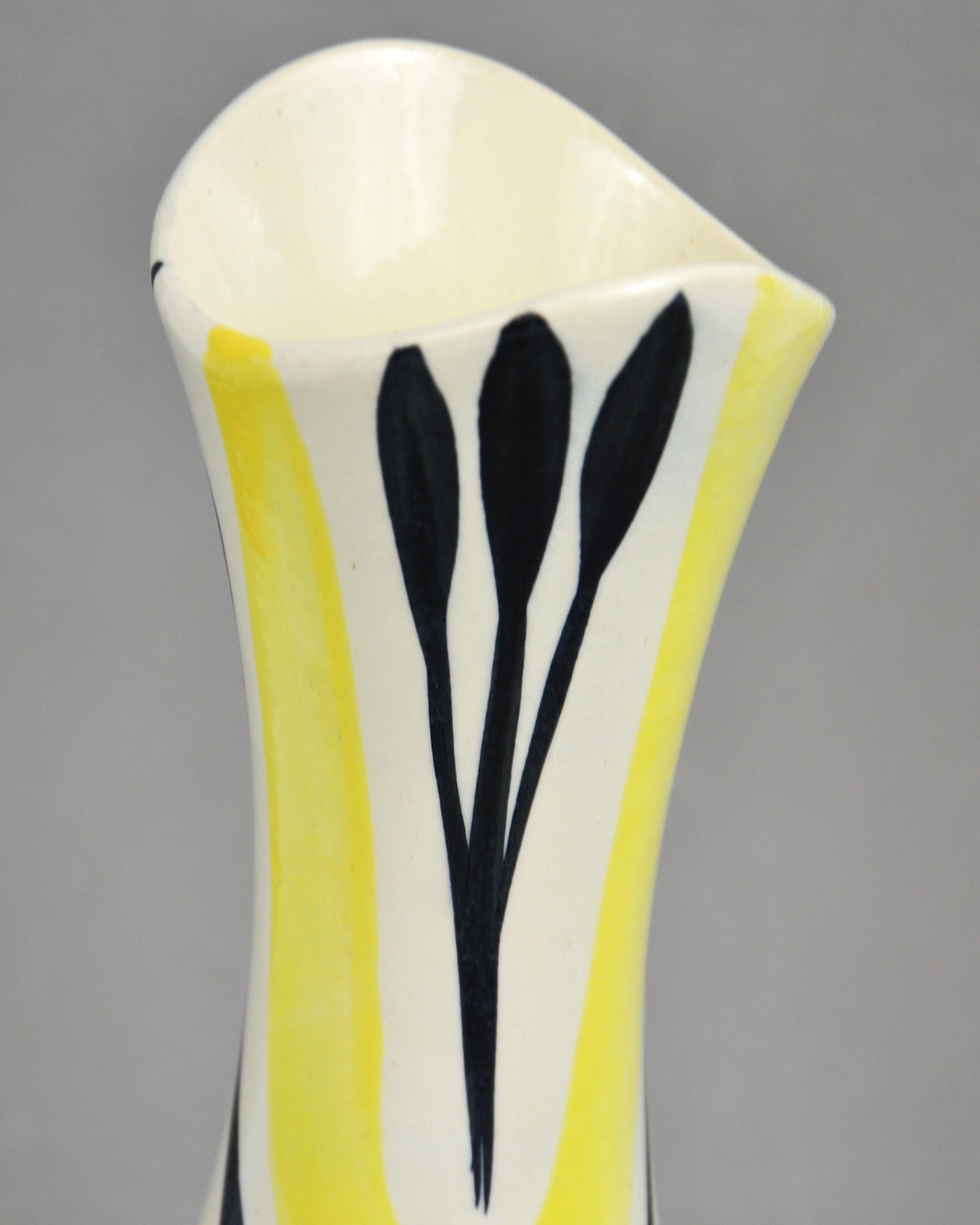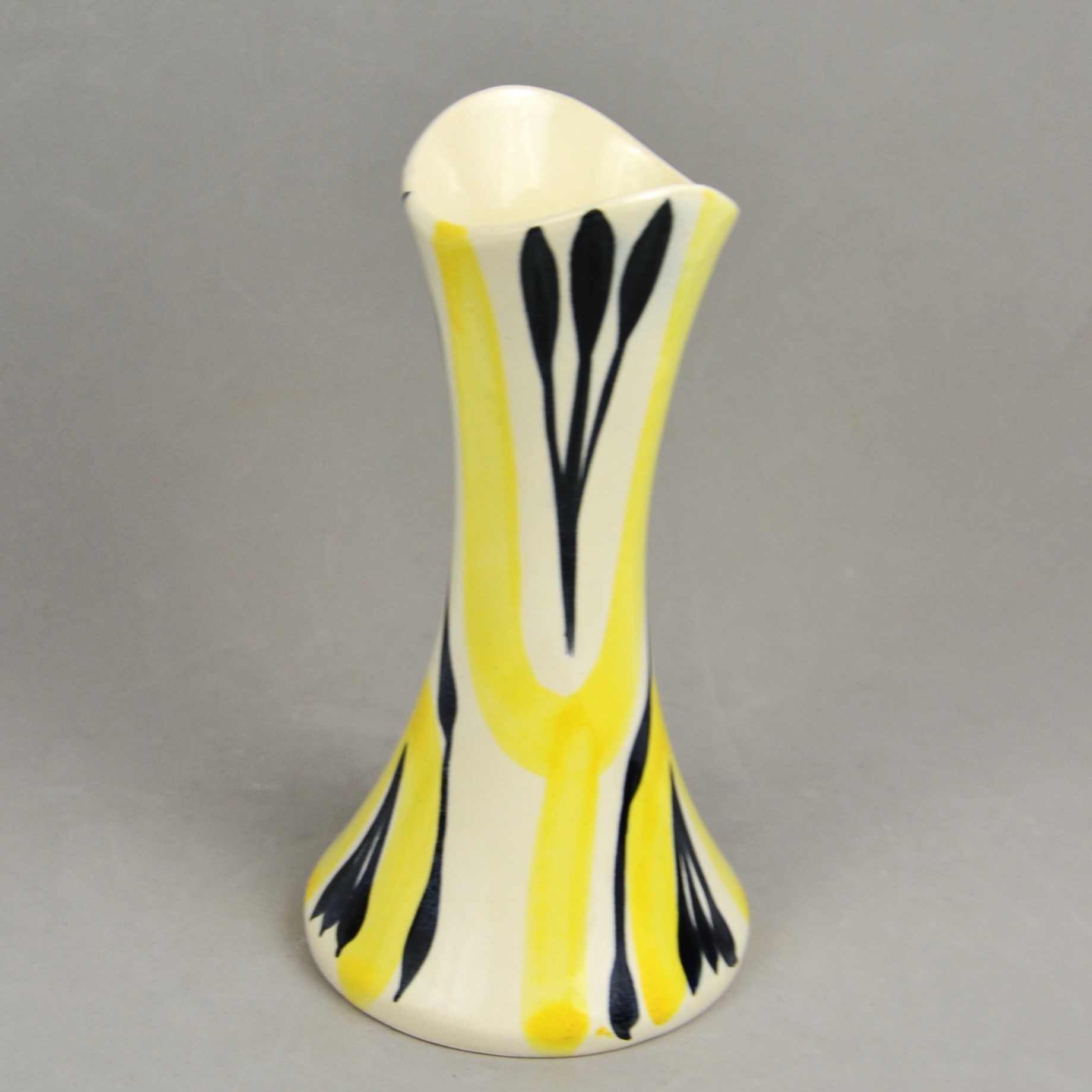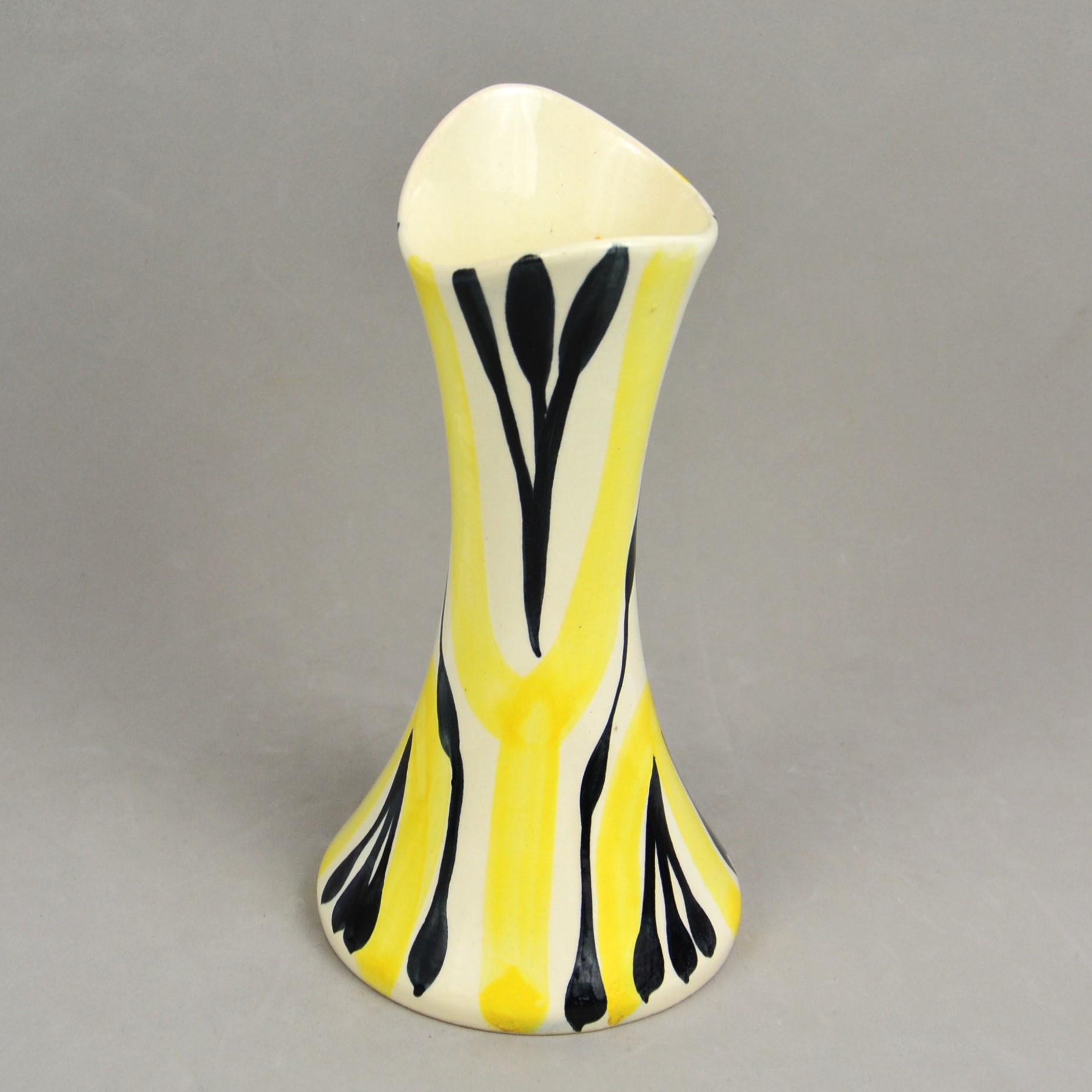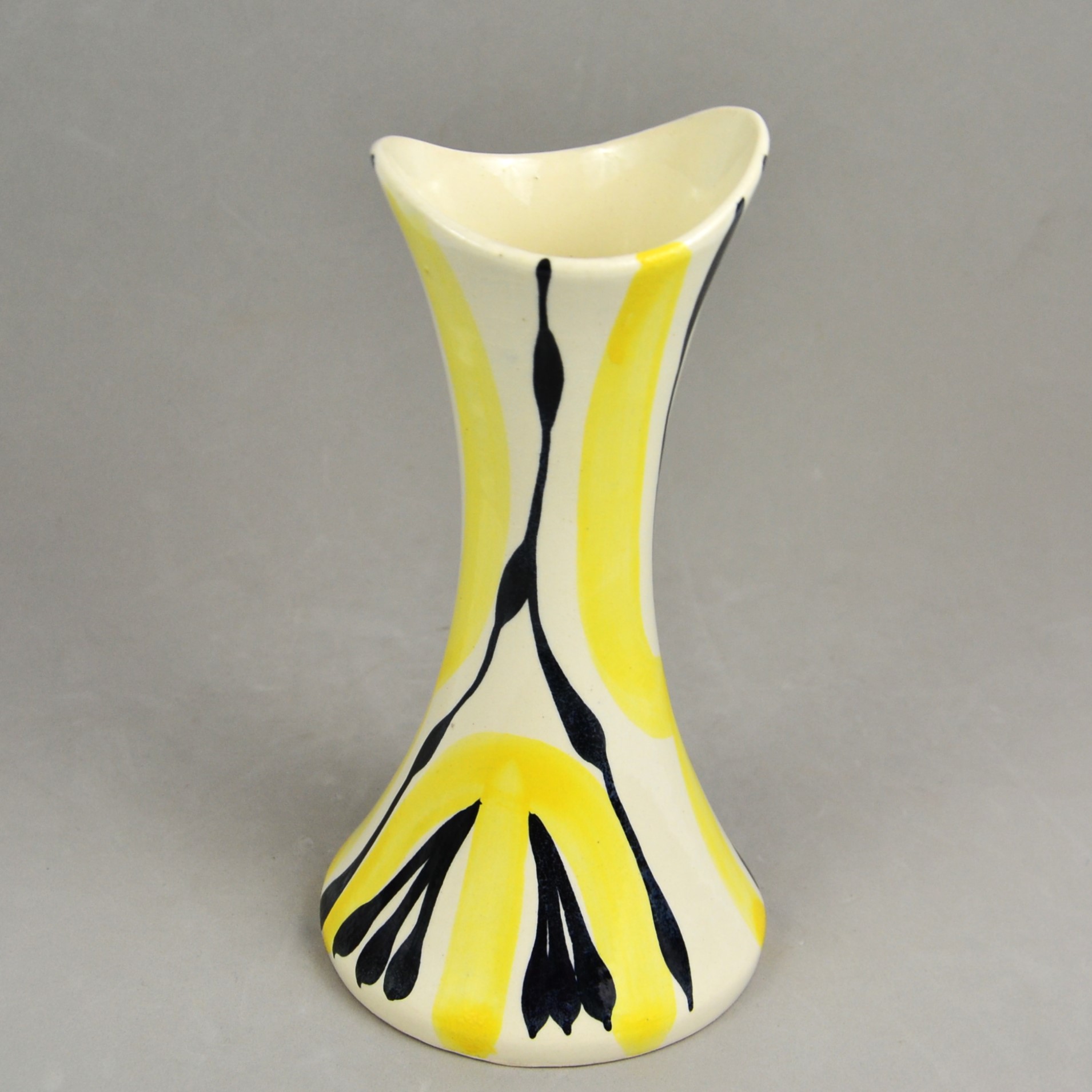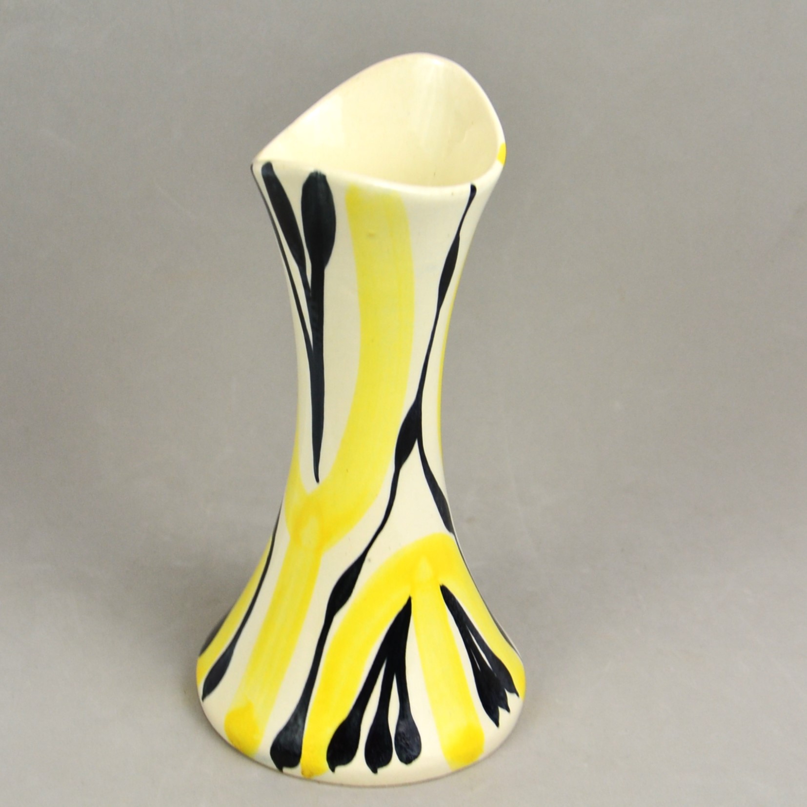 New Look do kolekcji pikasiaków Kolekcjonerski fajansowy wazon z 1960r projektant Jan Sowiński , wzór nr 424 (wg.Muzeum Ziemi Kujawskiej) Fabryka Fajansu Włocławek Wspaniały przykład polskiego designu połowy z XXw, modernistyczna, forma, kształt klepsydry, dekoracja a'la Picasso, żółto czarna kolorystyka. Wymiary: wys.20,5 cm., średnica podstawy 10,5 cm. stan ogólny bardzo dobry, minimalne ślady użytkowania. Wazon godny polecenia unikalny, wiekowy, na topie . Designerów, kolekcjonerów i znawców tematu zachęcam do zakupu.