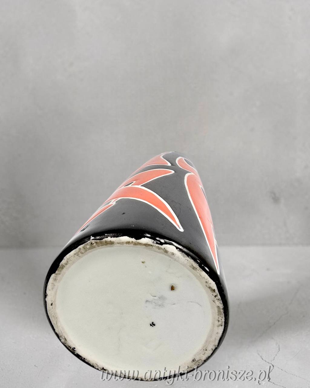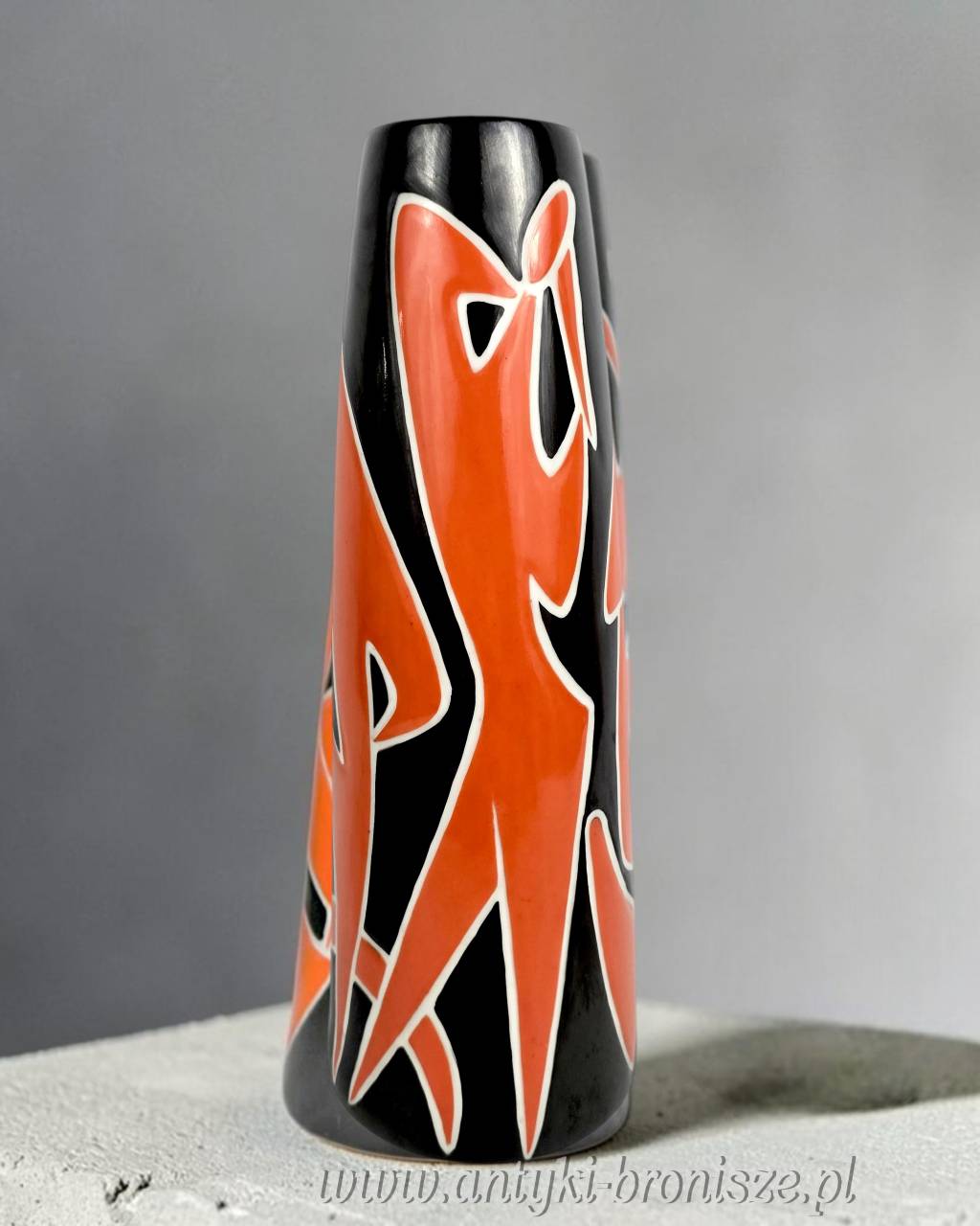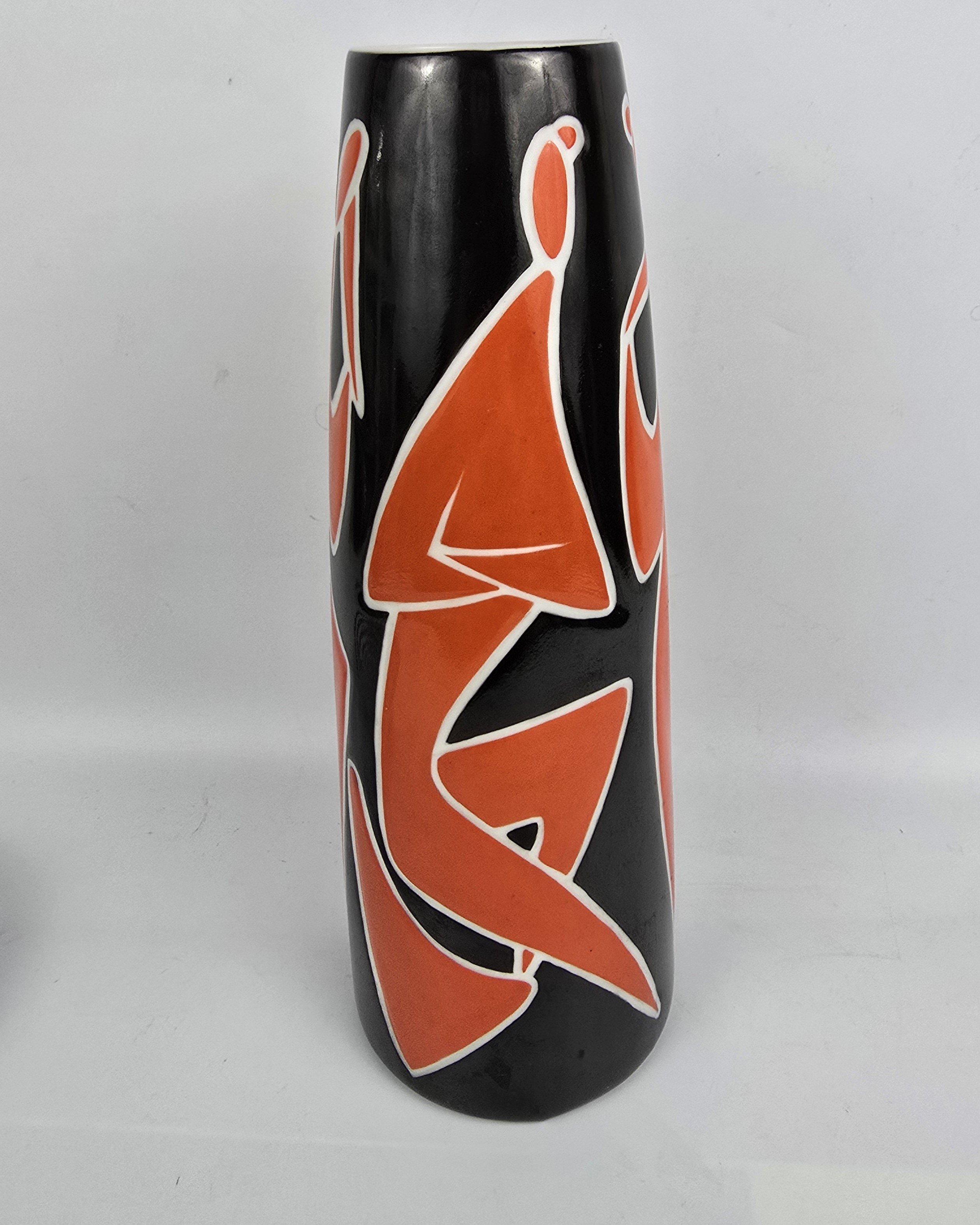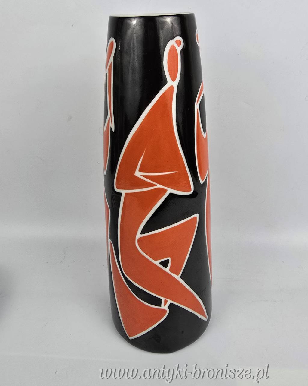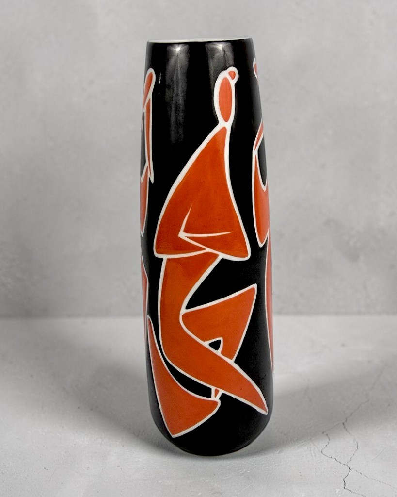 Wazon czarny, postacie czerwone ( koralowe) z białym konturem.