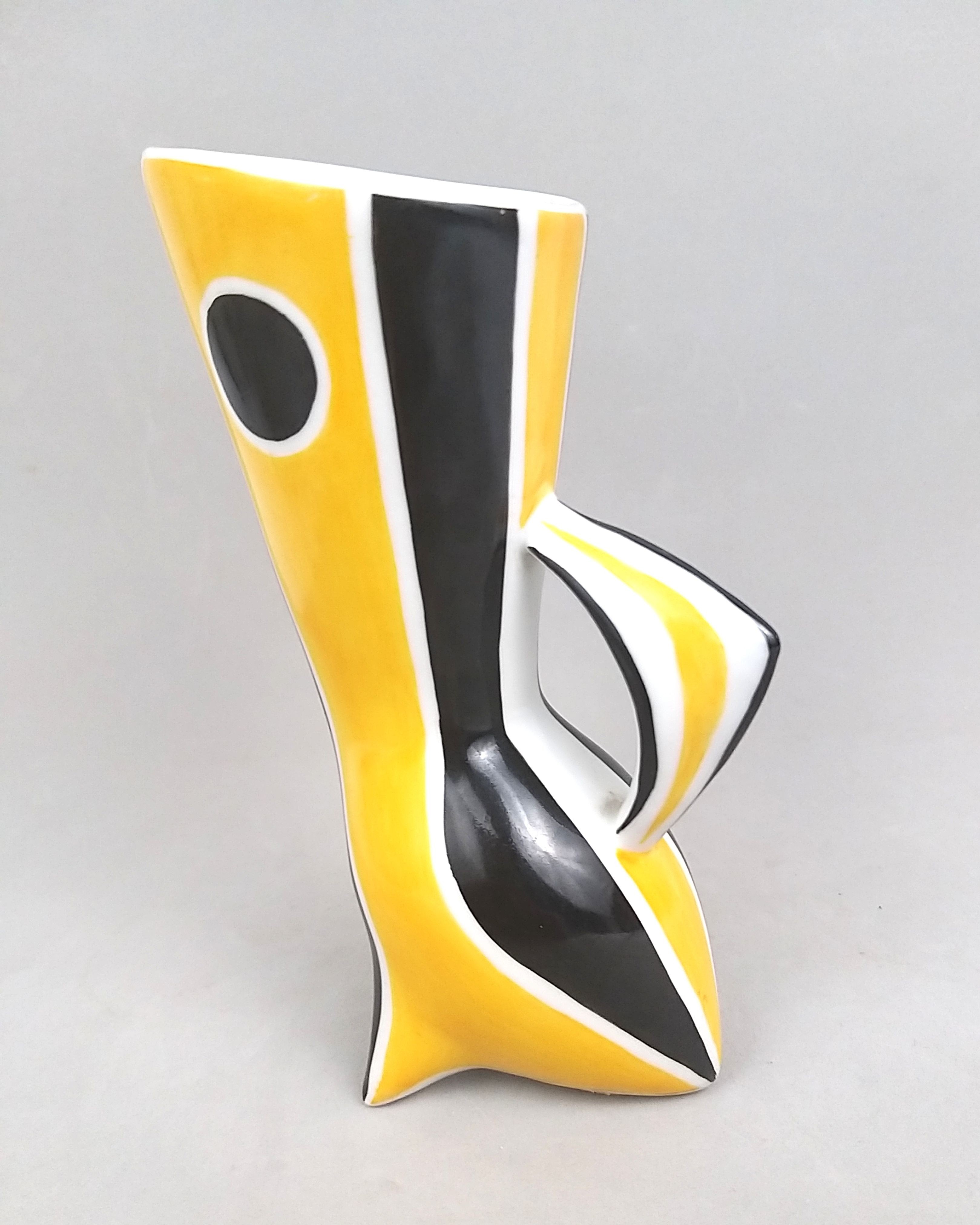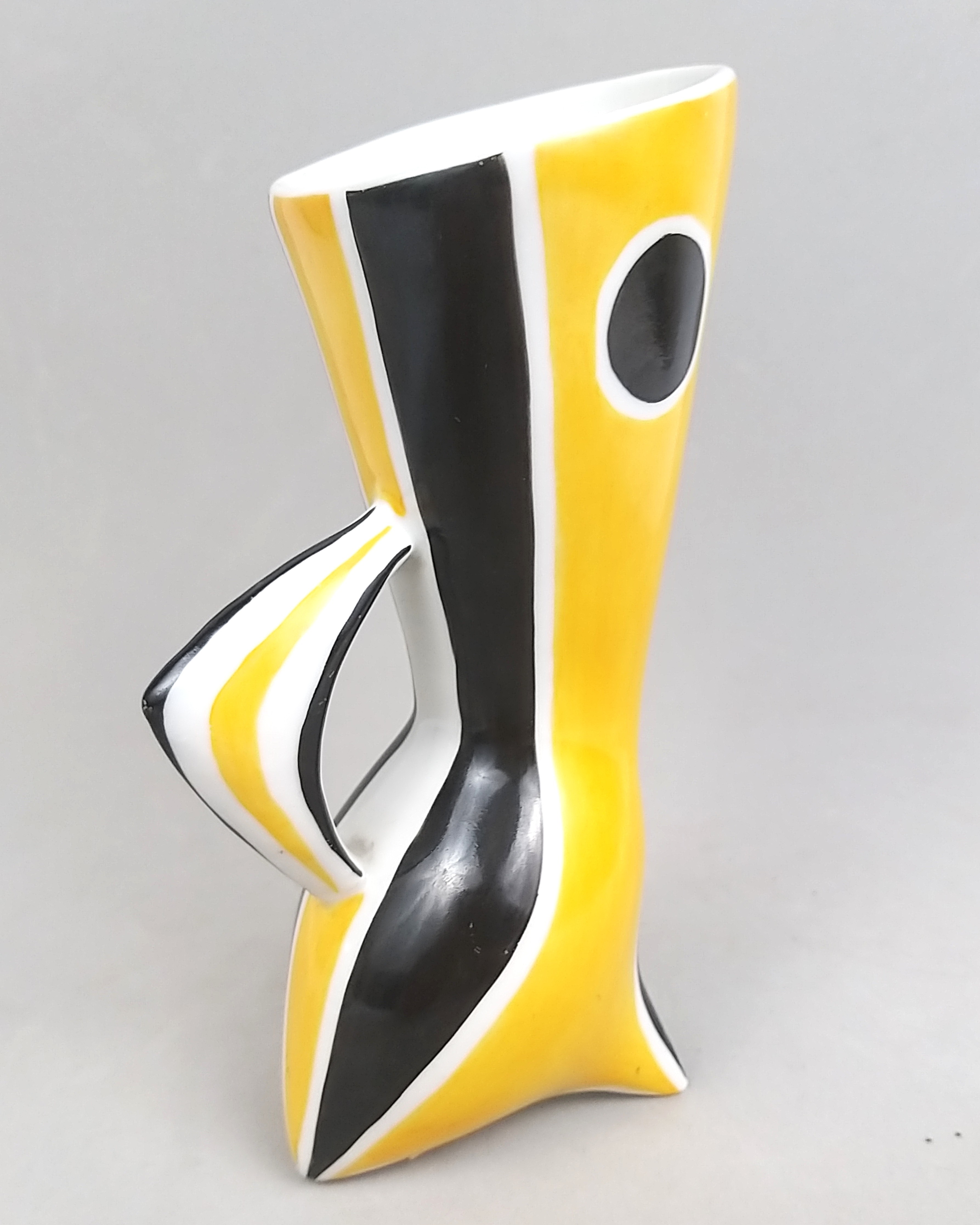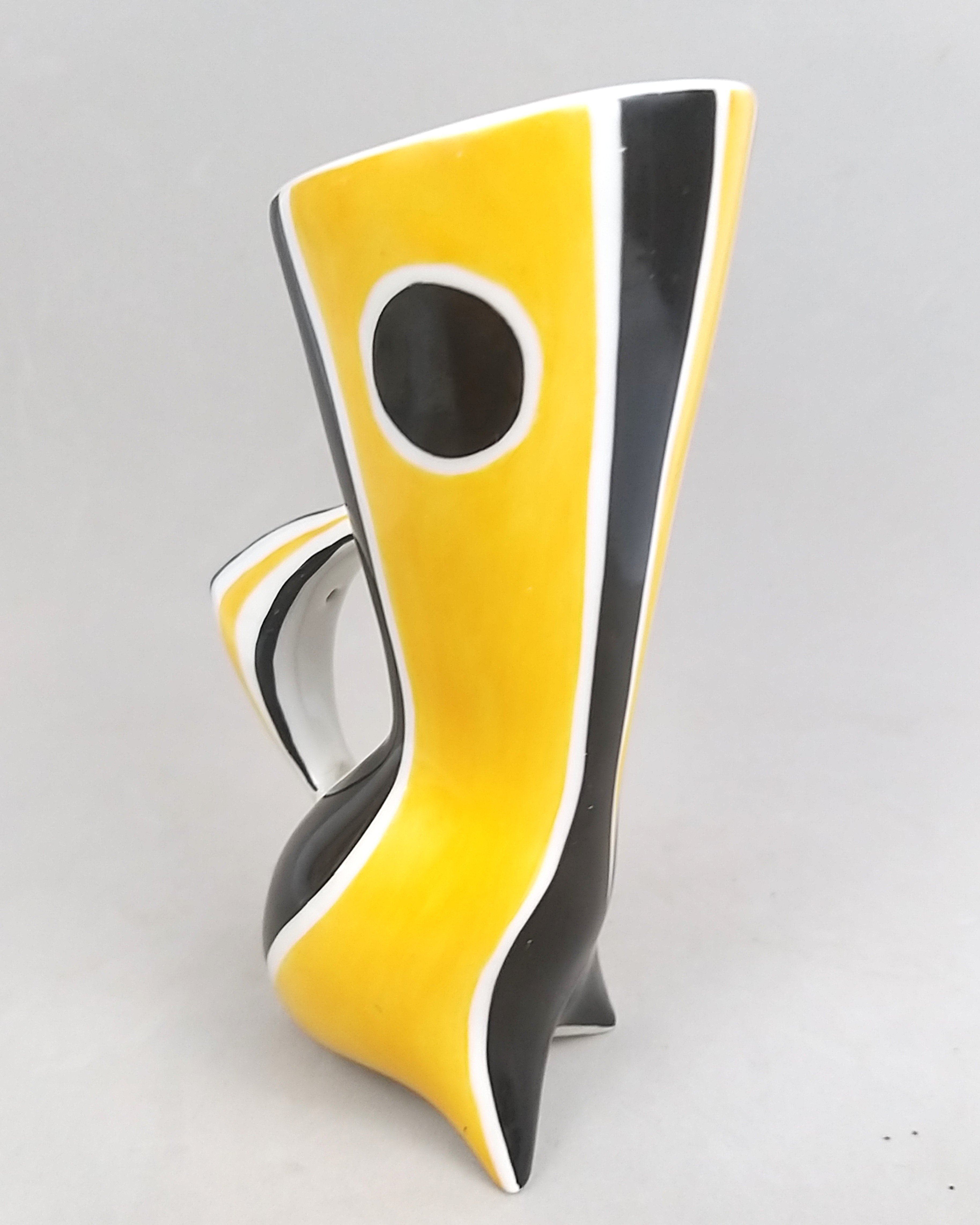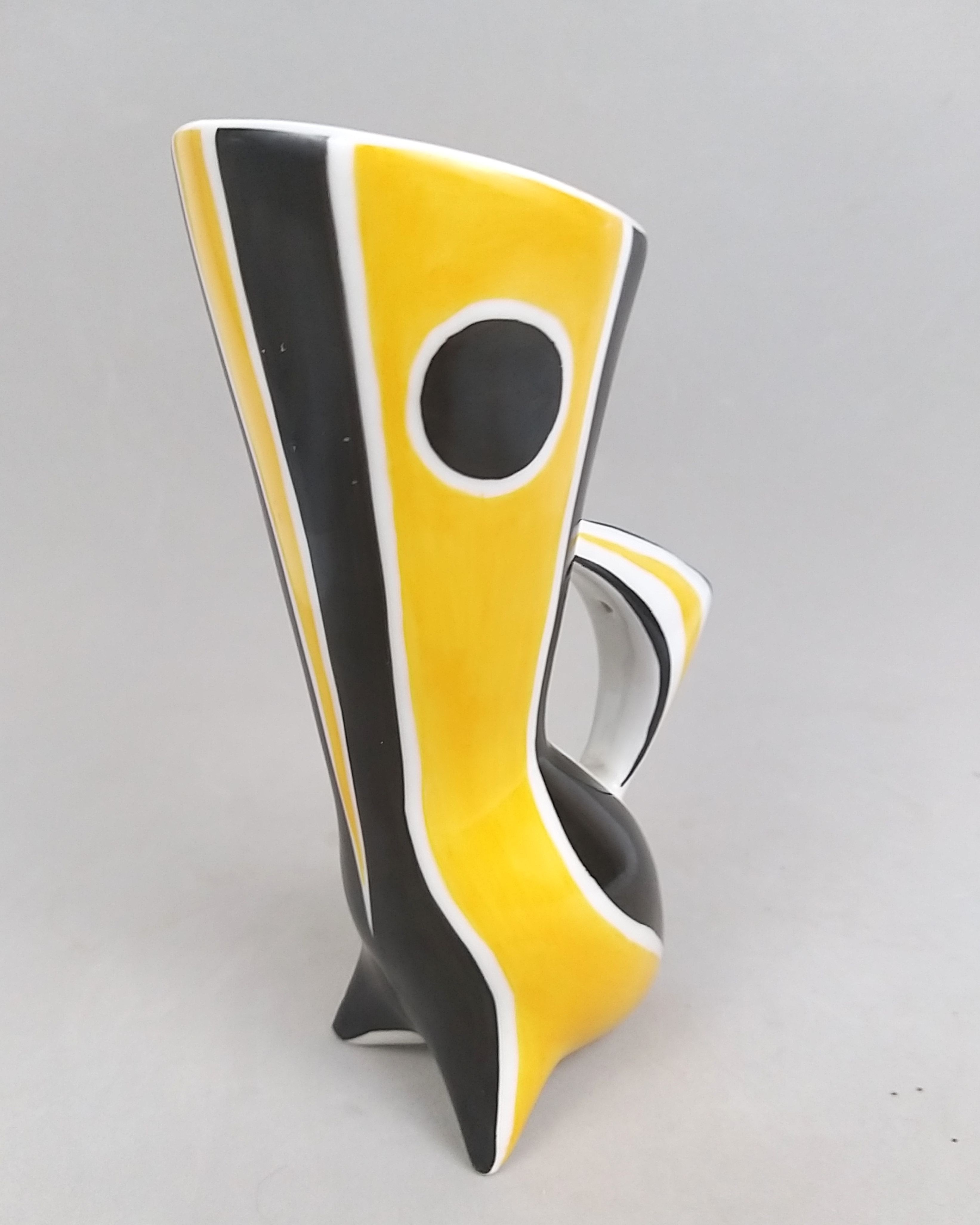 New Look z połowy XX wieku : wazon kot, wazonik, dzbanek z uchem, węgierskiej wytwórni Zsolnay. Przykład wspaniałego wzornictwa z lat 60-tych, przypominający wyroby Ćmielowa, Chodzieży itp . Jeden z projektów Jánosza Töröka (1932-1996) słynnego węgierskiego artysty ceramika i rzeźbiarza. Interesująca modernistyczna forma na nóżkach przypominająca kota. Grafika a'la Picasso, kolorystyka biało żółto czarna. Godny polecenia, wiekowy, na topie, renomowanej firmy do kolekcji pikasiaków. Wysokość całkowita 15,5cm, szerokość maksymalnie 8cm. Design połowy XX wieku zachowany w bardzo dobrym stanie -minimalne ślady użytkowania. Kolekcjonerów pikasiaków, designerów znawców tematu zachęcam do zakupu.