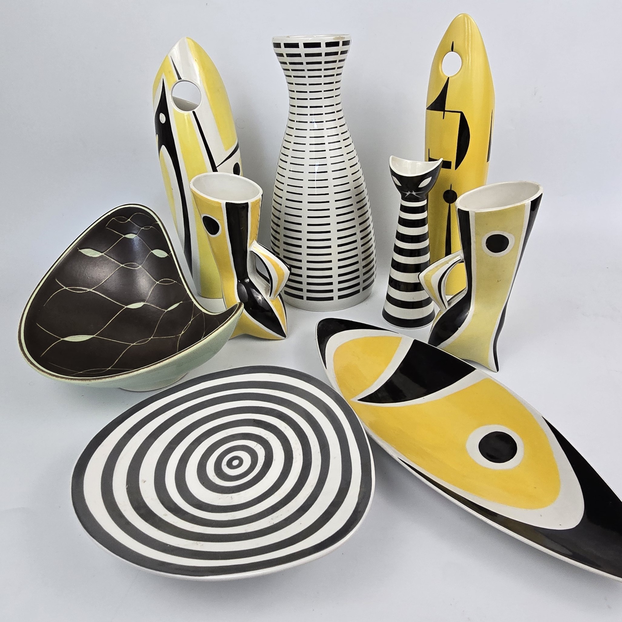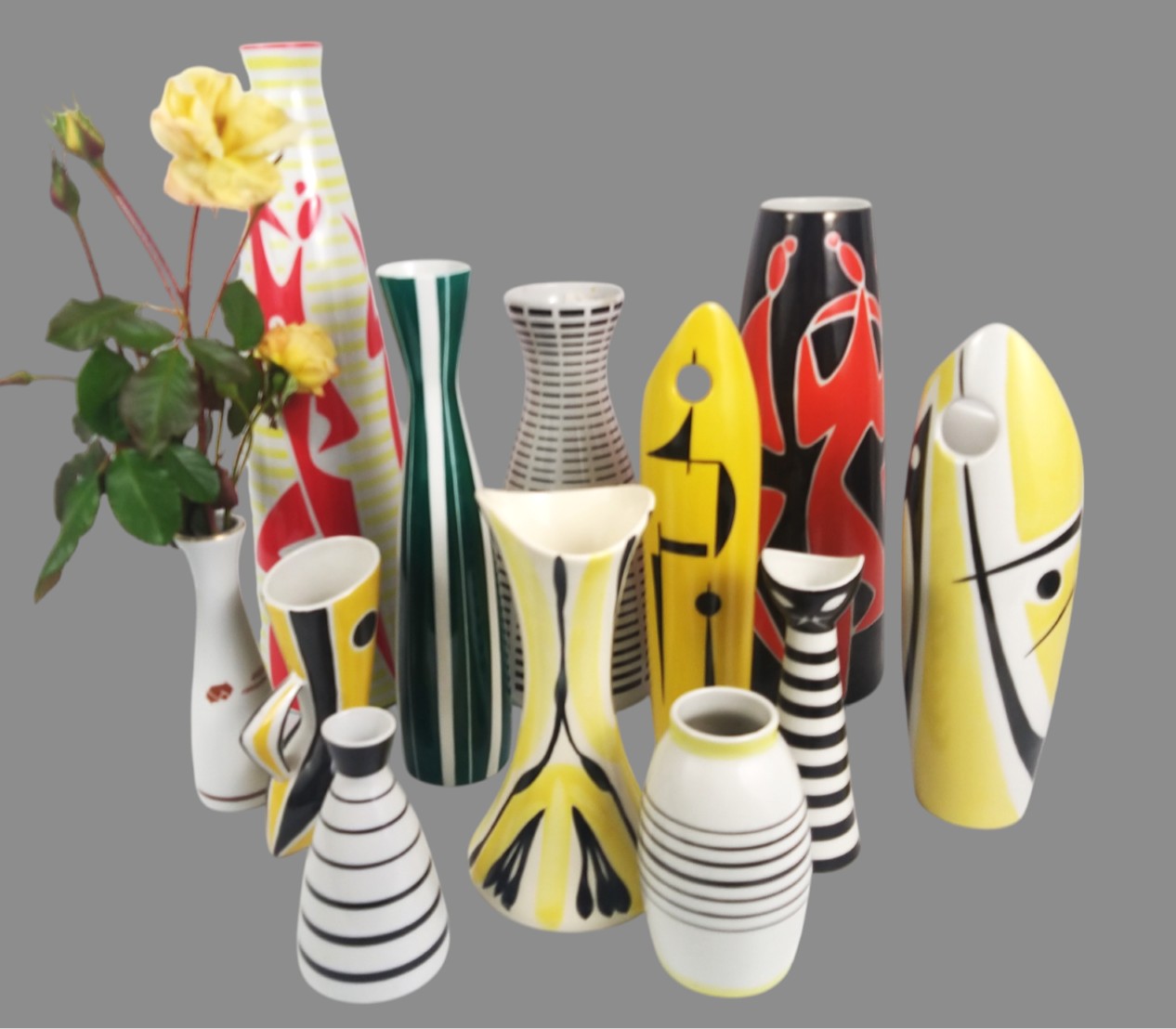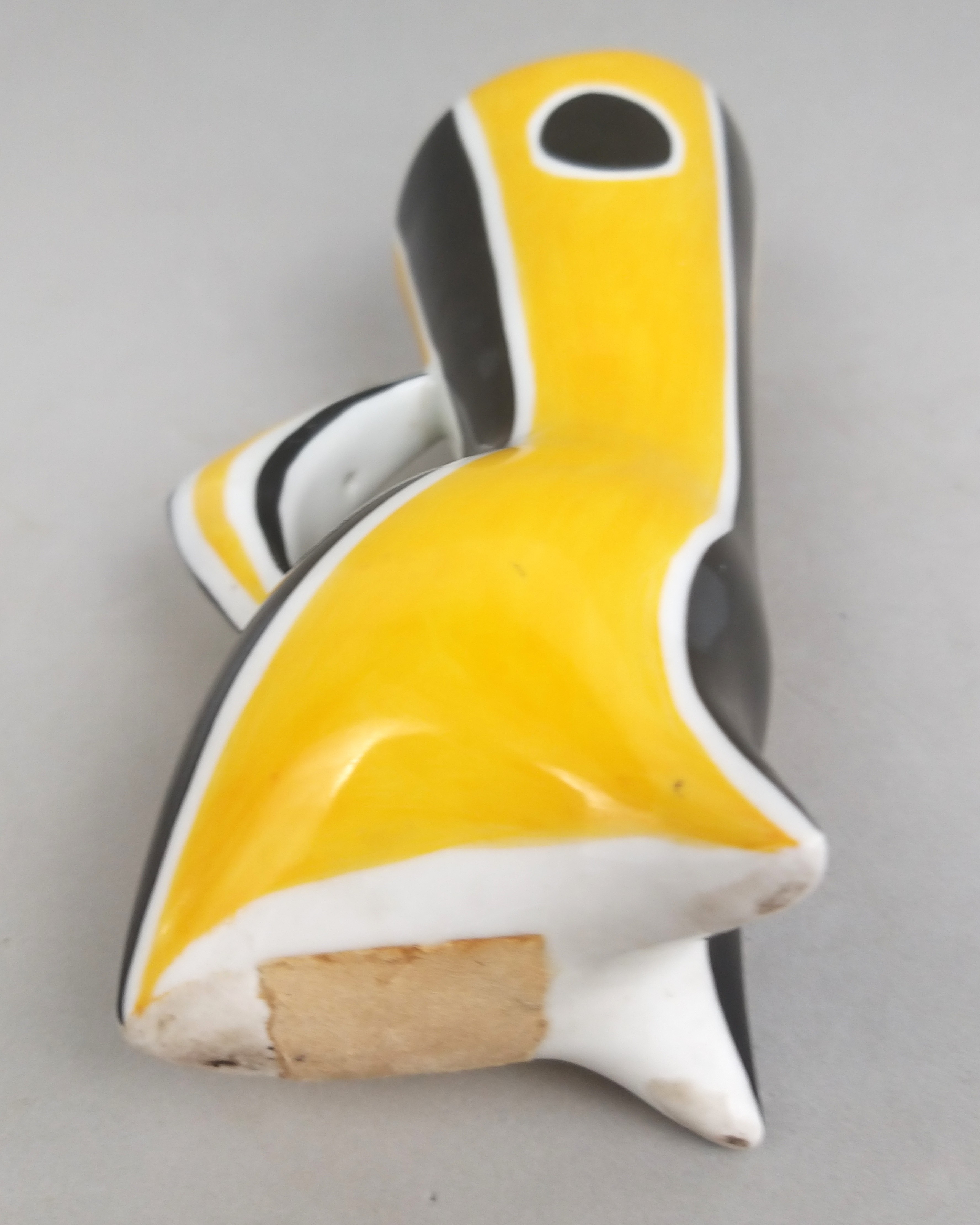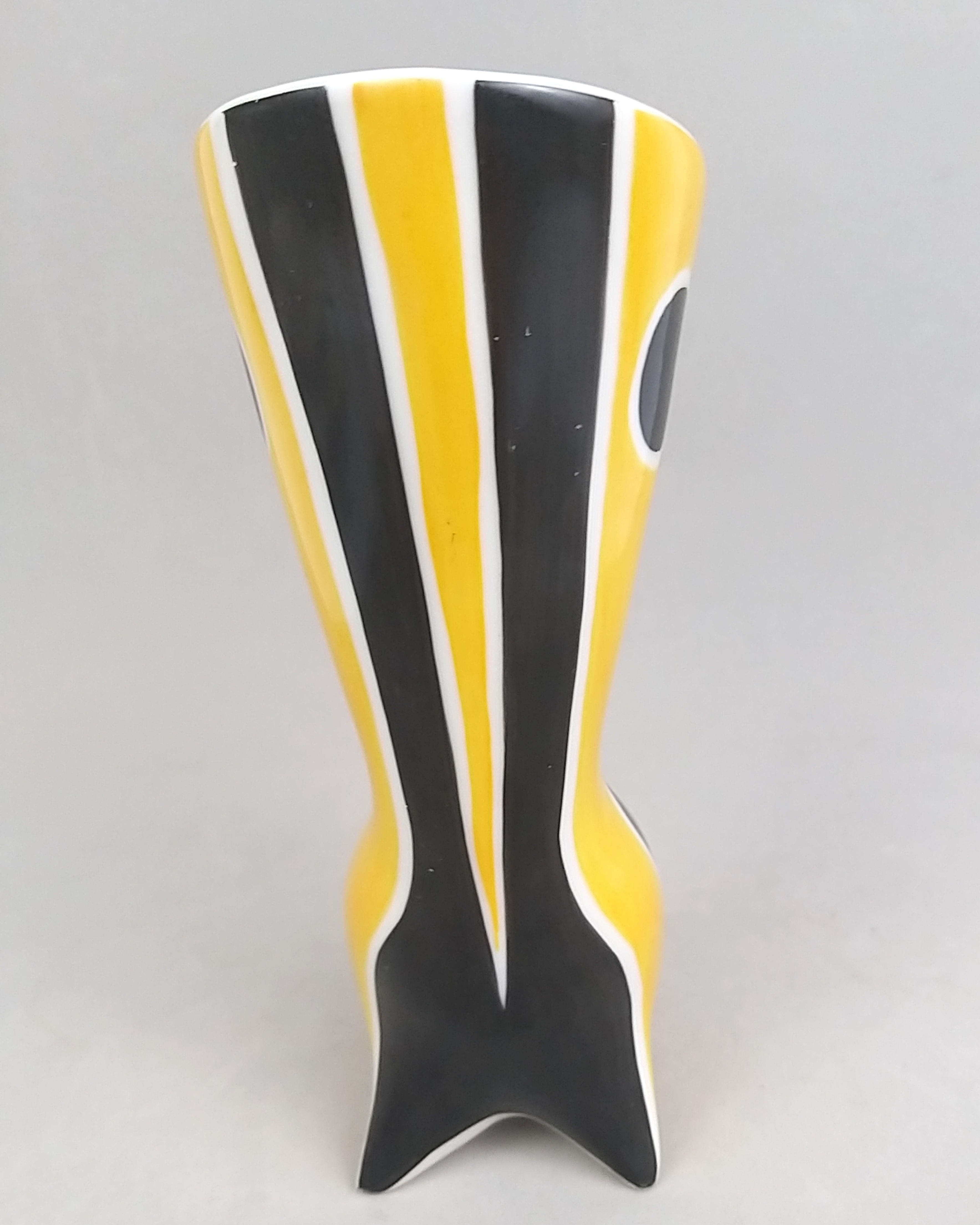 New Look z połowy XX wieku : wazon kot, wazonik, dzbanek z uchem, węgierskiej wytwórni Zsolnay. Przykład wspaniałego wzornictwa z lat 60-tych, przypominający wyroby Ćmielowa, Chodzieży itp . Jeden z projektów Jánosza Töröka (1932-1996) słynnego węgierskiego artysty ceramika i rzeźbiarza. Interesująca modernistyczna forma na nóżkach przypominająca kota. Grafika a'la Picasso, kolorystyka biało żółto czarna. Godny polecenia, wiekowy, na topie, renomowanej firmy do kolekcji pikasiaków. Wysokość całkowita 15,5cm, szerokość maksymalnie 8cm. Design połowy XX wieku zachowany w bardzo dobrym stanie -minimalne ślady użytkowania. Kolekcjonerów pikasiaków, designerów znawców tematu zachęcam do zakupu.