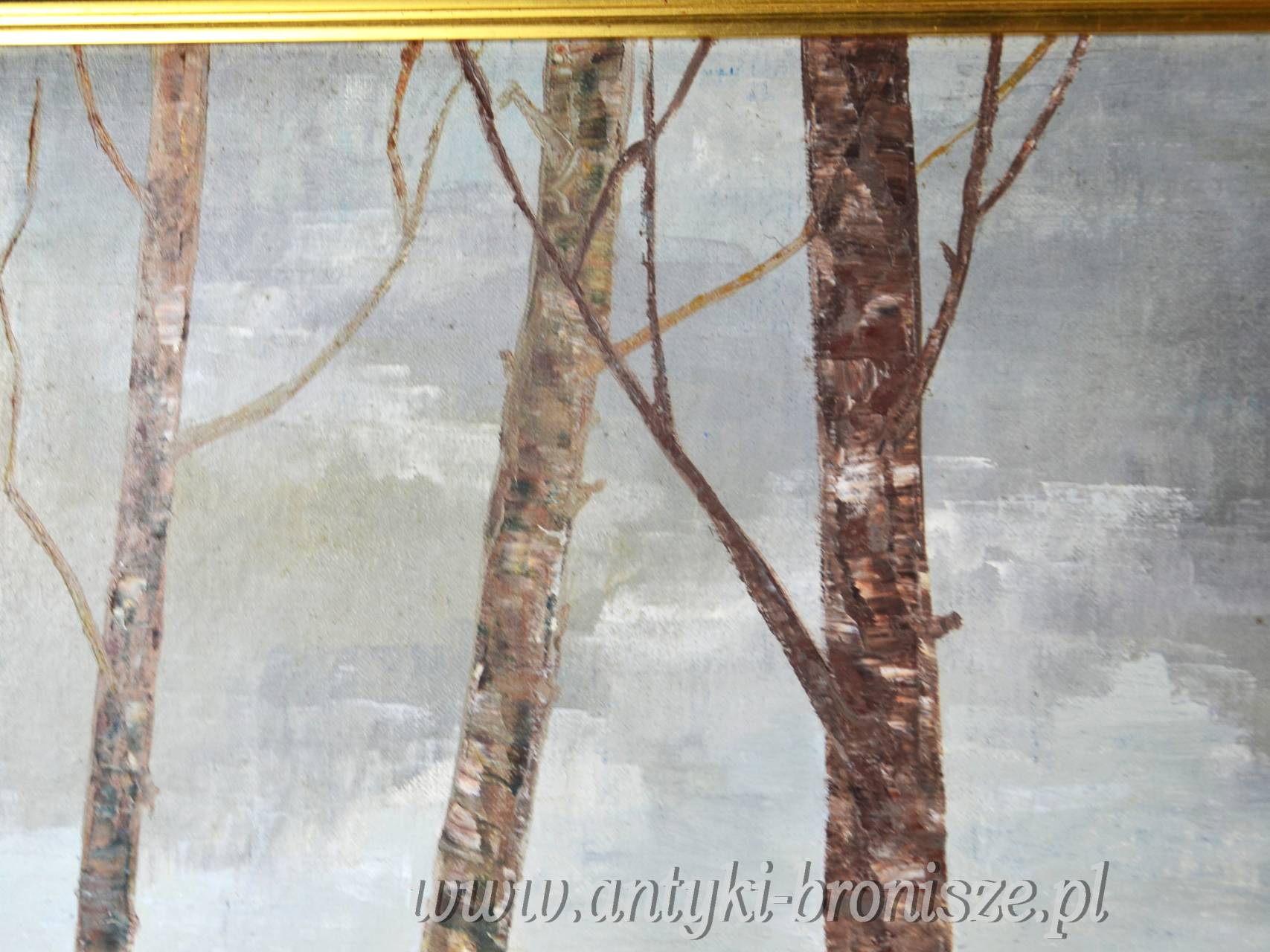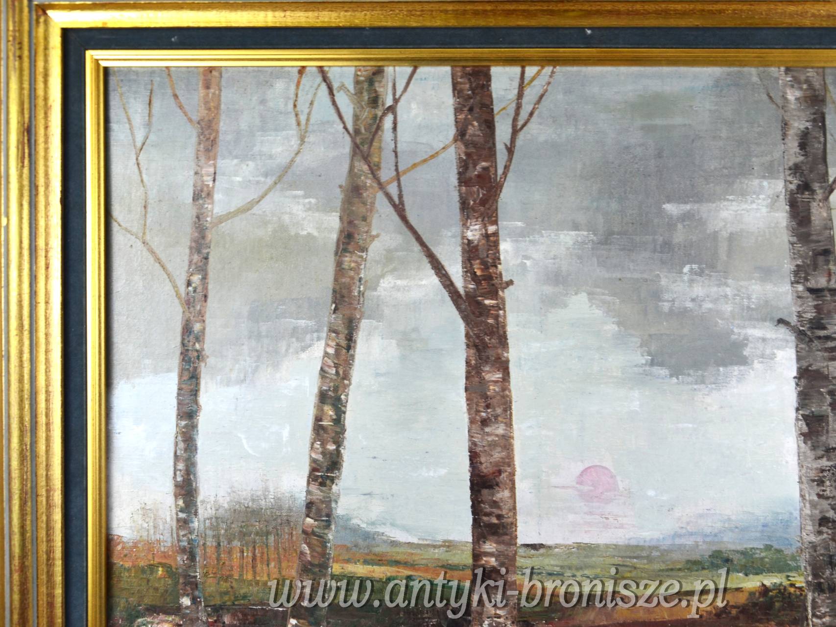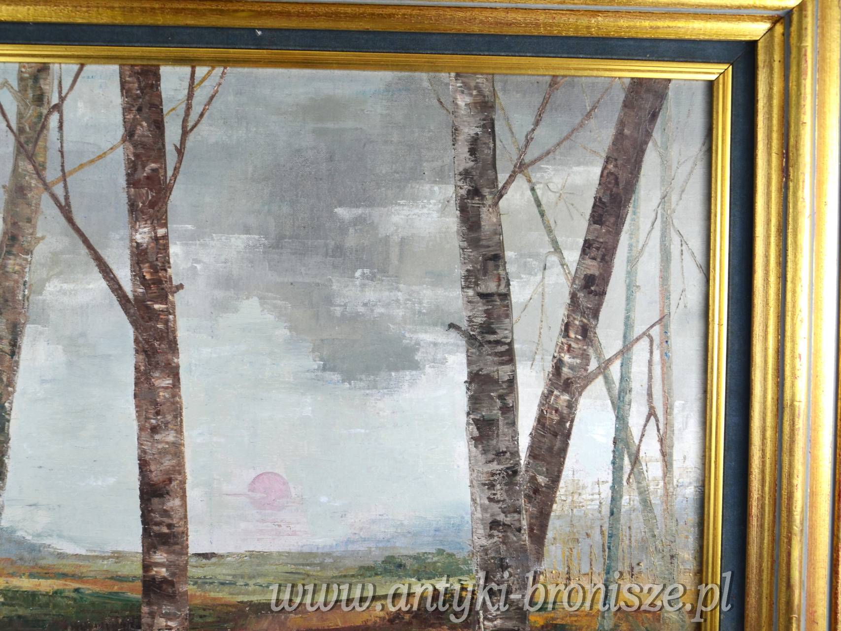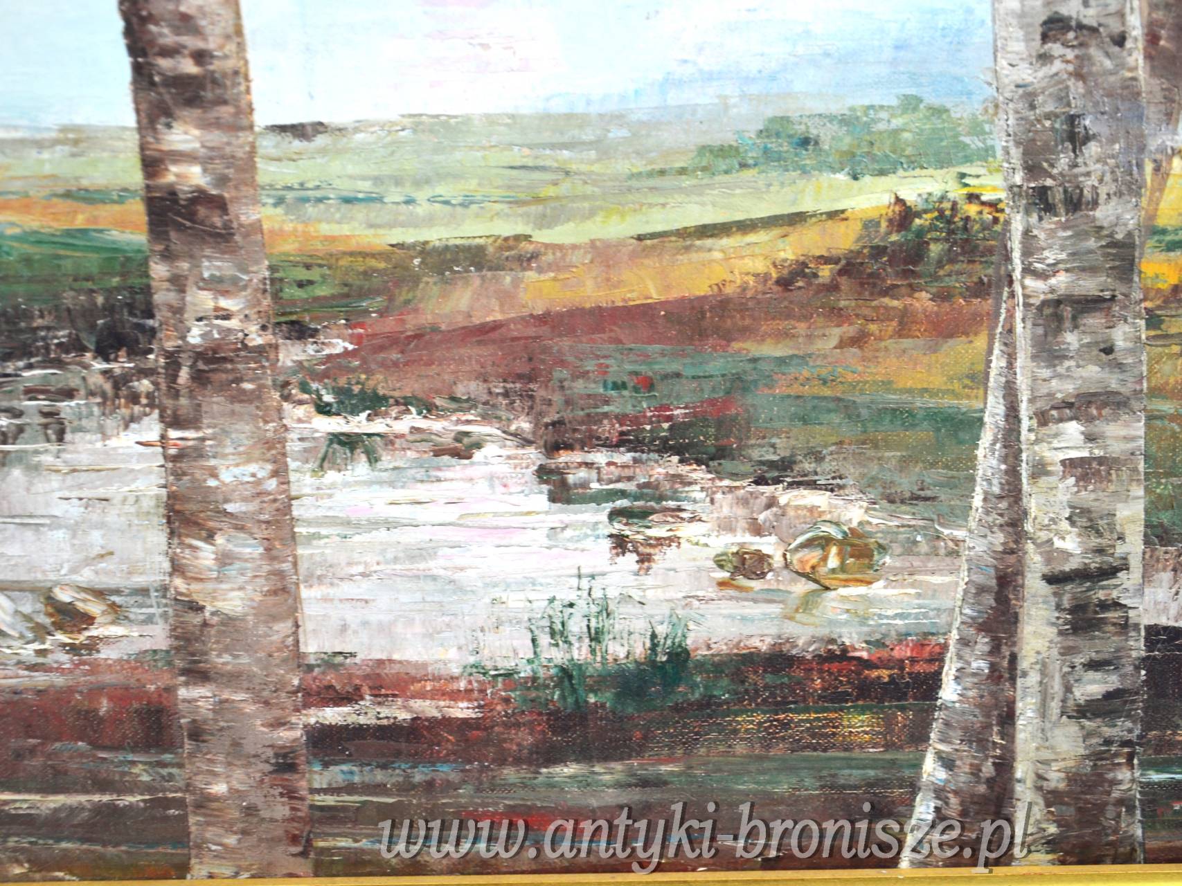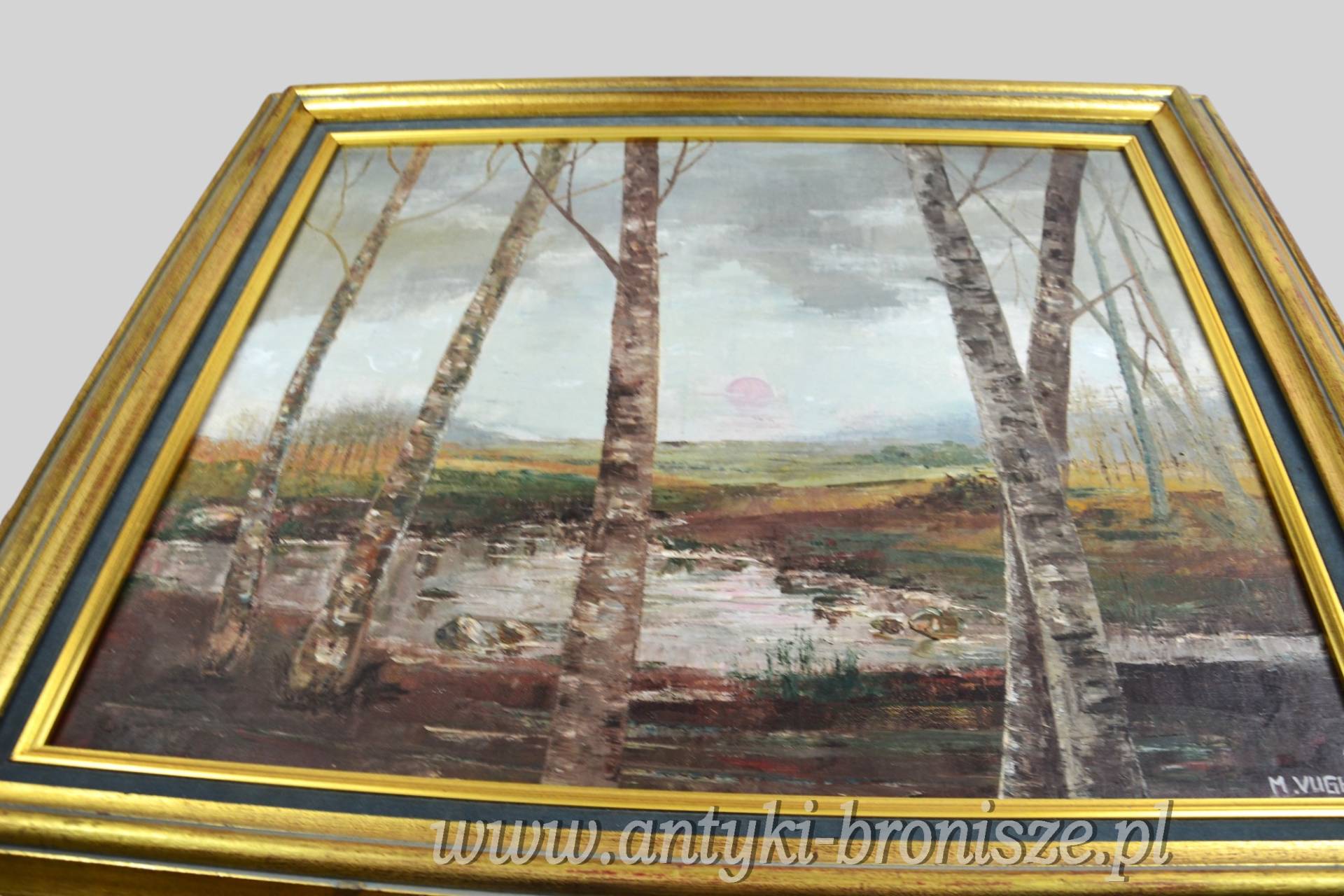 Olej na płótnie podpisany M. Vugth 80. Klimatyczny pejzaż w zielonej kolorystyce, brzozy, mokradła, zarośla. Szeroka drewniana rama w złotym kolorze z cienkim zielonym paskiem passe-partout.
