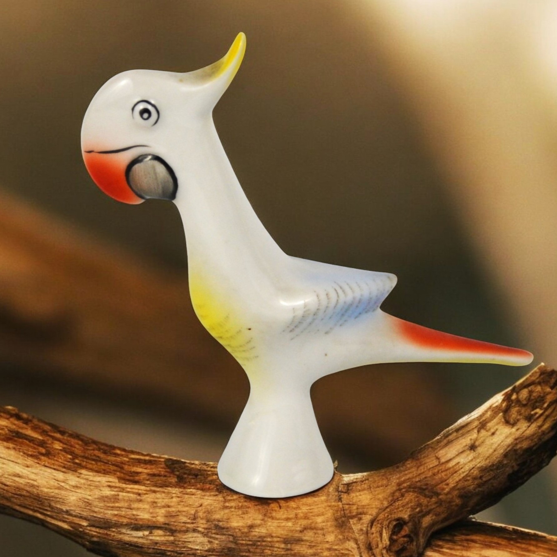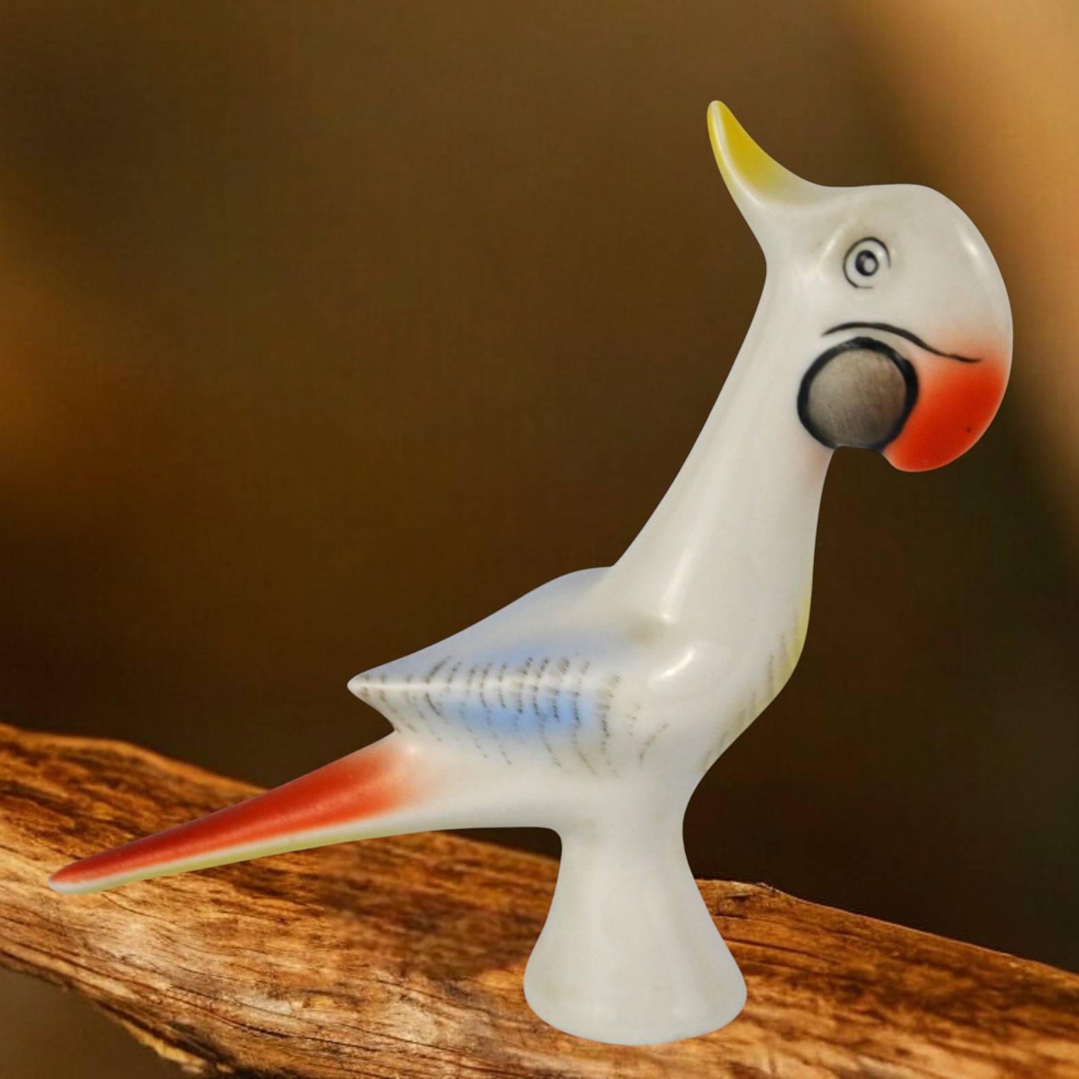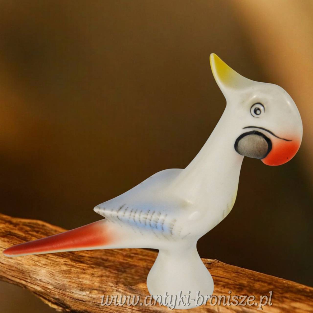 Oryginalna, niepospolita, porcelanowa figurka papugi kakadu. Wyrób słynnej węgierskiej wytwórni porcelany Hollohaza. Przykład wspaniałego wzornictwa połowy XX wieku przypominający modernistyczne projekty Ćmielowa, Chodzieży i innych polskich wytwórni. Nowoczesna, organiczna forma, charakterystyczne obłe kształty, delikatna kolorystka. Ręcznie malowana, bardzo ładna kolekcjonerska figurka, kunsztownie wykonana z wypracowanymi detalami. Porcelana najwyższej jakości, wiekowa, renomowanej firmy, bez uszkodzeń. Wysokość 12cm. stan bardzo dobry jedynie drobne ślady użytkowaniaKolekcjonerów wszelkich pikasów i znawców tematu zachęcam do zakupu.
