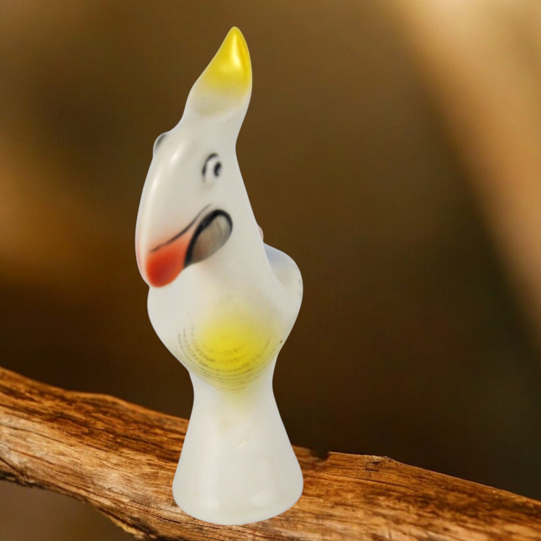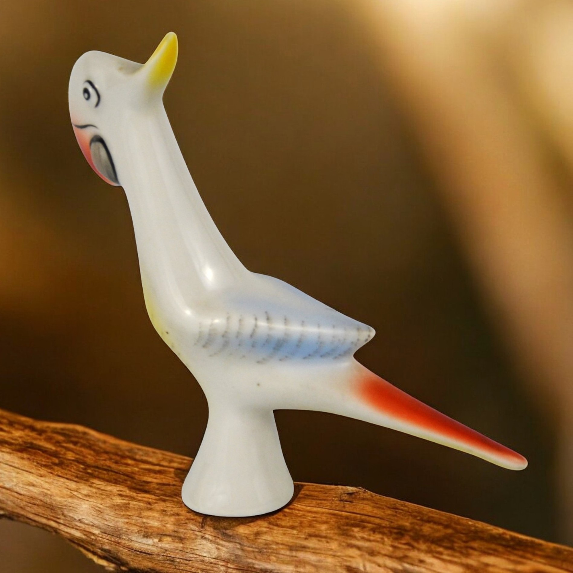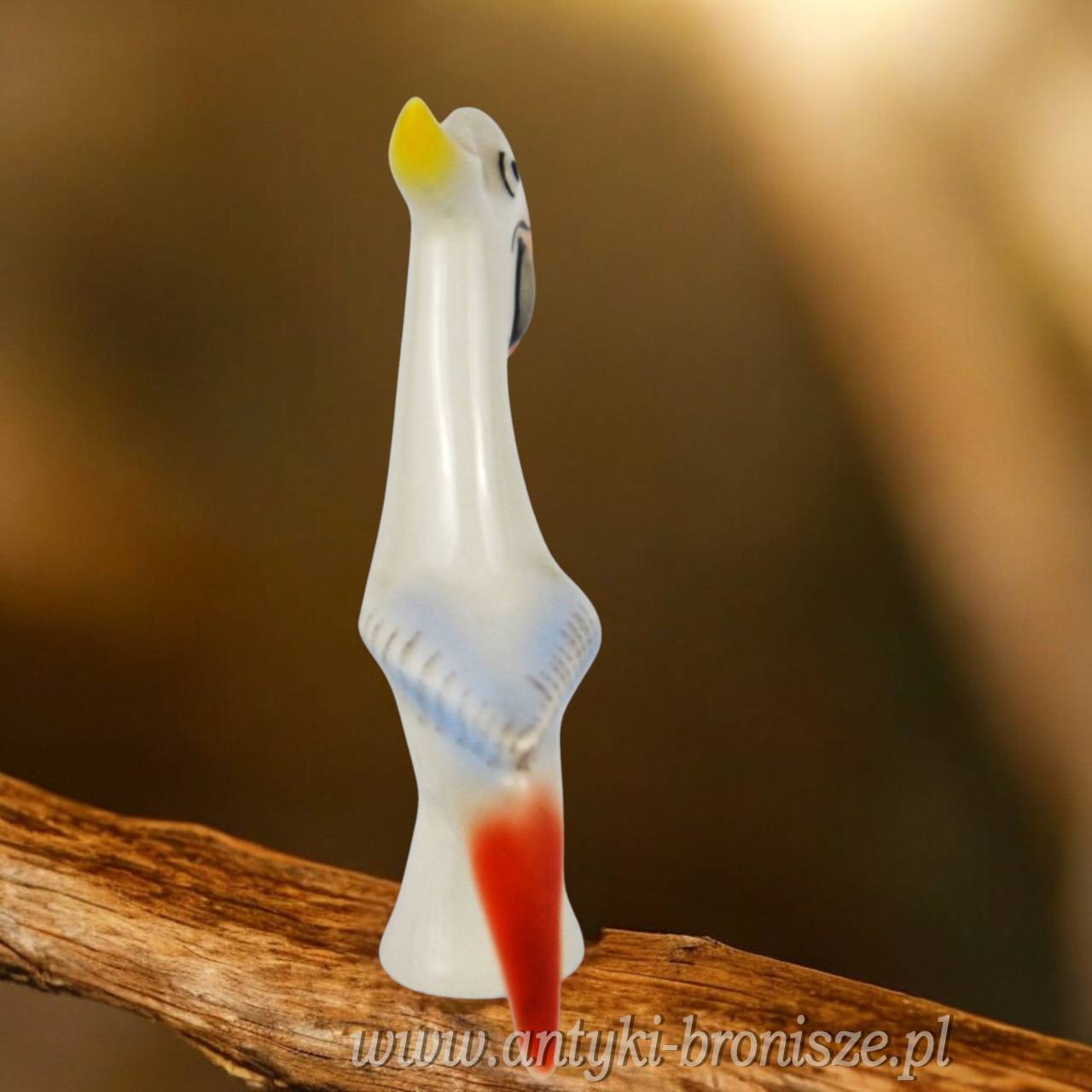 Oryginalna, niepospolita, porcelanowa figurka papugi kakadu. Wyrób słynnej węgierskiej wytwórni porcelany Hollohaza. Przykład wspaniałego wzornictwa połowy XX wieku przypominający modernistyczne projekty Ćmielowa, Chodzieży i innych polskich wytwórni. Nowoczesna, organiczna forma, charakterystyczne obłe kształty, delikatna kolorystka. Ręcznie malowana, bardzo ładna kolekcjonerska figurka, kunsztownie wykonana z wypracowanymi detalami. Porcelana najwyższej jakości, wiekowa, renomowanej firmy, bez uszkodzeń. Wysokość 12cm. stan bardzo dobry jedynie drobne ślady użytkowaniaKolekcjonerów wszelkich pikasów i znawców tematu zachęcam do zakupu.