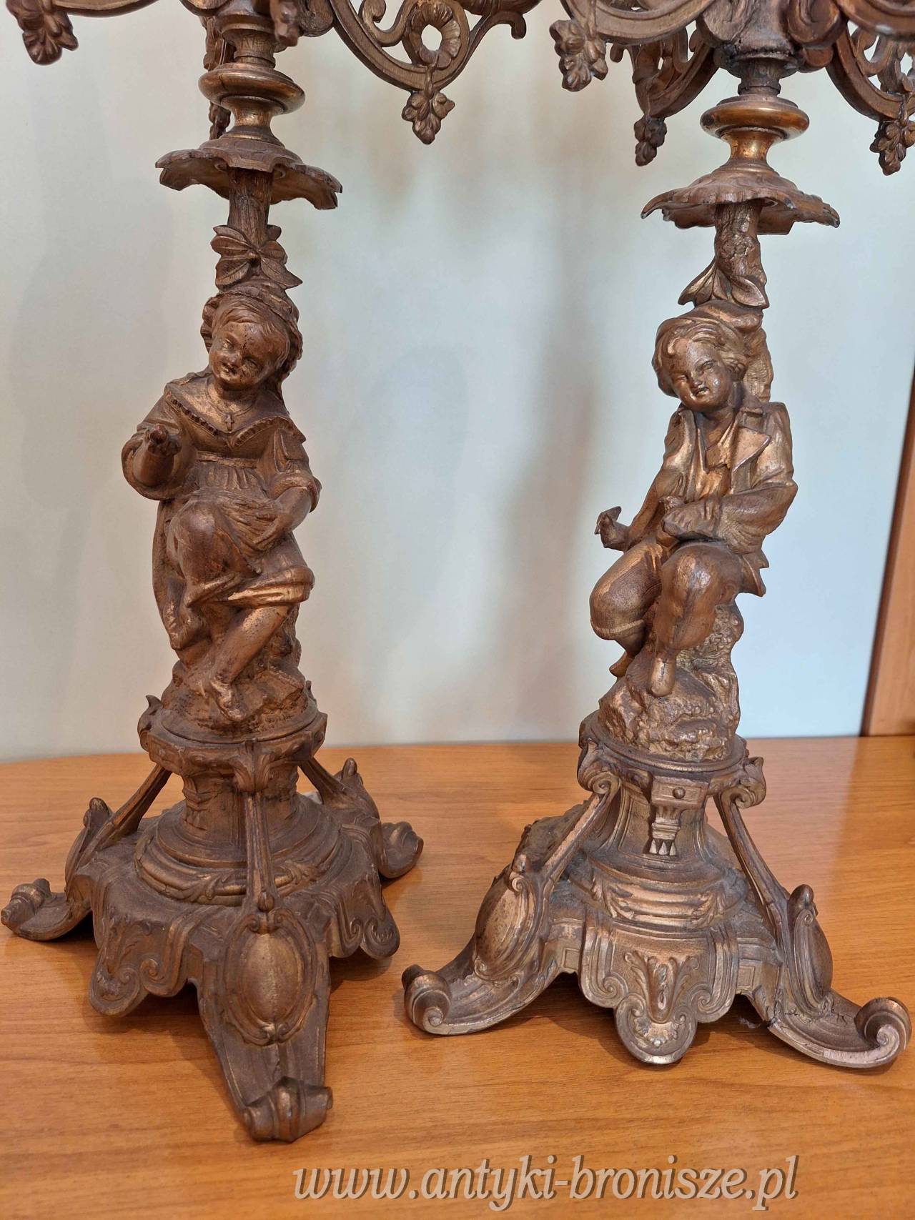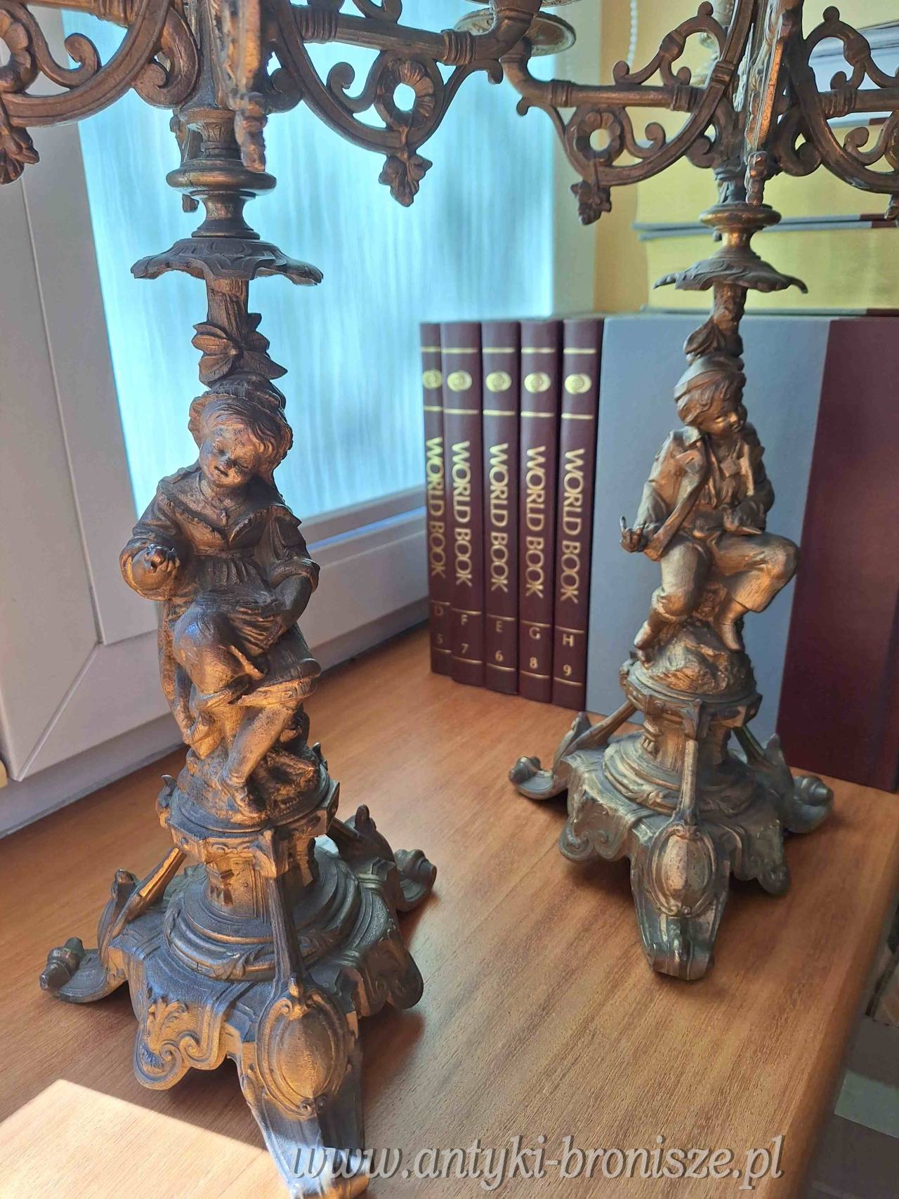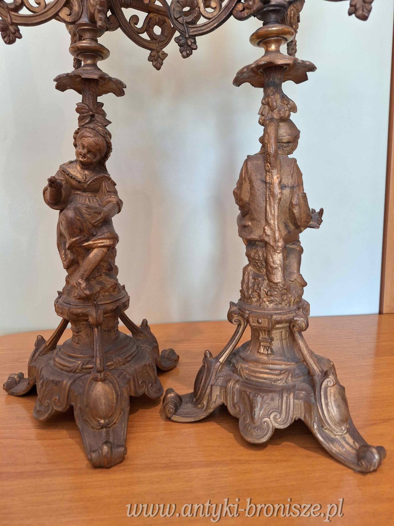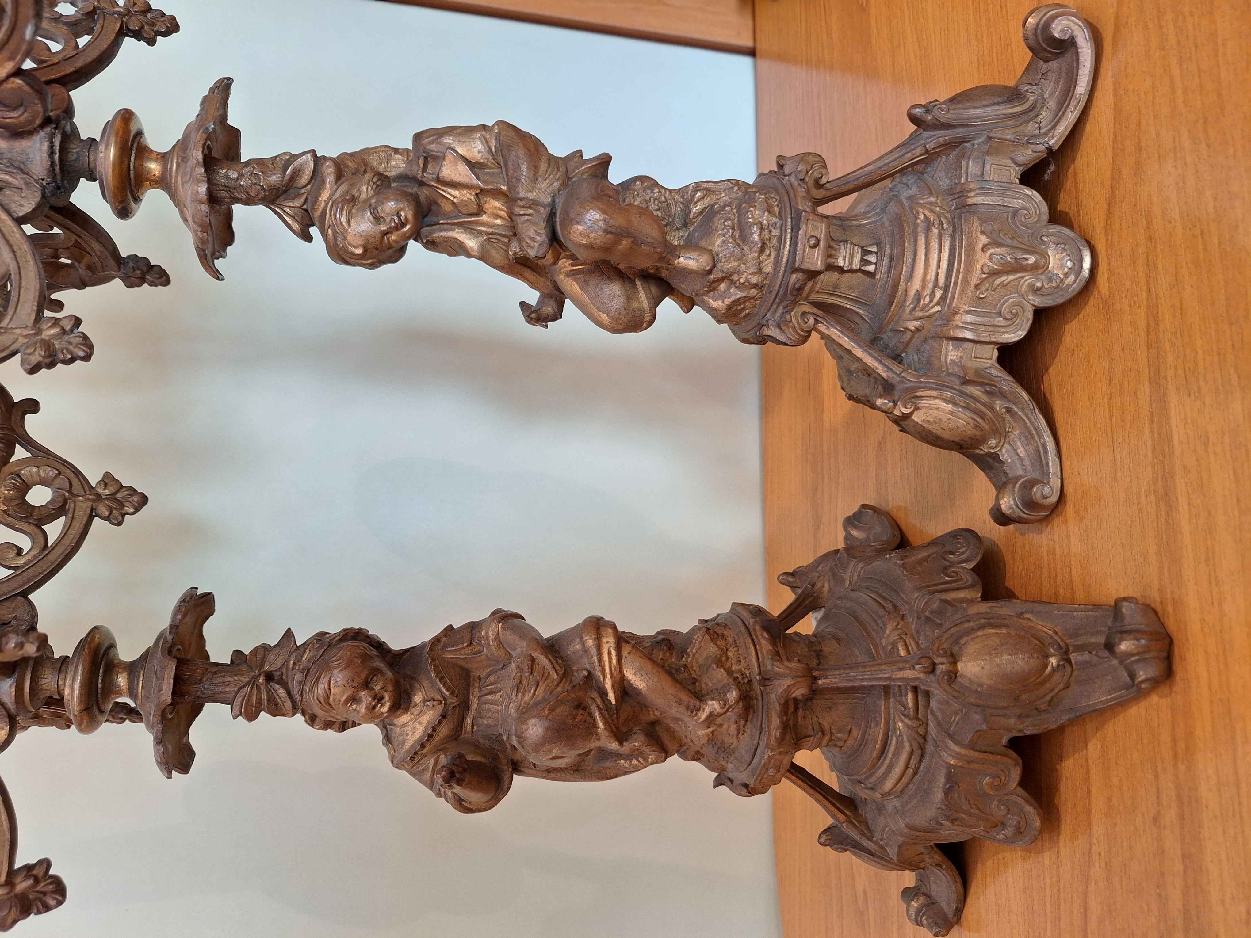 780 - Para kandelabrow. 4-ramiona umieszczone na siedzacej mlodej parze ( mezczyzna i kobieta ). Braz zlocony, styl L XV - XIX wiek - wys. 47cm / rozpietosc ramion 25 cm