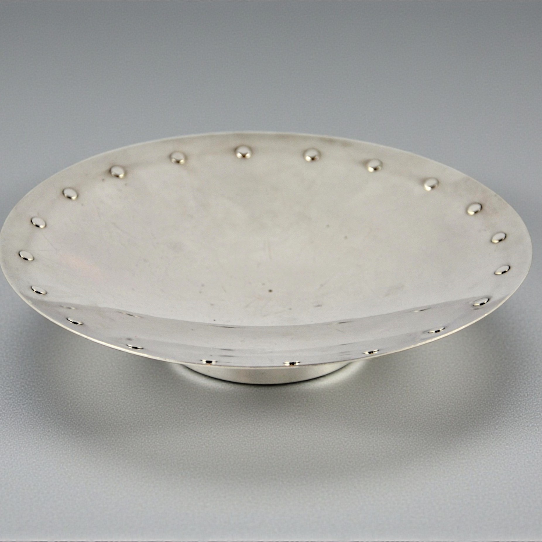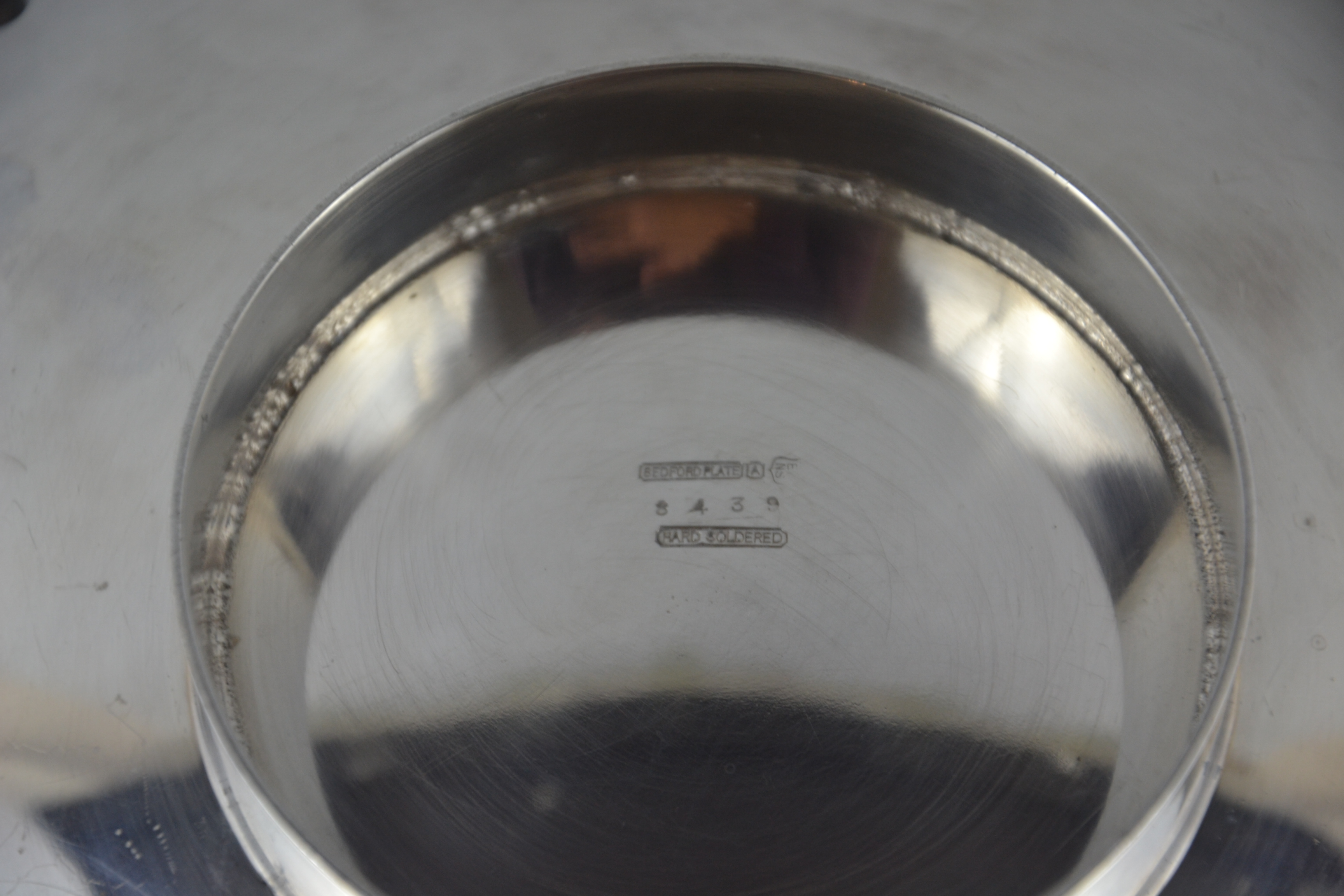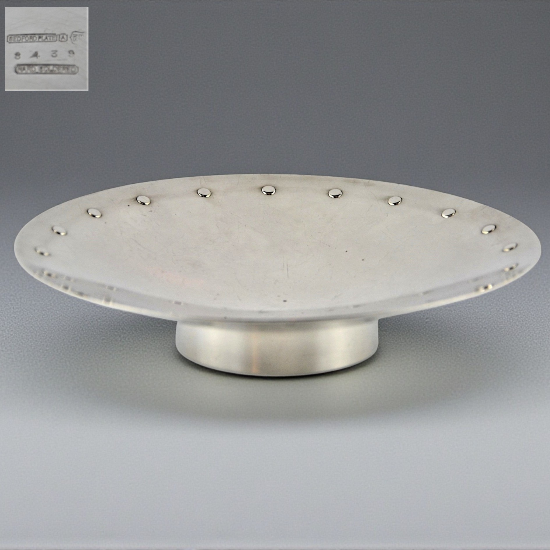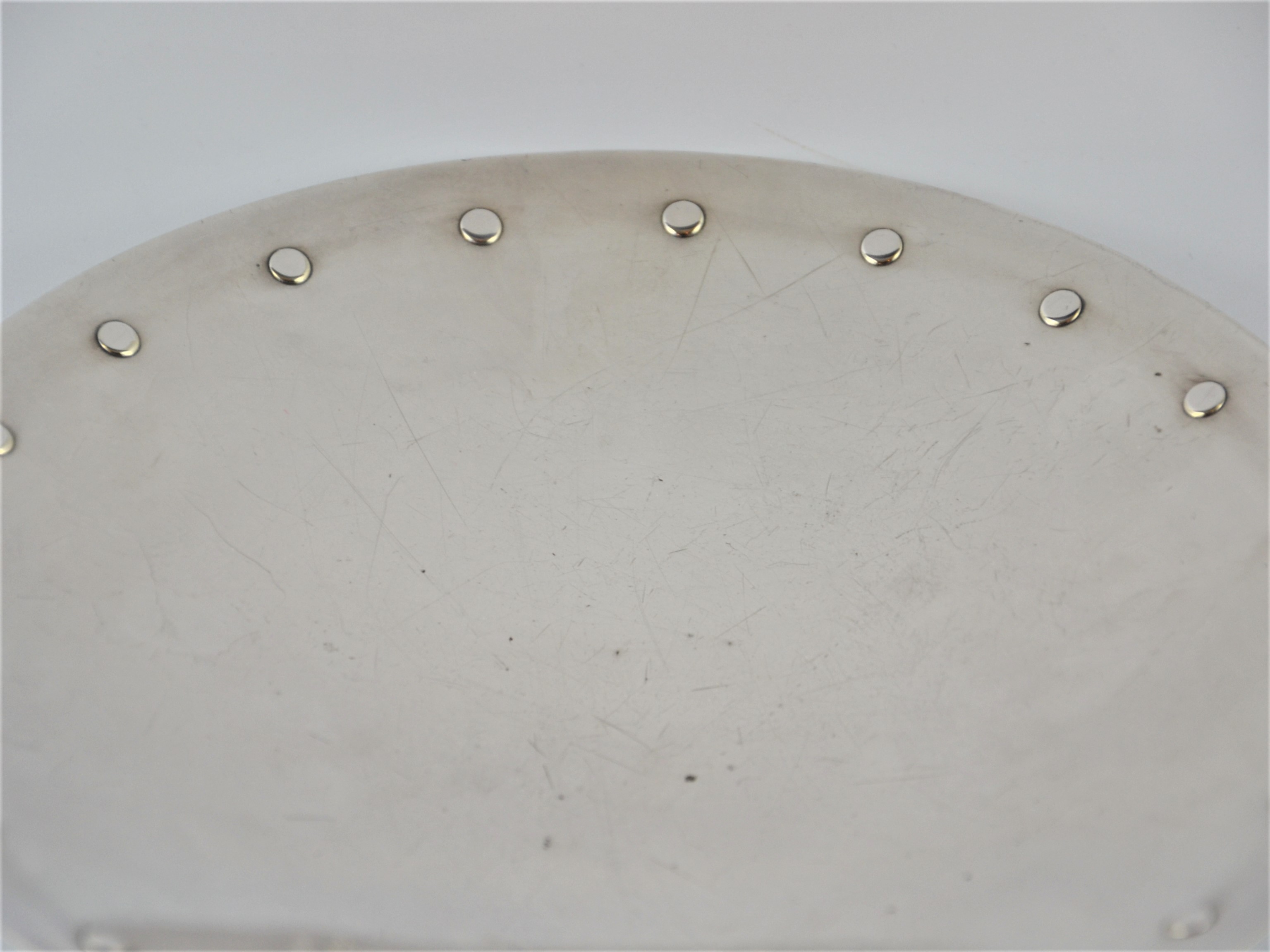Wyprzedaż Patera z lat 30tych, sygnatura angielskiej firmy: Bedford Plate - A- EPNS 8439 Hard Soldered. Bardzo ładna forma lekko podniesiona na pierścieniowej nóżce, na obrzeżu nitowana dekoracja . Doskonała na ciastka, owoce, bakalie. średnica 22,5cm, wys. 4,5cm stan jak na lata dobry, niewielkie ryski i przetarcia.