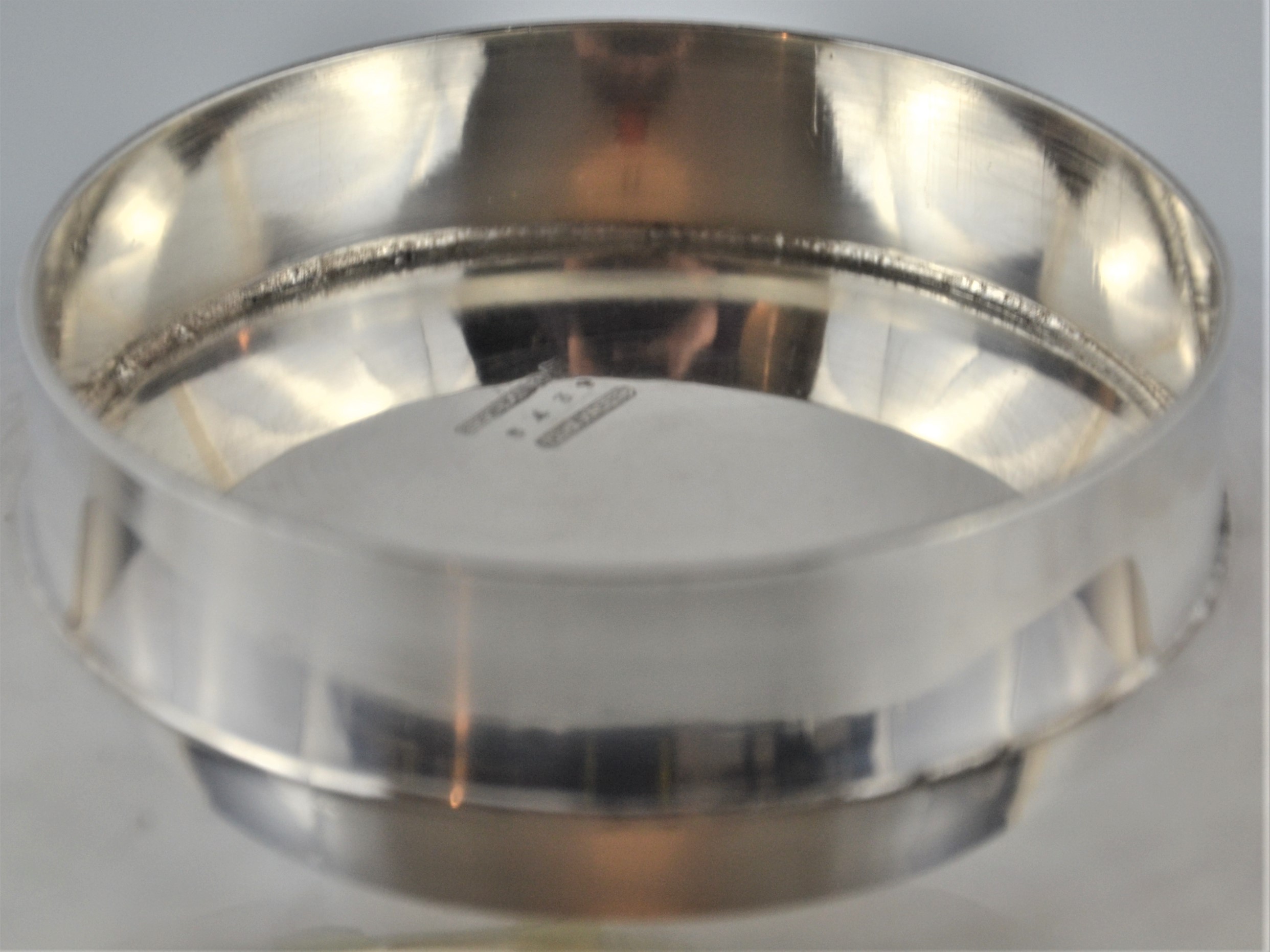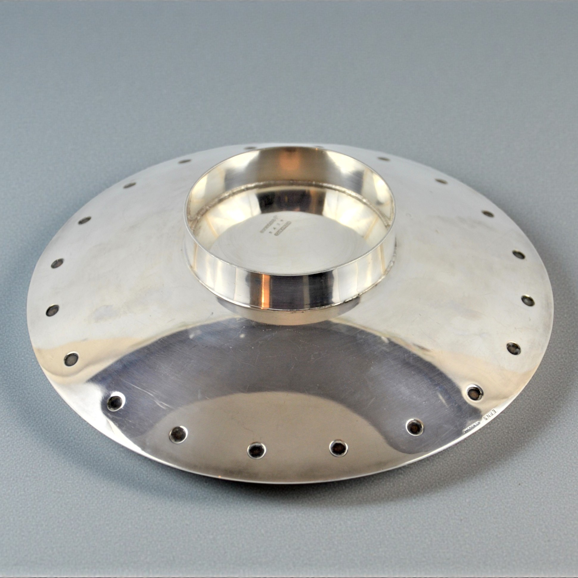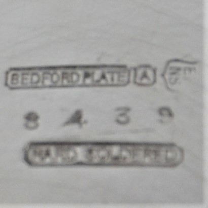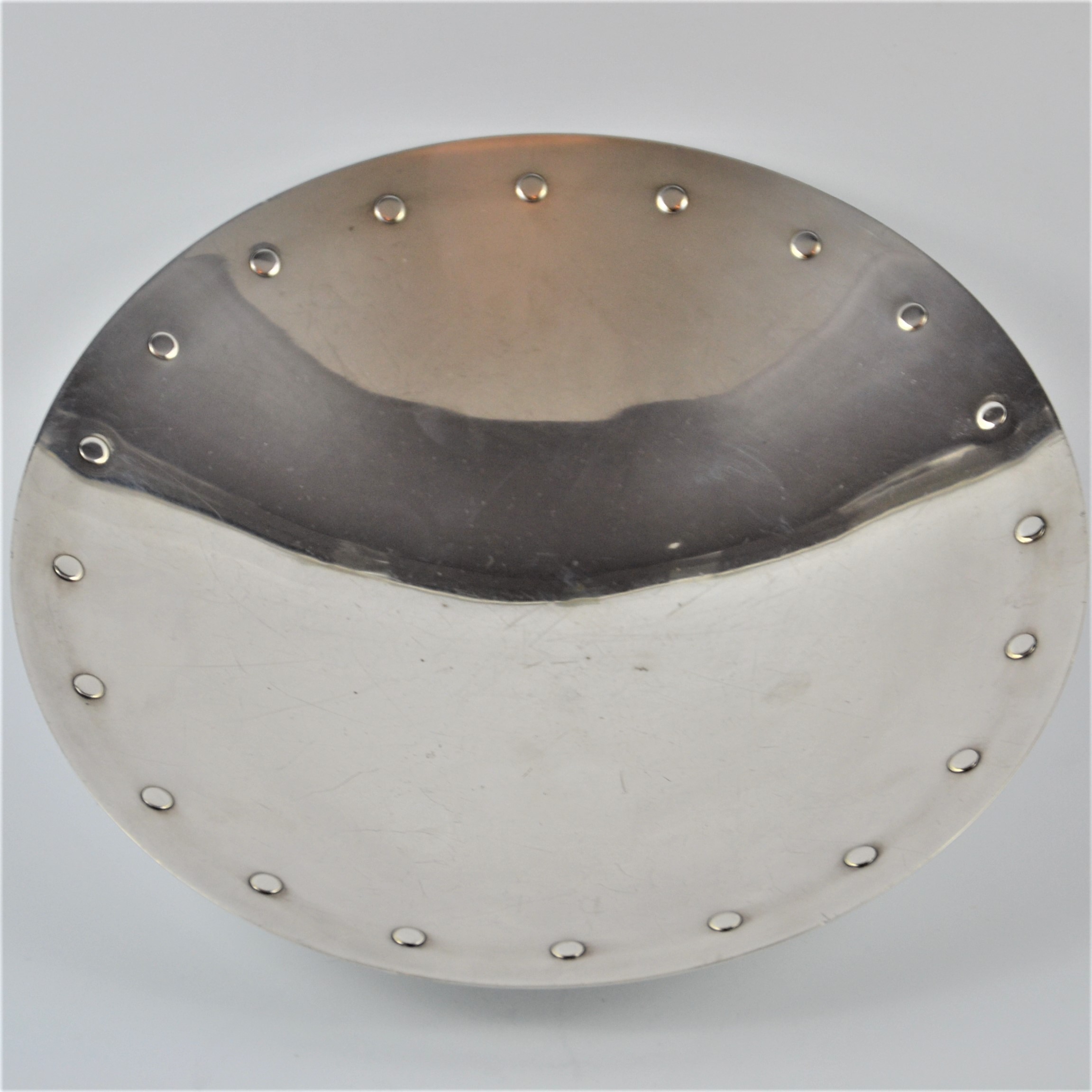 Wyprzedaż Patera z lat 30tych, sygnatura angielskiej firmy: Bedford Plate - A- EPNS 8439 Hard Soldered. Bardzo ładna forma lekko podniesiona na pierścieniowej nóżce, na obrzeżu nitowana dekoracja . Doskonała na ciastka, owoce, bakalie. średnica 22,5cm, wys. 4,5cm stan jak na lata dobry, niewielkie ryski i przetarcia.