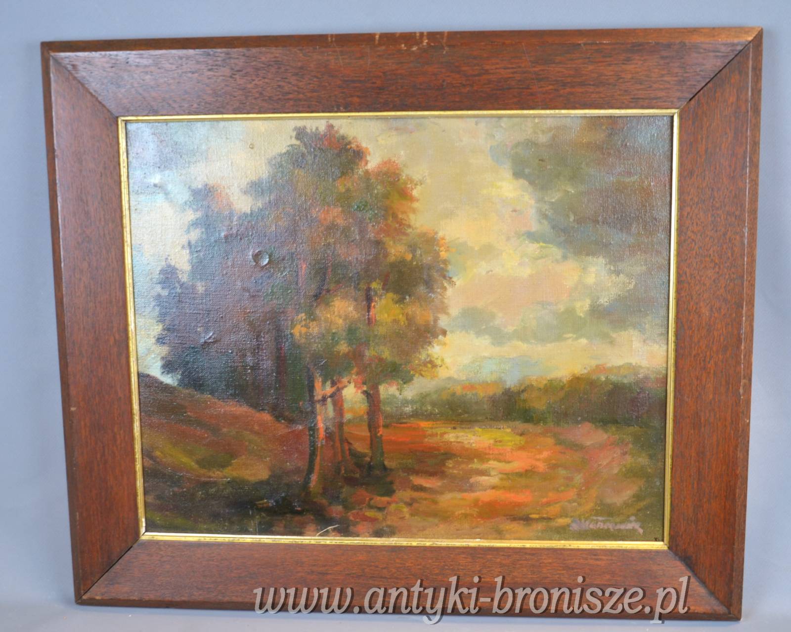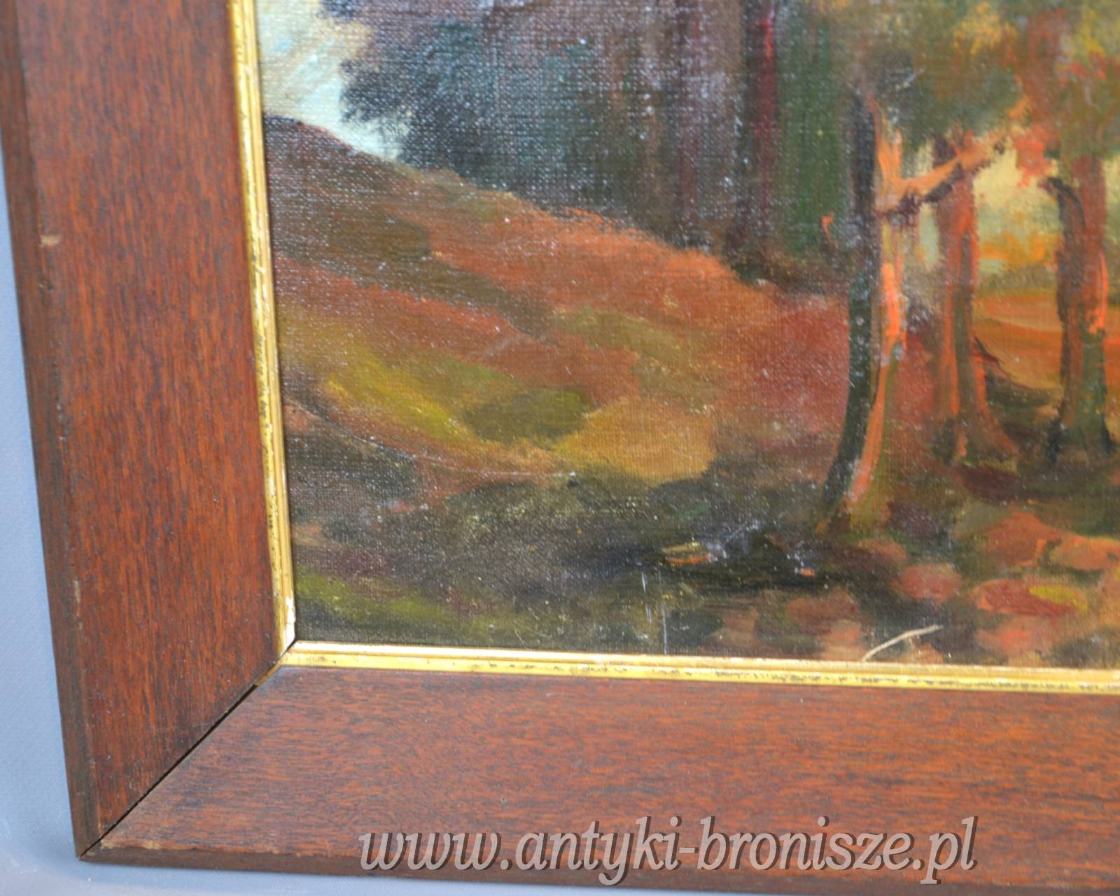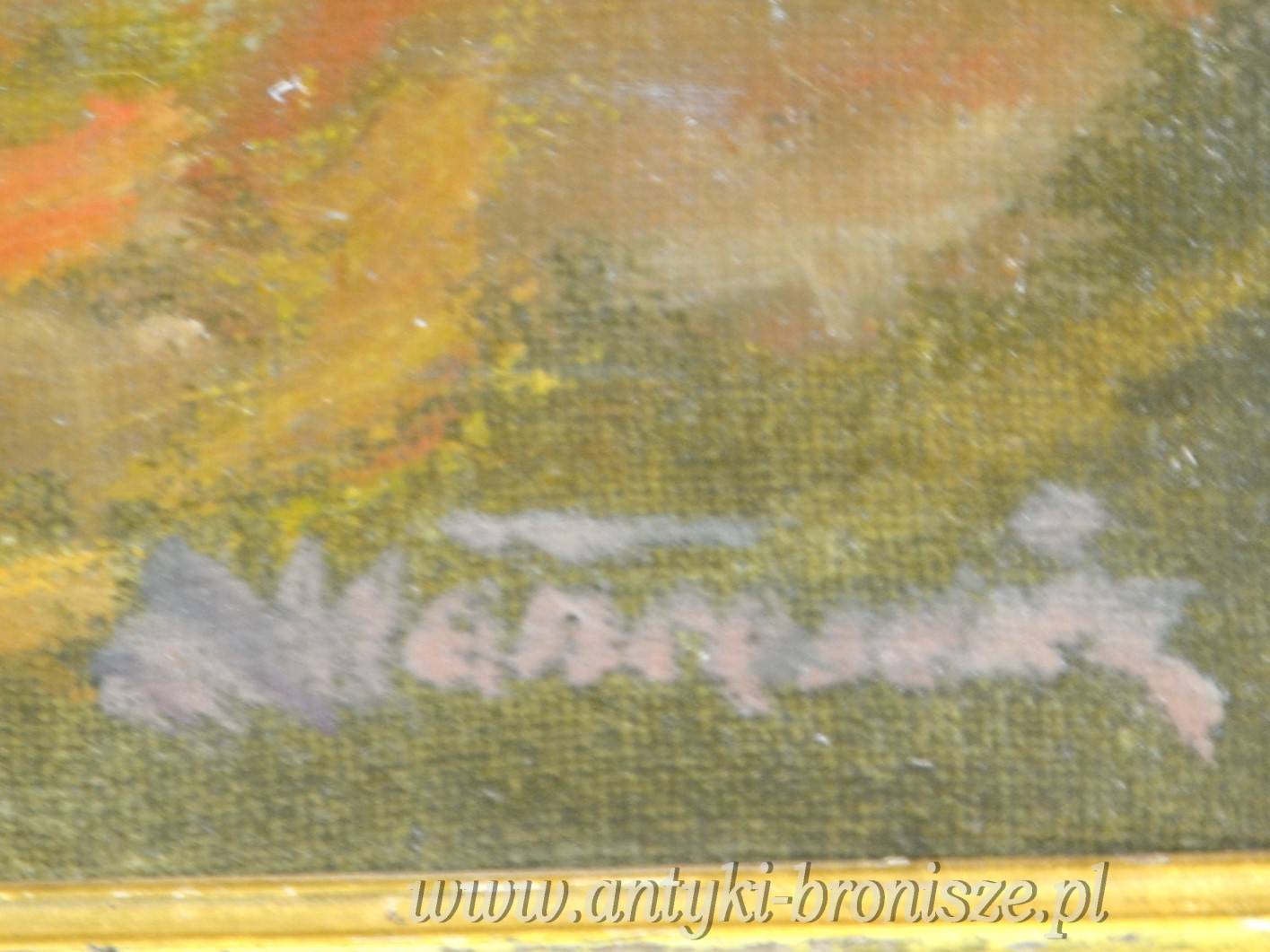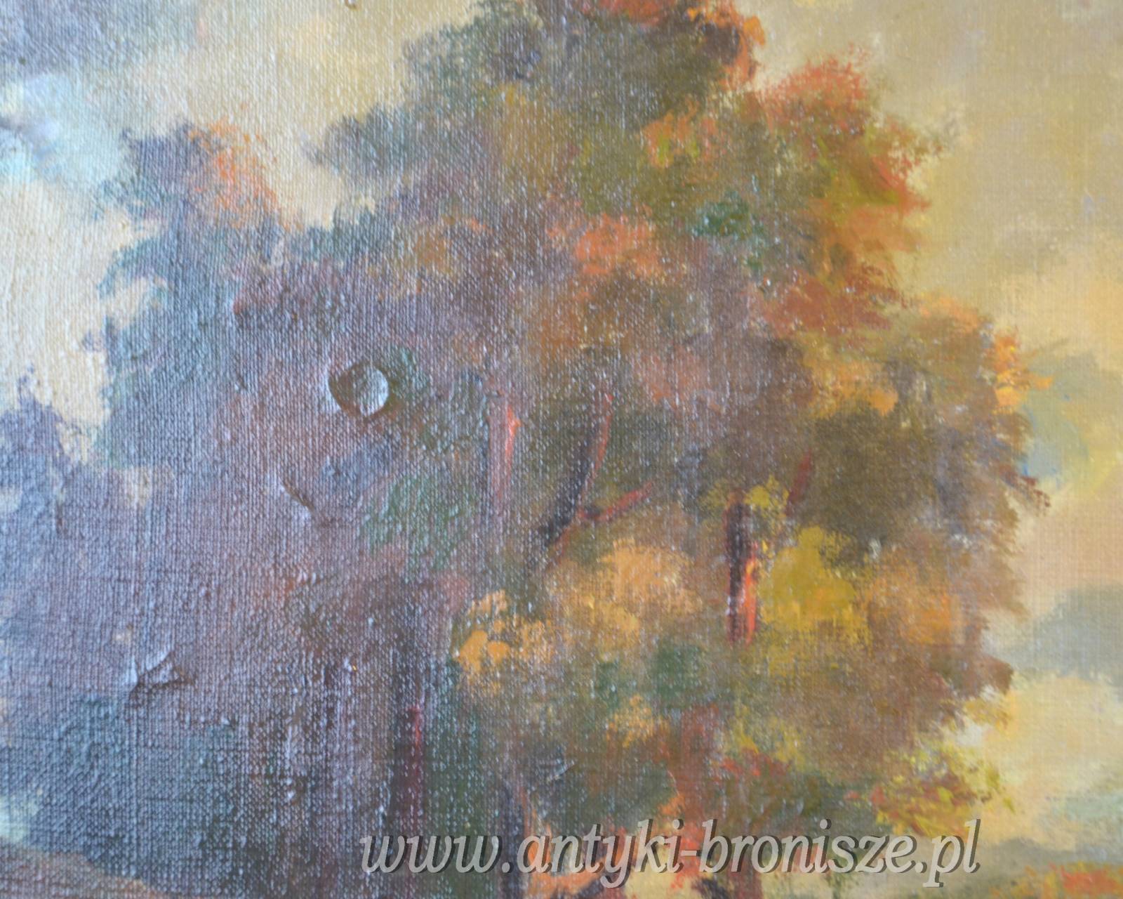 Pejzaż jesienny, olej na płótnie, podpis niezidentyfikowany, połowa XXw . Tematem przewodnim są drzewa w czerwono złotej poświacie . Obraz oprawiony w dębową, brązową ramę, wymiar 63/54cm w świetle 48/38cm