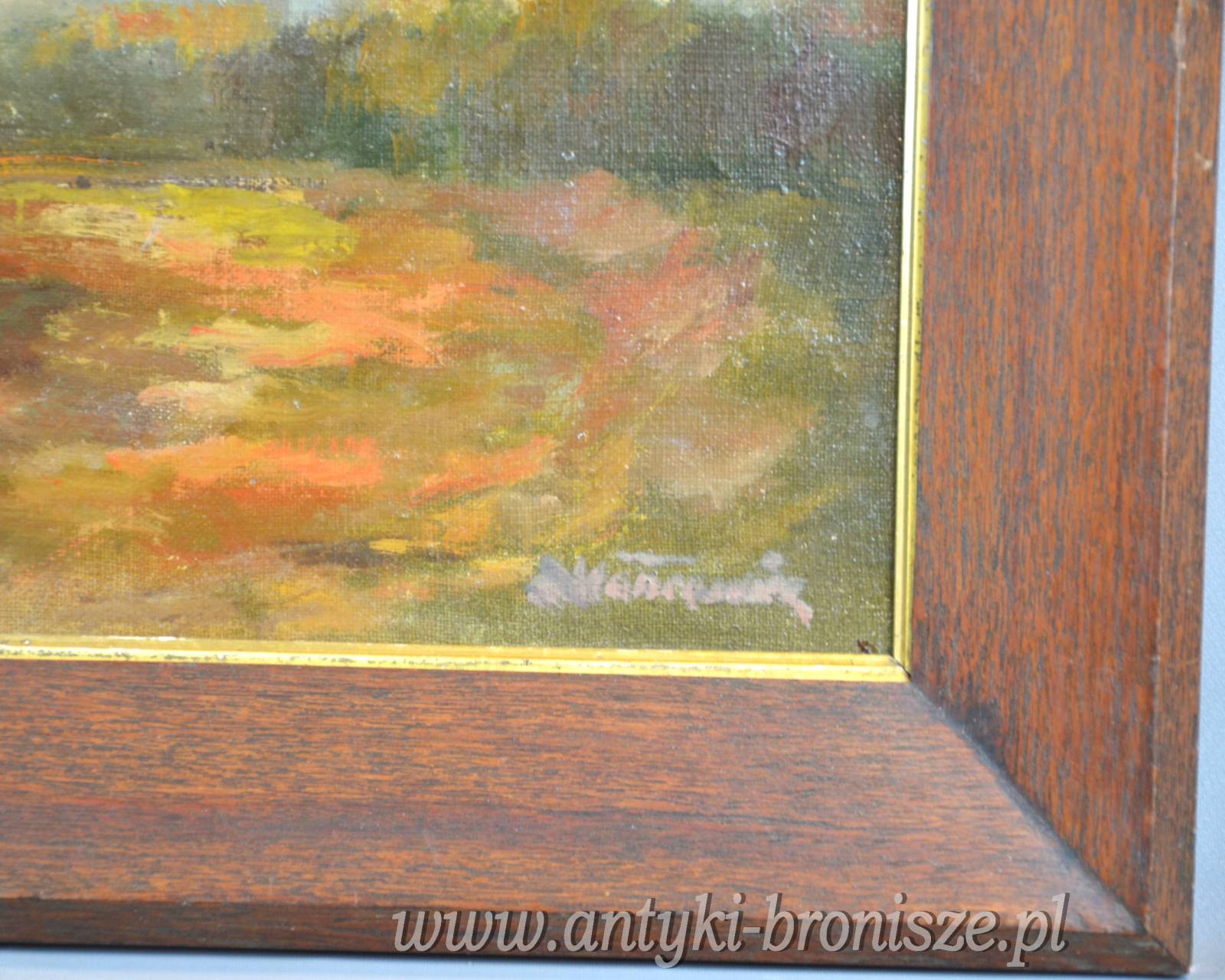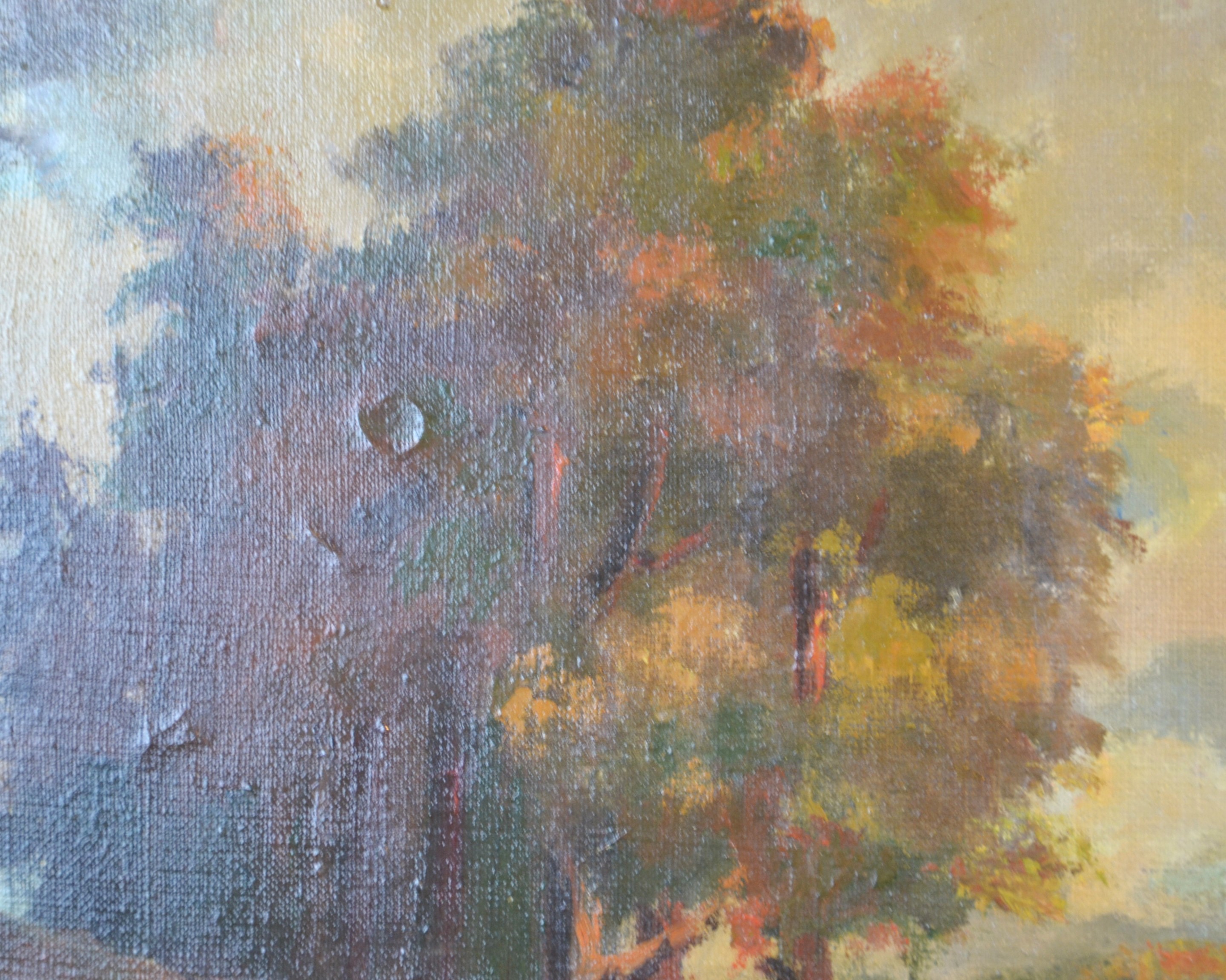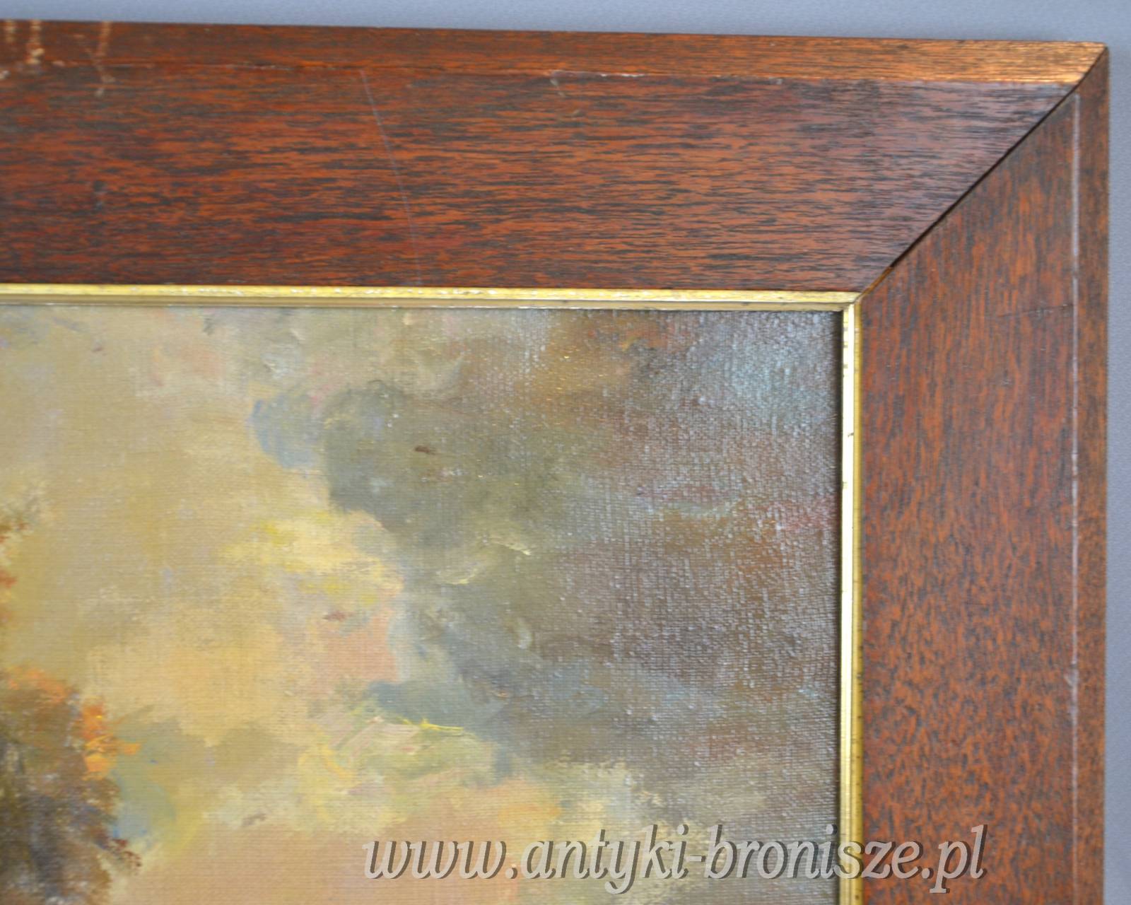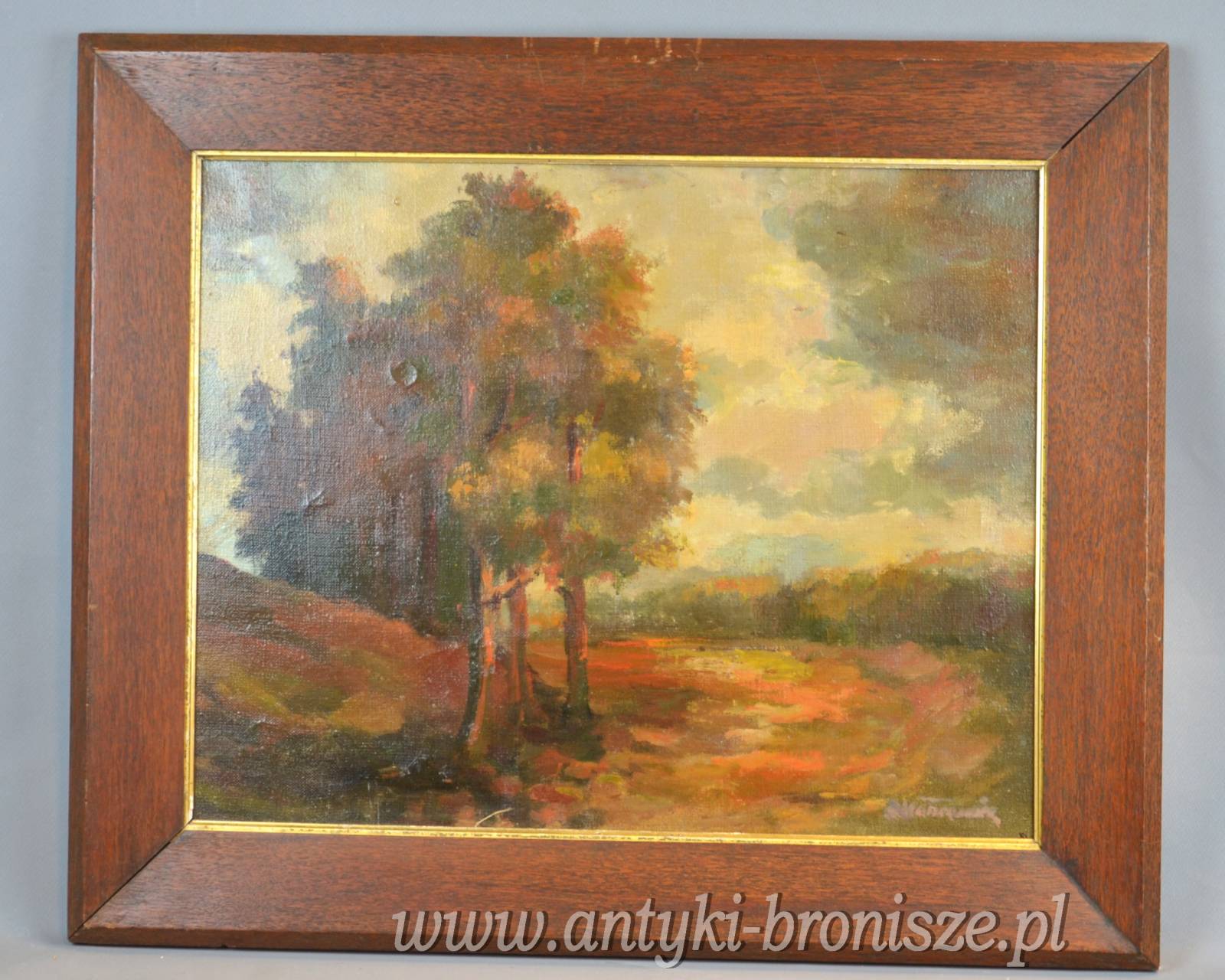 Pejzaż jesienny, olej na płótnie, podpis niezidentyfikowany, połowa XXw . Tematem przewodnim są drzewa w czerwono złotej poświacie . Obraz oprawiony w dębową, brązową ramę, wymiar 63/54cm w świetle 48/38cm