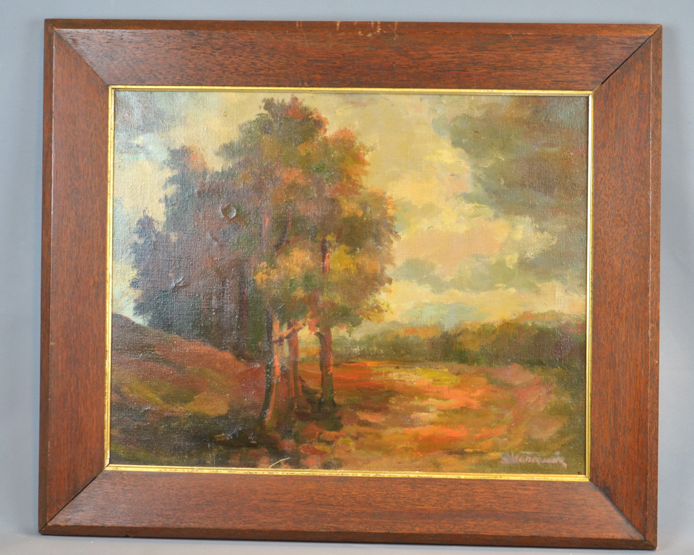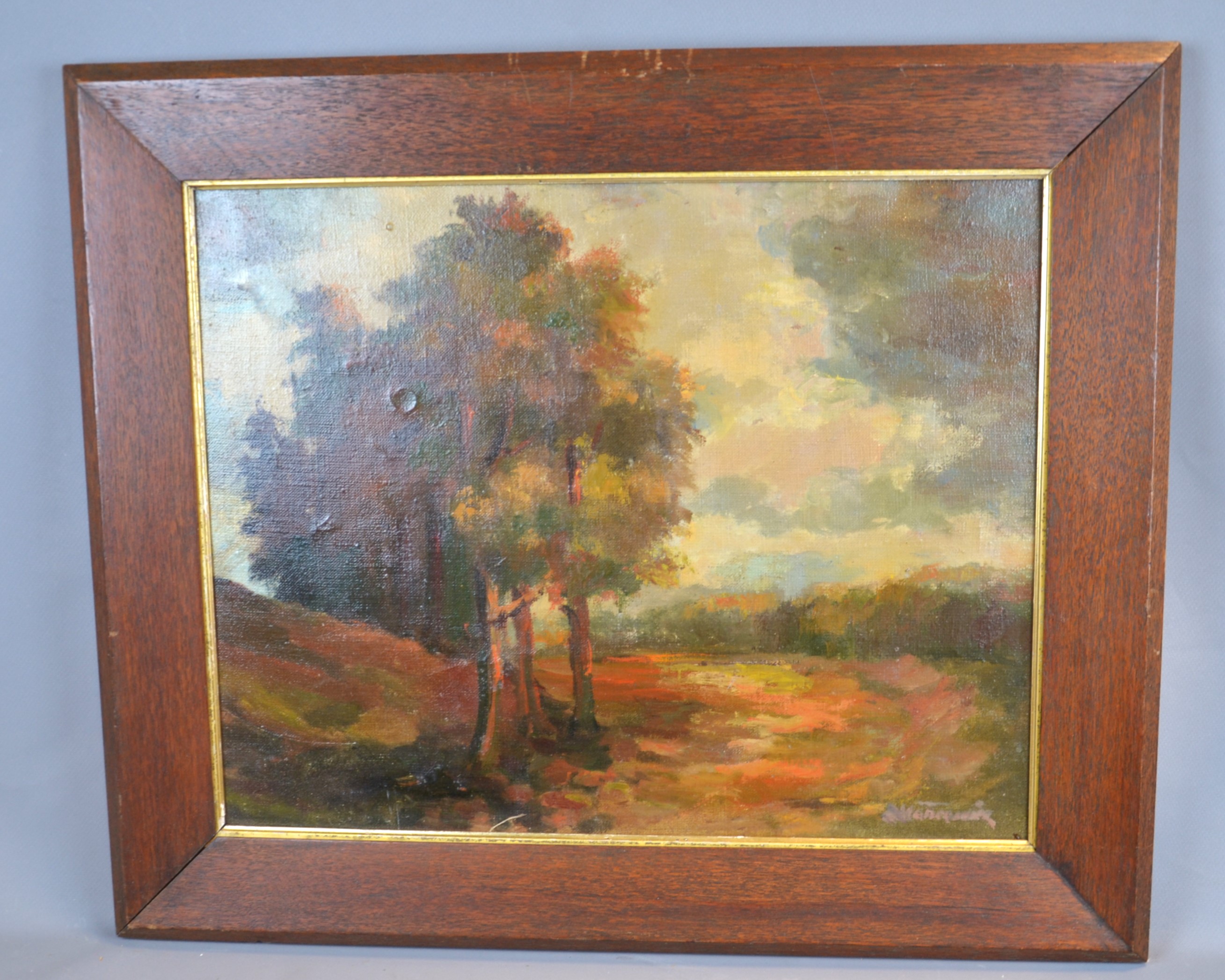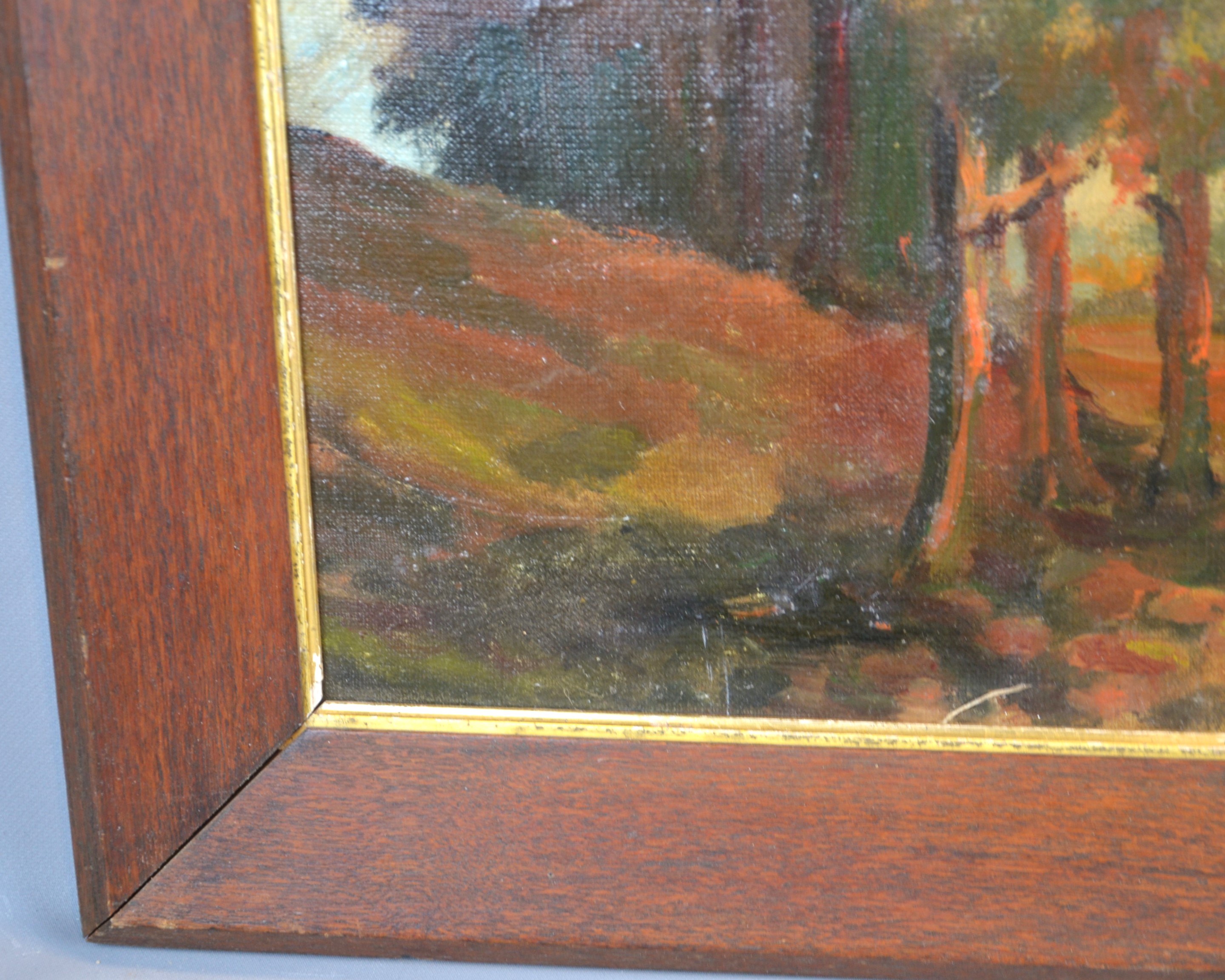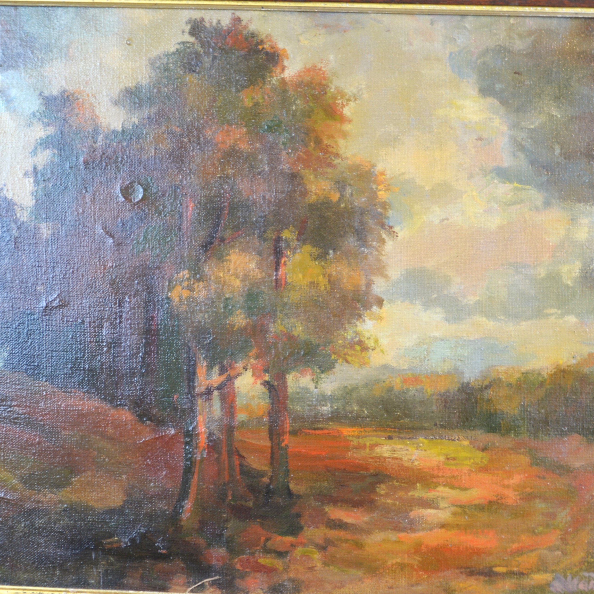 Pejzaż jesienny, olej na płótnie, podpis niezidentyfikowany, połowa XXw . Tematem przewodnim są drzewa w czerwono złotej poświacie . Obraz oprawiony w dębową, brązową ramę, wymiar 63/54cm w świetle 48/38cm
