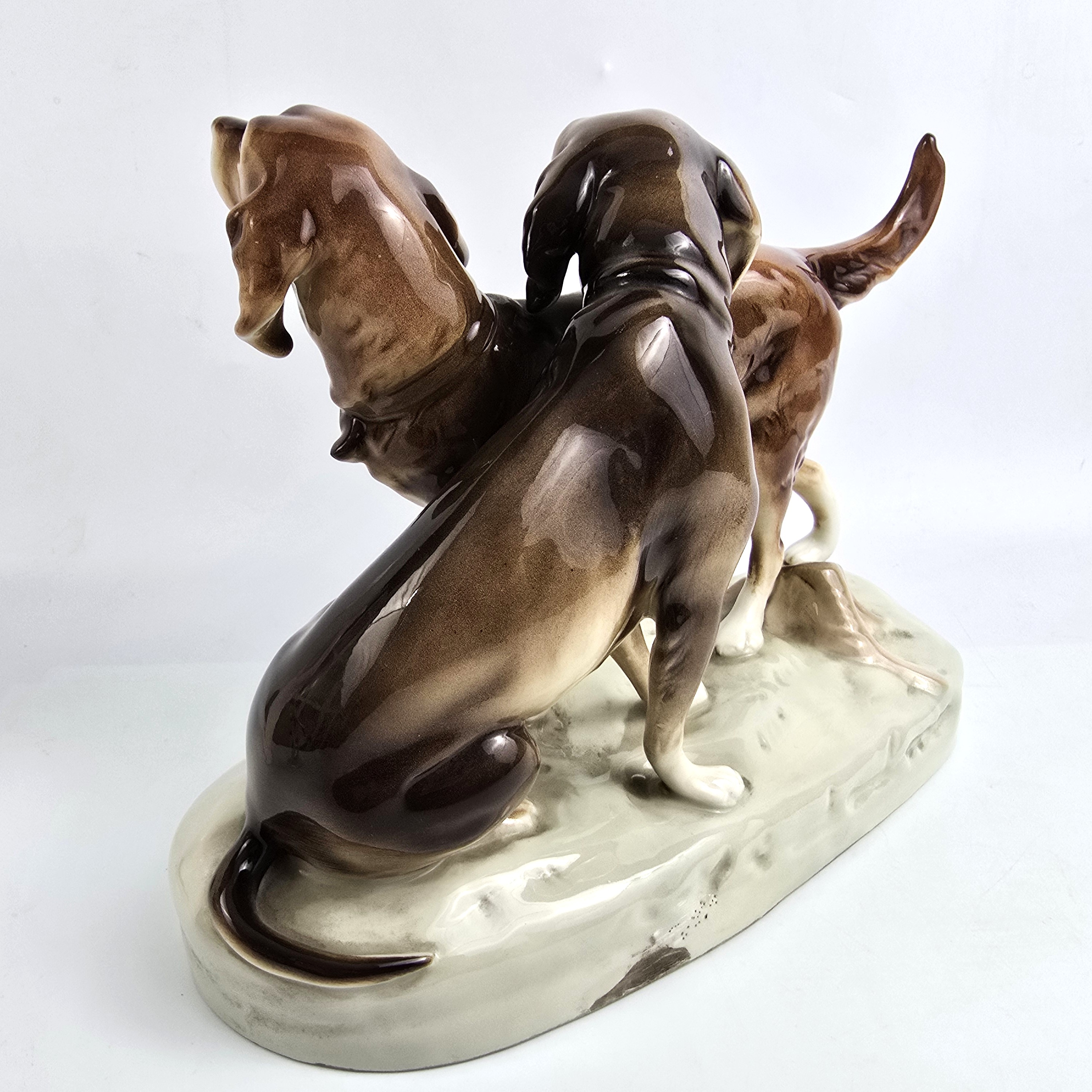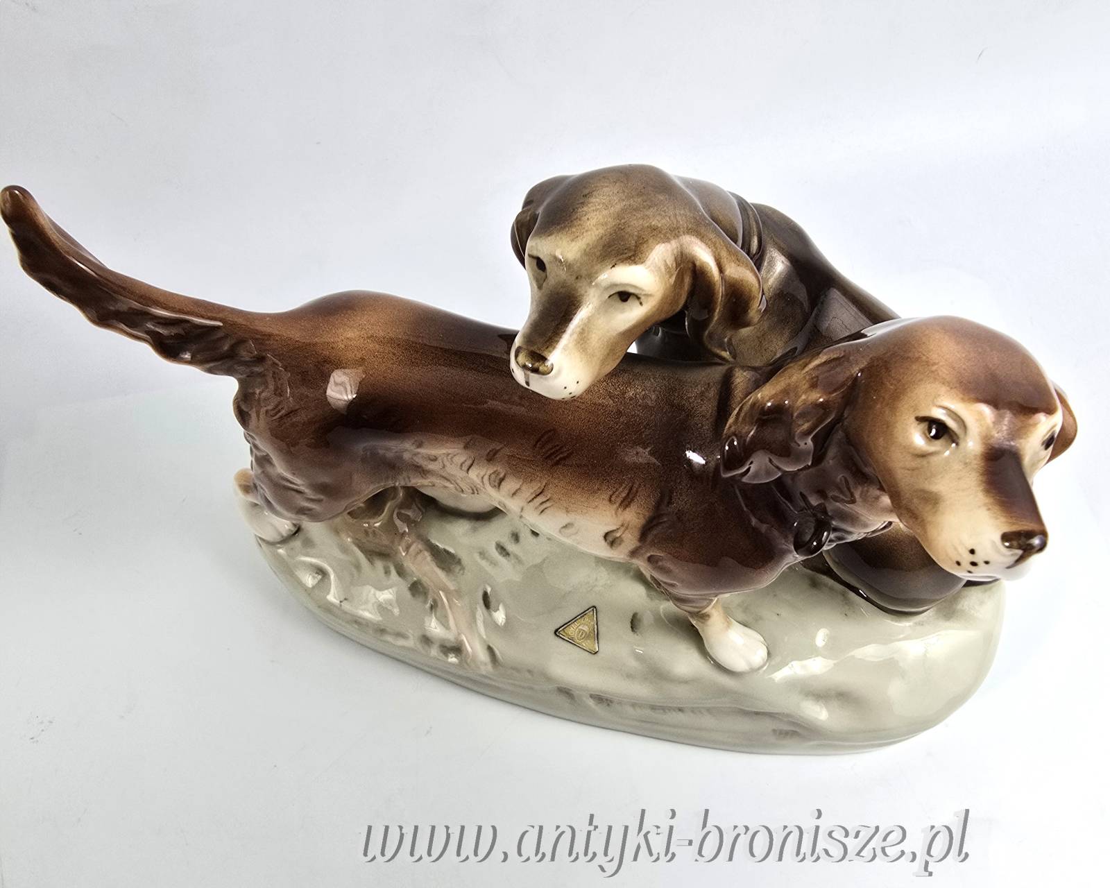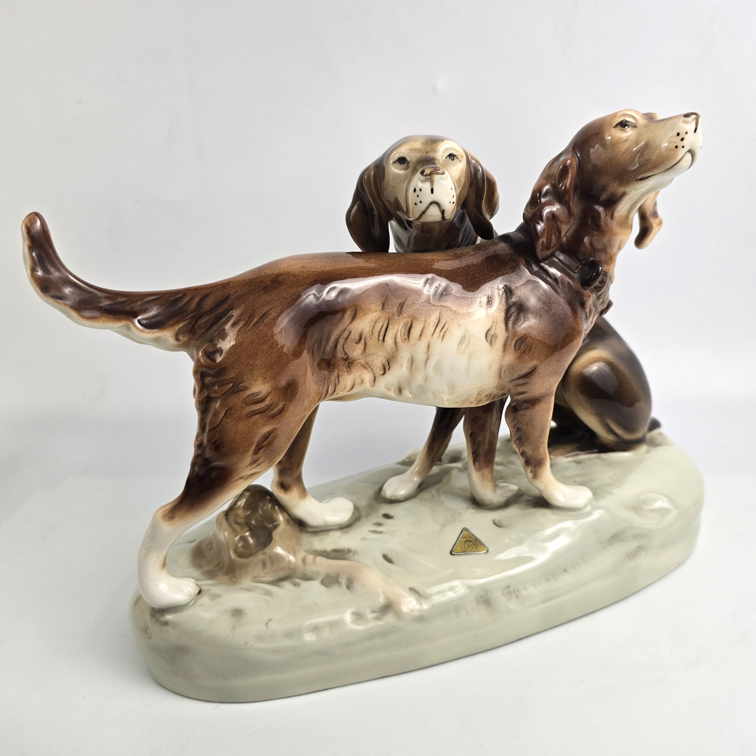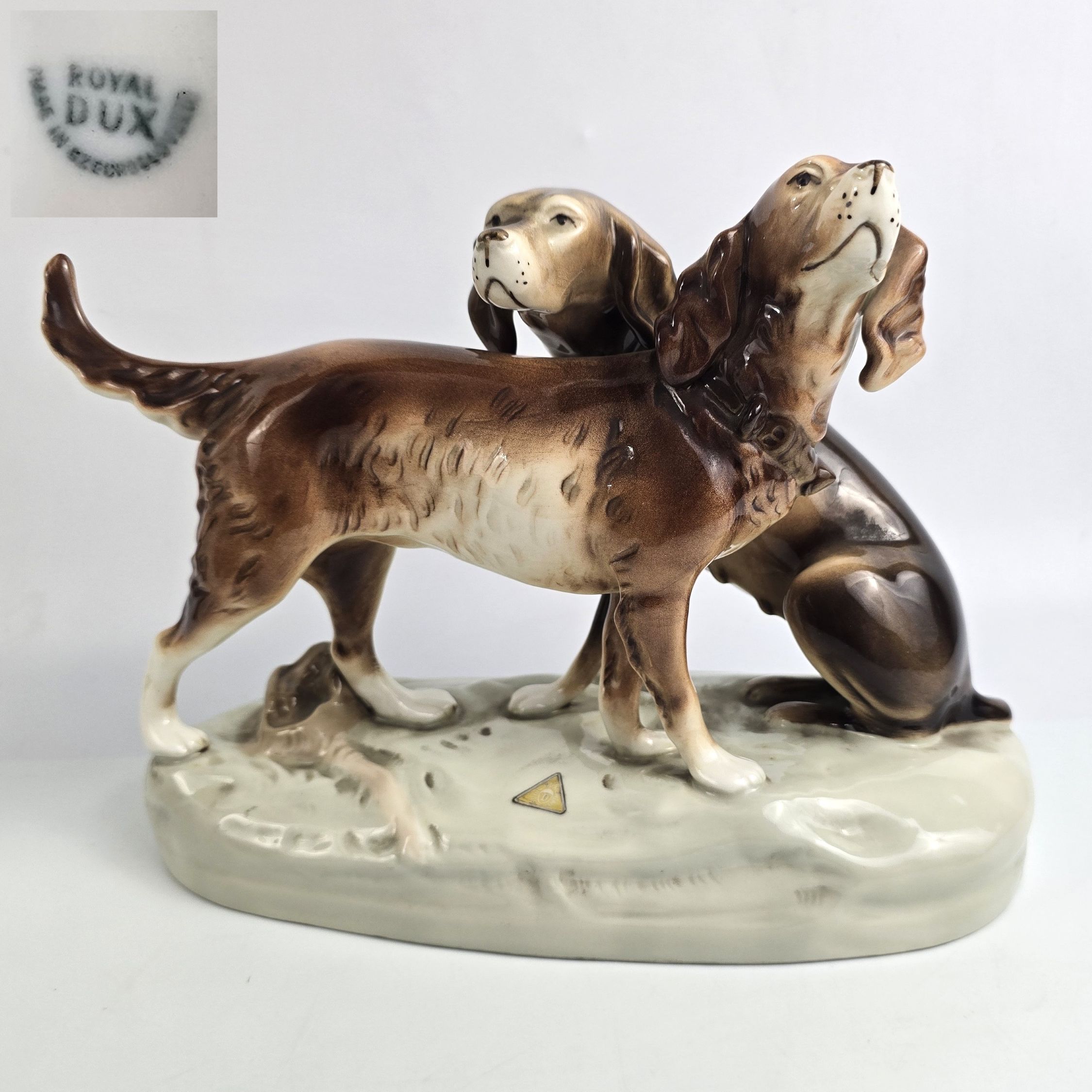 Podwójna figurka - para psów myśliwskich (Retriever i Pointer) z wytwórni Royal Dux Bohemia. Projekt przedwojenny, czeskie Art Nouveau sygnatura z połowy XXw,. Bardzo ładna forma na owalnej podstawie, realistyczna, lśniąca kolorystyka, wypracowane detale. Wysokość 21 cm długość 27 cm, szer.11 cm, stan bardzo dobry minimalne ślady użytkowania, jedno niedomalowanie szkliwa z tyłu na dole podstawy ( fotografia w zbliżeniu). Interesujący temat dla myśliwych i miłośników psów,
