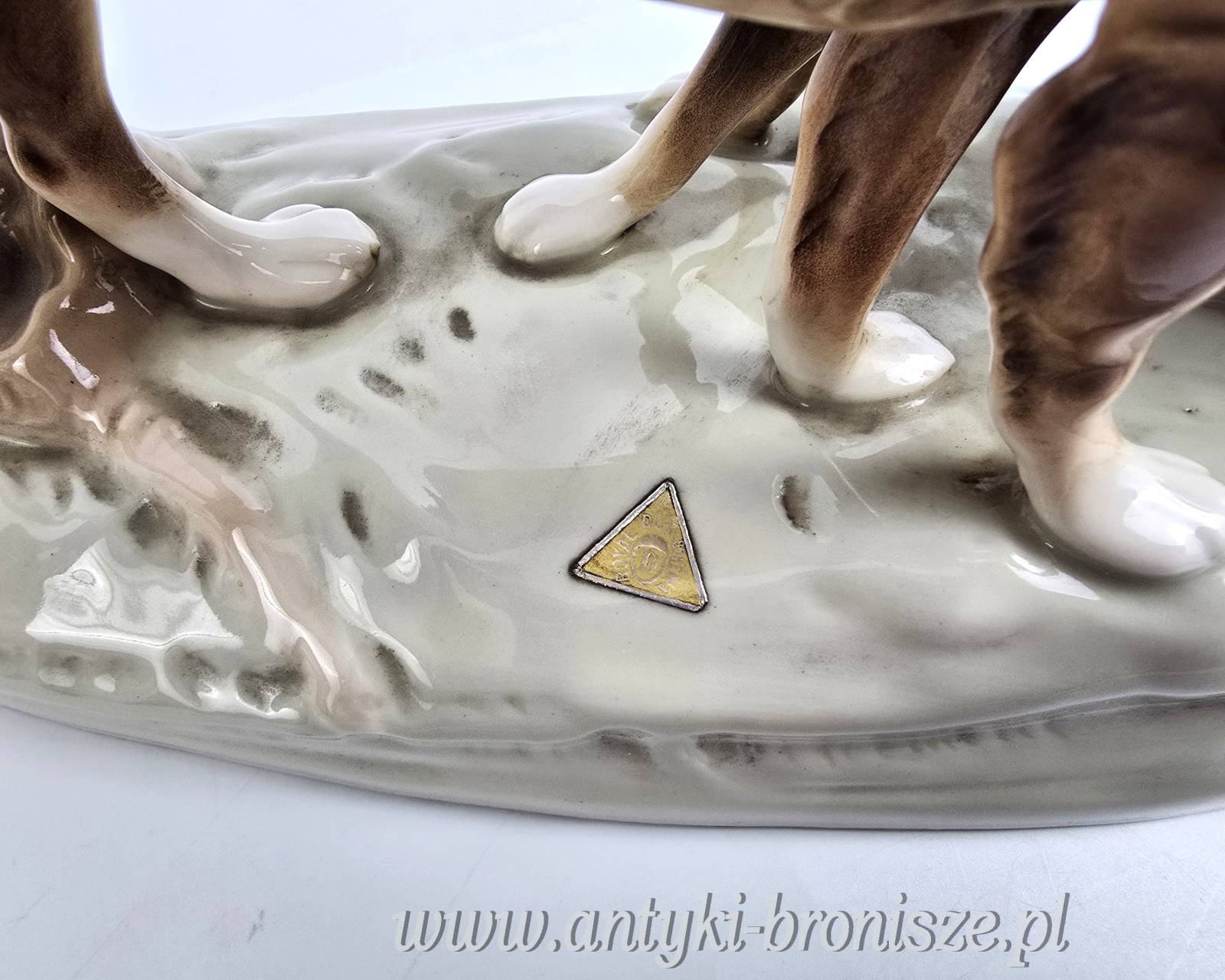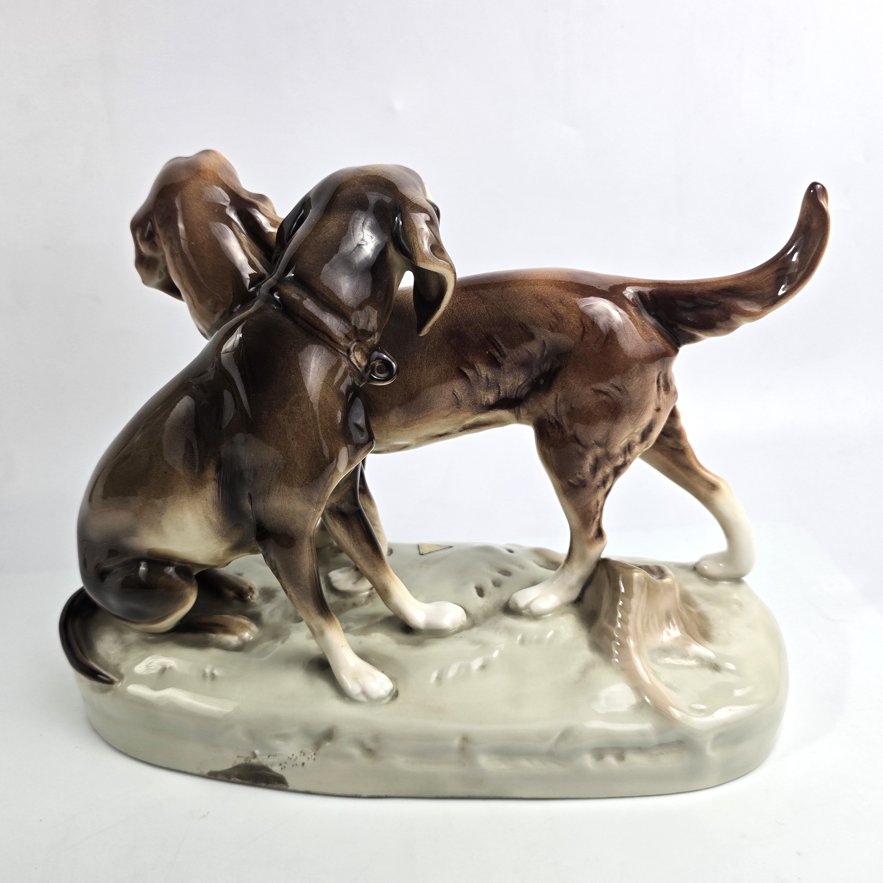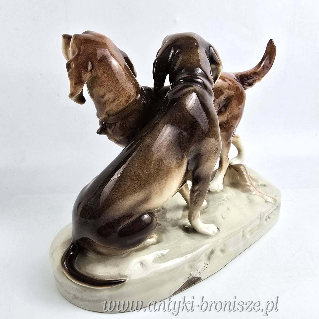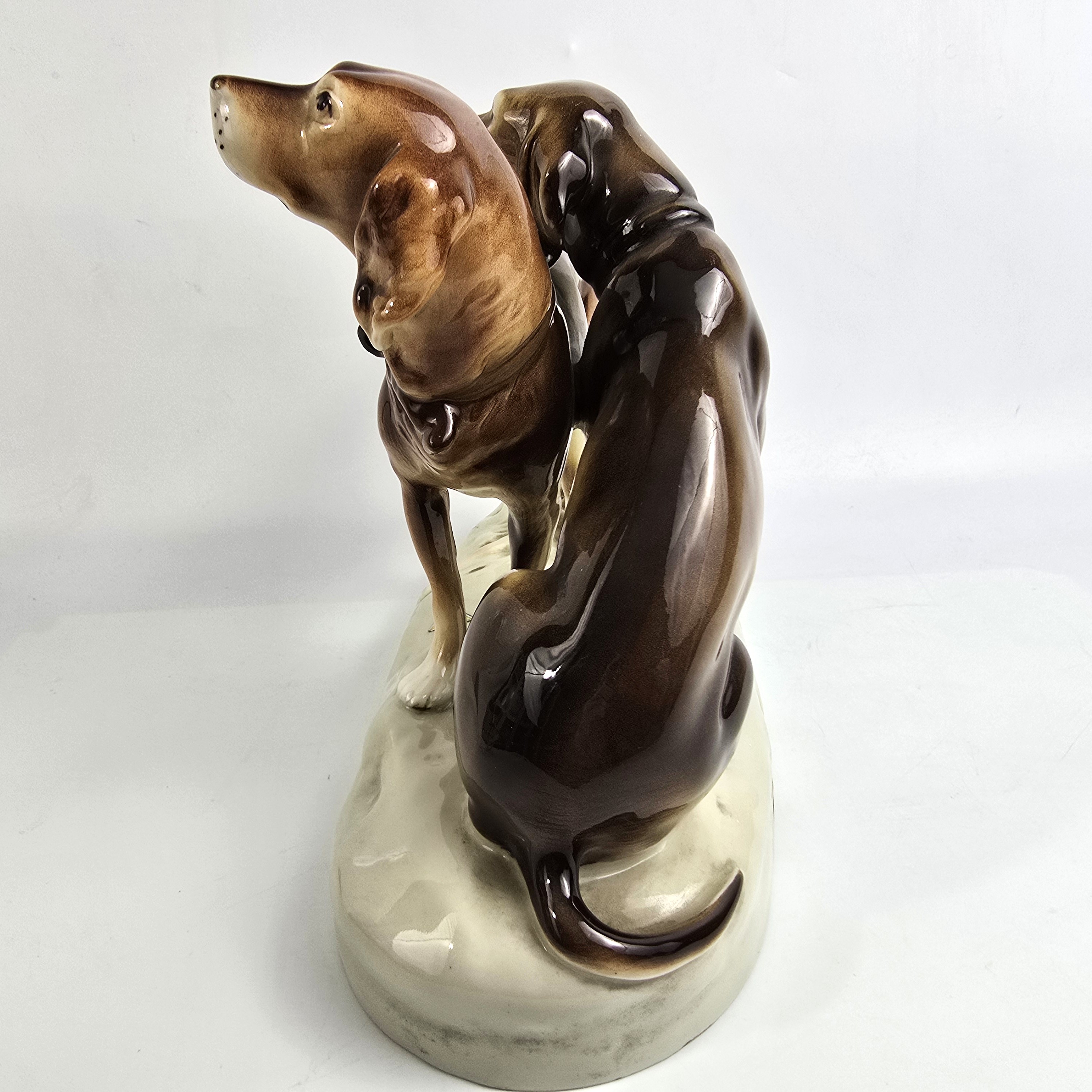 Podwójna figurka - para psów myśliwskich (Retriever i Pointer) z wytwórni Royal Dux Bohemia. Projekt przedwojenny, czeskie Art Nouveau sygnatura z połowy XXw,. Bardzo ładna forma na owalnej podstawie, realistyczna, lśniąca kolorystyka, wypracowane detale. Wysokość 21 cm długość 27 cm, szer.11 cm, stan bardzo dobry minimalne ślady użytkowania, jedno niedomalowanie szkliwa z tyłu na dole podstawy ( fotografia w zbliżeniu). Interesujący temat dla myśliwych i miłośników psów,