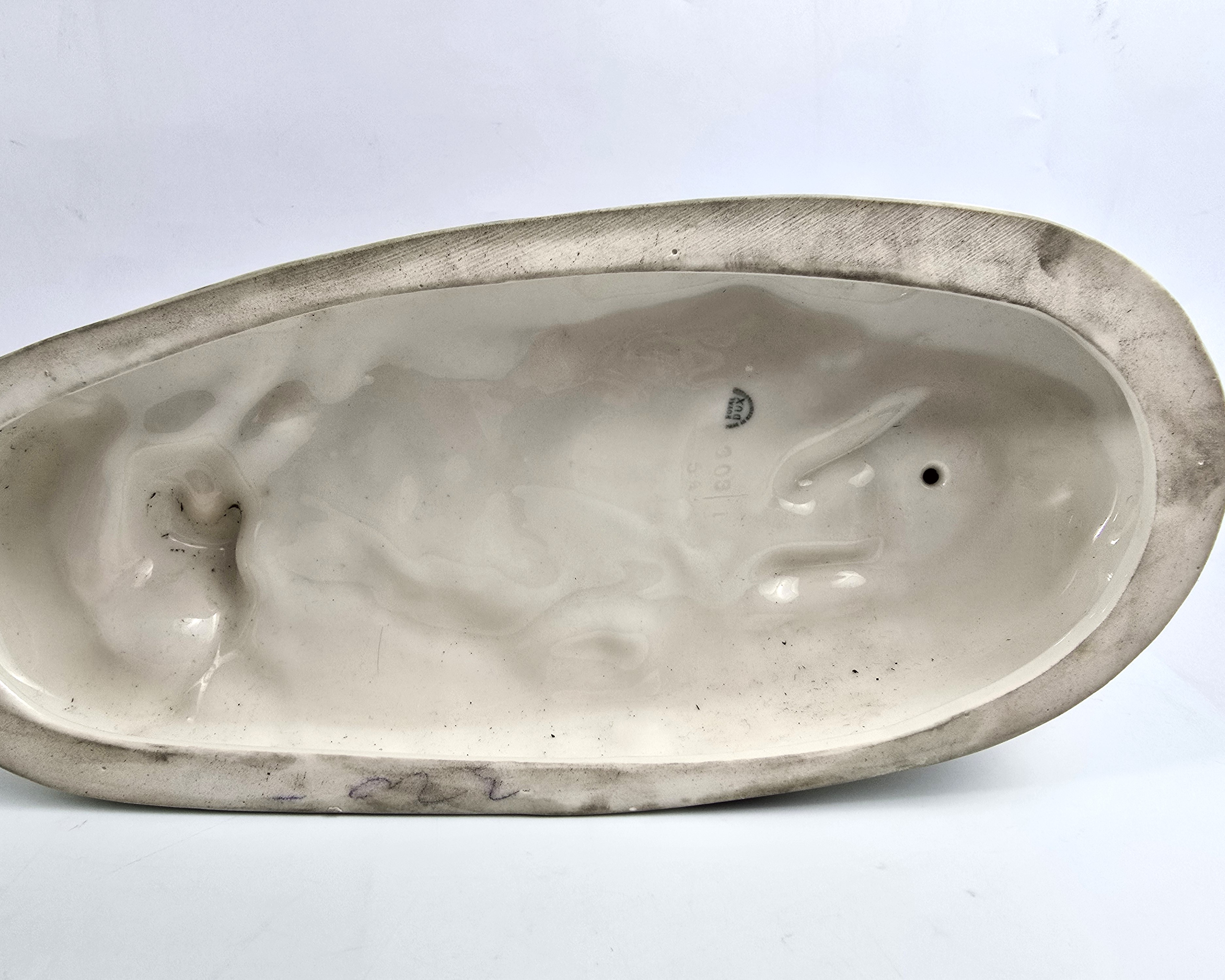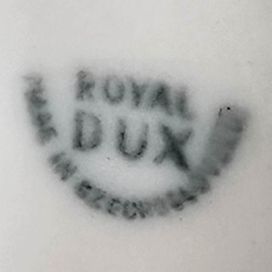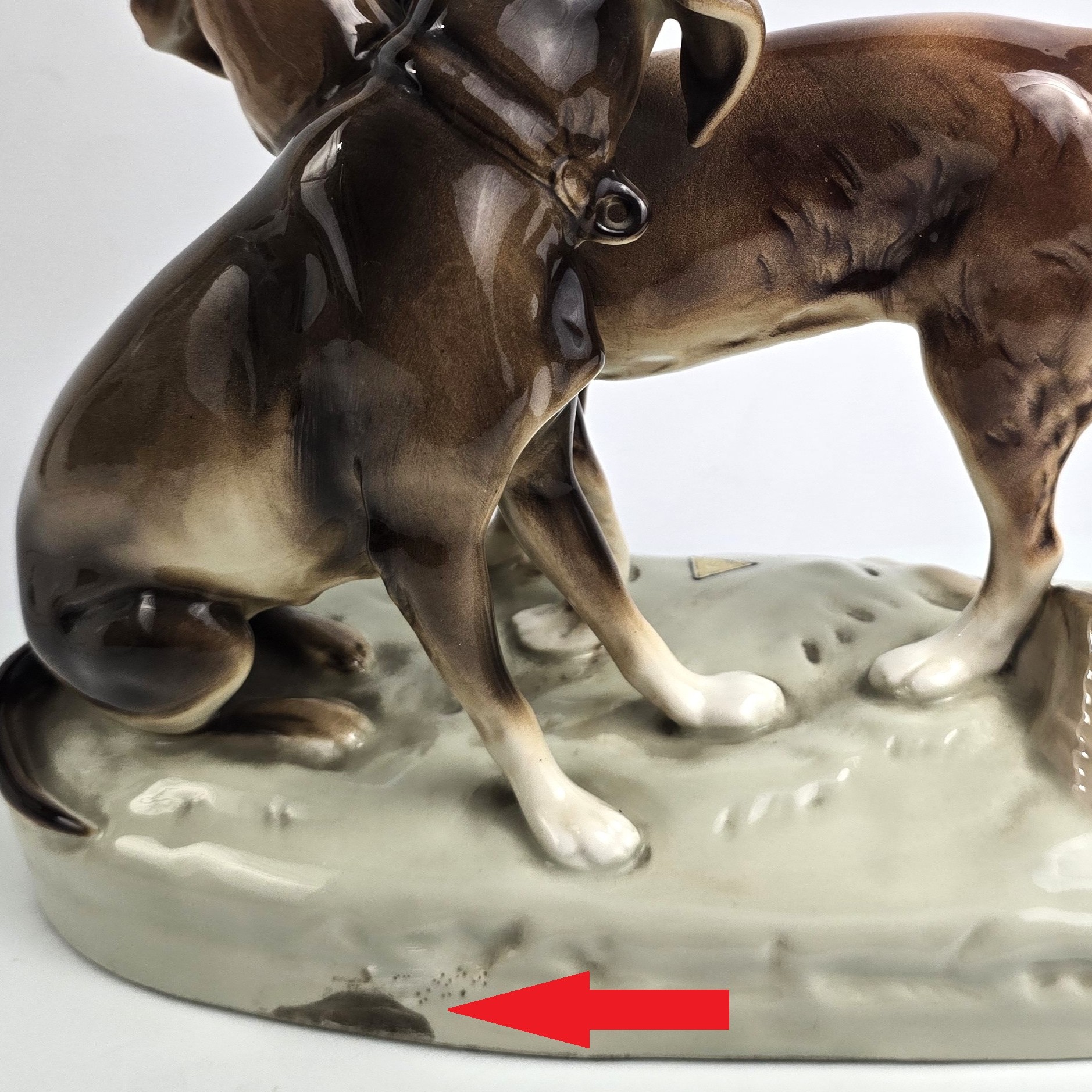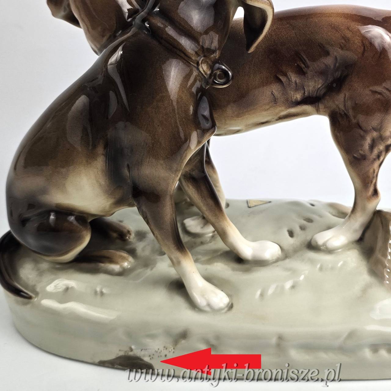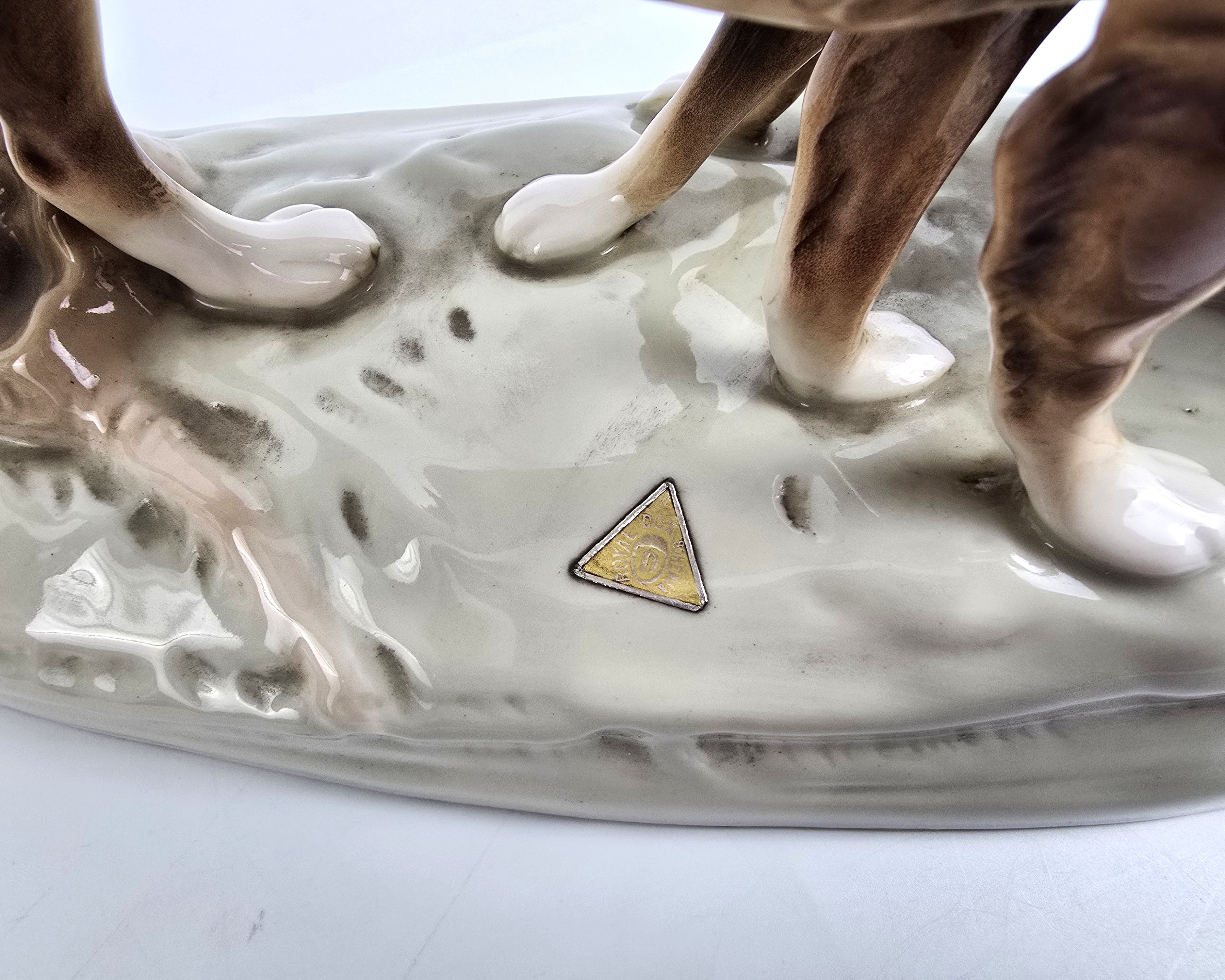 Podwójna figurka - para psów myśliwskich (Retriever i Pointer) z wytwórni Royal Dux Bohemia. Projekt przedwojenny, czeskie Art Nouveau sygnatura z połowy XXw,. Bardzo ładna forma na owalnej podstawie, realistyczna, lśniąca kolorystyka, wypracowane detale. Wysokość 21 cm długość 27 cm, szer.11 cm, stan bardzo dobry minimalne ślady użytkowania, jedno niedomalowanie szkliwa z tyłu na dole podstawy ( fotografia w zbliżeniu). Interesujący temat dla myśliwych i miłośników psów,