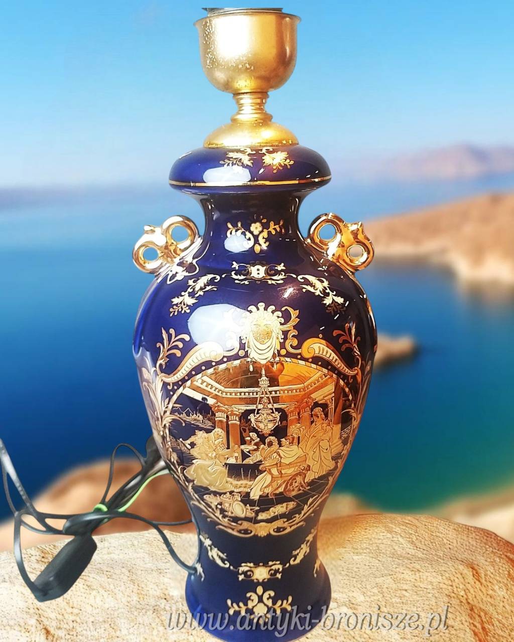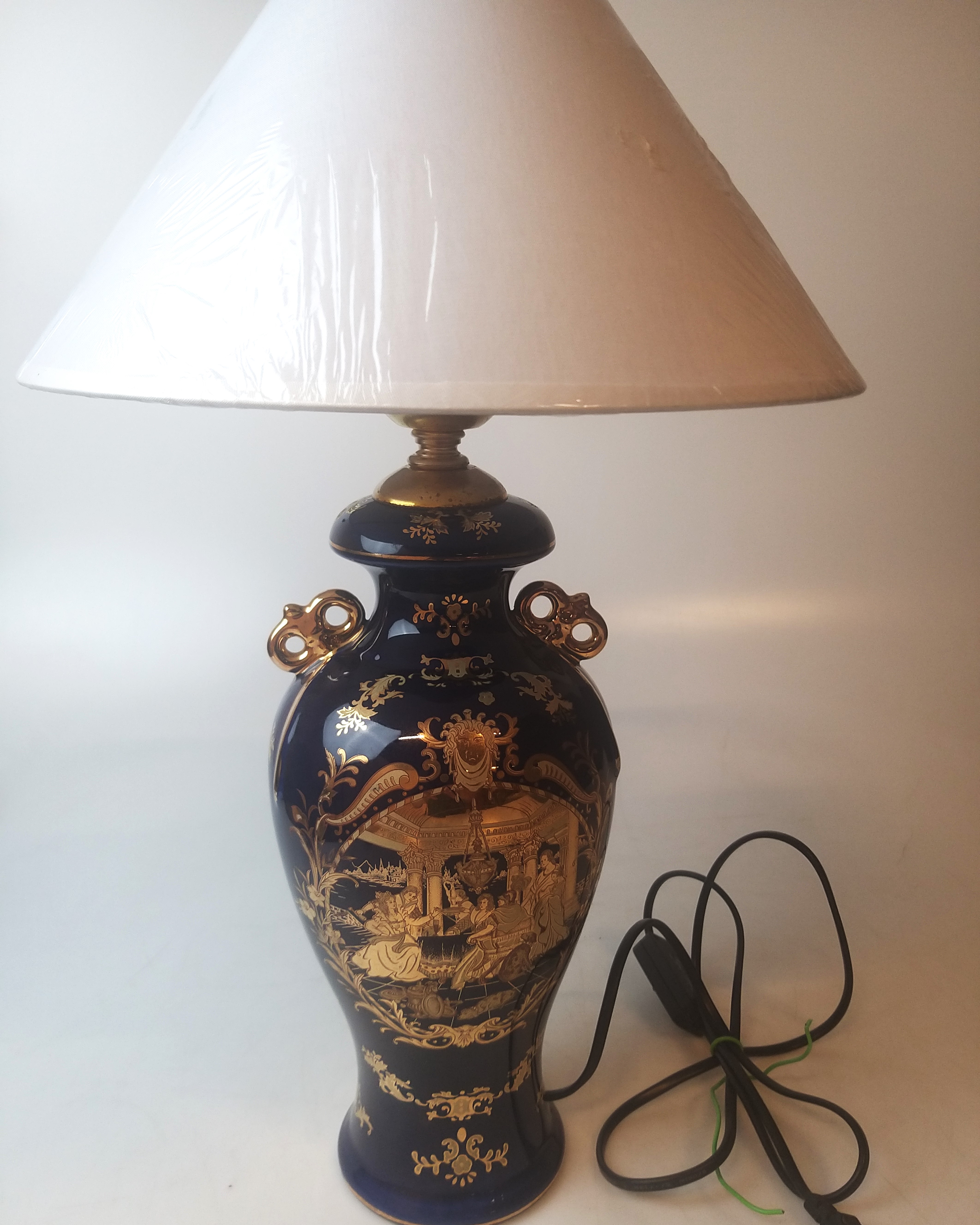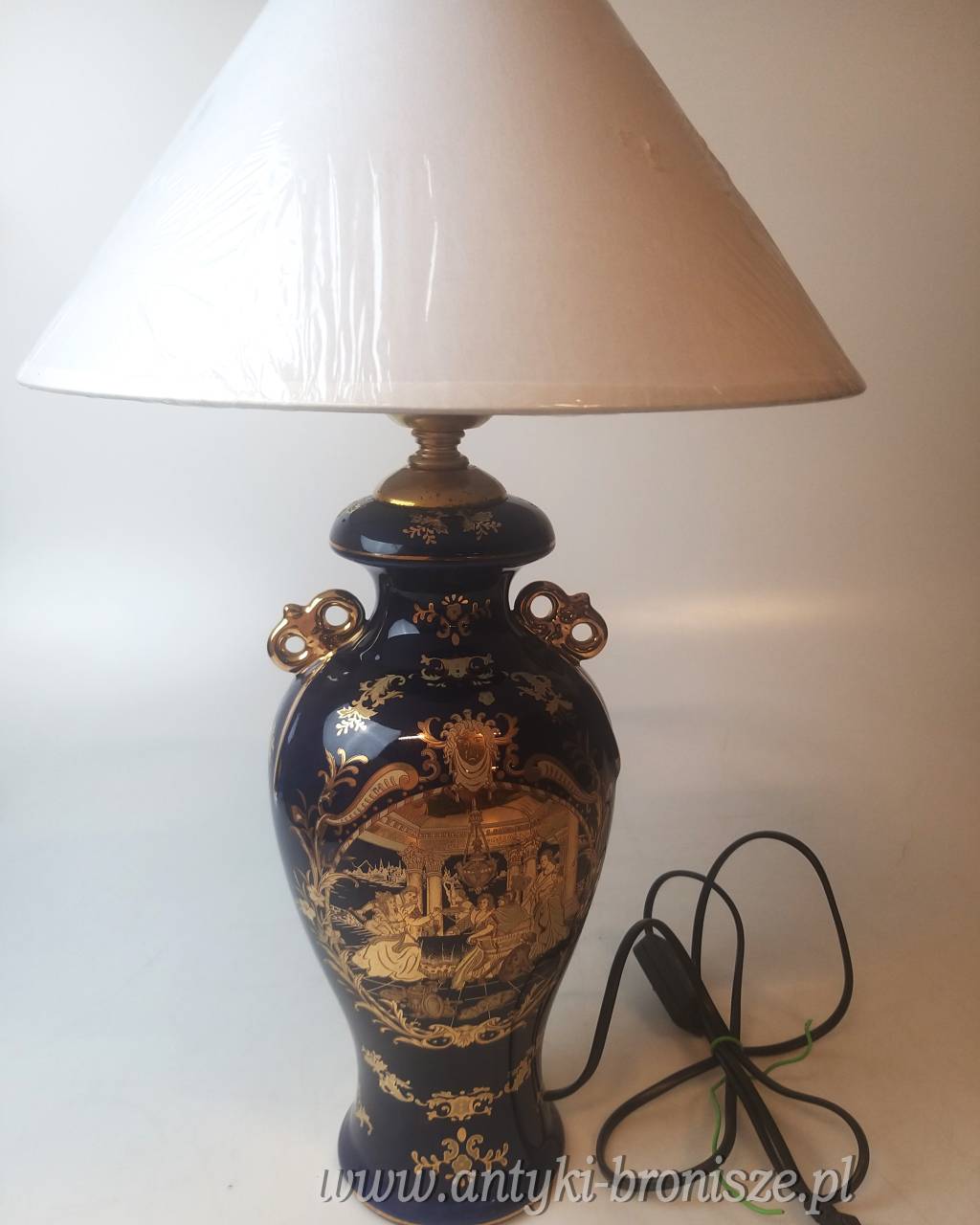 Porcelana w kolorze kobaltowym ze złotą dekoracją, złotymi akcentami, dekorowana dworską sceną po obu stronach. Lampa sprawna wyposażona w kabel, włącznik i wtyczkę. Wysokość lampy z oprawką wynosi ok. 42cm. szer. ok. 17cm średnica podstawy 11cm