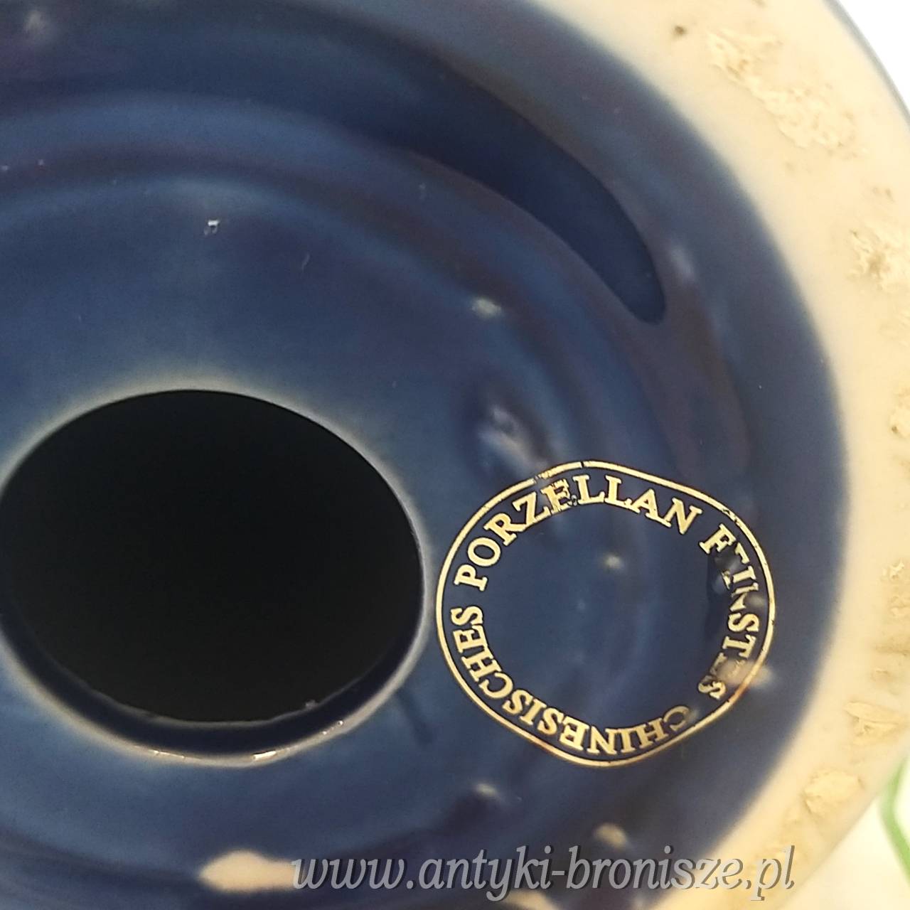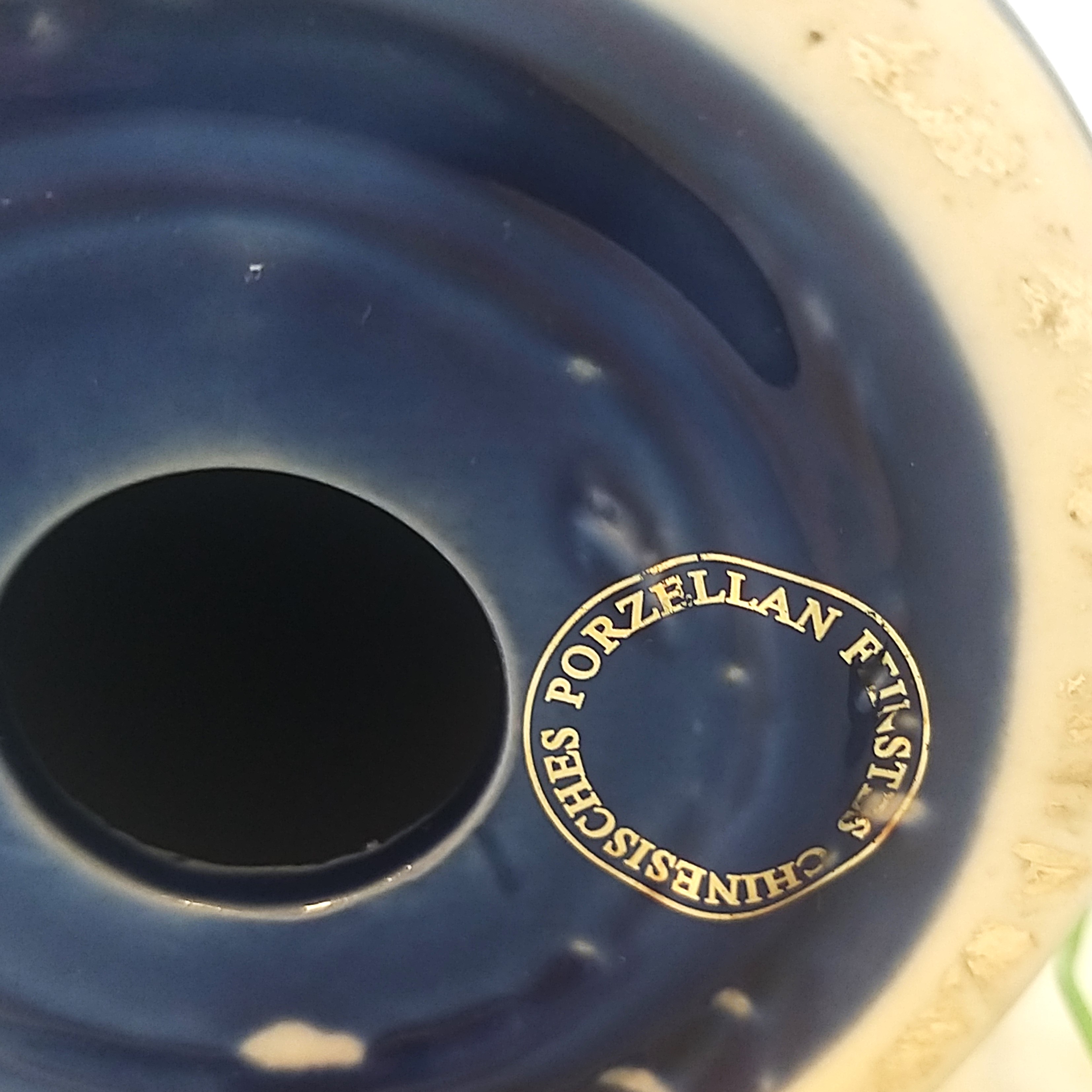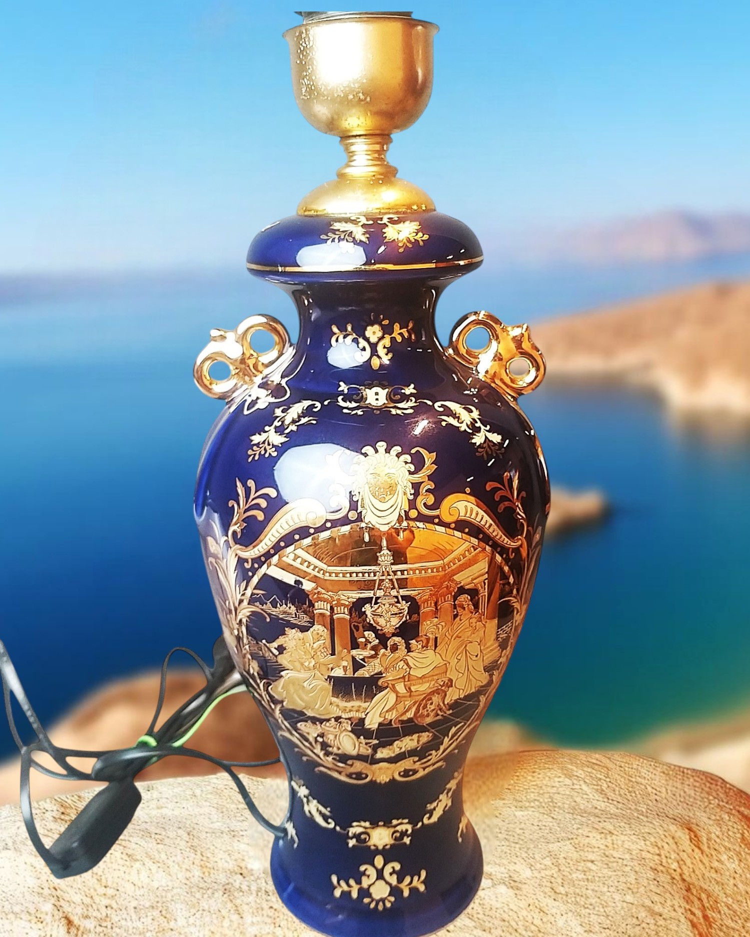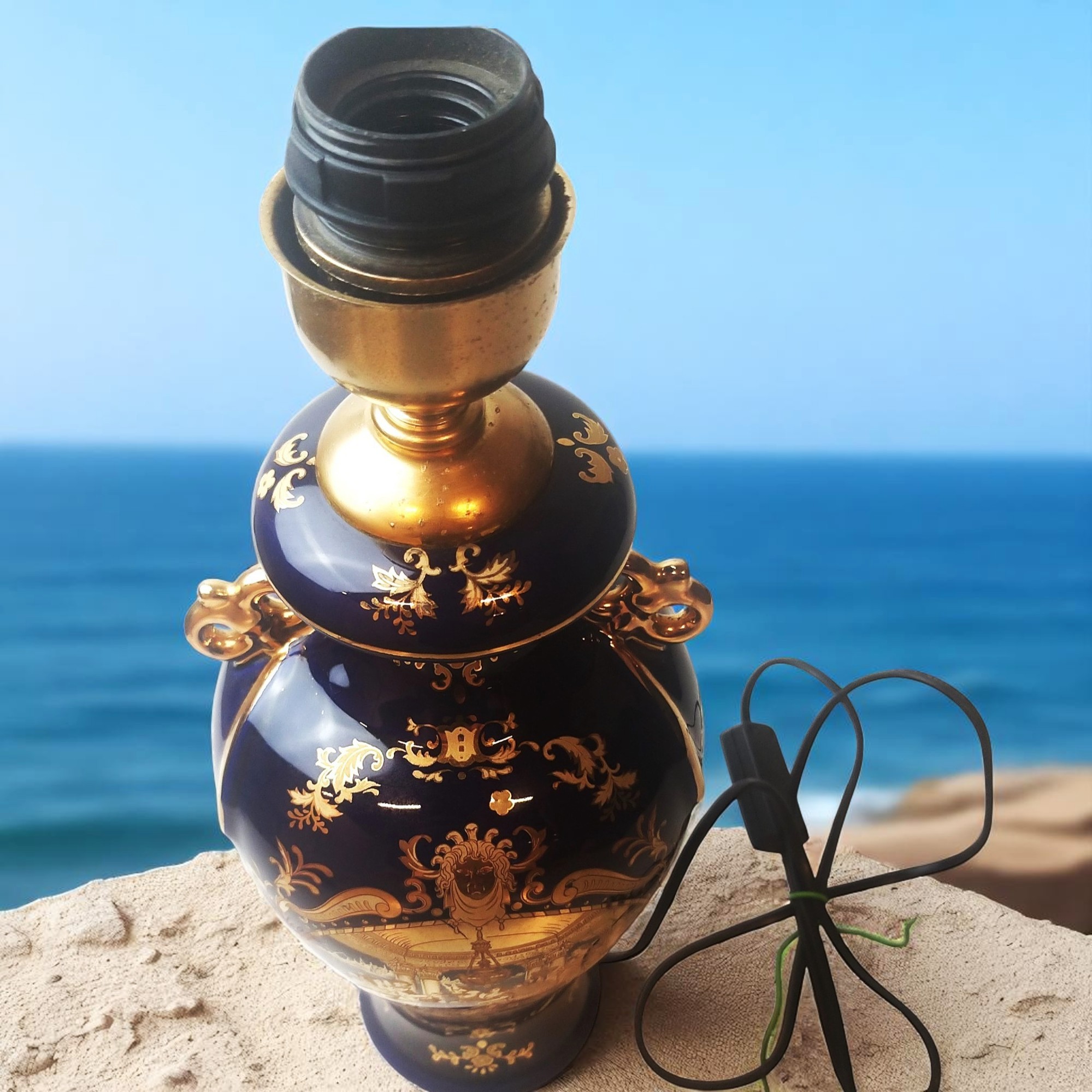 Porcelana w kolorze kobaltowym ze złotą dekoracją, złotymi akcentami, dekorowana dworską sceną po obu stronach. Lampa sprawna wyposażona w kabel, włącznik i wtyczkę. Wysokość lampy z oprawką wynosi ok. 42cm. szer. ok. 17cm średnica podstawy 11cm