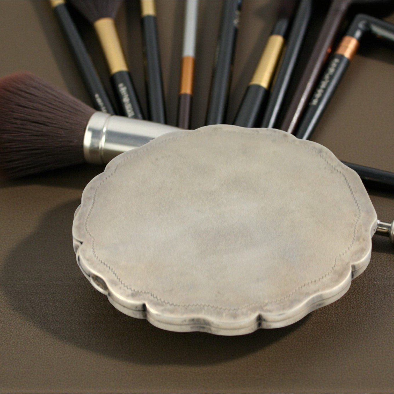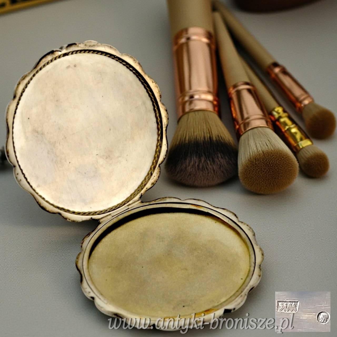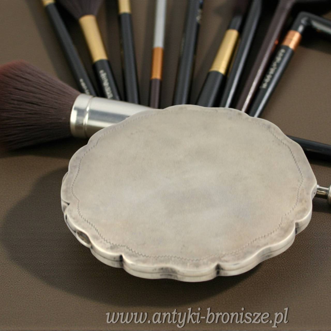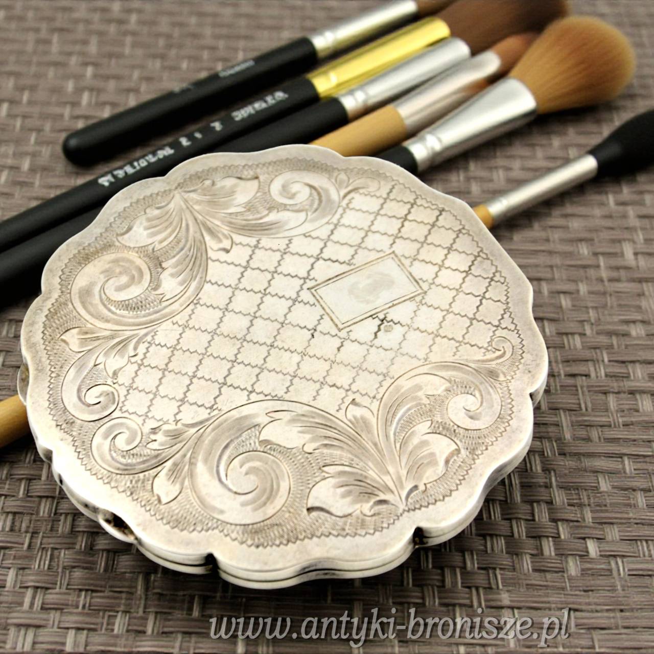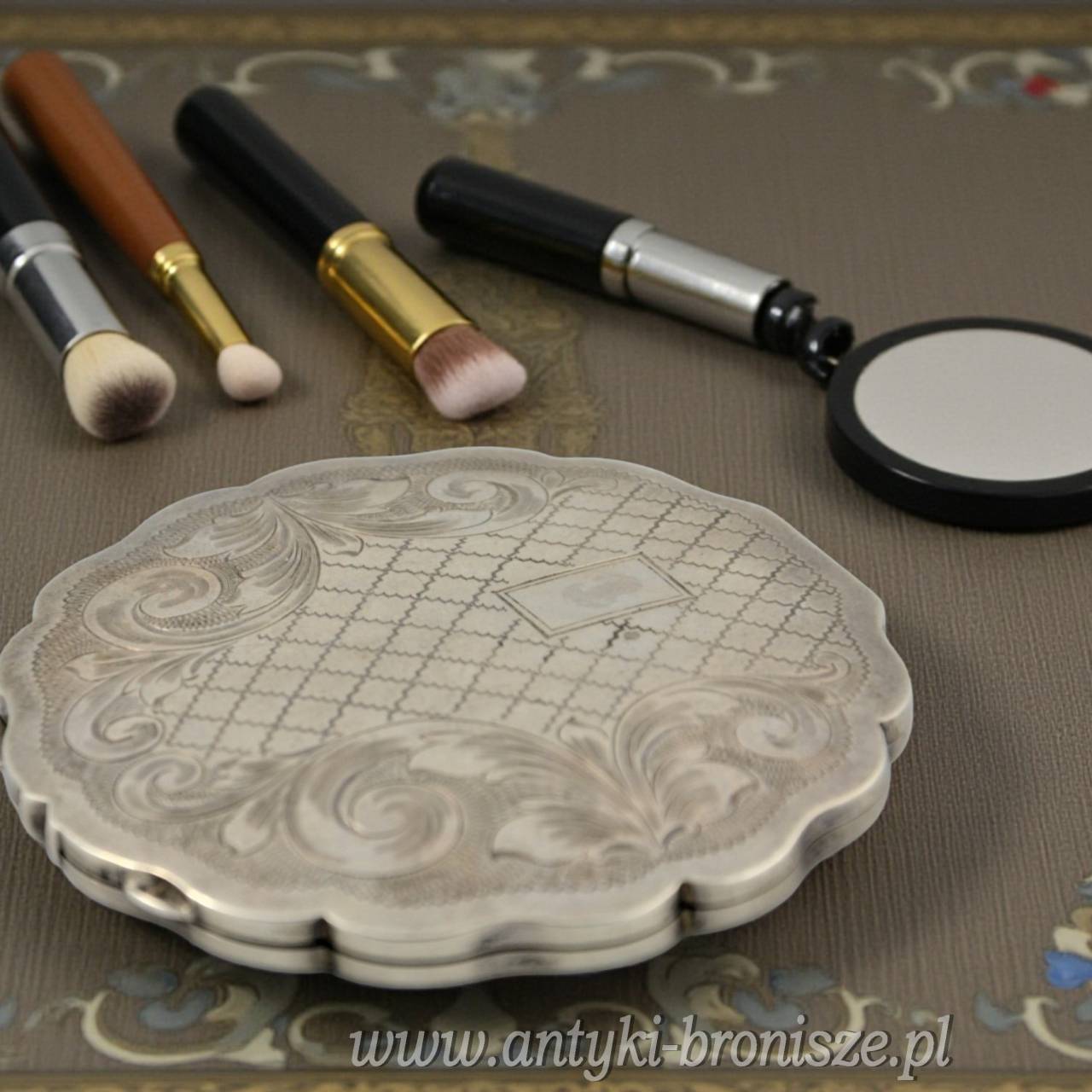 Srebrna okrągła puderniczka z wieczkiem na zawiasie. Srebro próby 3, monogram złotnika WK Warszawa . Nieregularne krawędzie, misternie grawerowane motywy roślinne, wici akantu i skośna kratka z owalną, ślepą rezerwą, brak lusterka