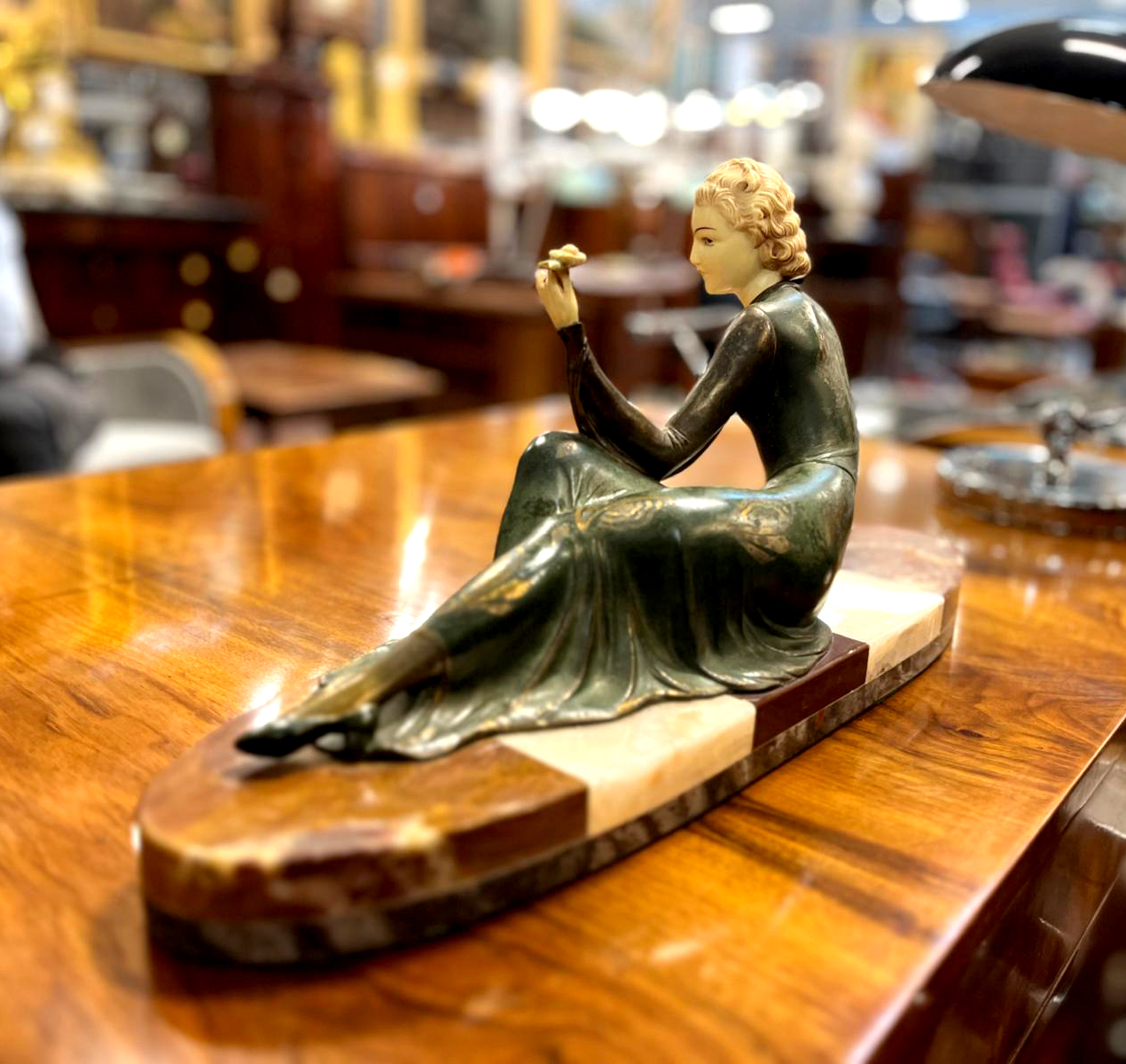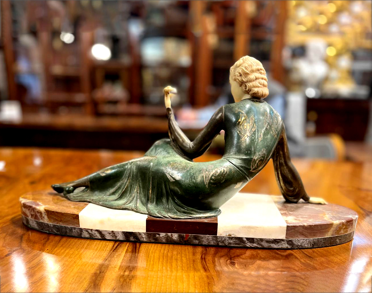 Przedstawia postać kobiety w długiej sukni, ukazanej w półleżącej pozie, osadzonej na podstawie. Figura wykonana jest z brązu, metalu i kości. Sygnowana „ROGGIA” znajduje się na podstawie.