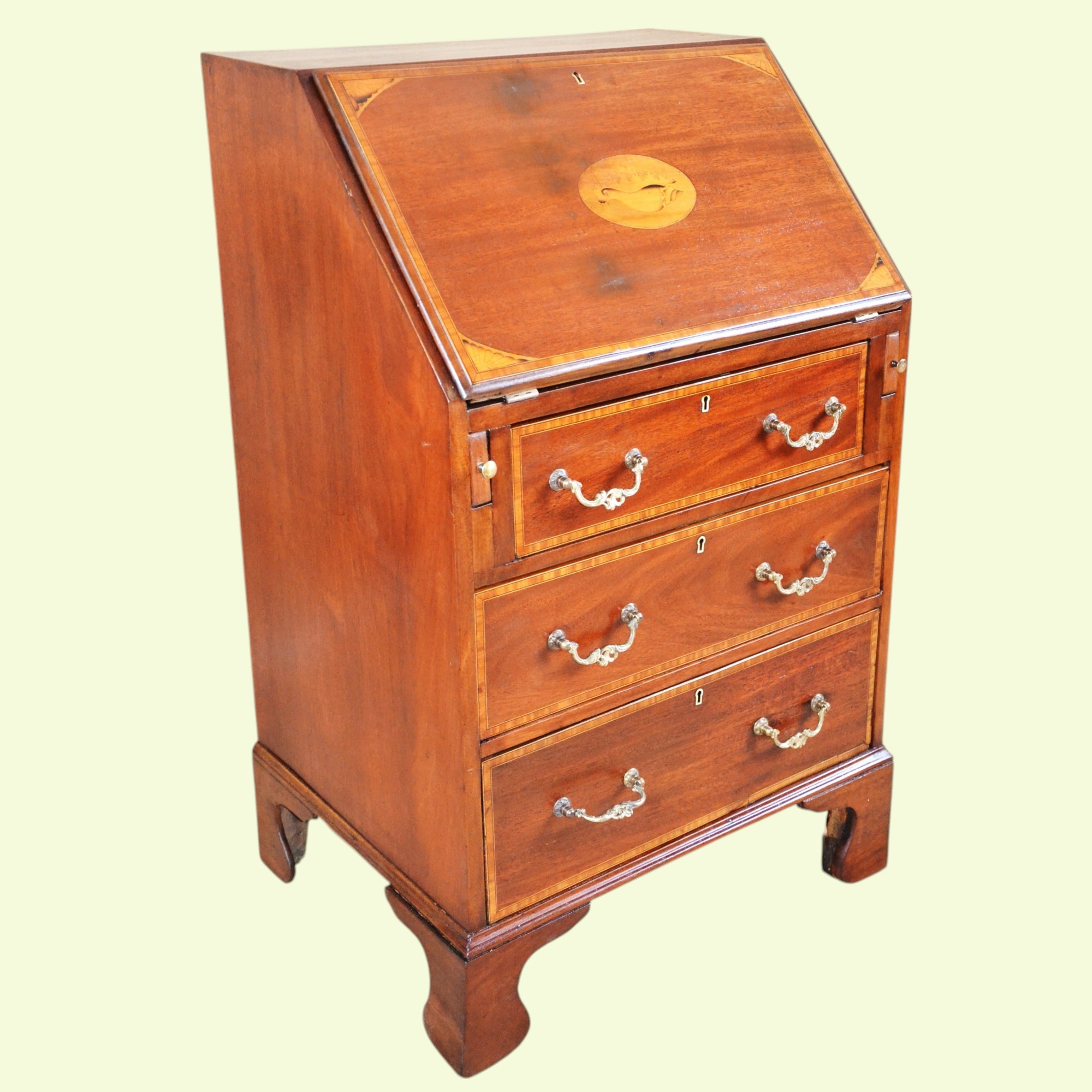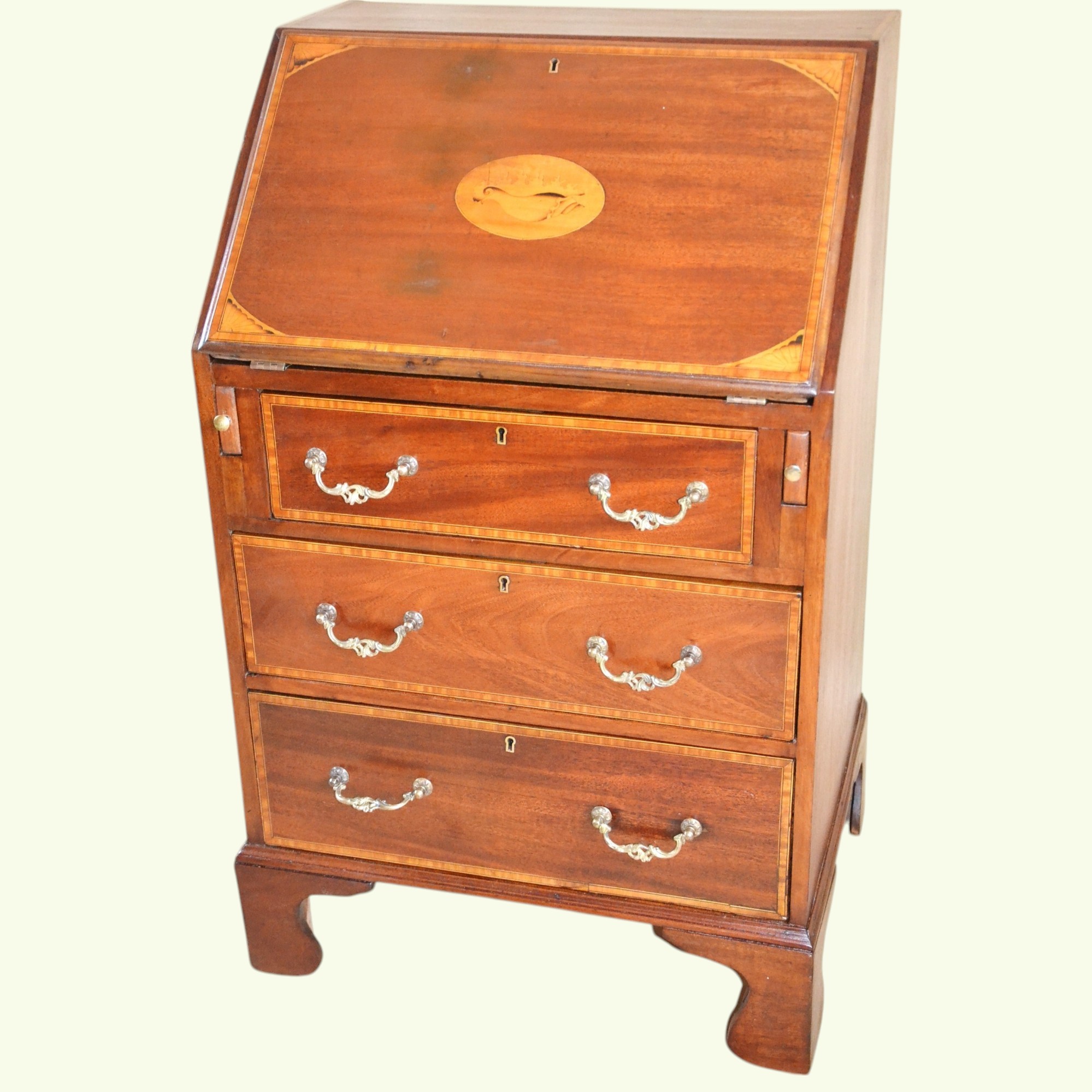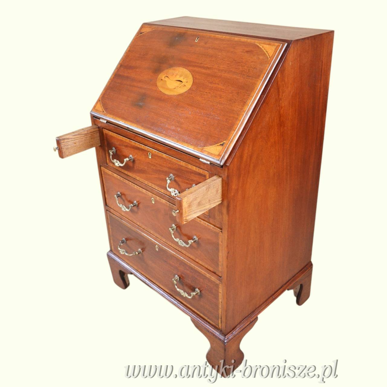 Klasyczny angielski sekretarzyk z uchylnym blatem tzw. 'bureau', z epoki króla Edwarda. Mebel oryginalny z przełomu XIX/XXw. Konstrukcja z mahoniu, intarsjowana. Rarytas. Jeden z nielicznych, na polskim rynku, przykładów wspaniałego angielskiego wzornictwa.