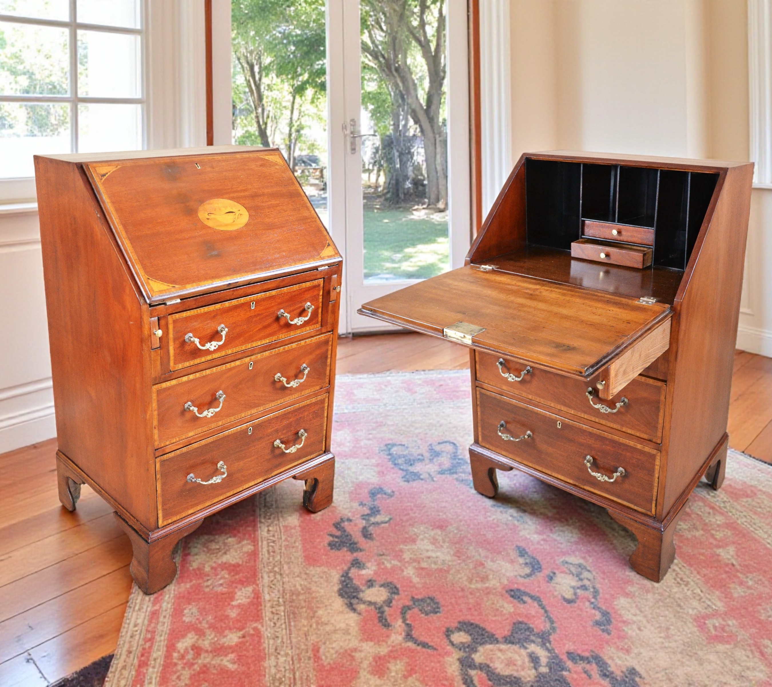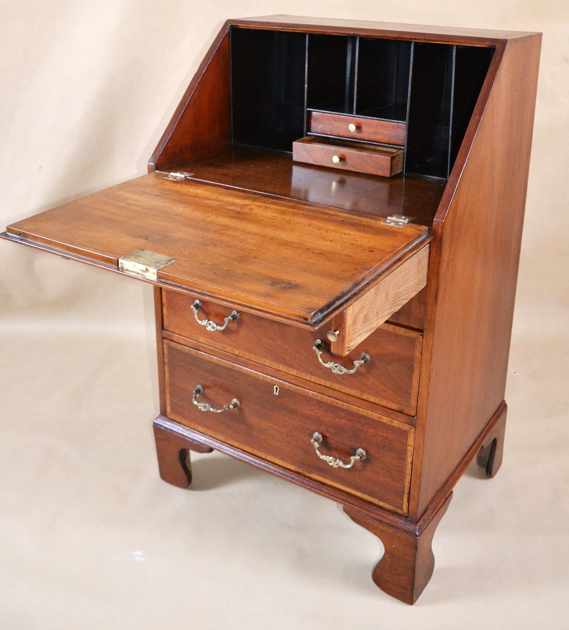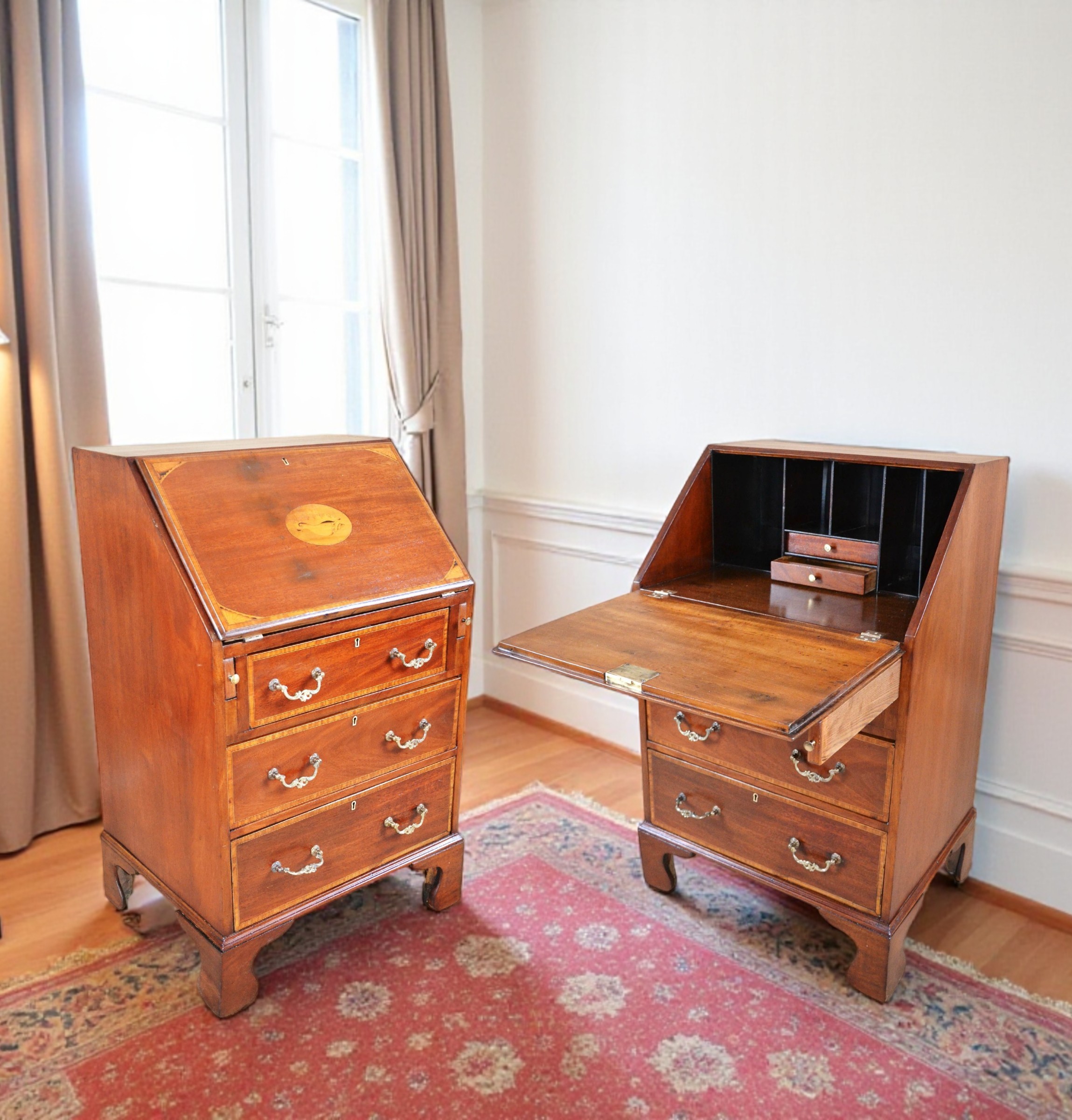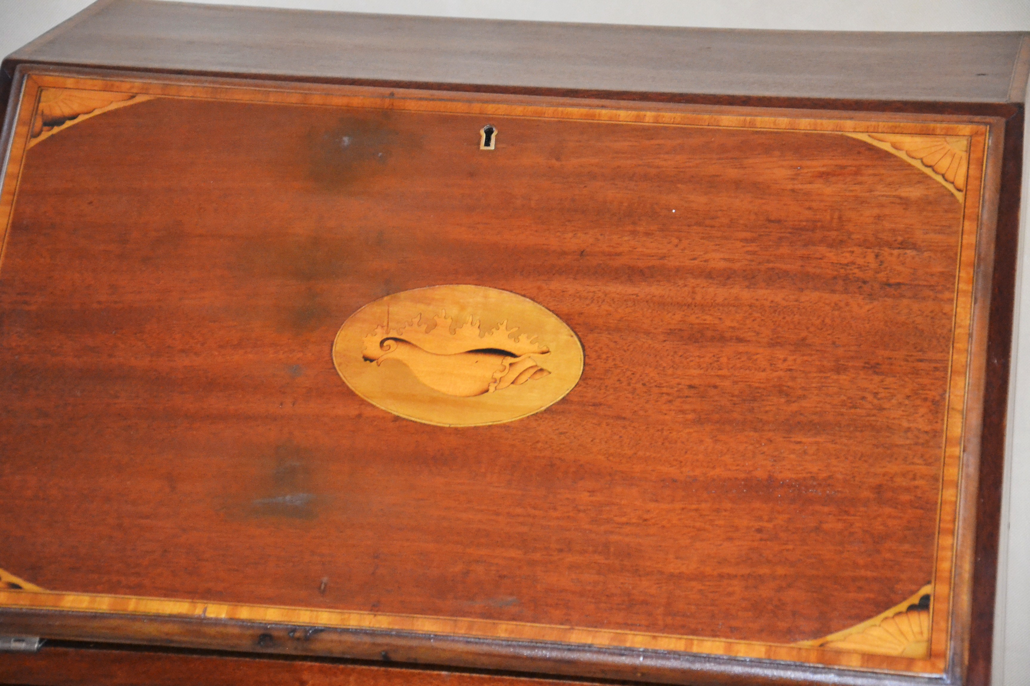 Klasyczny angielski sekretarzyk z uchylnym blatem tzw. 'bureau', z epoki króla Edwarda. Mebel oryginalny z przełomu XIX/XXw. Konstrukcja z mahoniu, intarsjowana. Rarytas. Jeden z nielicznych, na polskim rynku, przykładów wspaniałego angielskiego wzornictwa.