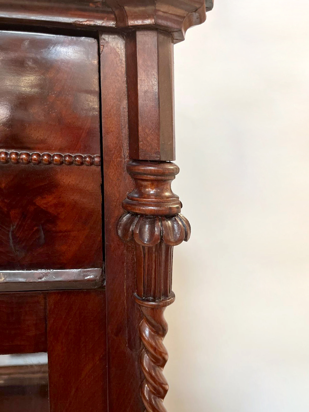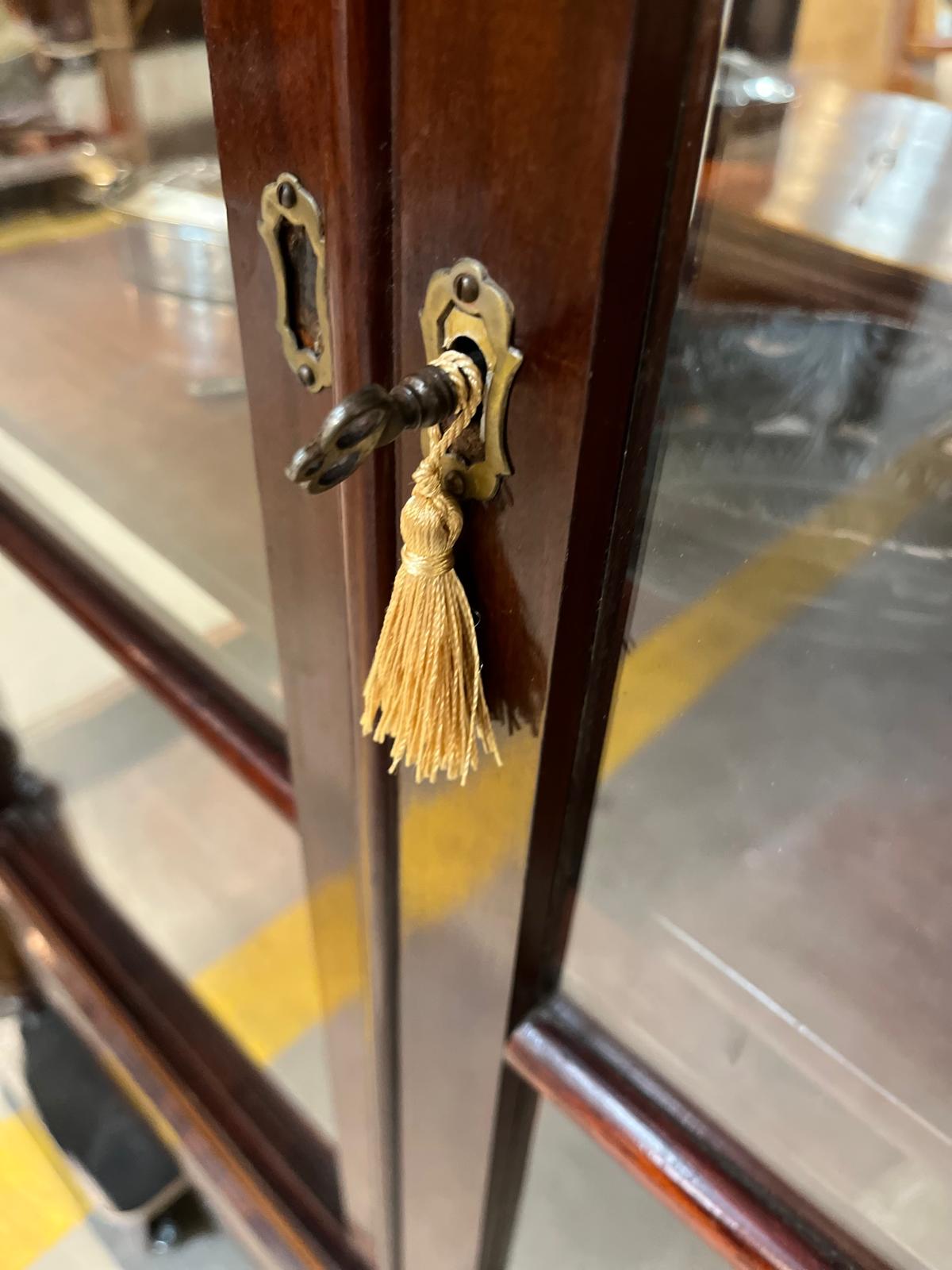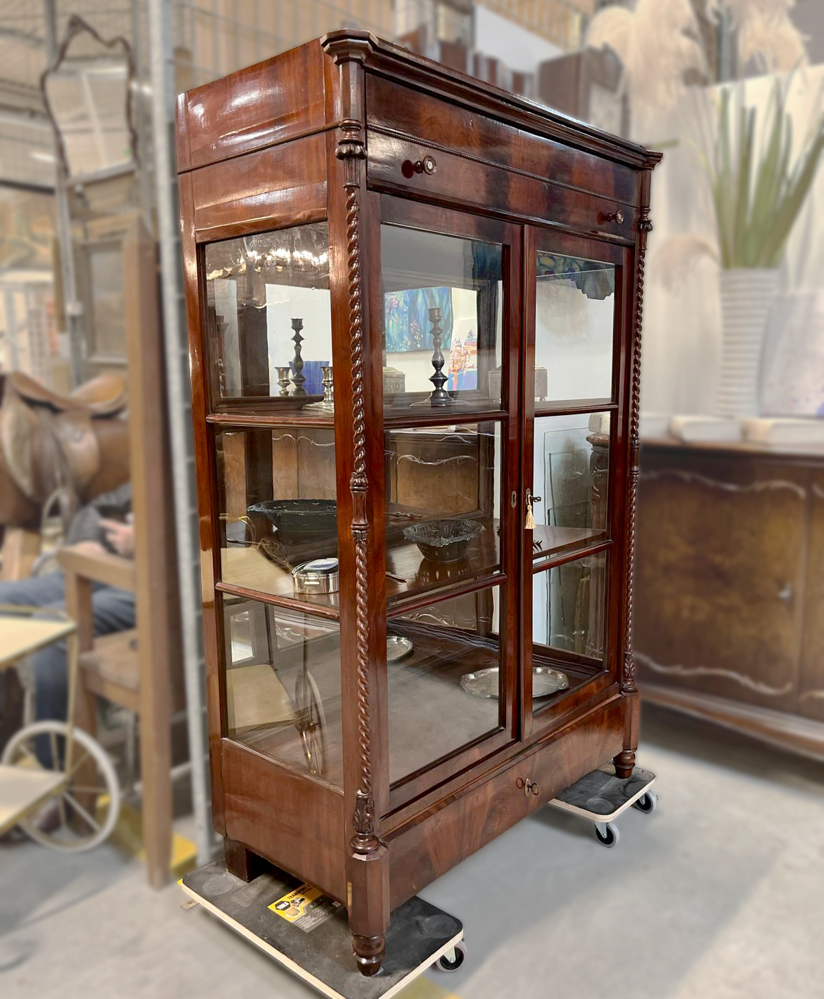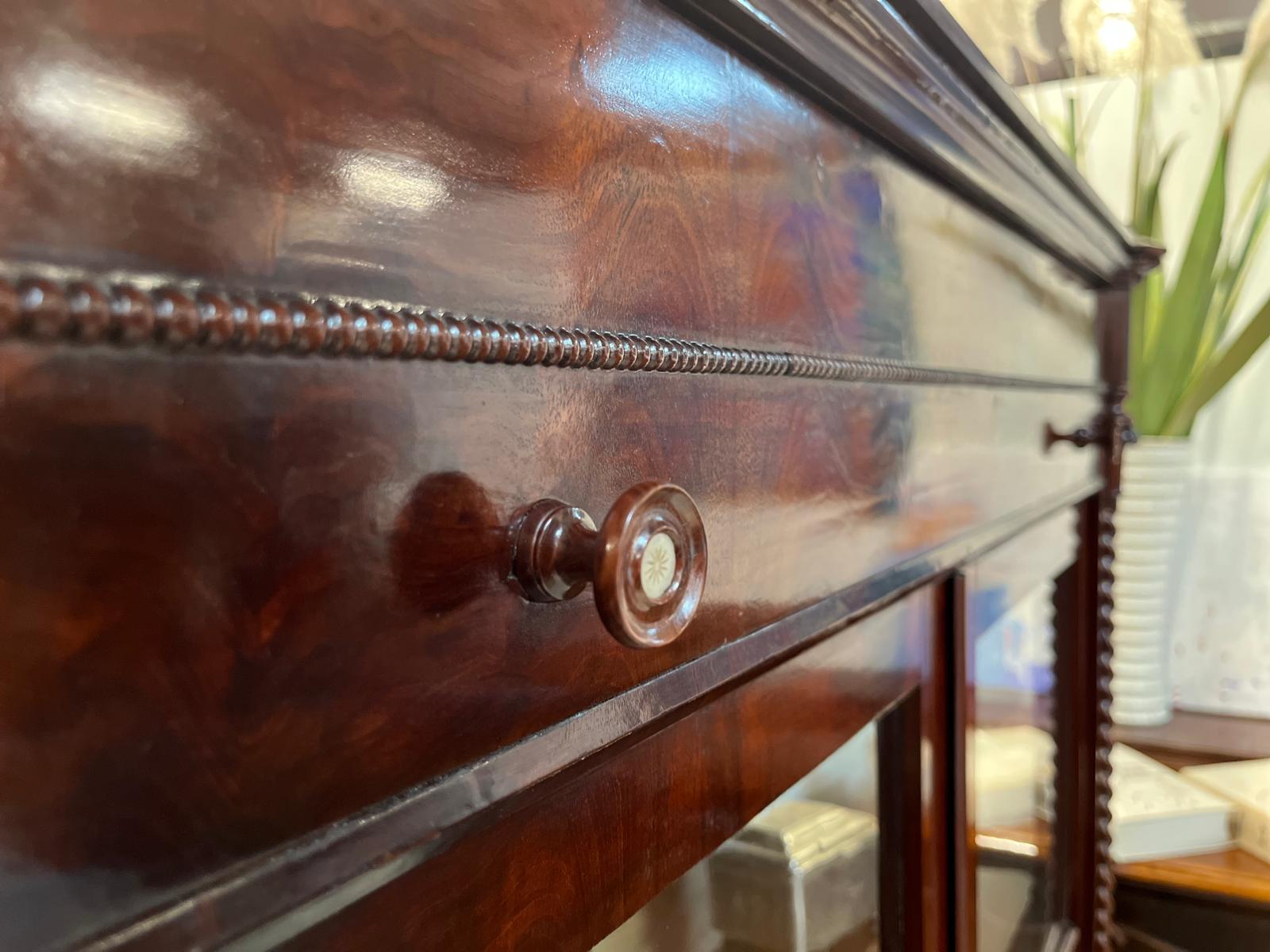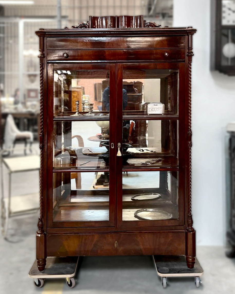 Elegancka serwantka pochodząca z Niemiec. Została wykonana w latach 20-tych XX wieku. Materiał Mahoń. Front przeszklony dwuskrzydłowy. Serwantkę zdobią subtelne detale stolarskie, kolumny, delikatne frezowania.