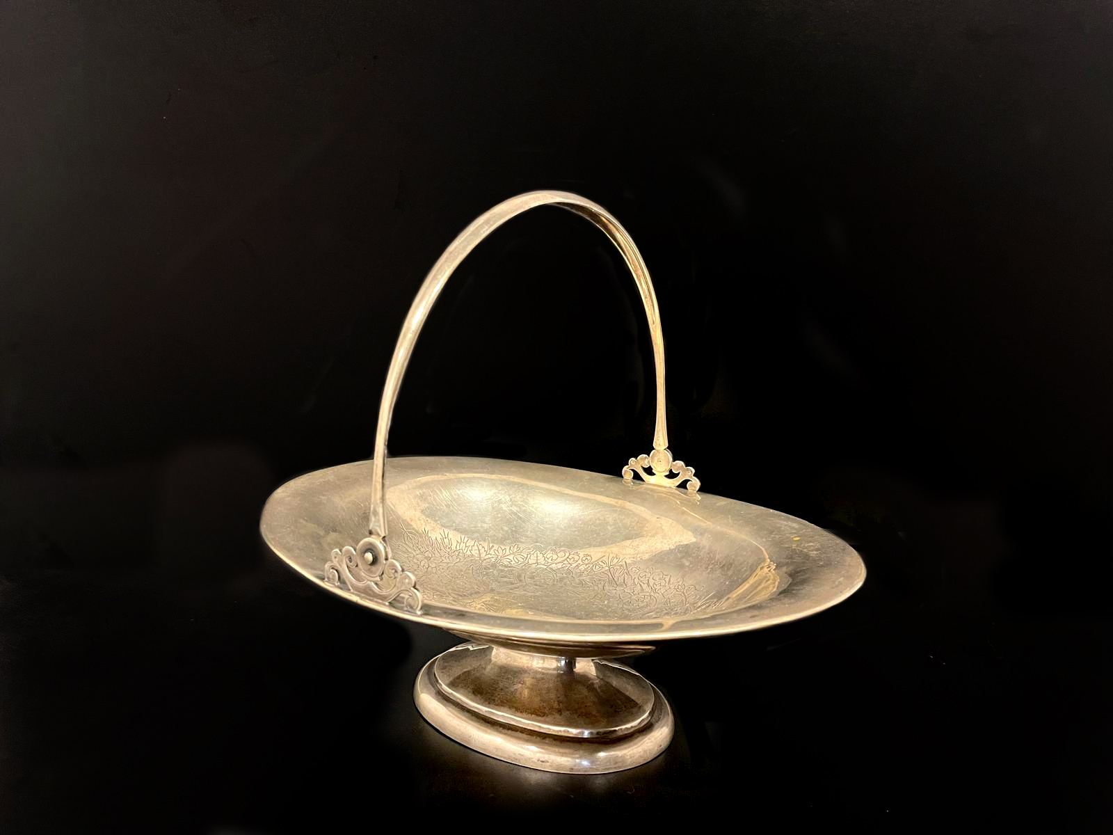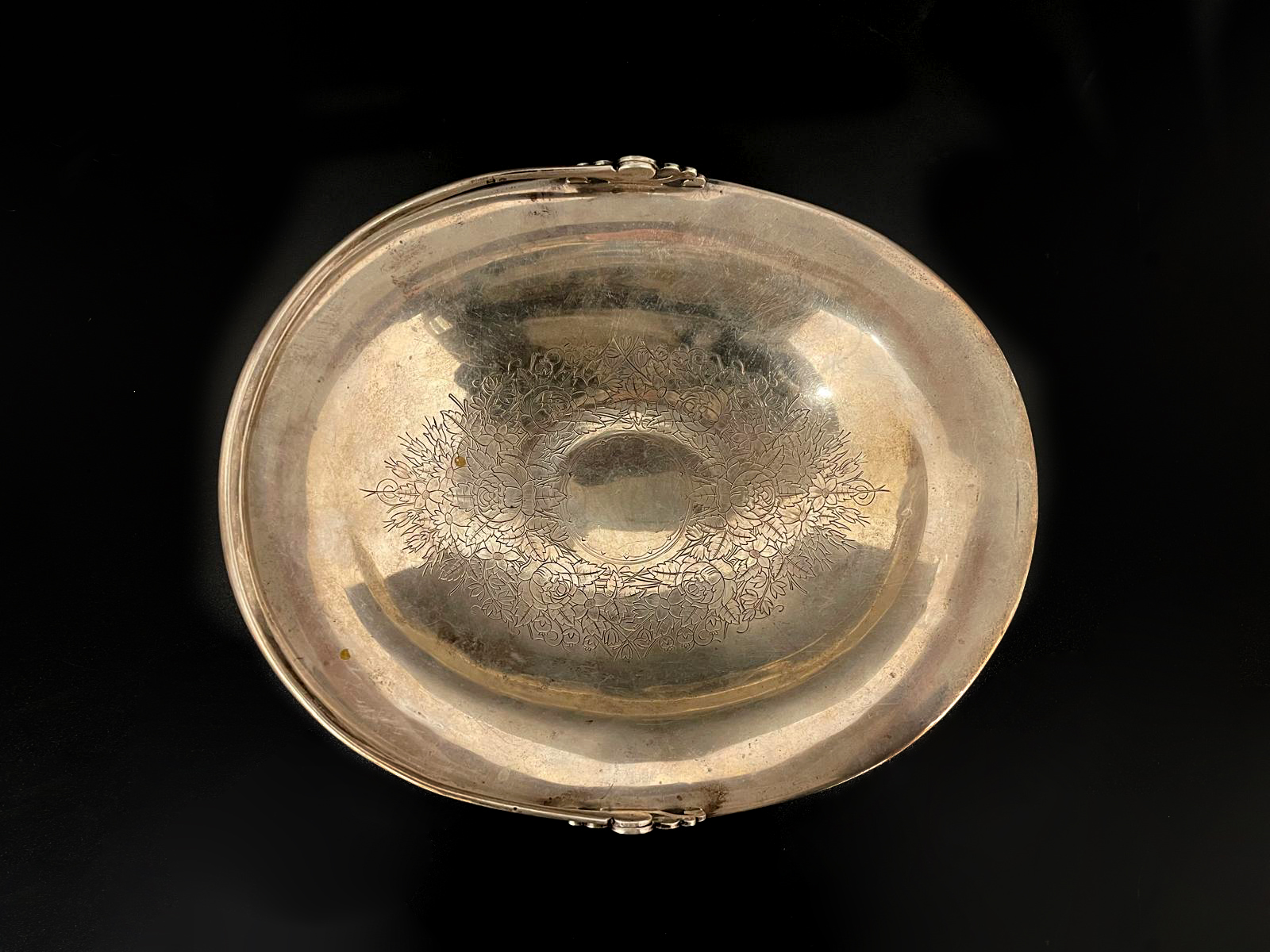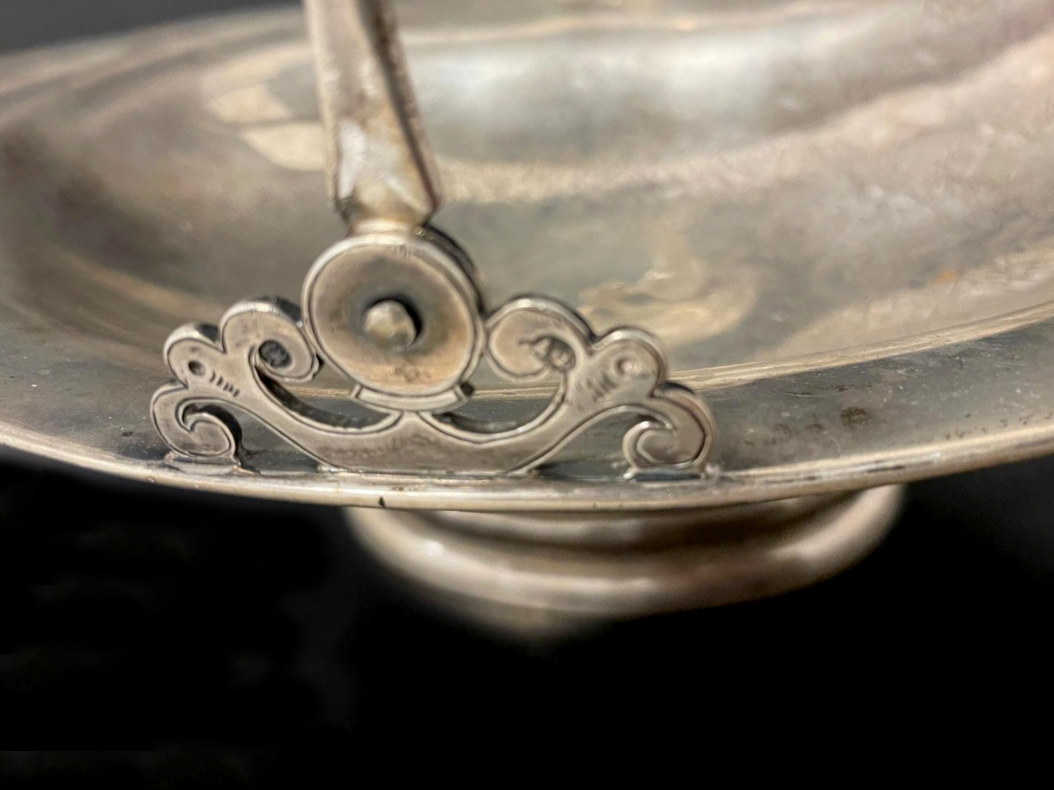 Wyjątkowa, elegancka srebrna patera z okresu Carskiej Rosji, wykonana w XIX wieku. Wyrób sygnowany i oznaczony próbą 84oraz imiennikiem mistrza złotniczego. Oznaczenia znajdują się w dwóch miejscach na naczyniu.