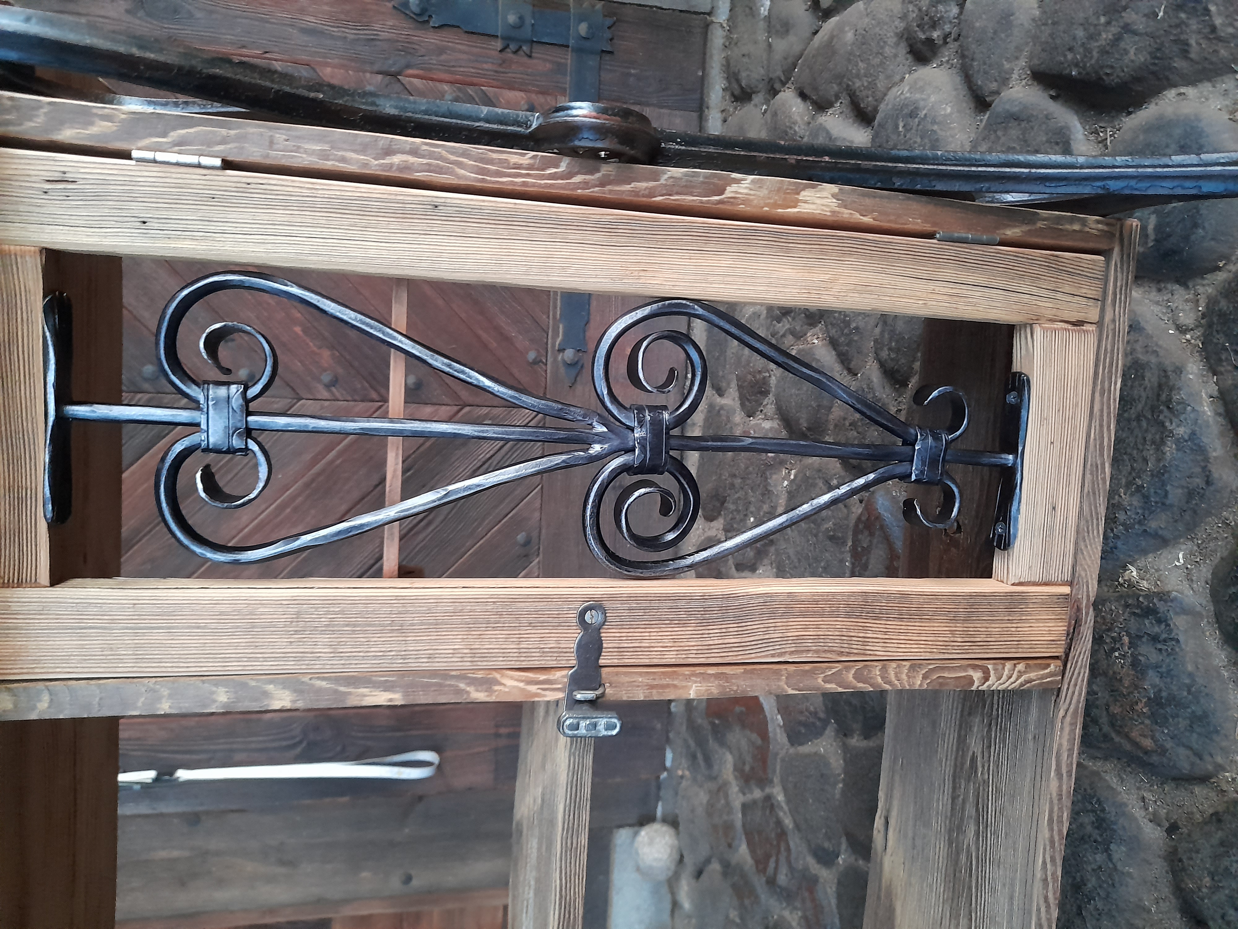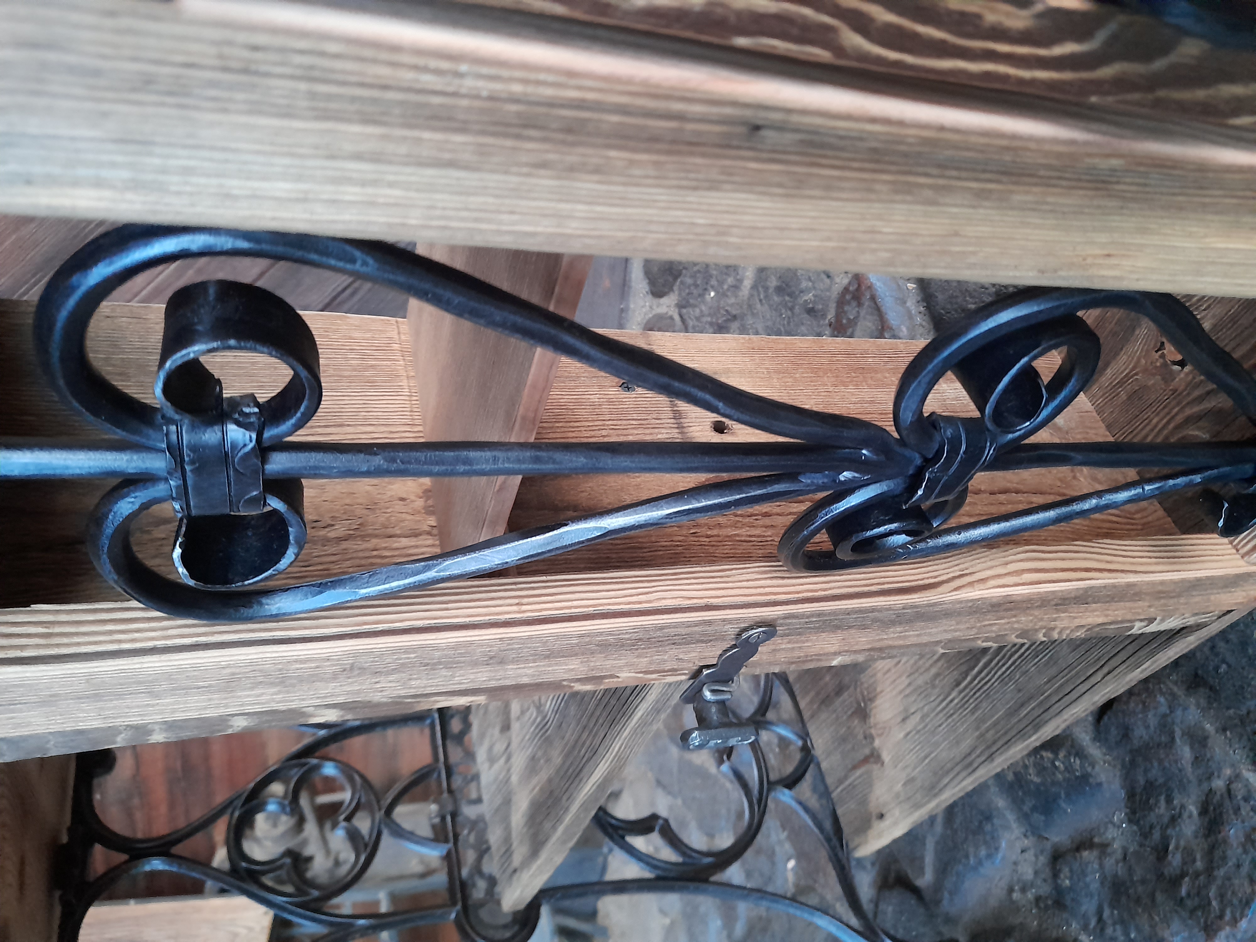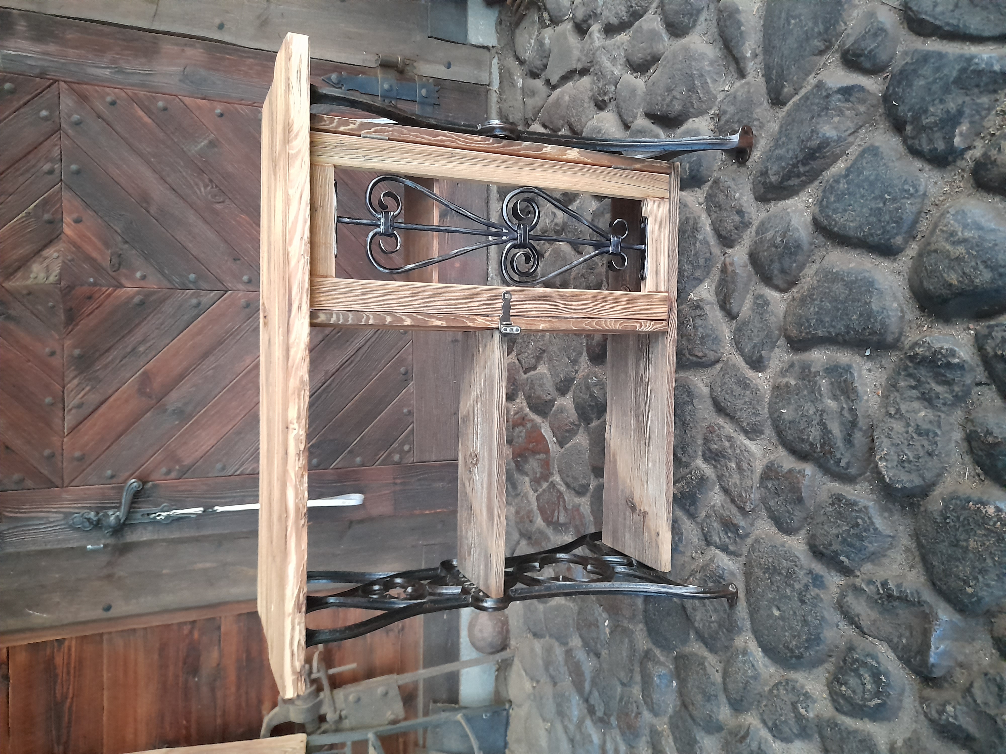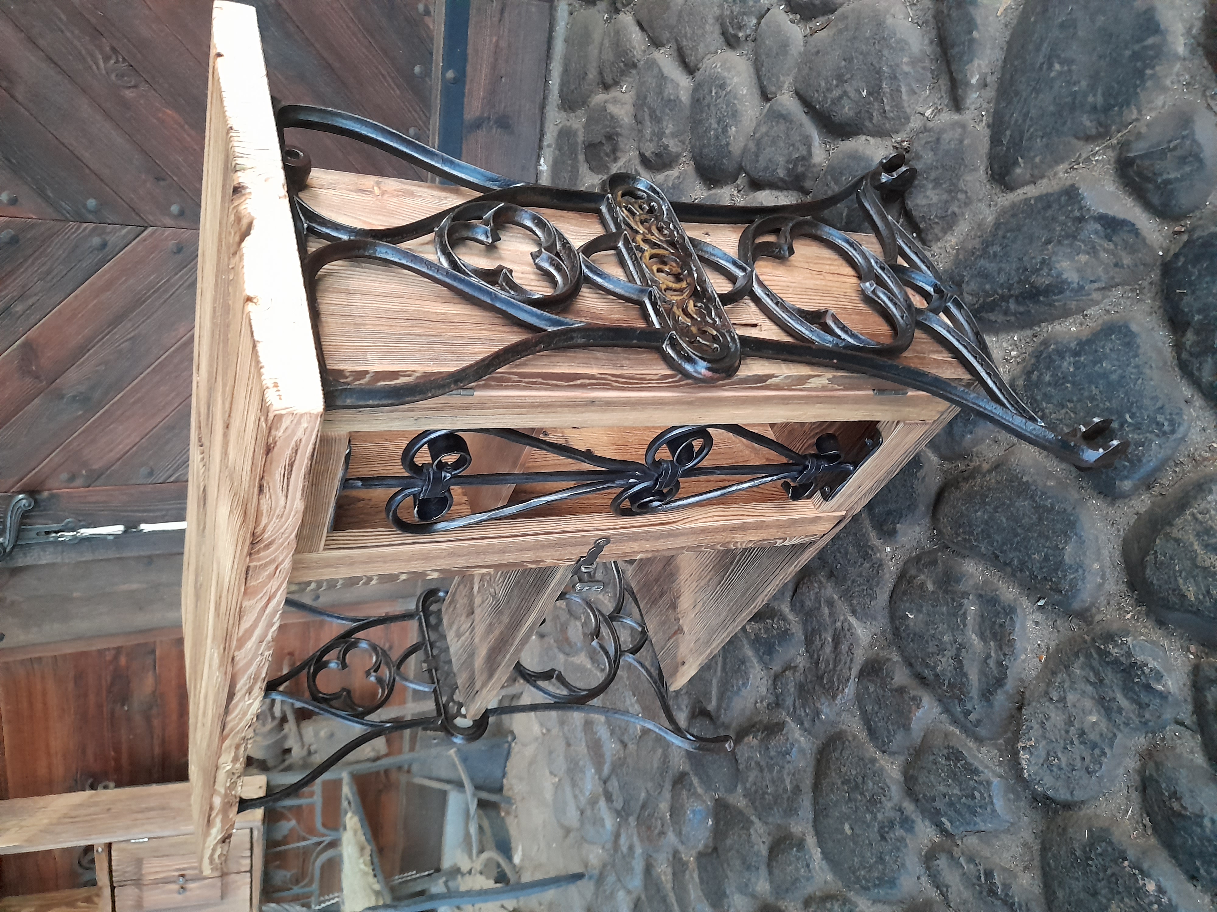 Stylowy, drewniany stolik z ręcznie kutym metalowym elementem wstawionym w drzwiczki. Blat wykonany z surowego starego drewna sosnowego,nadaje mu rustykalny charakter. Metalowe nogi w kształcie ozdobnych owalnych wzorów dodają elegancji. Stolik może posłużyć jako praktyczna półka lub ozdoba do domu.