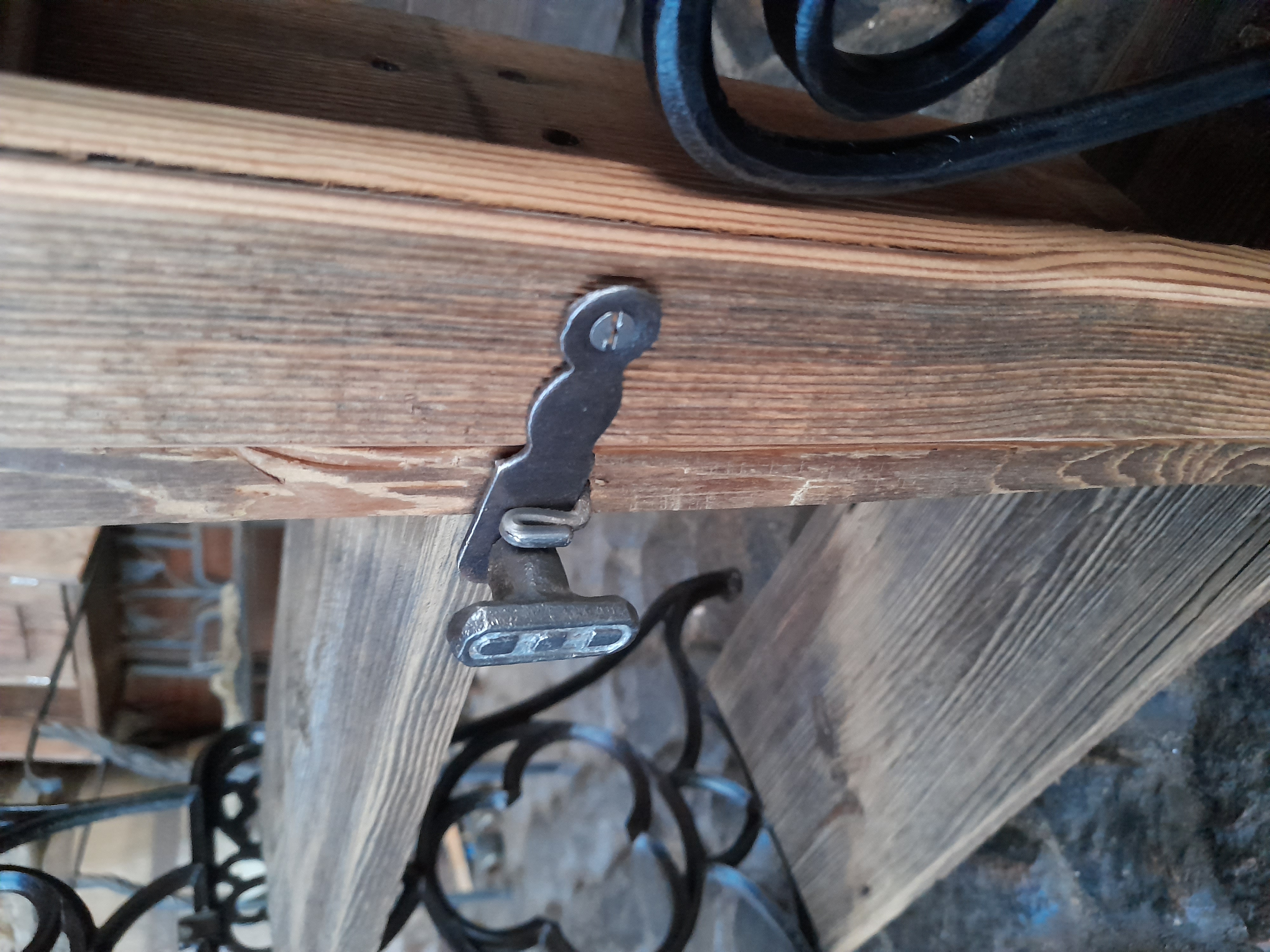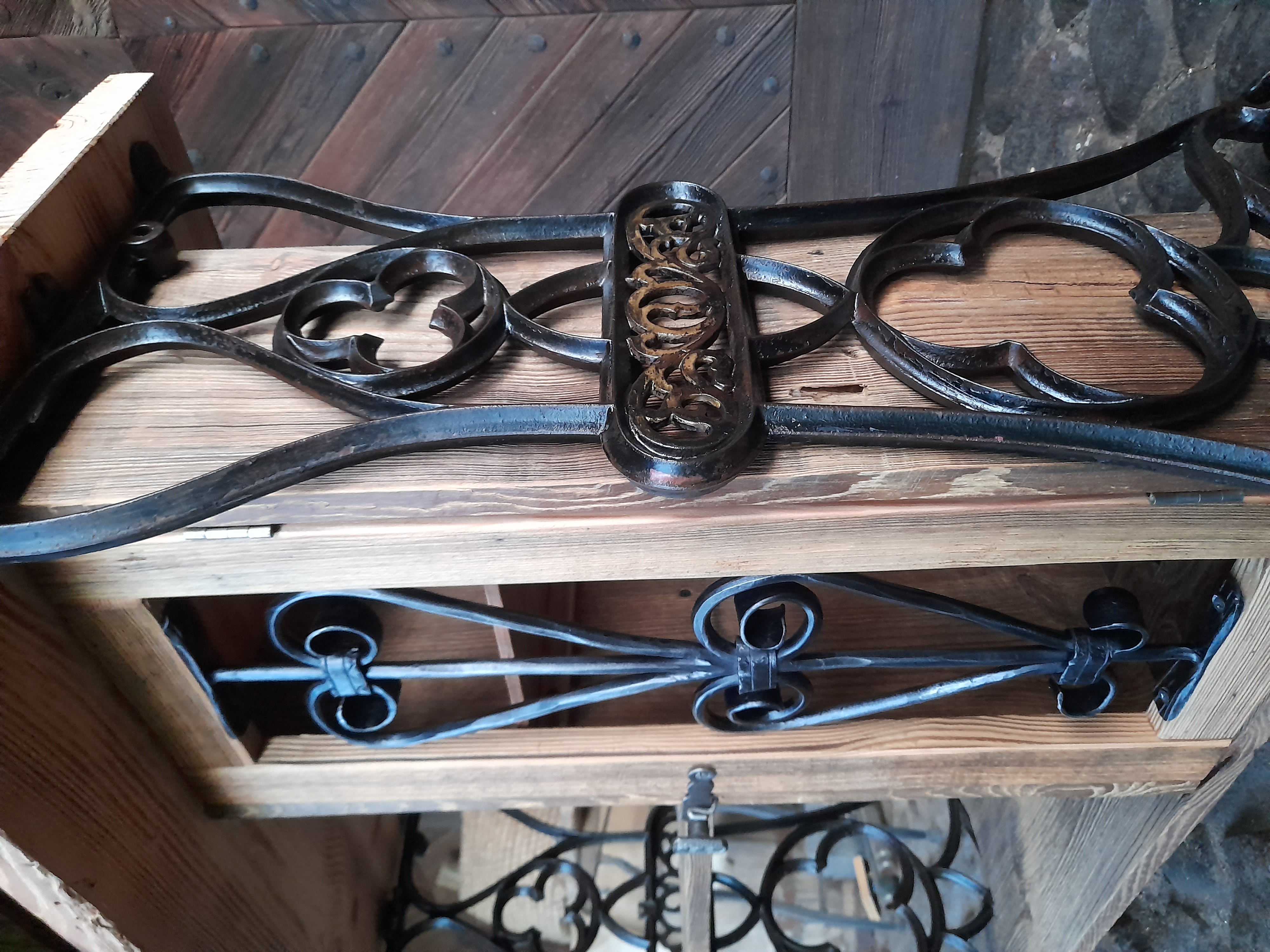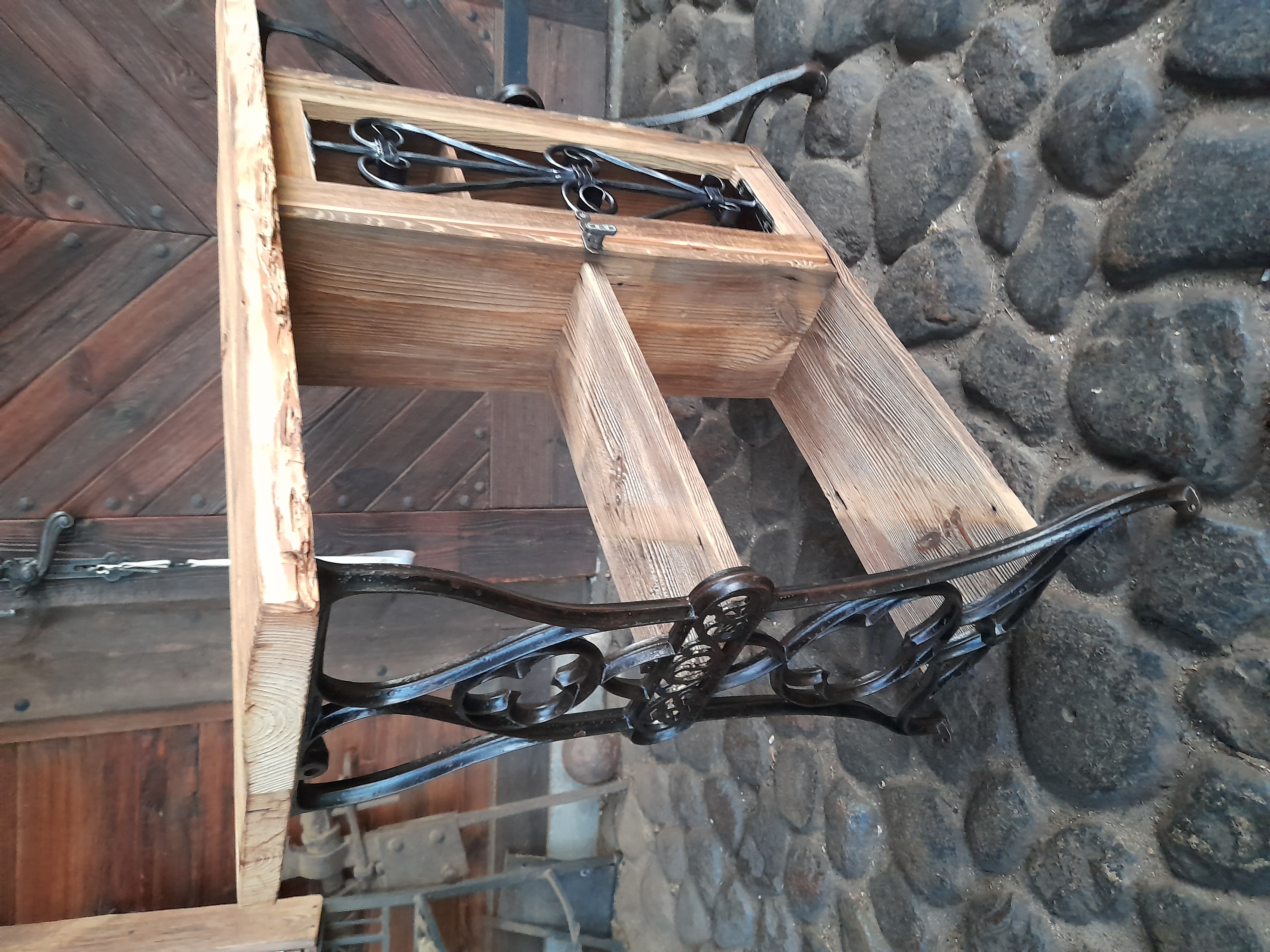 Stylowy, drewniany stolik z ręcznie kutym metalowym elementem wstawionym w drzwiczki. Blat wykonany z surowego starego drewna sosnowego,nadaje mu rustykalny charakter. Metalowe nogi w kształcie ozdobnych owalnych wzorów dodają elegancji. Stolik może posłużyć jako praktyczna półka lub ozdoba do domu.
