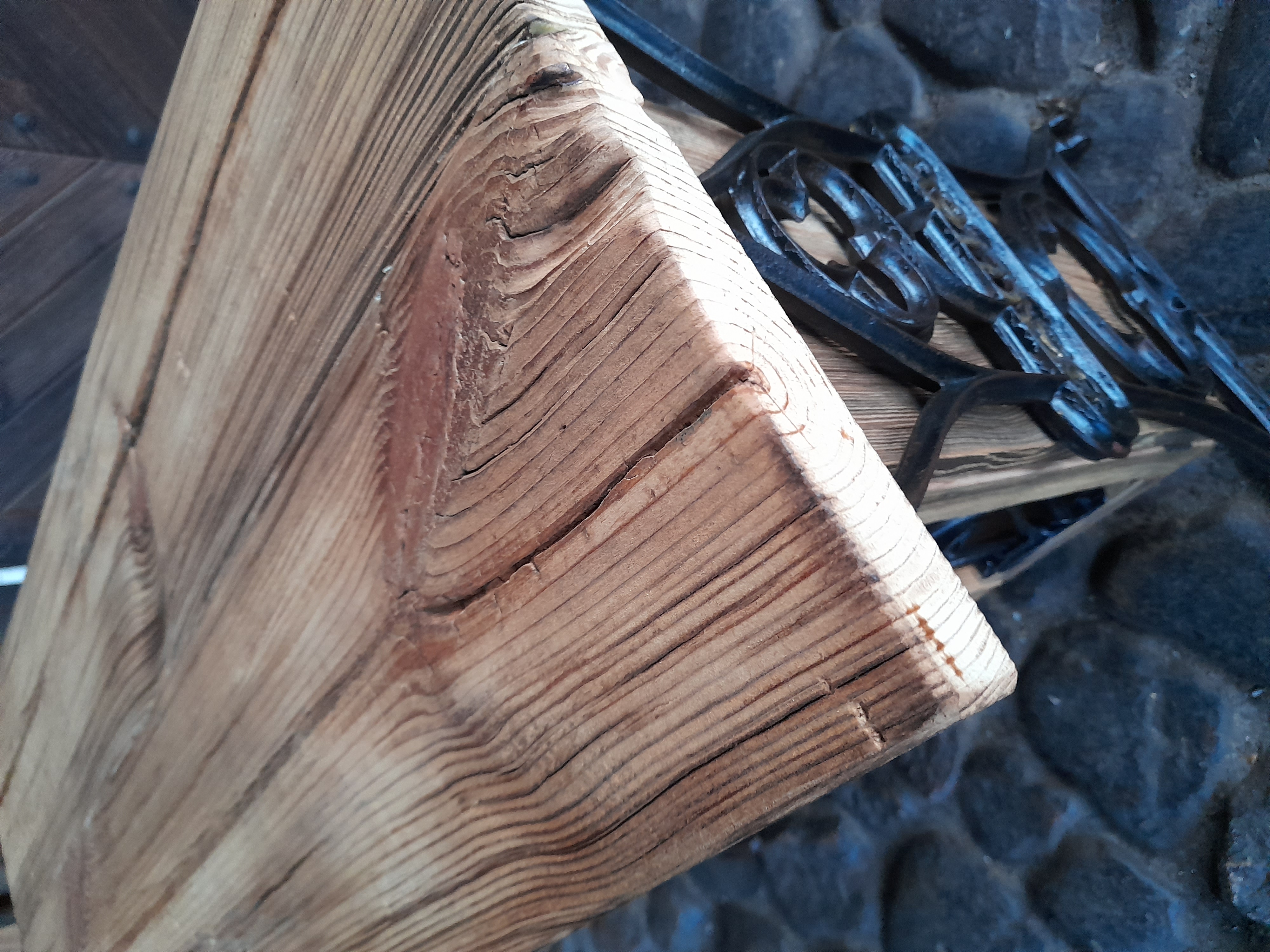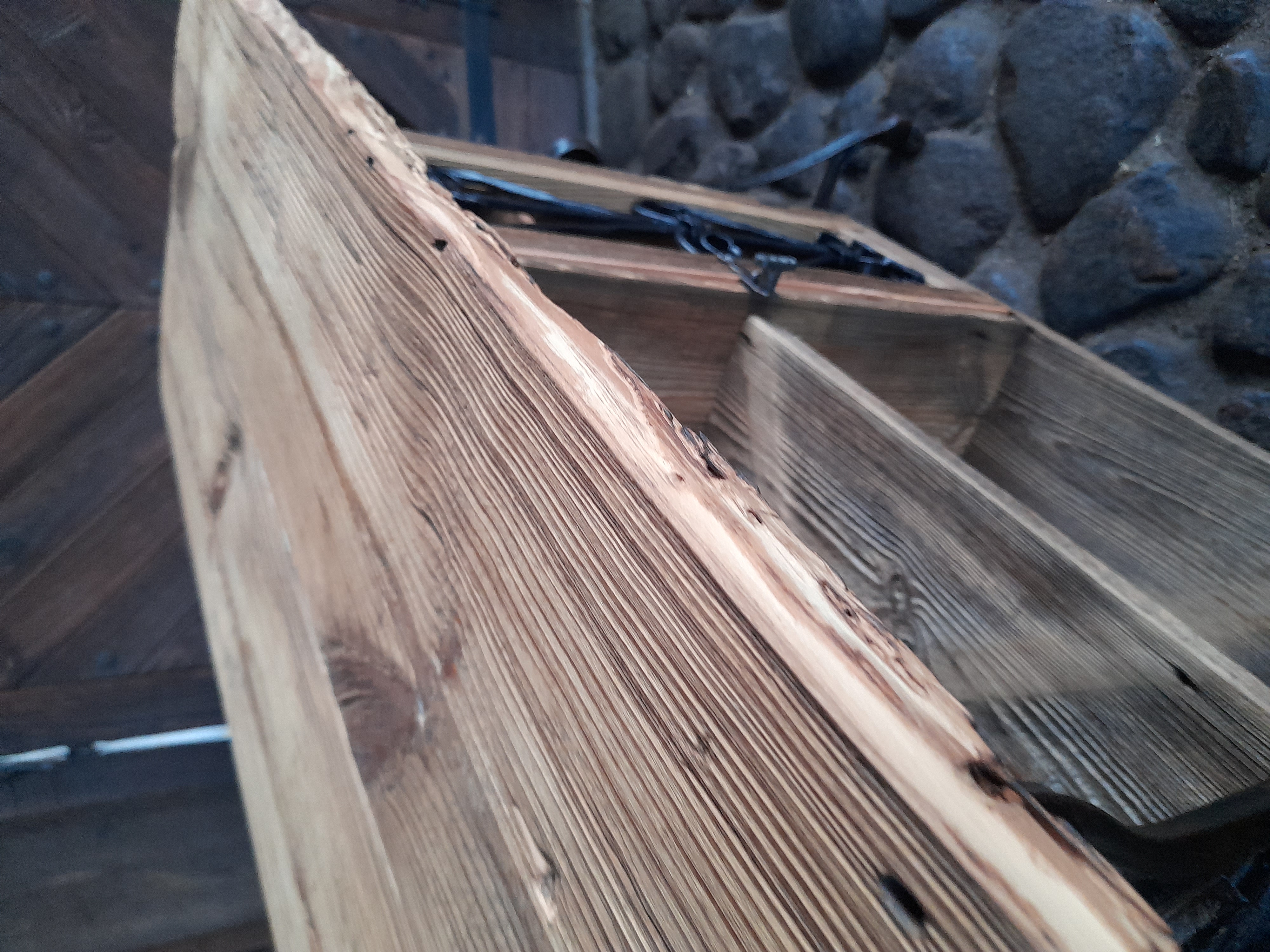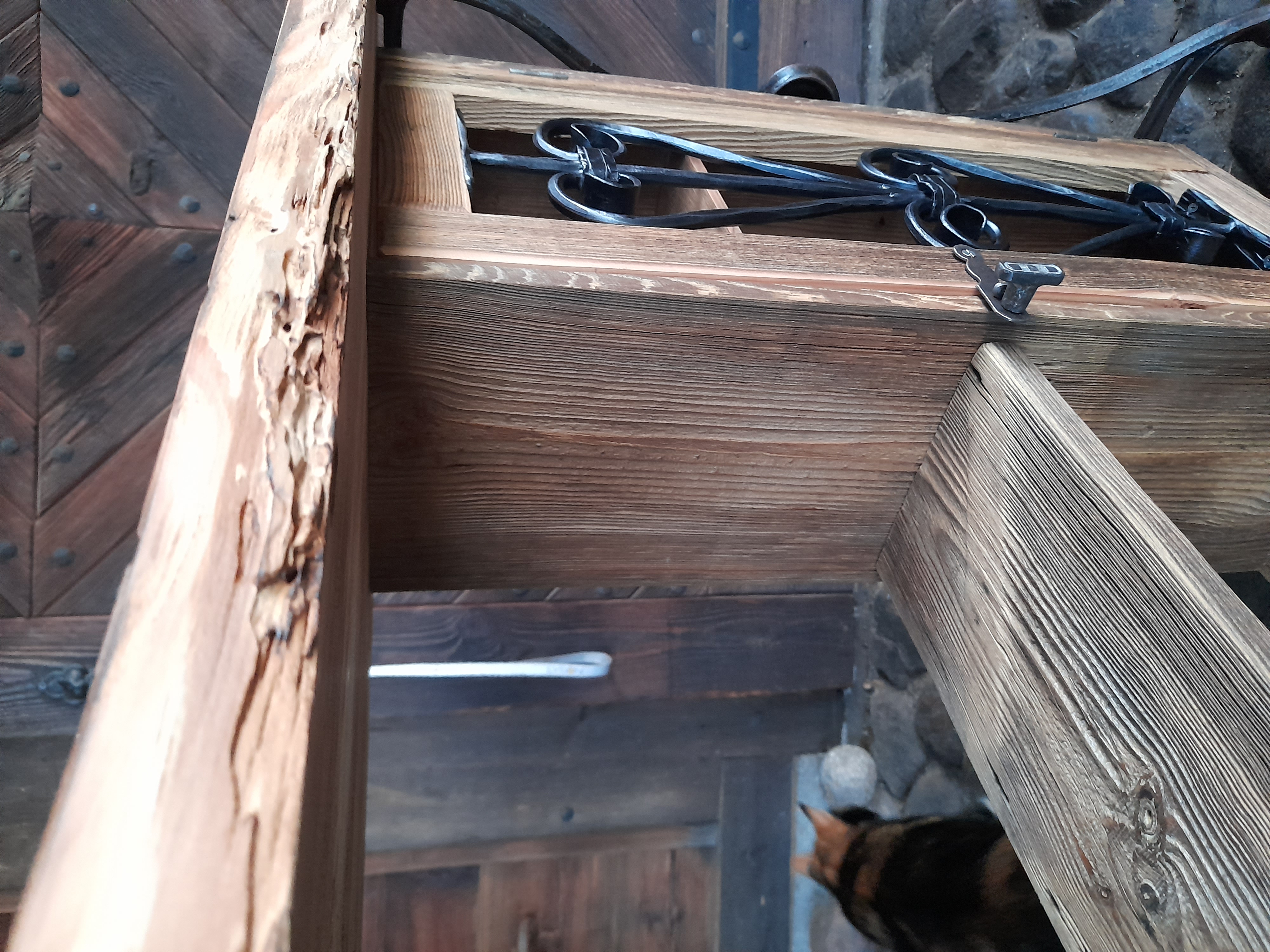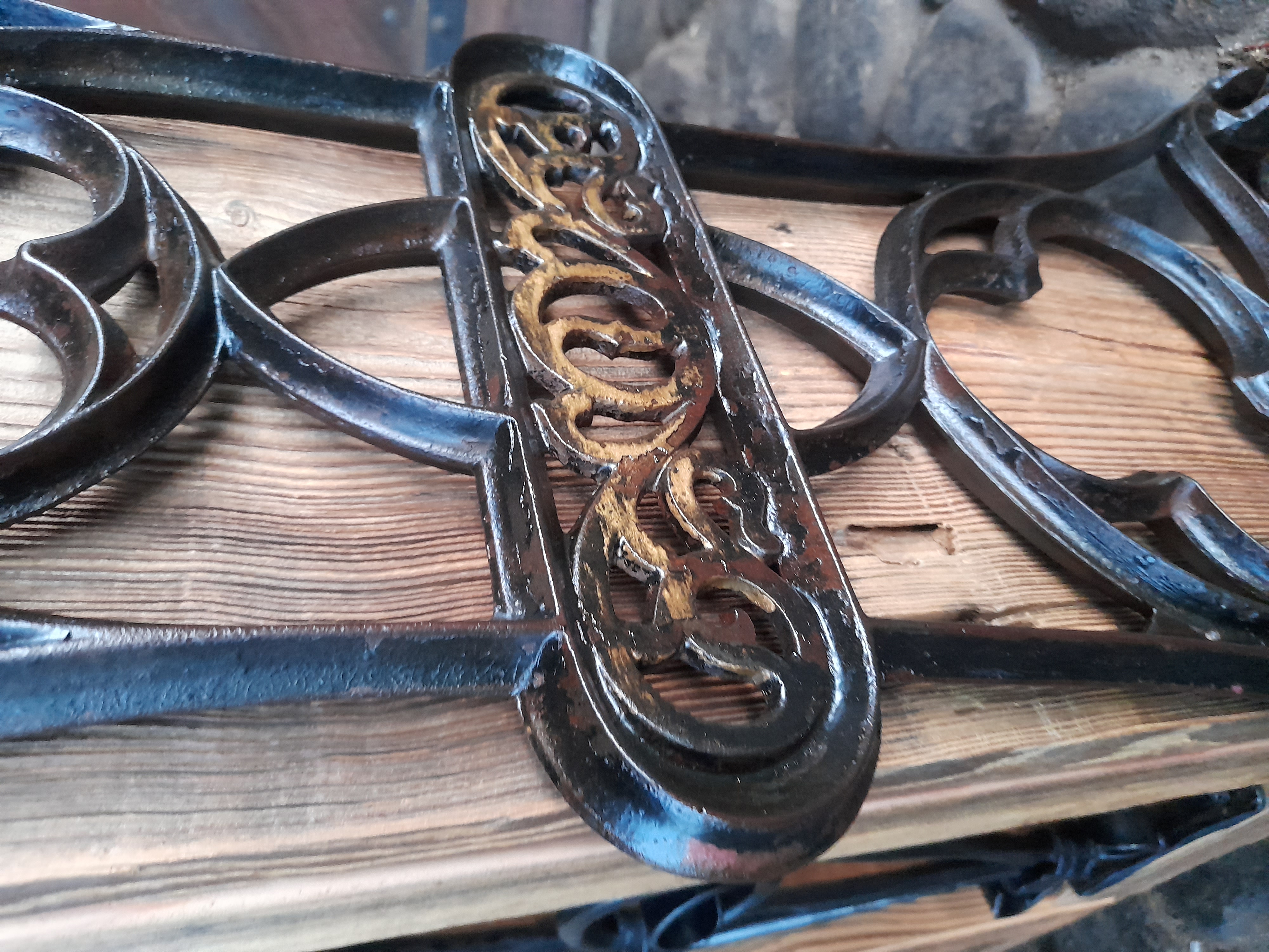 Stylowy, drewniany stolik z ręcznie kutym metalowym elementem wstawionym w drzwiczki. Blat wykonany z surowego starego drewna sosnowego,nadaje mu rustykalny charakter. Metalowe nogi w kształcie ozdobnych owalnych wzorów dodają elegancji. Stolik może posłużyć jako praktyczna półka lub ozdoba do domu.