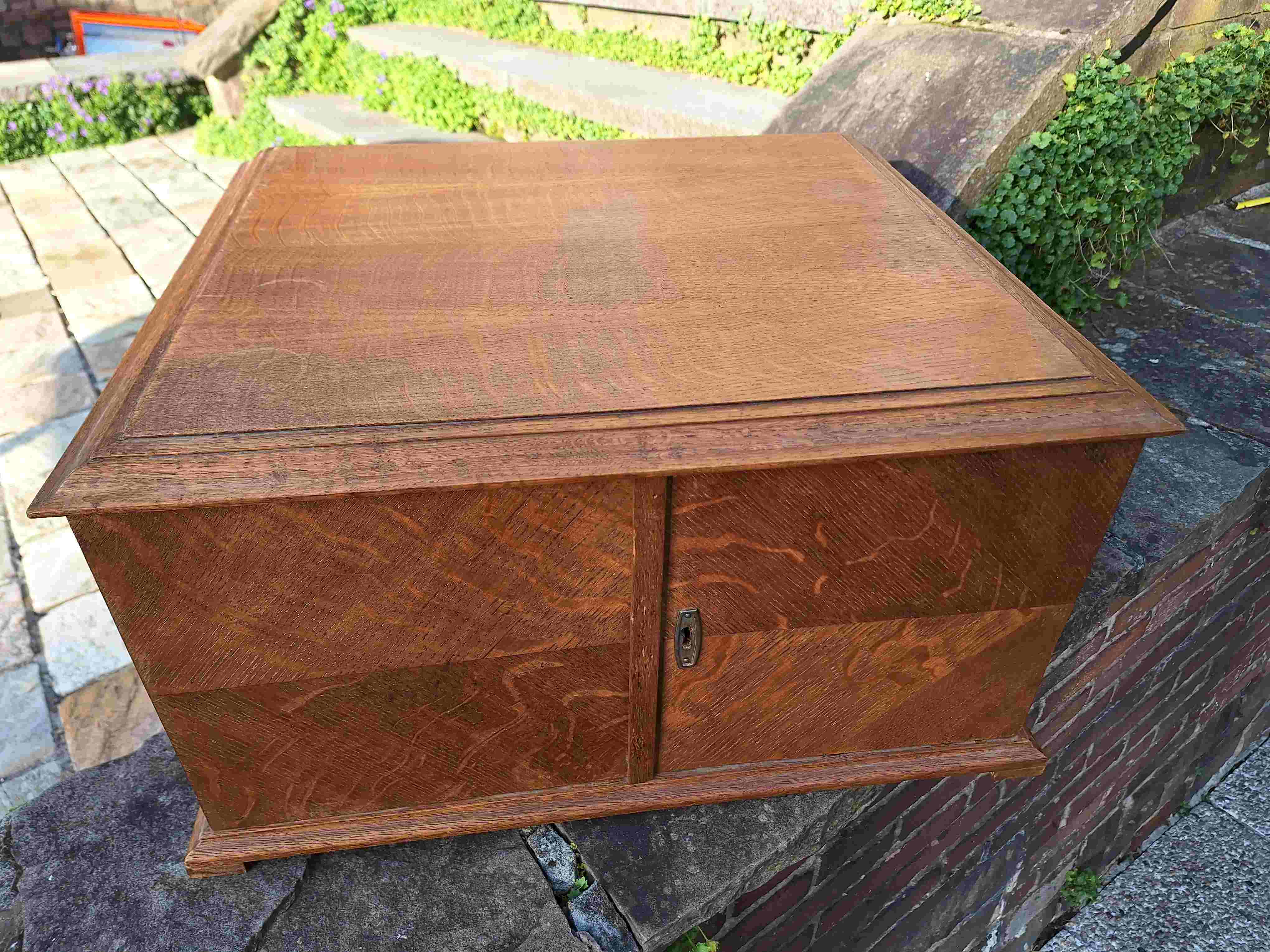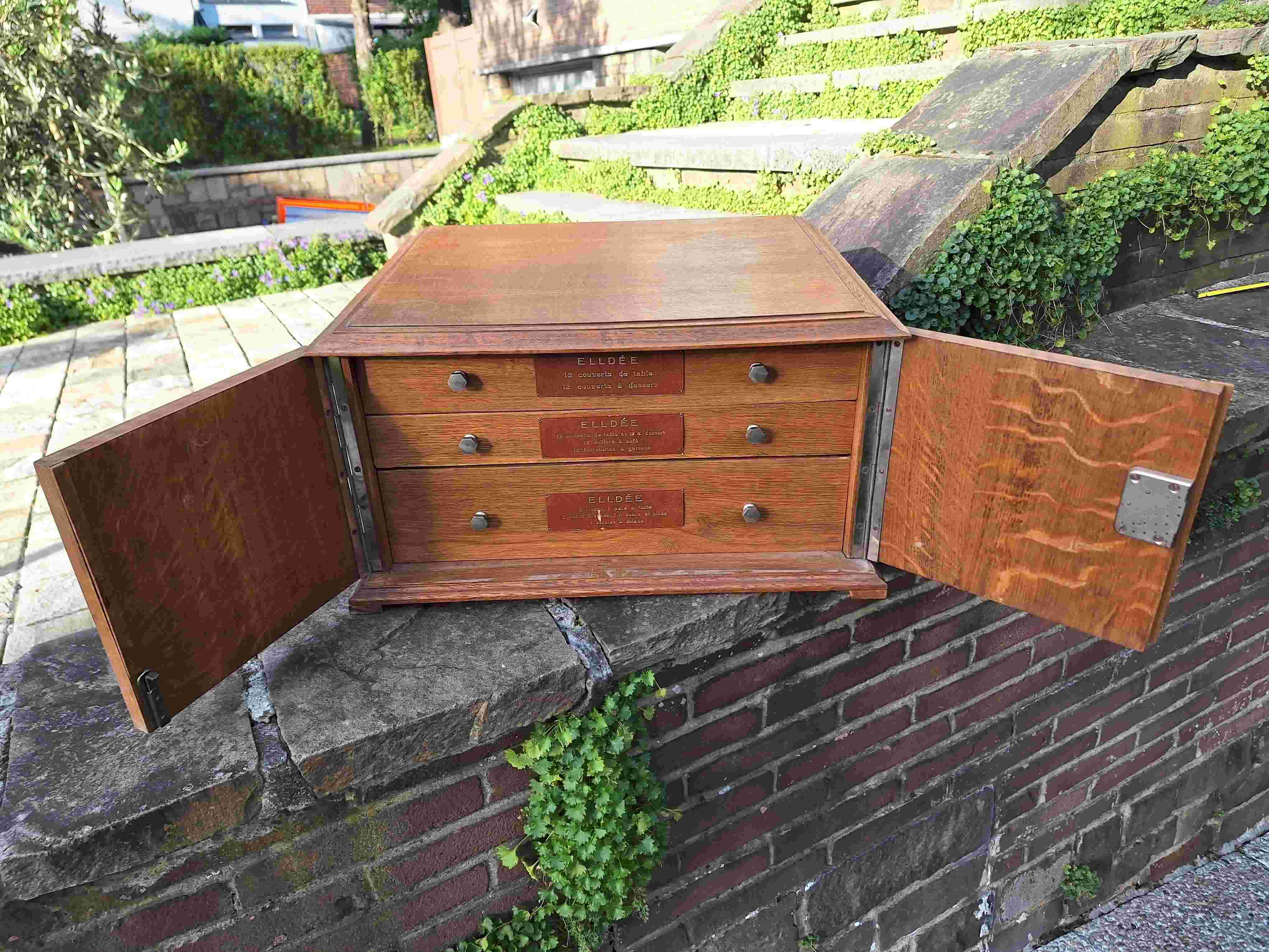 W bardzo porządnym kuferku z drewna dębowego, podwójne drzwiczki, 3 szuflady oznakowane "ELLDEE"