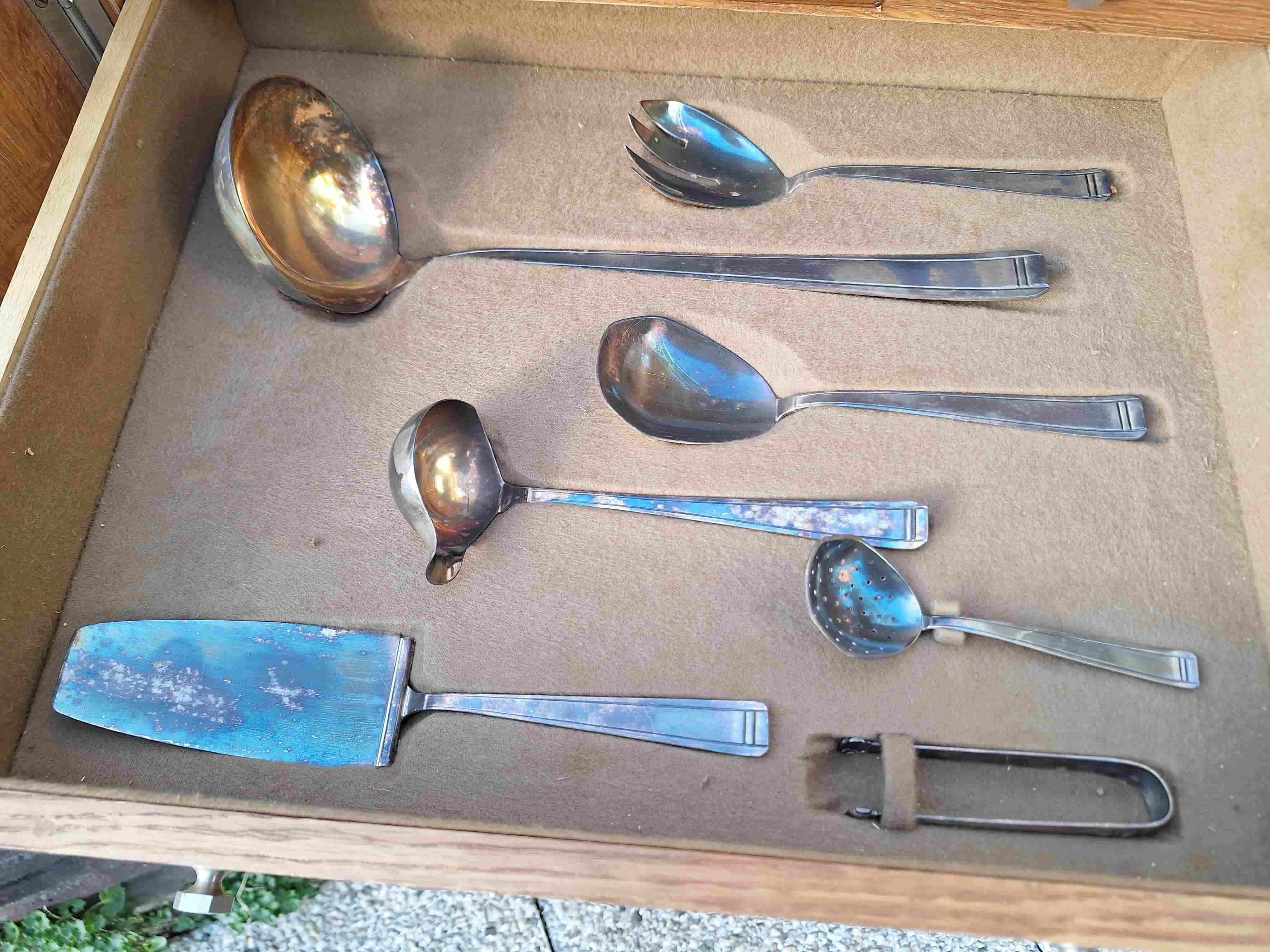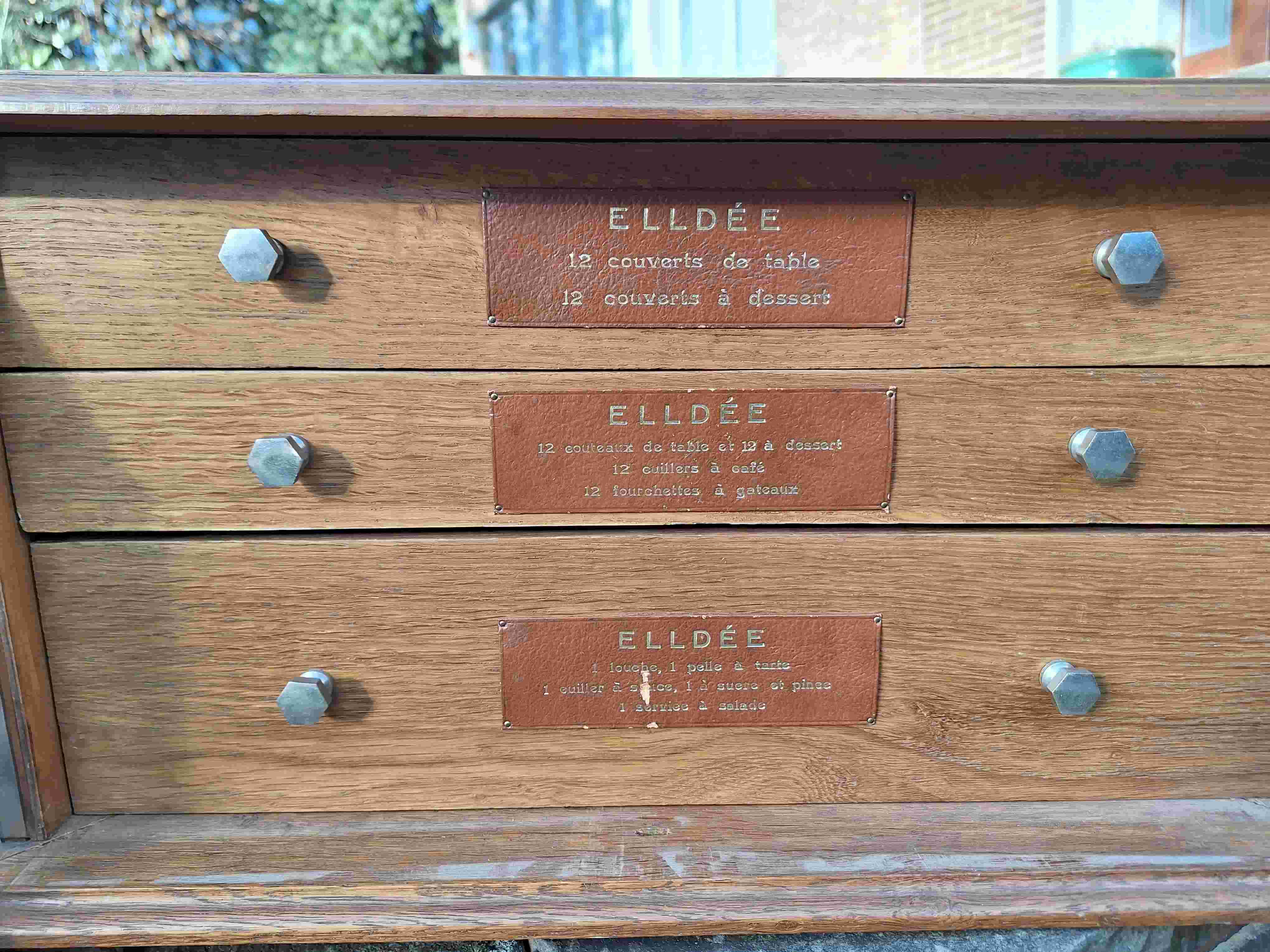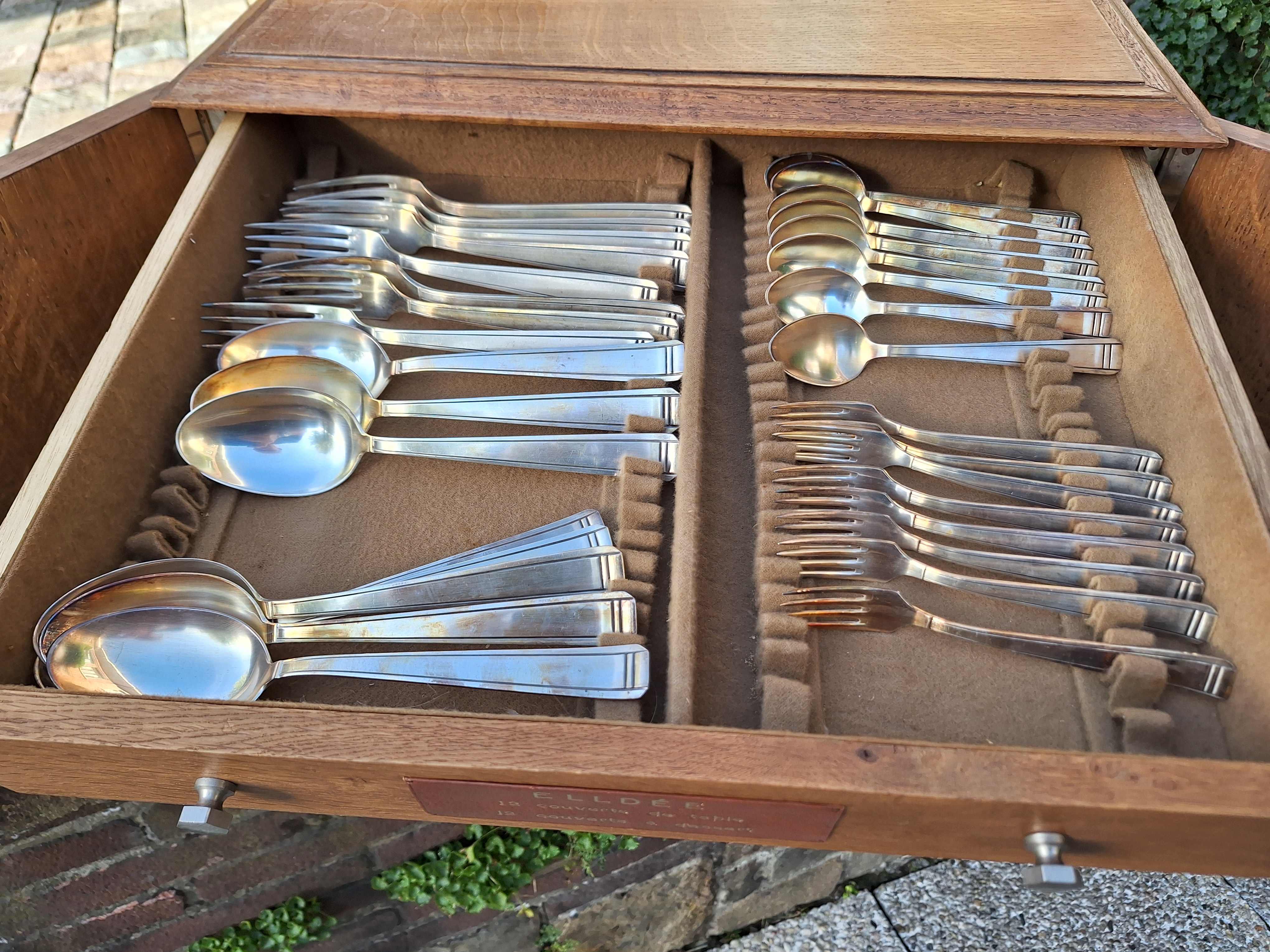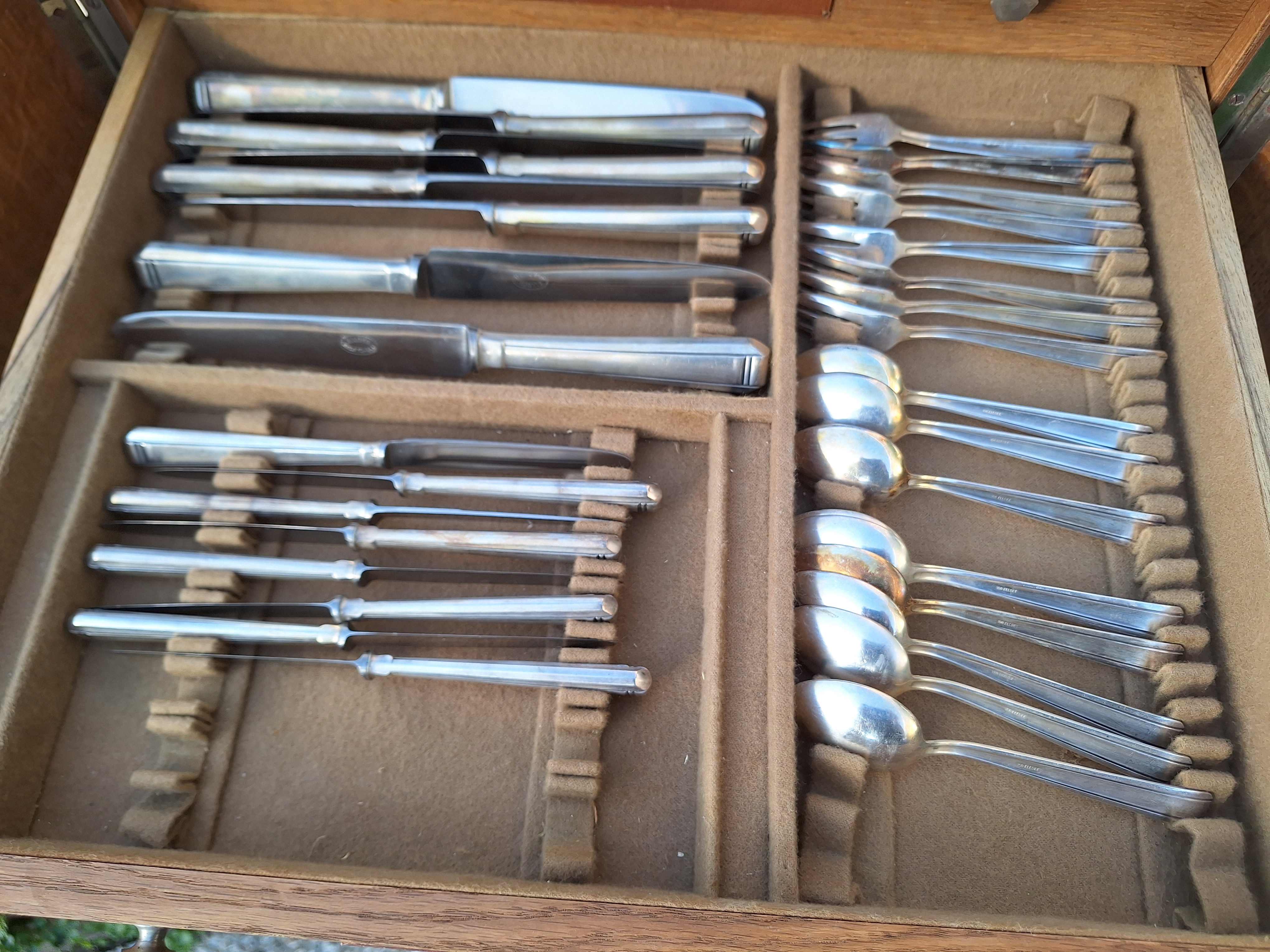 Zestaw sztucce platerowe "Art Déco", komplet dla 8 osob, sygnowane"ELLDEE 100 Germany", ostrza noży "inoxydable" : • Duże łyżki, widelce , noże - 3 x 12szt. • Male łyżki, widelce, noże - 3 x 8 szt. • Łyżeczki, widelczyki deserowe - 2 x 8szt. = 54szt. Sztućce serwingowe 7 szt.: • Chochelka duza-1szt. • Chochelka mala-1 szt. • Sztućce do sałaty-(łyżka-widelec) – 2szt. • Tortownica / Łyżeczka sitko / szczypce do lodu – 3 szt. Łącznie 83 szt. W bardzo porządnym kuferku z drewna dębowego, podwójne drzwiczki, 3 szuflady oznakowane "ELLDEE"