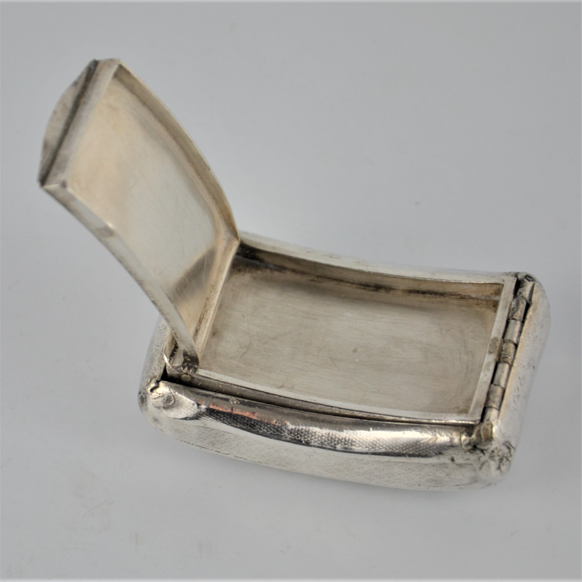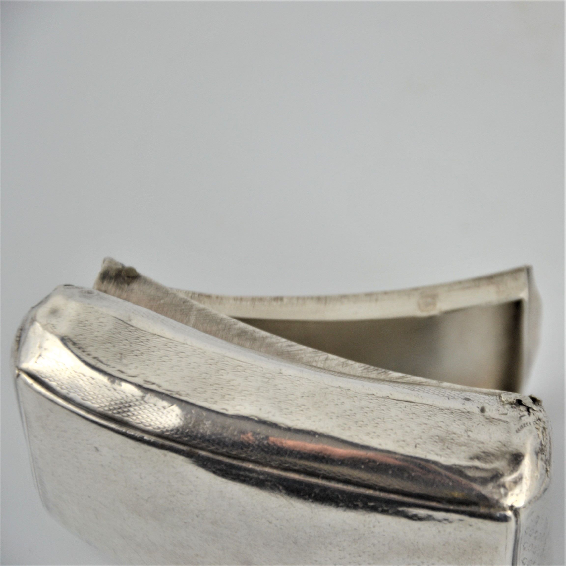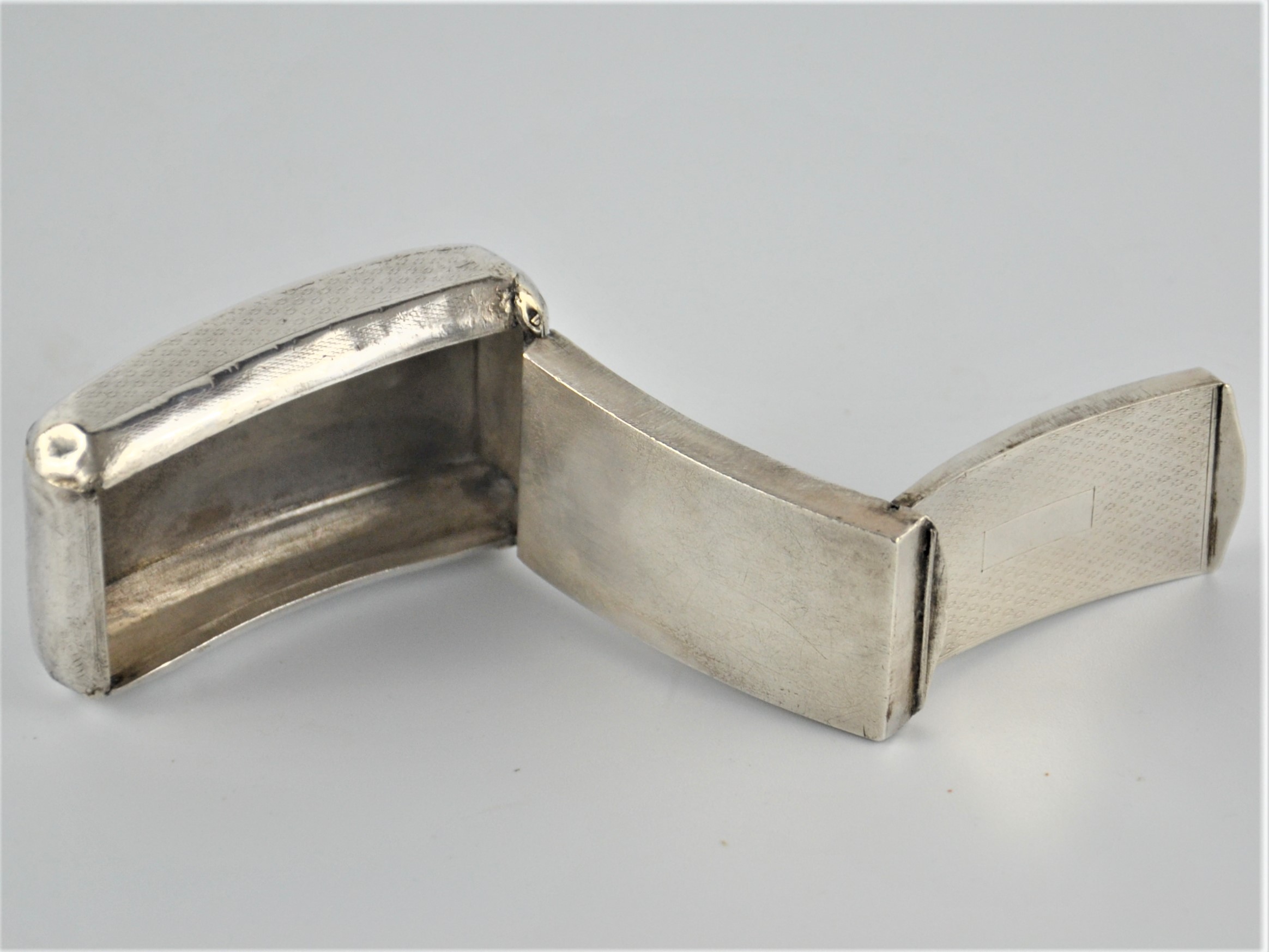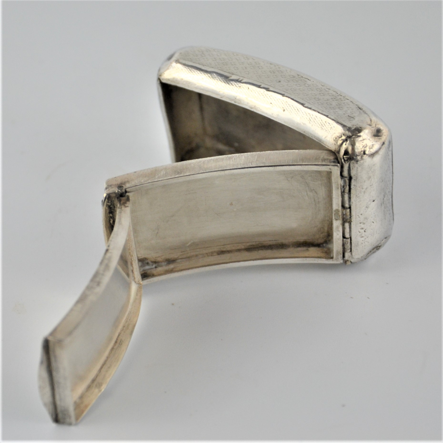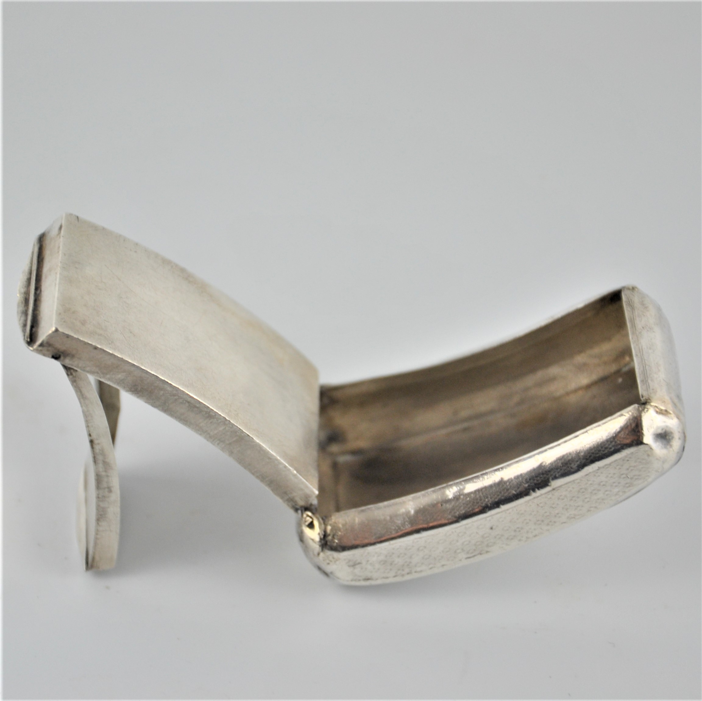 Zabytkowa tabakierka wykonana z wysokiej jakości srebra, próby 950, sygnowana (głowa Minerwy) Francja XIXw. Unikalna ze względu na formę , składa się z dwóch kasetek głębokiej i płytkiej połączonych zawiasami.