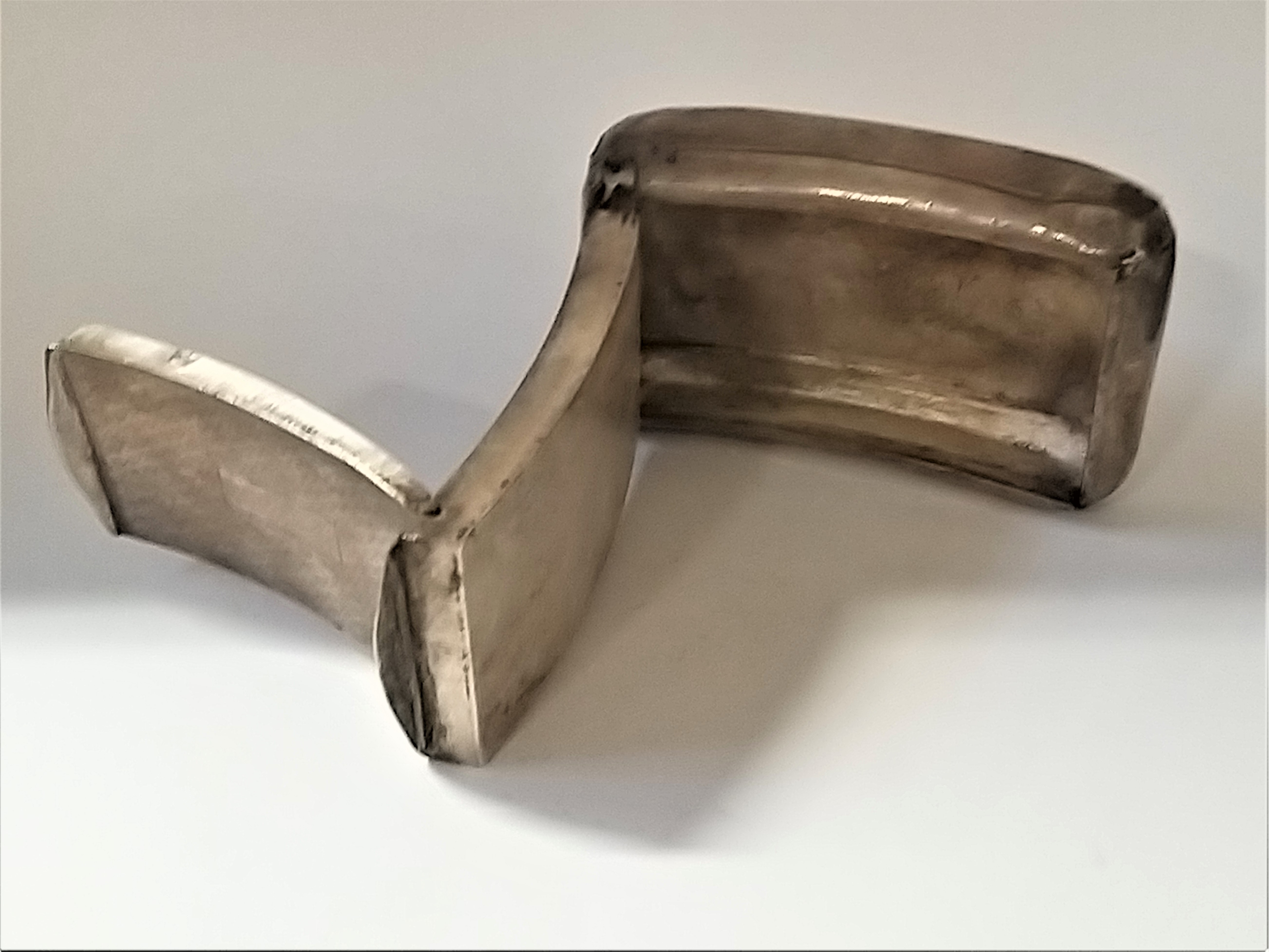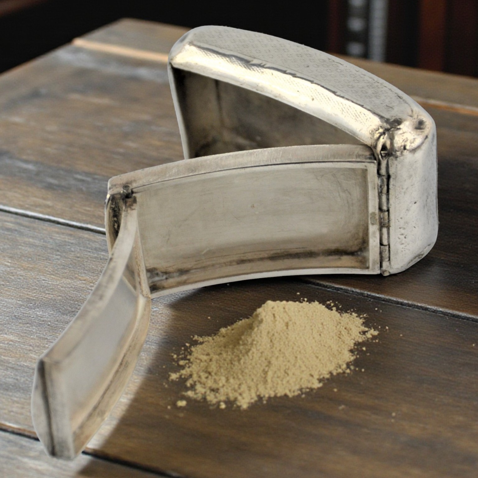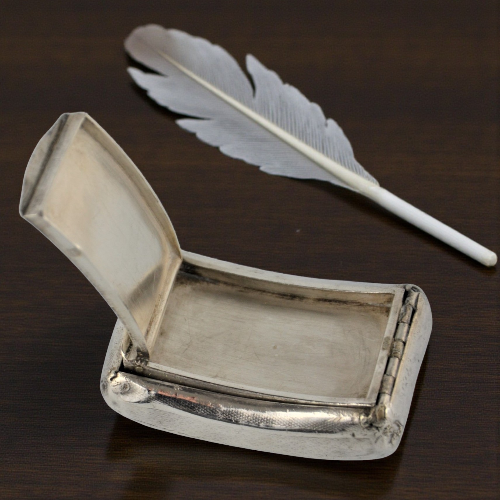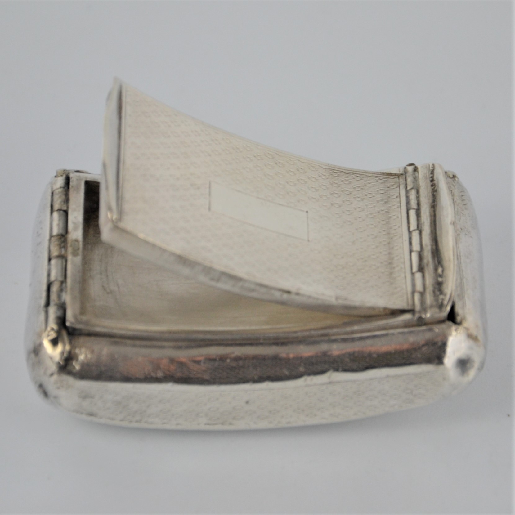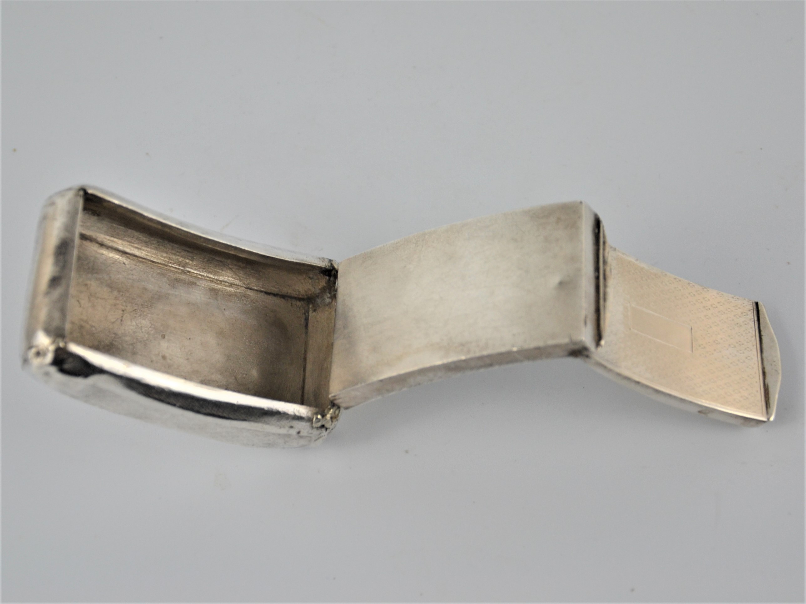 Zabytkowa tabakierka wykonana z wysokiej jakości srebra, próby 950, sygnowana (głowa Minerwy) Francja XIXw. Unikalna ze względu na formę , składa się z dwóch kasetek głębokiej i płytkiej połączonych zawiasami.