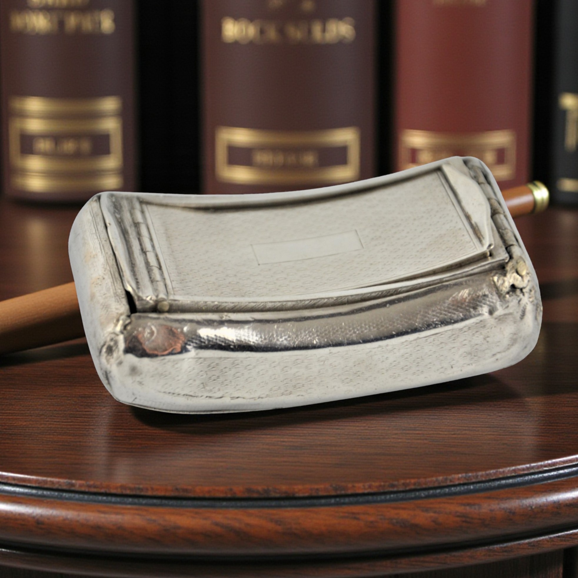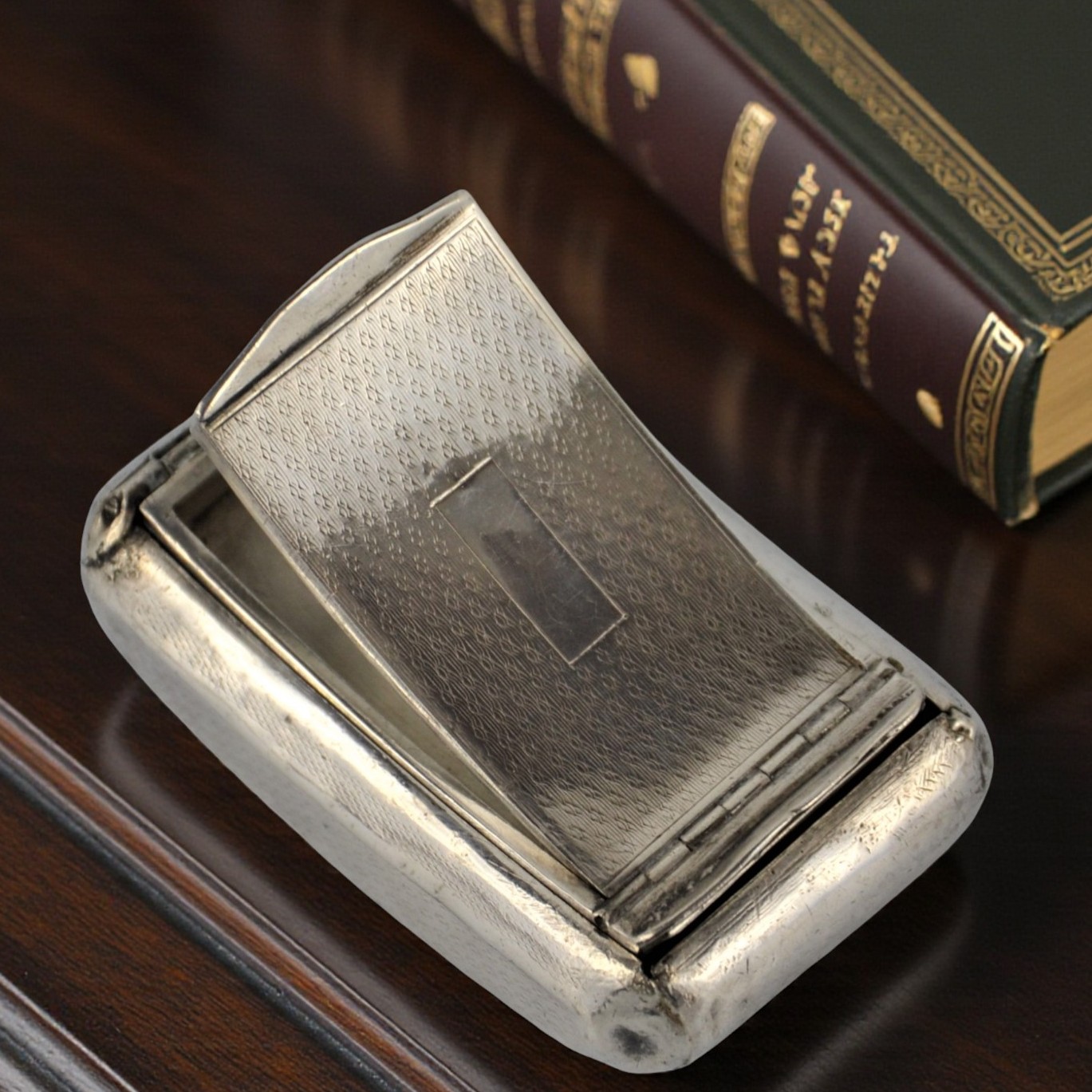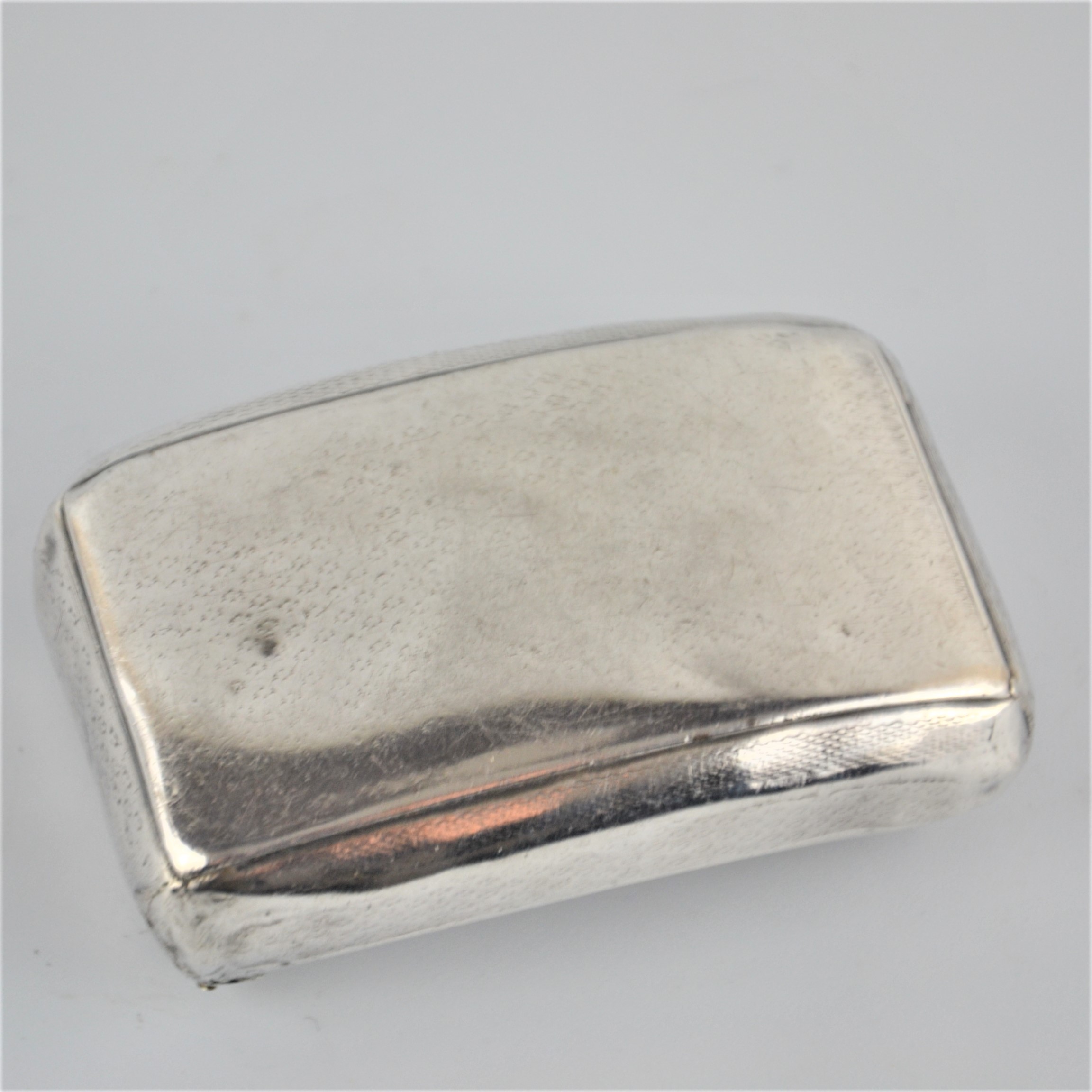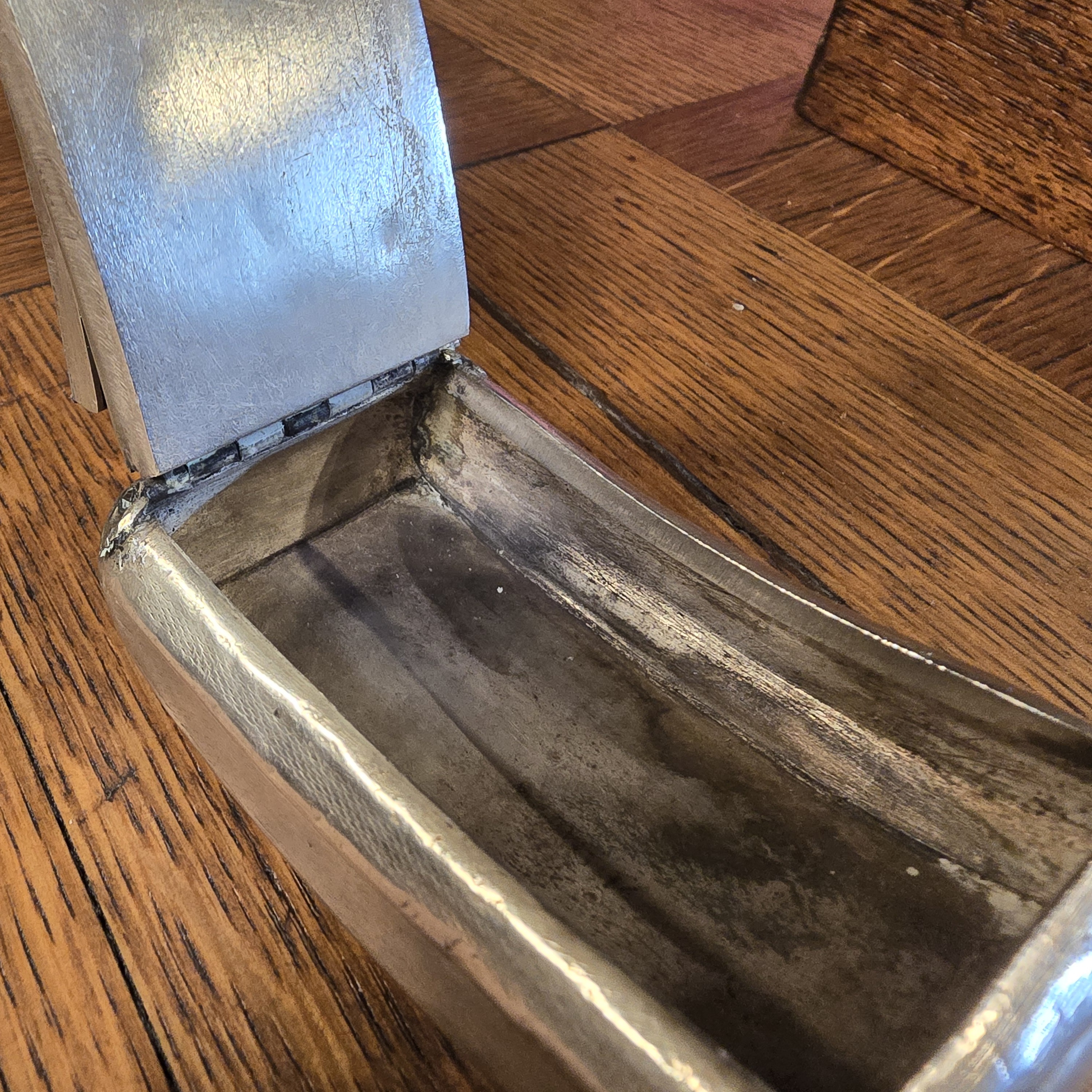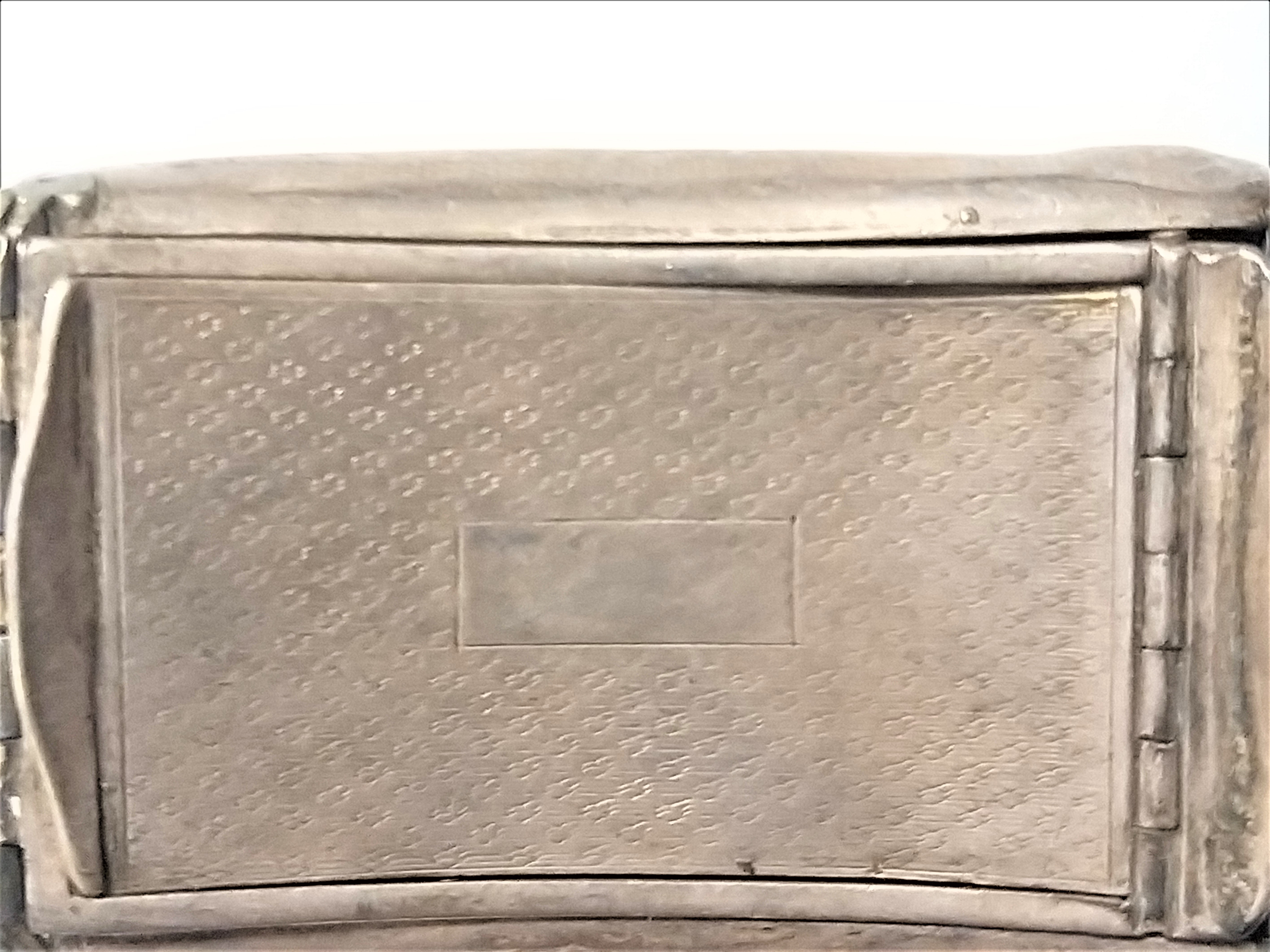 Zabytkowa tabakierka wykonana z wysokiej jakości srebra, próby 950, sygnowana (głowa Minerwy) Francja XIXw. Unikalna ze względu na formę , składa się z dwóch kasetek głębokiej i płytkiej połączonych zawiasami.