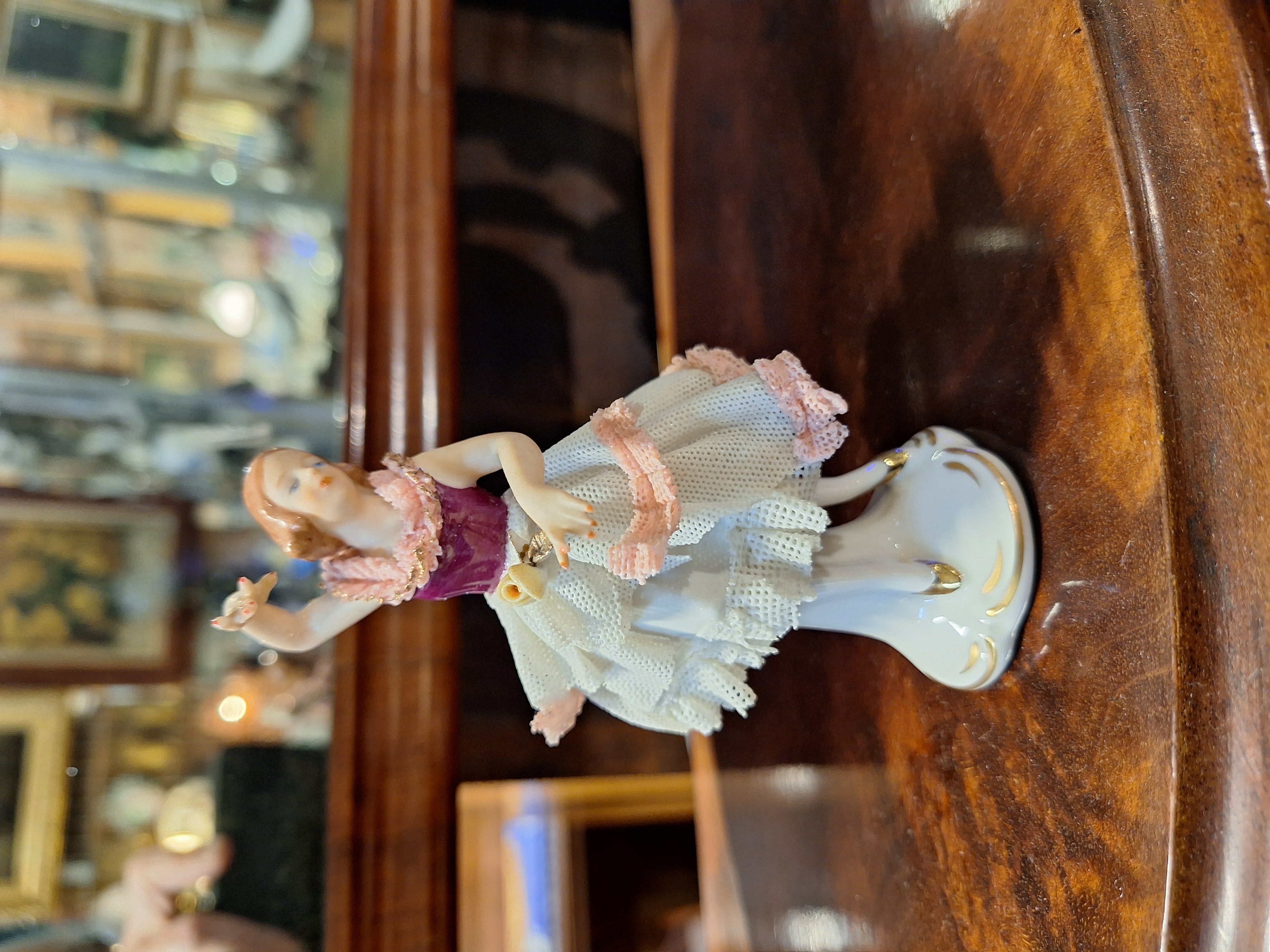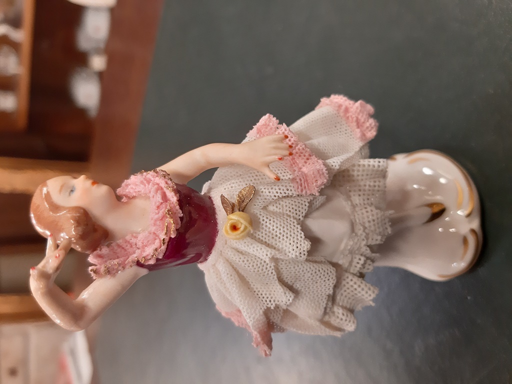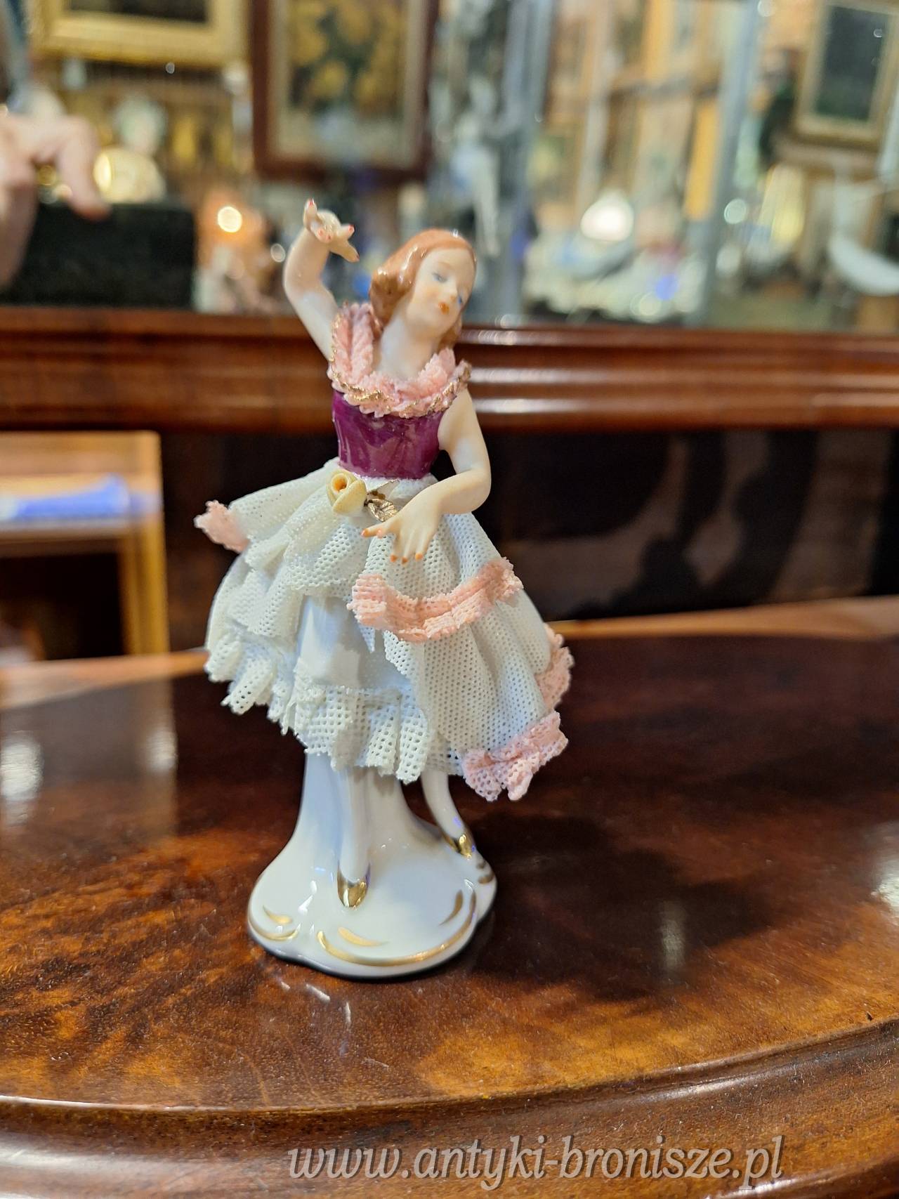 2115 - "Tancerka" - Figurka z porcelany niemieckiej Dresden "Camilla" - H:11,5cm // ubytki na spodnicy >> przecena