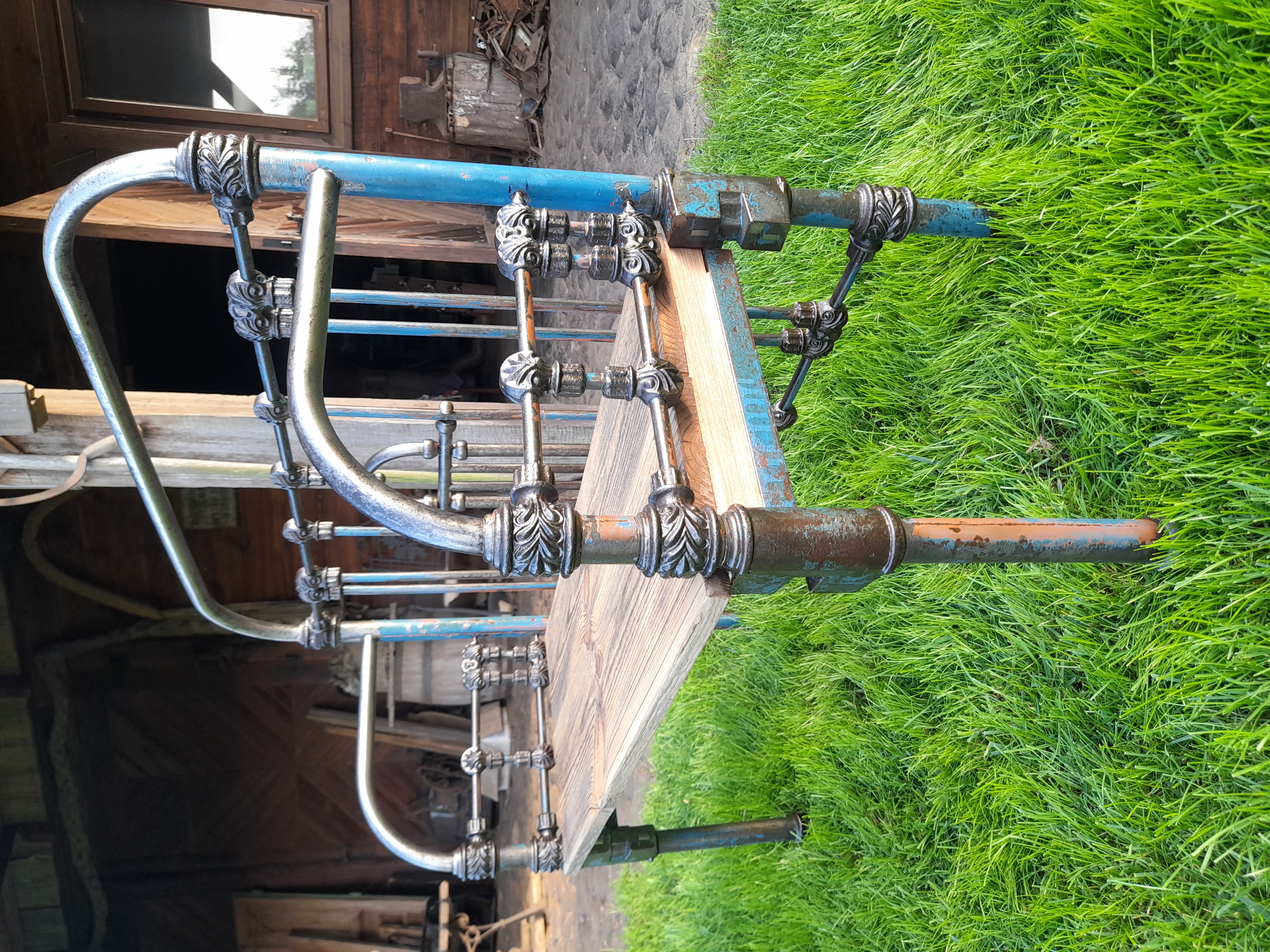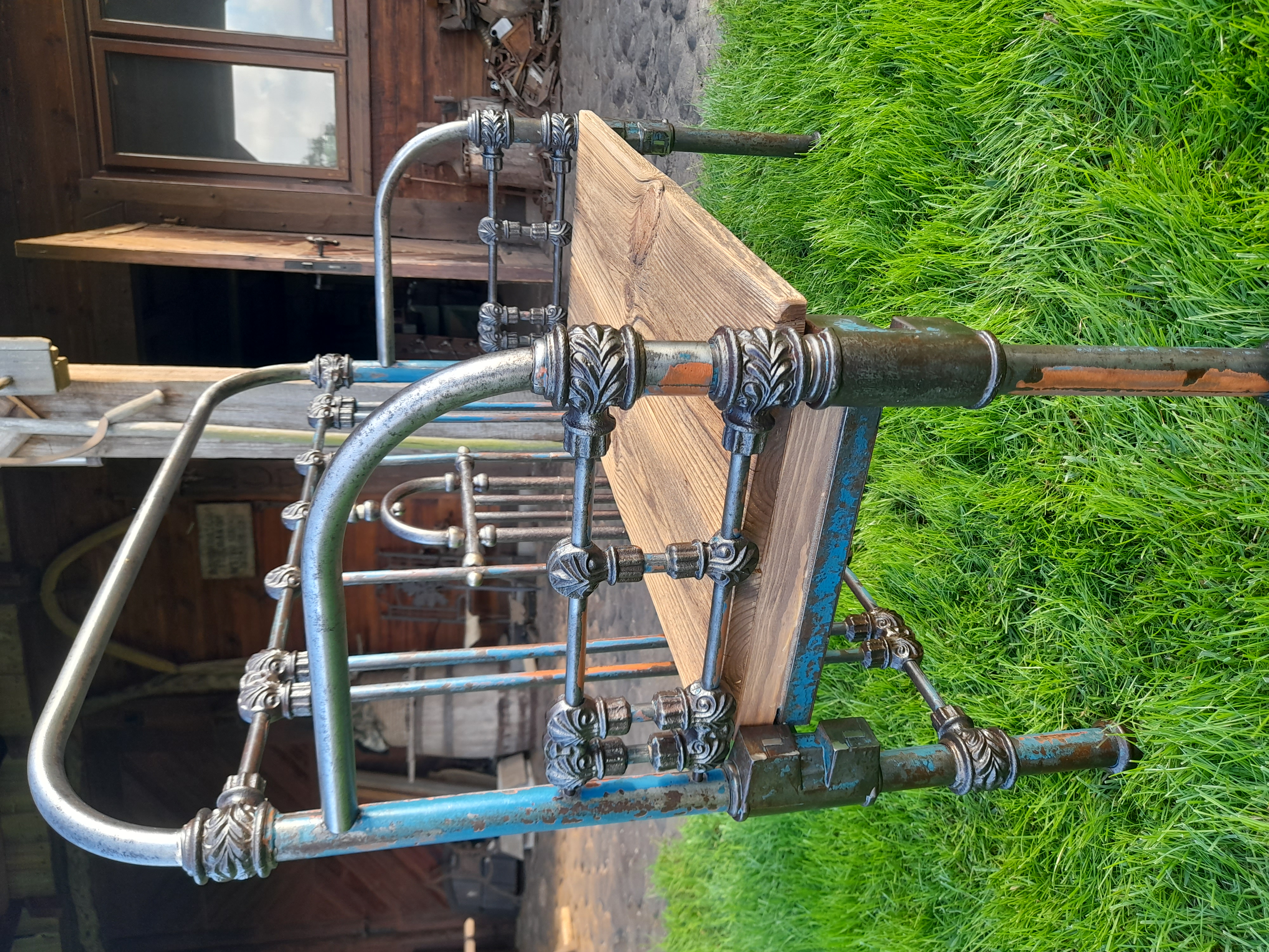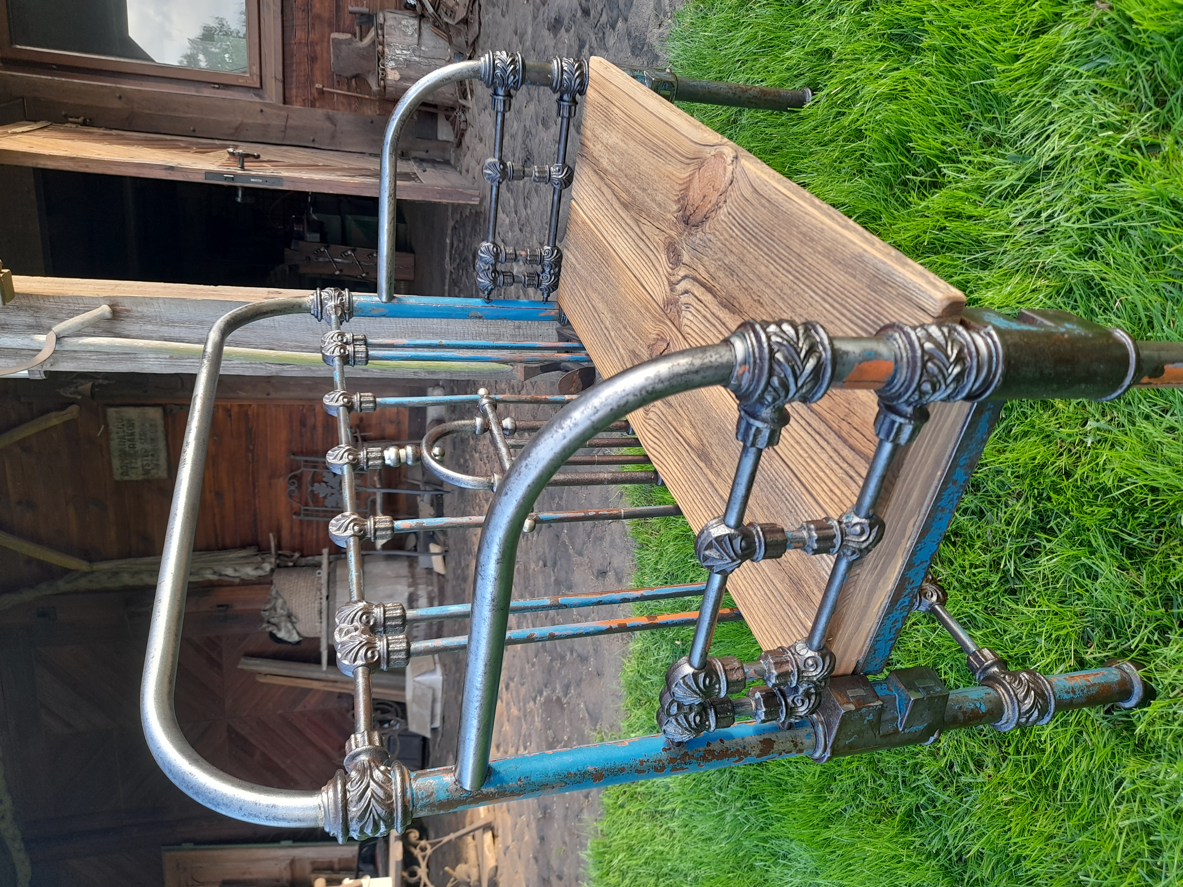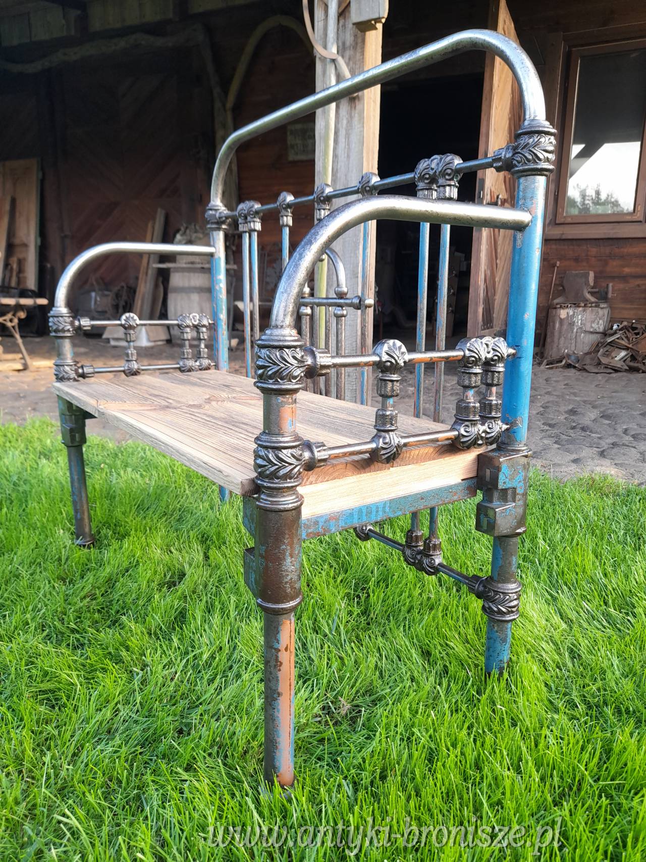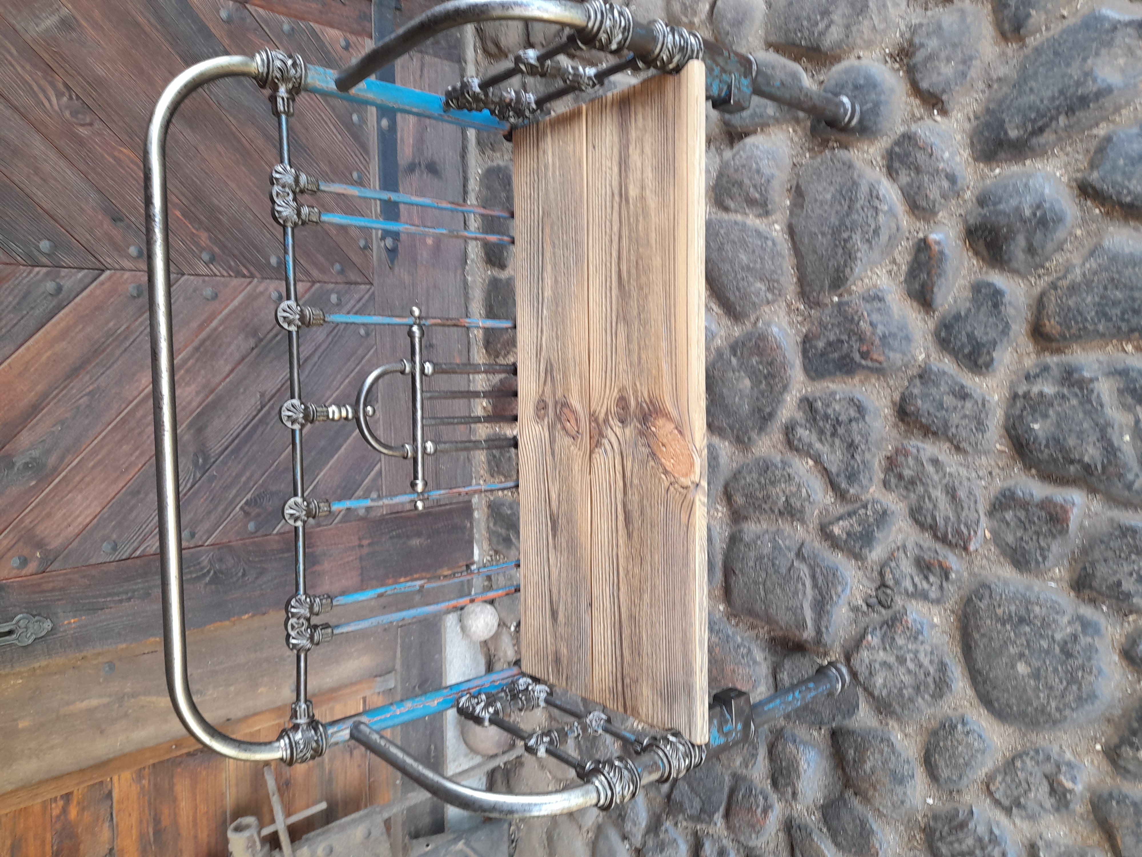 Ręcznie wykonana ławka z metalowymi elementami, idealnie pasująca do ogrodu lub na taras. Posiada piękne, rzeźbione detale, nadające jej unikalny charakter. Pomimo widocznych śladów użytkowania, ławka jest w dobrym stanie i gotowa do dalszego użytkowania.