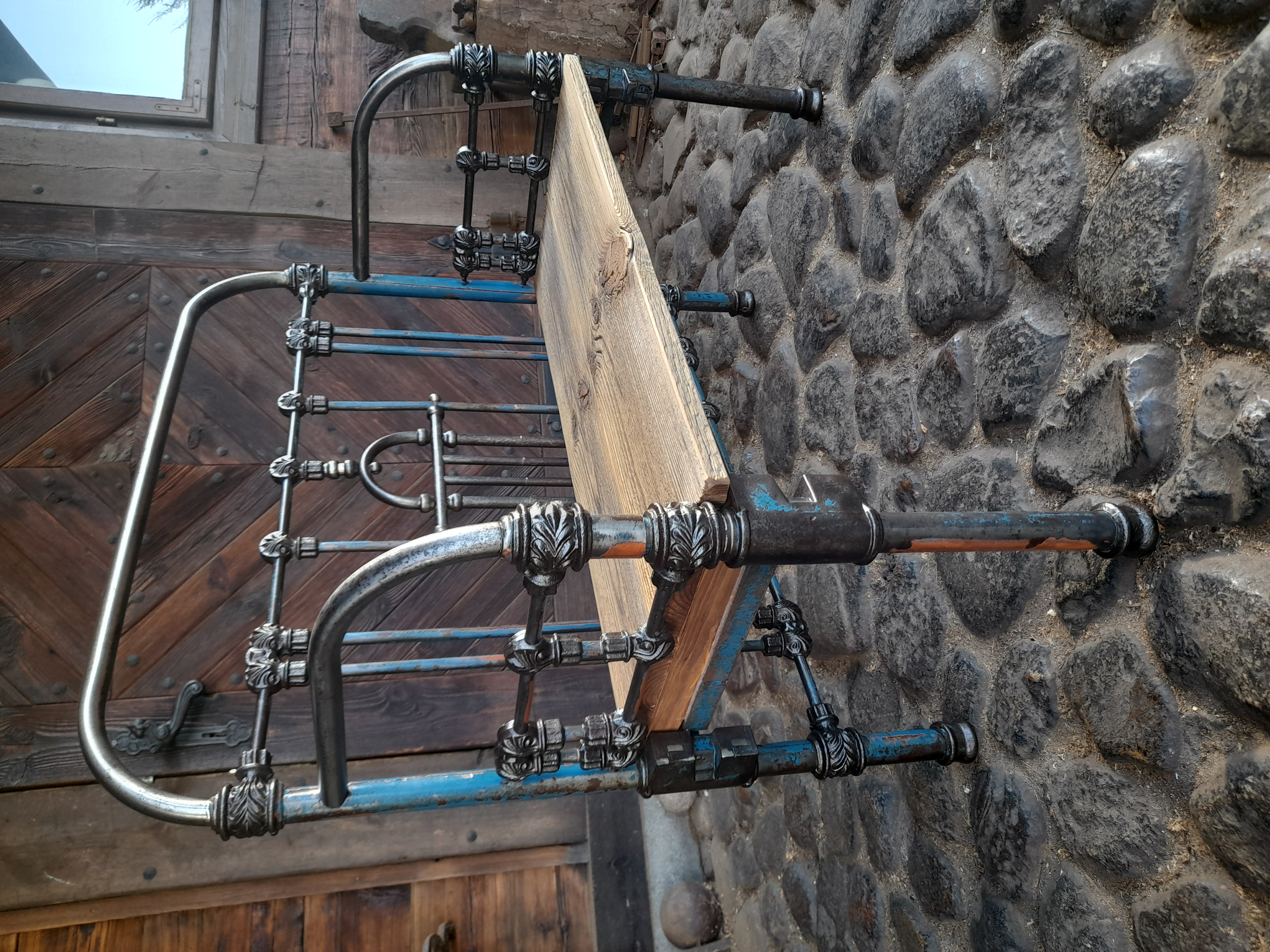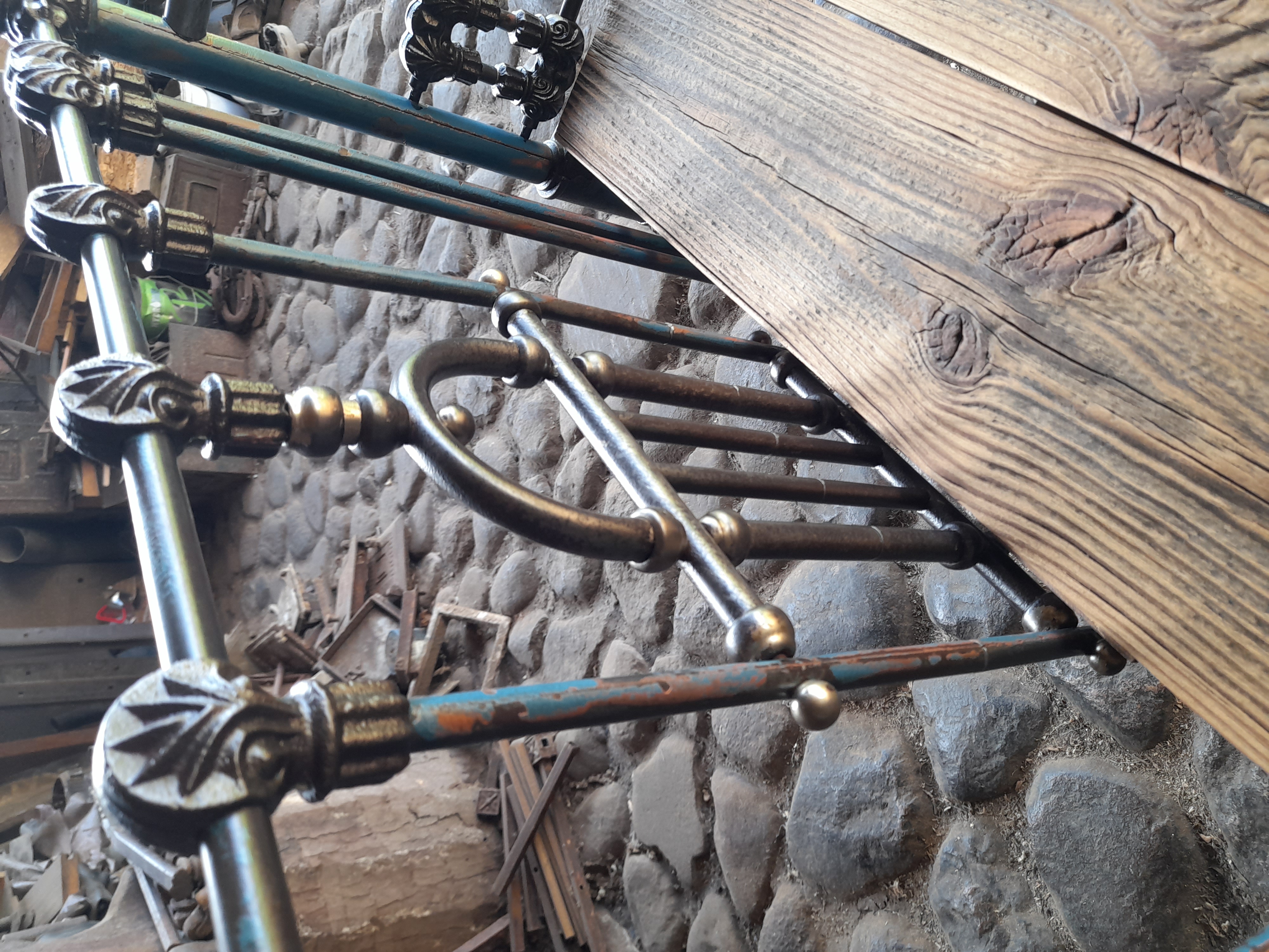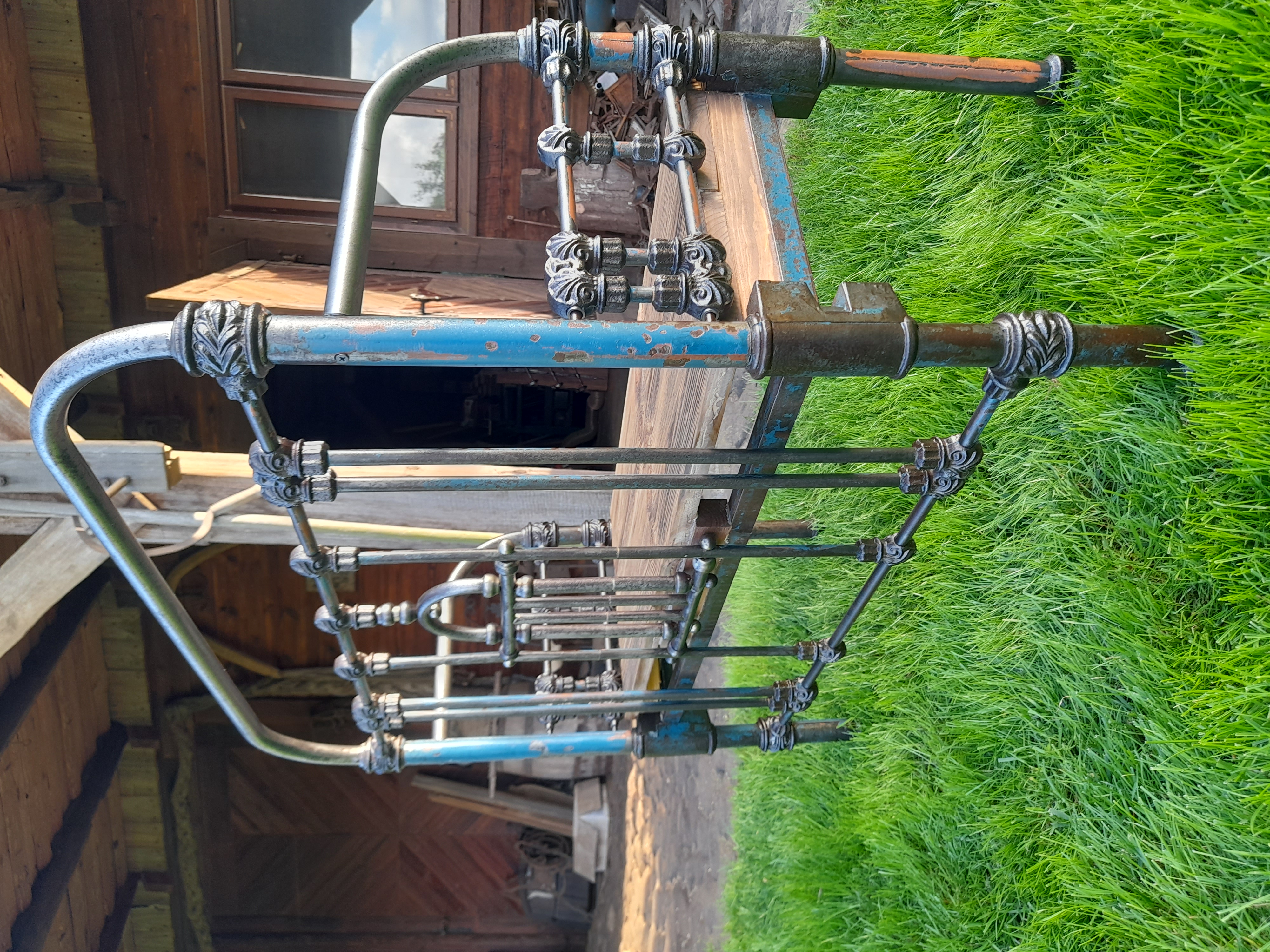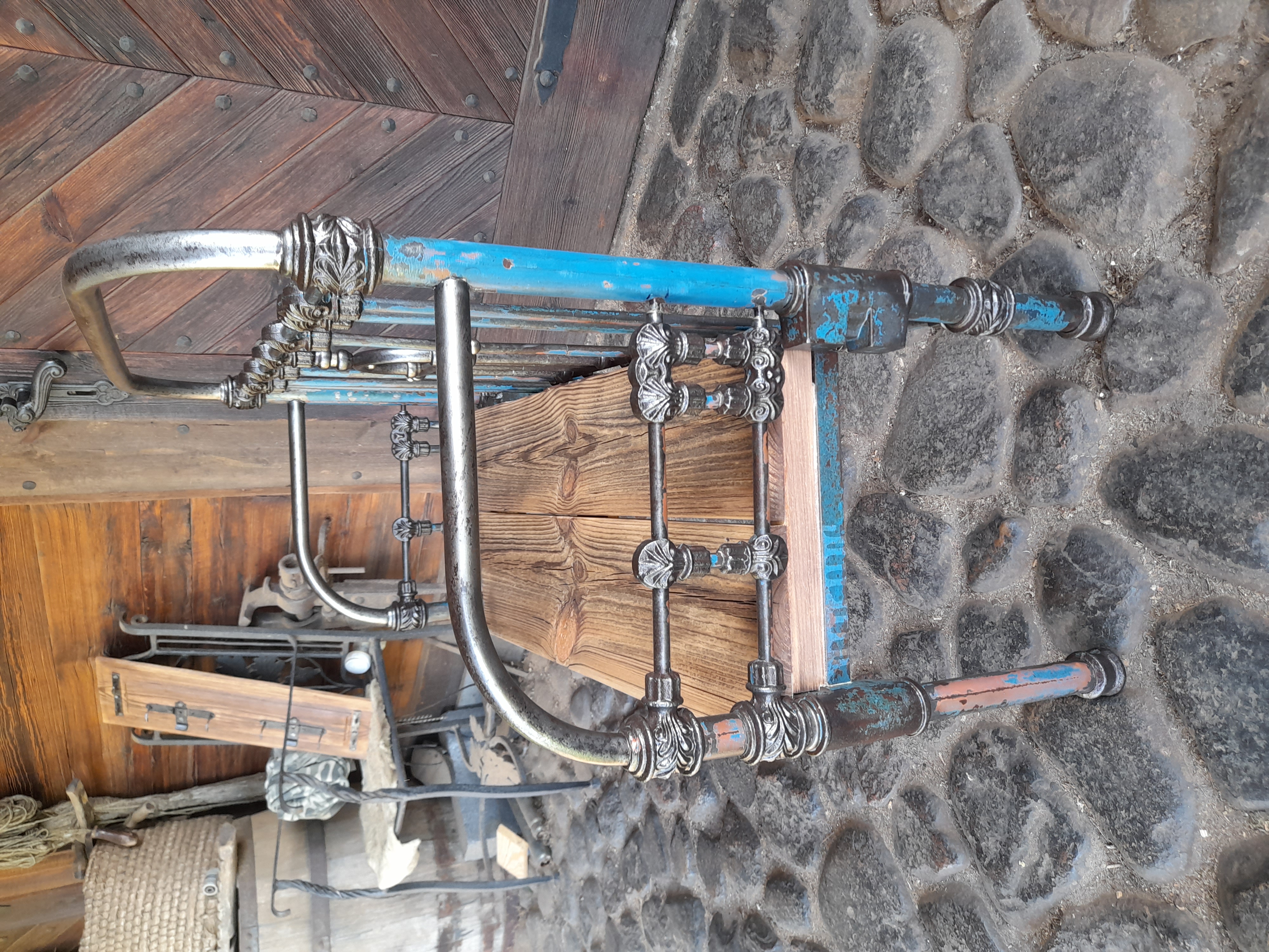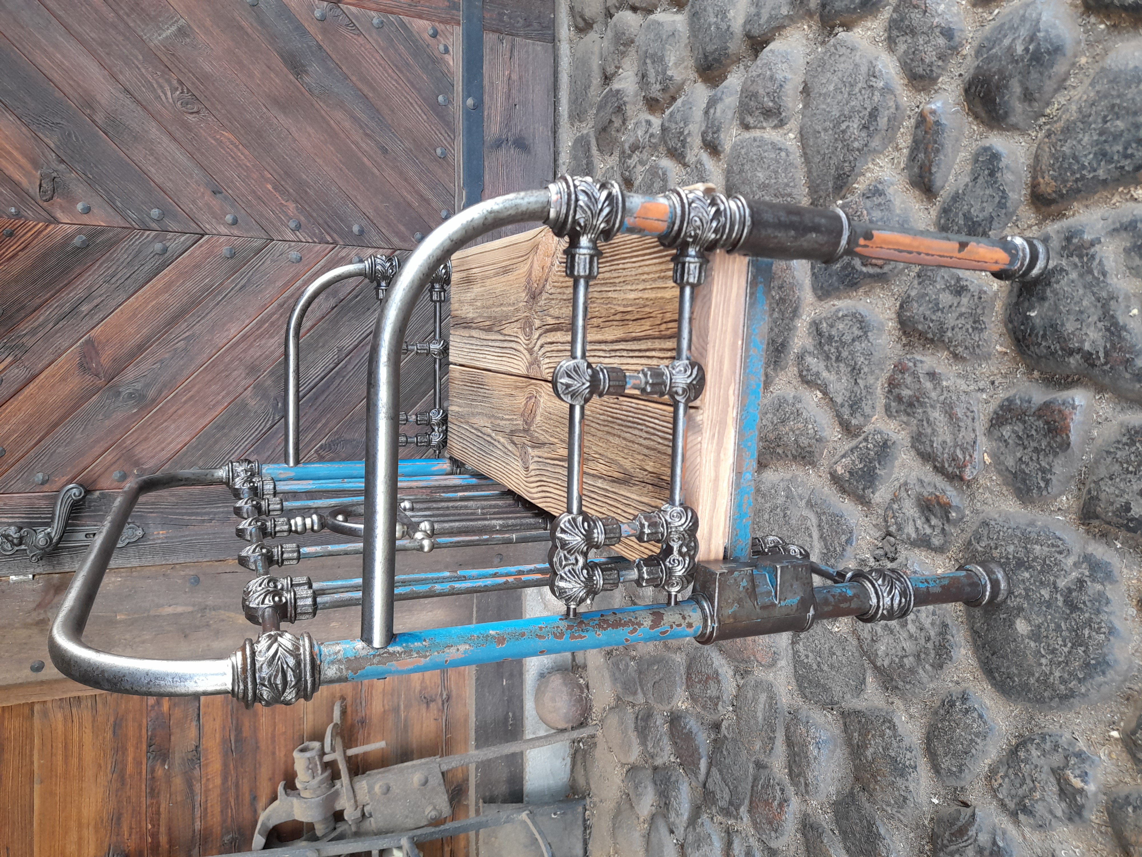 Ręcznie wykonana ławka z metalowymi elementami, idealnie pasująca do ogrodu lub na taras. Posiada piękne, rzeźbione detale, nadające jej unikalny charakter. Pomimo widocznych śladów użytkowania, ławka jest w dobrym stanie i gotowa do dalszego użytkowania.