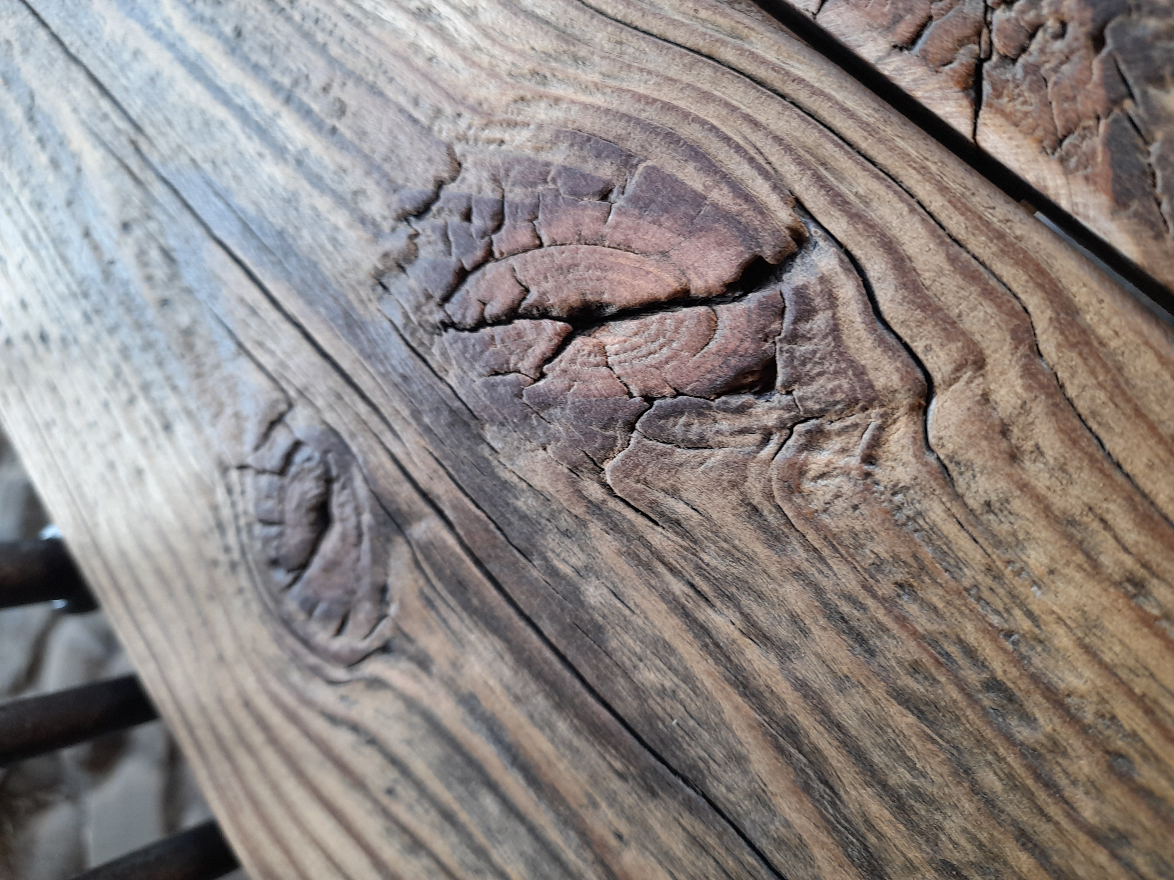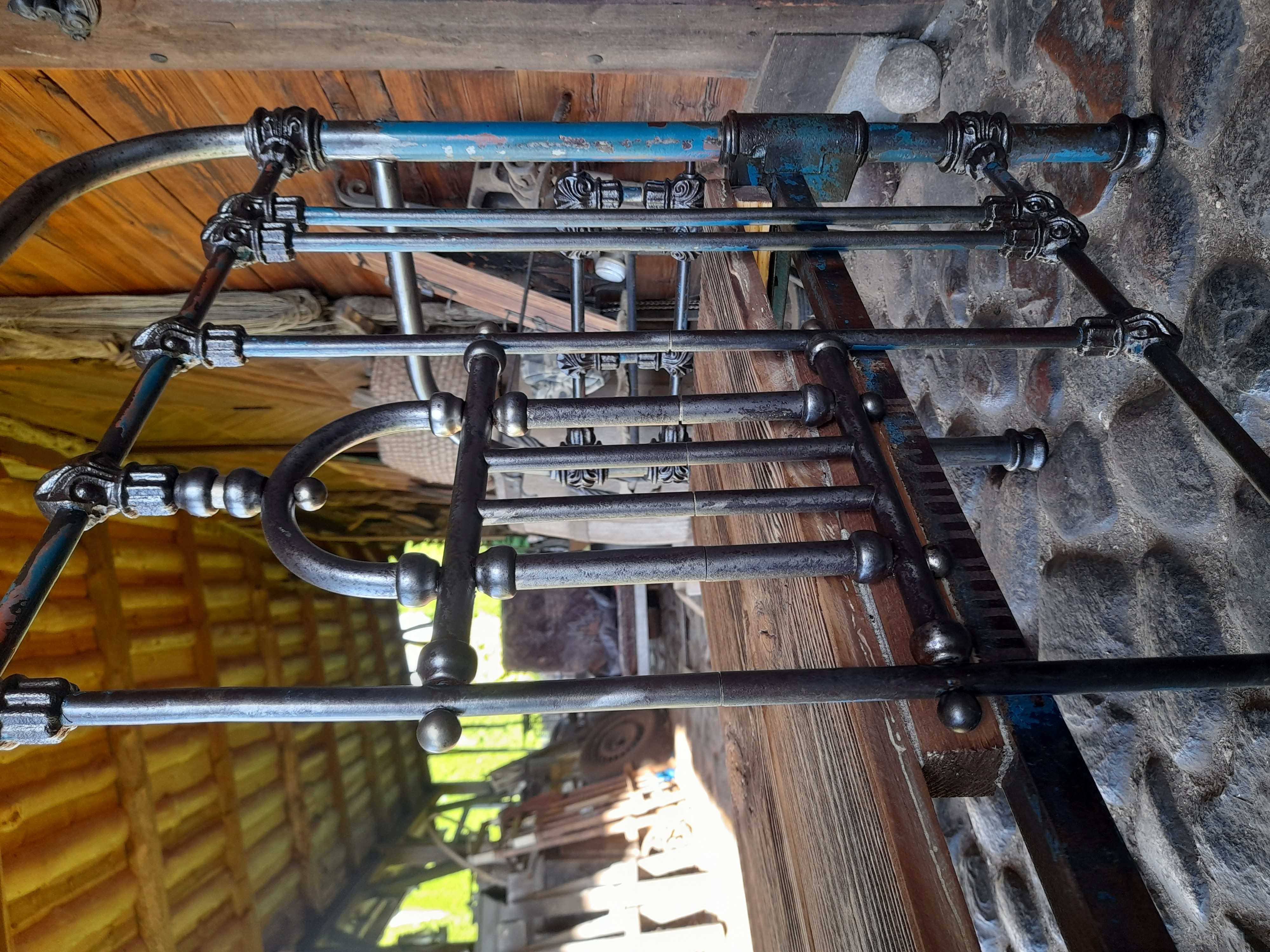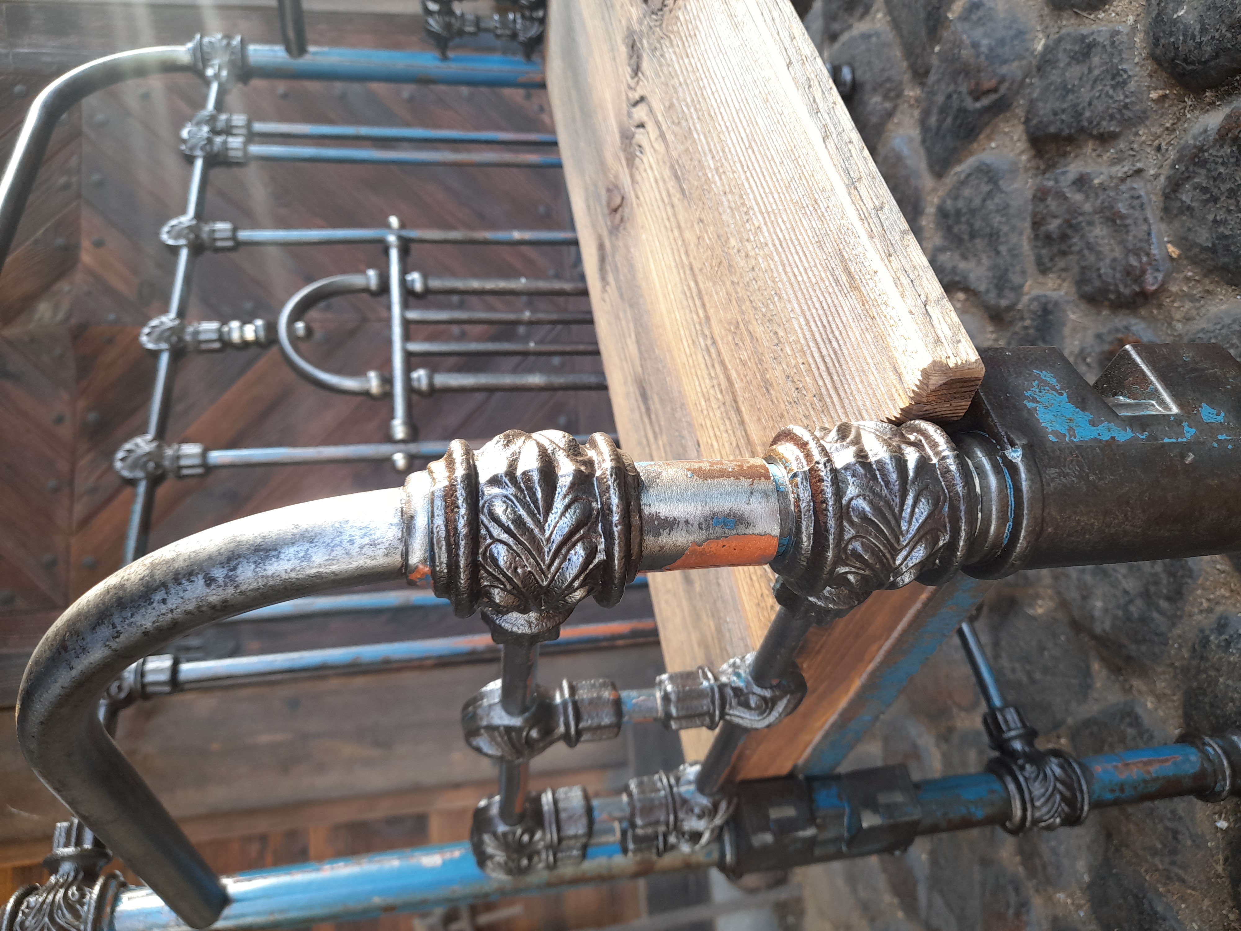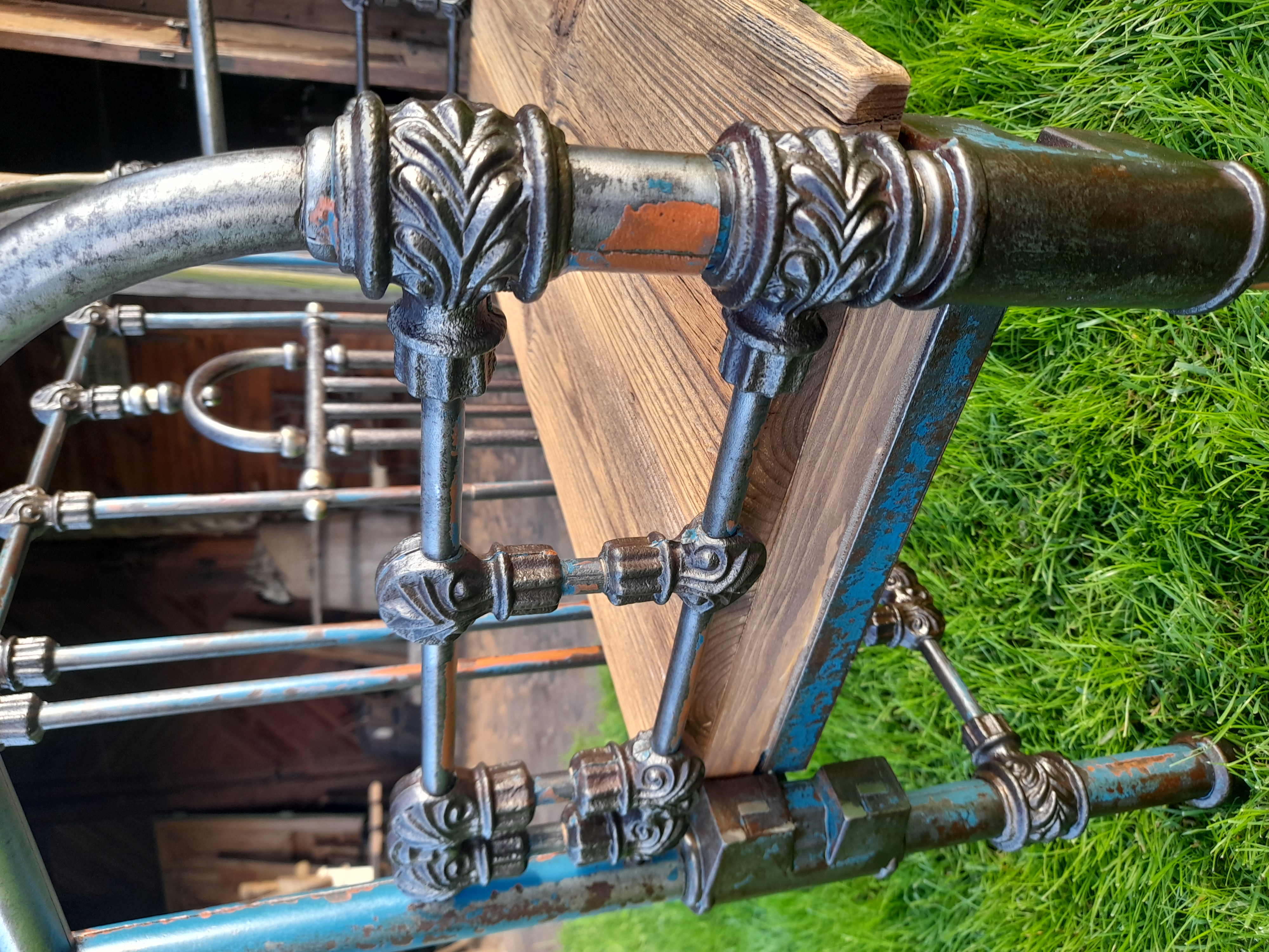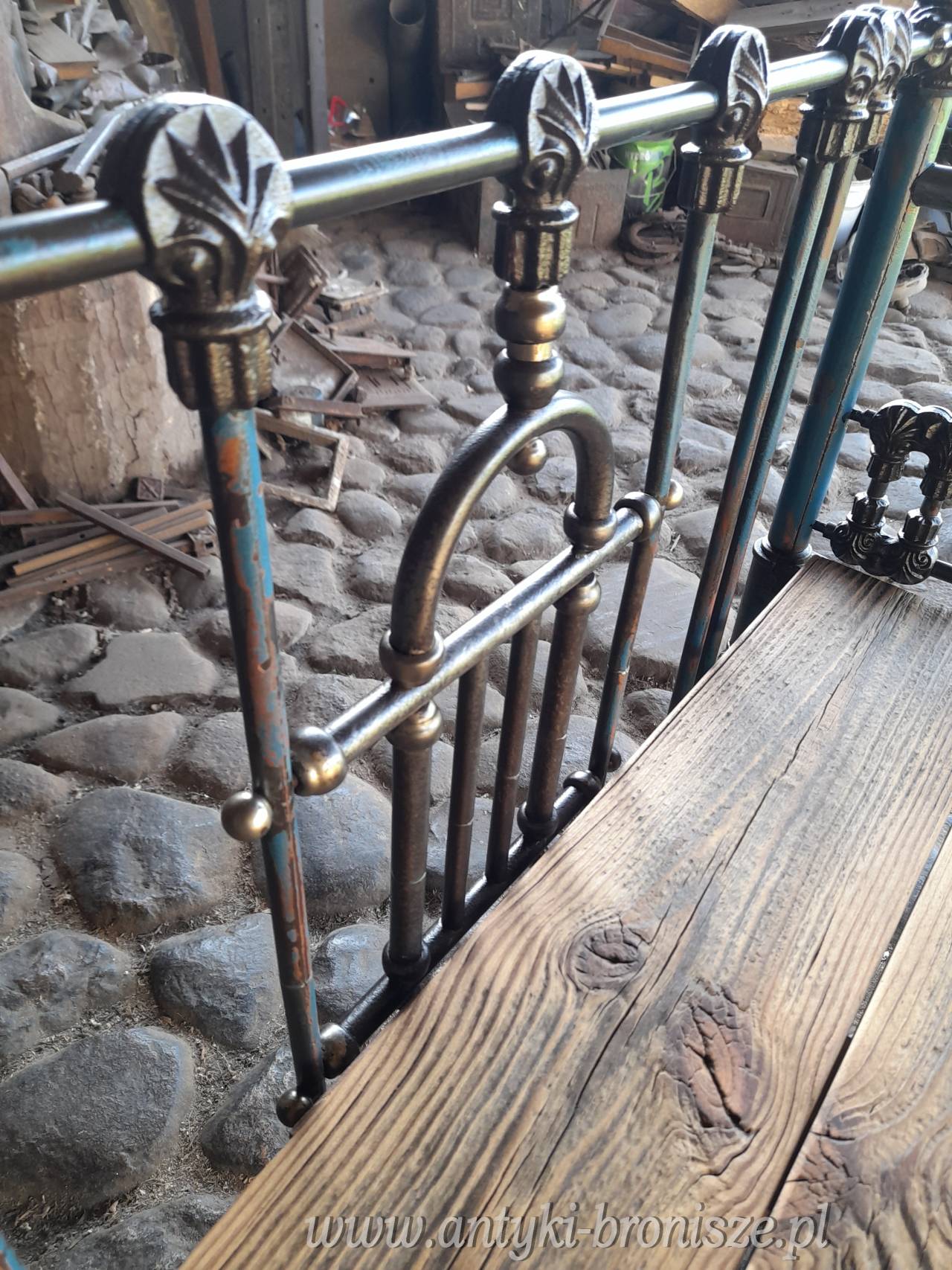 Ręcznie wykonana ławka z metalowymi elementami, idealnie pasująca do ogrodu lub na taras. Posiada piękne, rzeźbione detale, nadające jej unikalny charakter. Pomimo widocznych śladów użytkowania, ławka jest w dobrym stanie i gotowa do dalszego użytkowania.