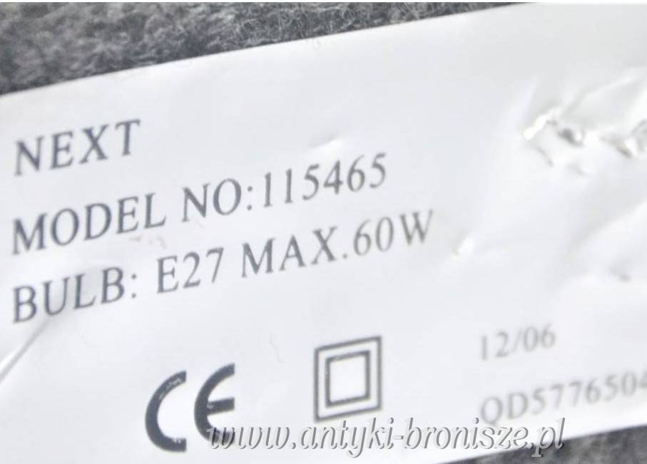 Angielska lampa stołowa firmy Next o niepowtarzalnym kształcie w modnej kolorystyce. Modernistyczna forma, lekko spłaszczona zwężająca się na górze. Podstawa ceramiczna (porcelanowa), czarna z szarą dekoracją roślinną, abażur trapez, czarny doskonale dopasowany kształtem i fakturą tkaniny. Lampa z 2006r prezentuje się wyjątkowo, jest w bardzo ładnym stanie, abażur nowy, wtyczka angielska (dodam przejściówkę w gratisie). Wysokość całkowita 48cm, podstawa 23,5/10cm