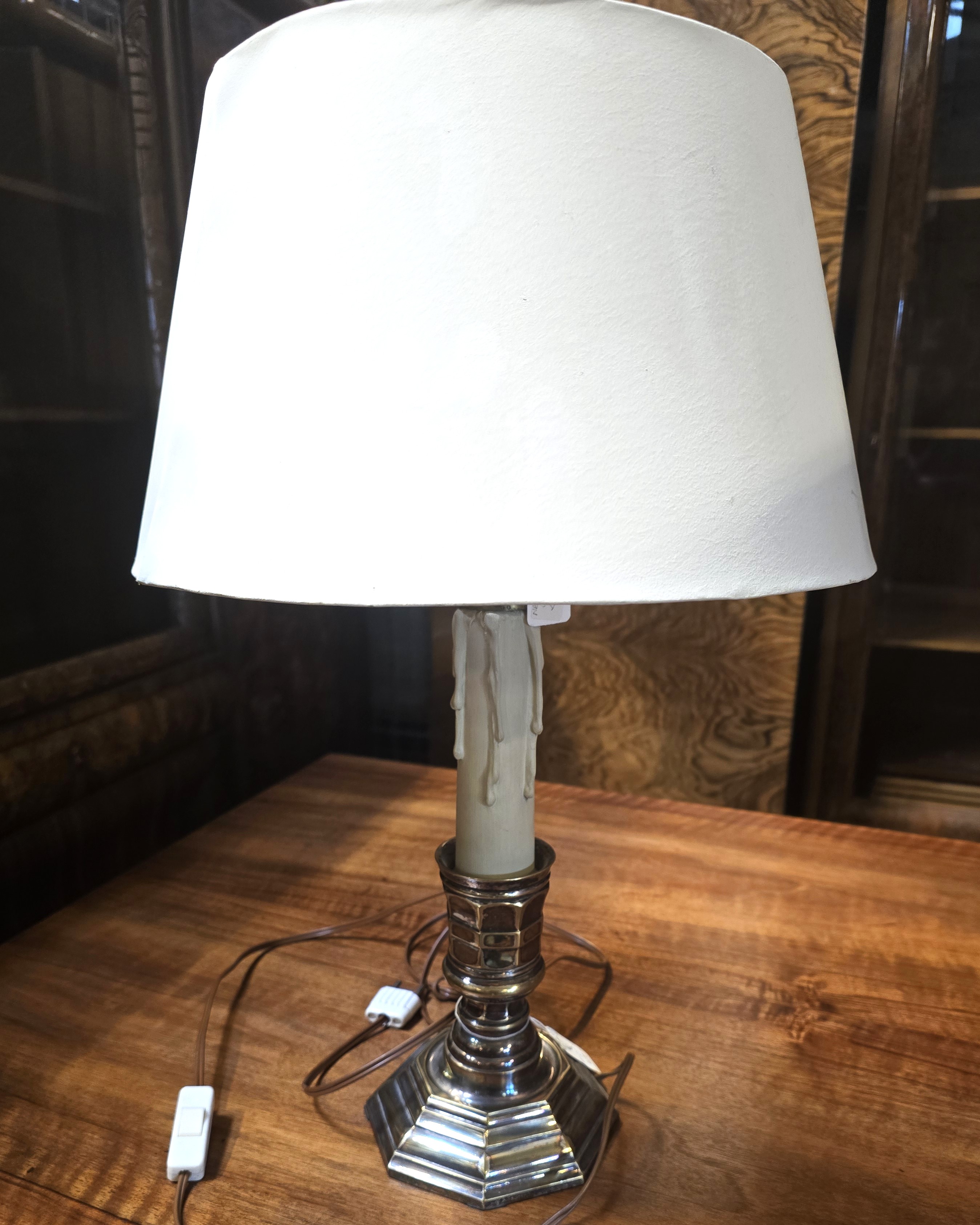 Podstawa metalowa, posrebrzana przypomina niski świecznik na okrągłej stopie
