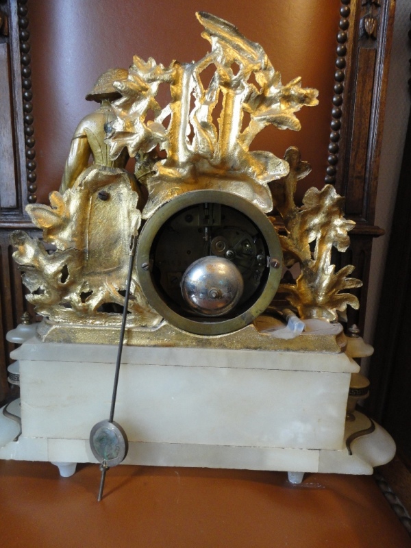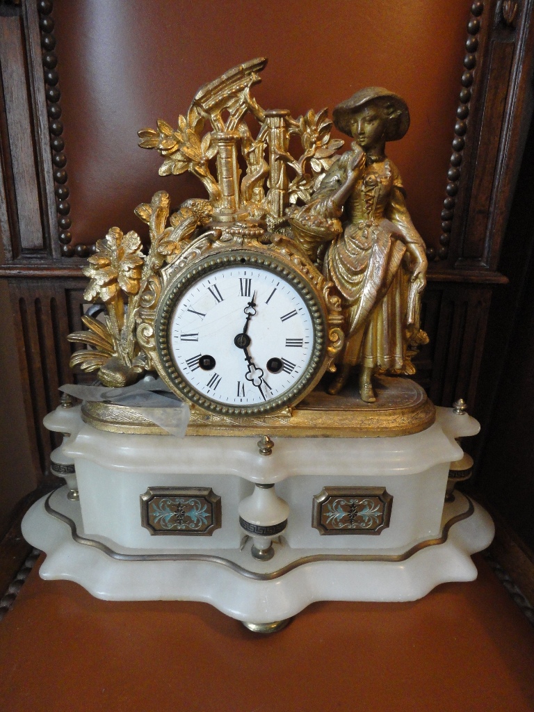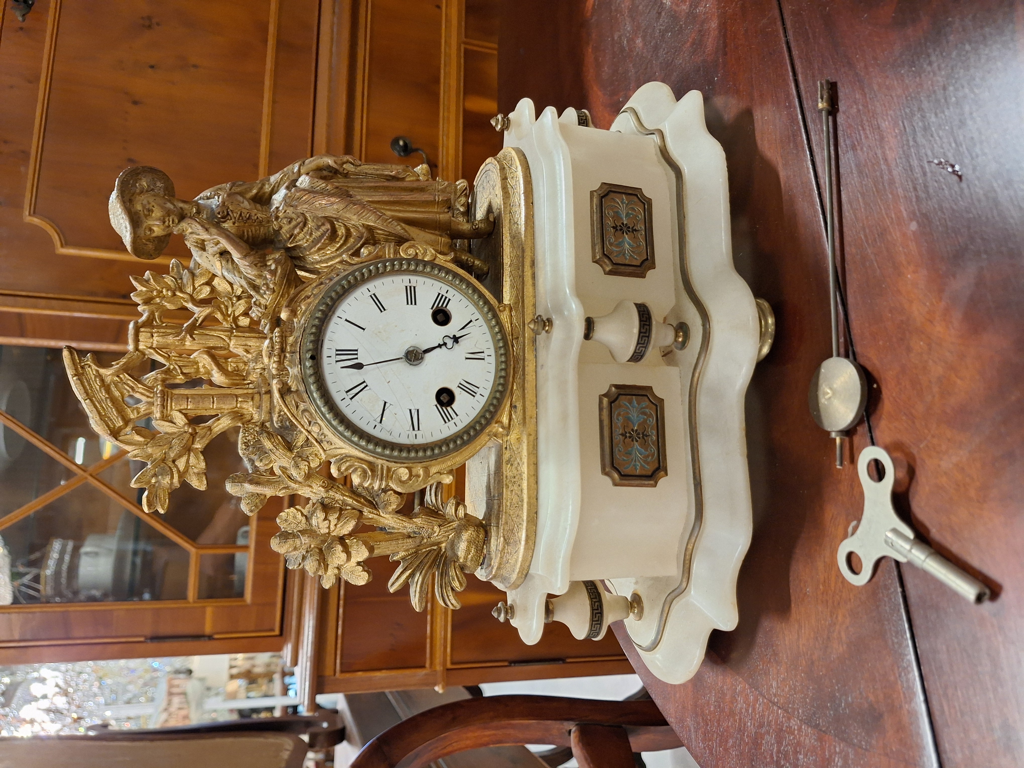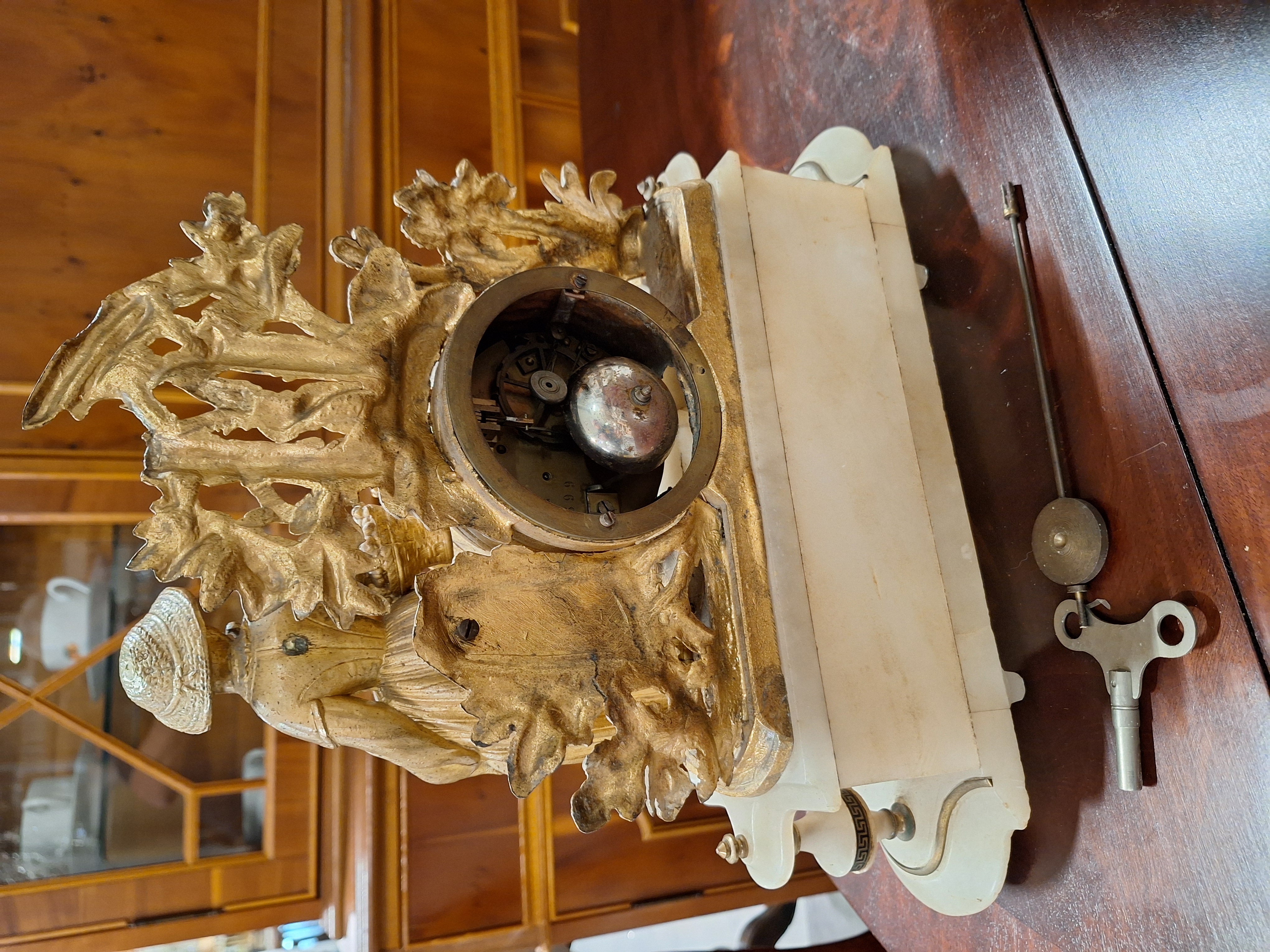 Zegar braz art. + bialy marmur, mechaniz numerowany "Kobieta w kapeluszu z koszem owocow" - H:32cm, L:34cm - komplet z wahadlem i kluczykiem 5931 - Zegar braz art. + bialy marmur, mechaniz numerowany "Kobieta w kapeluszu z koszem owocow" - H:32cm, L:34cm - komplet z wahadlem i kluczykiem