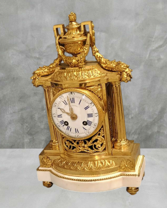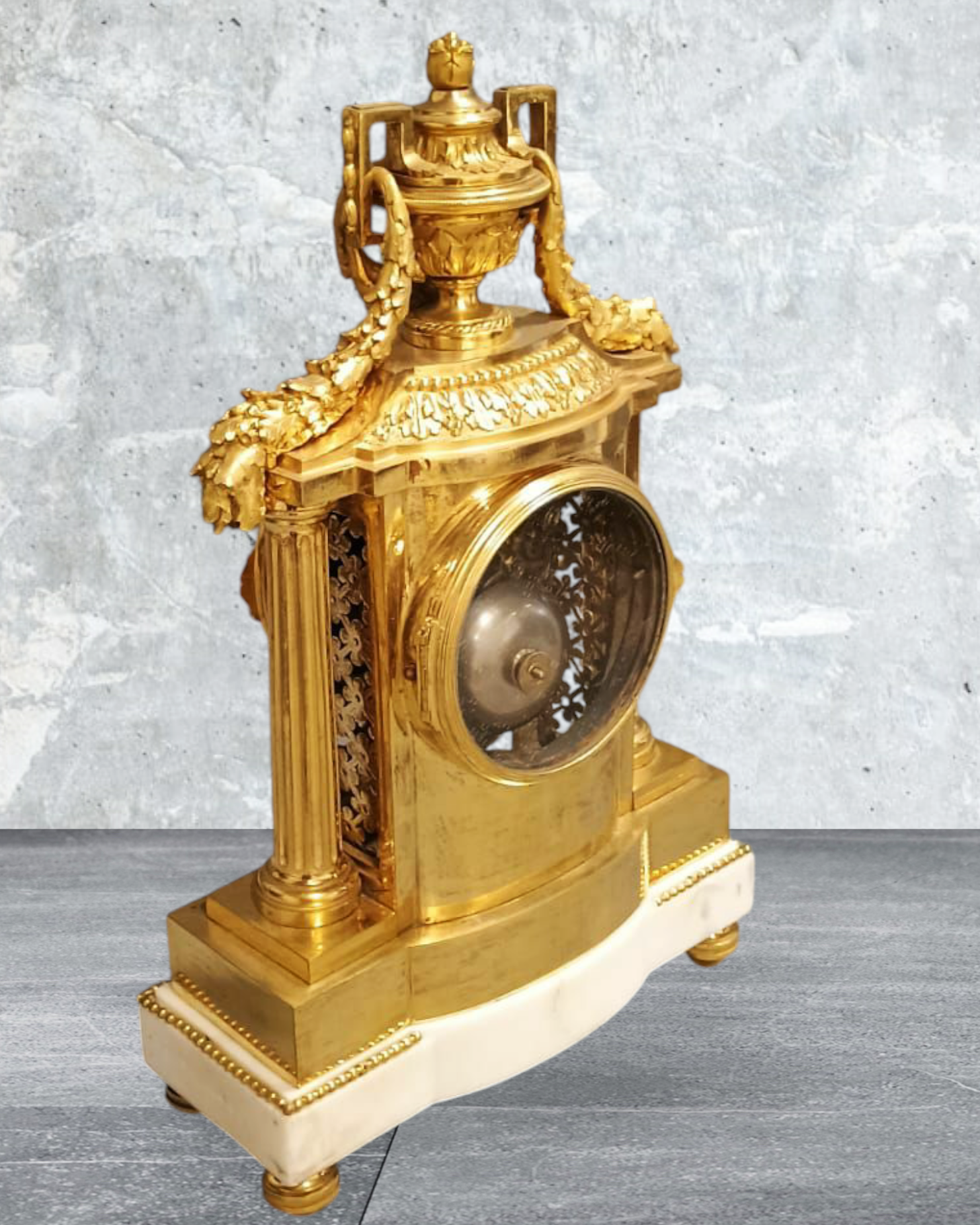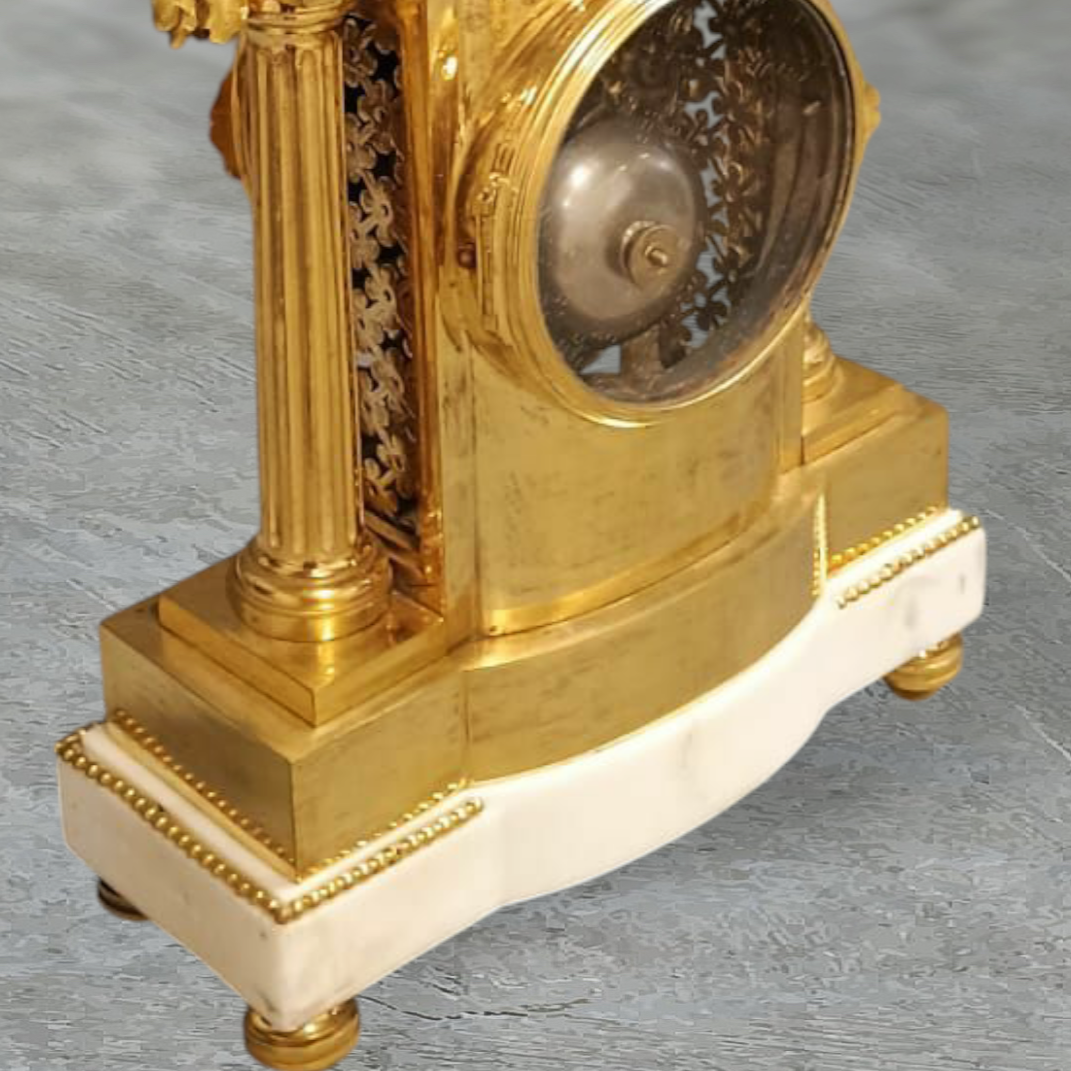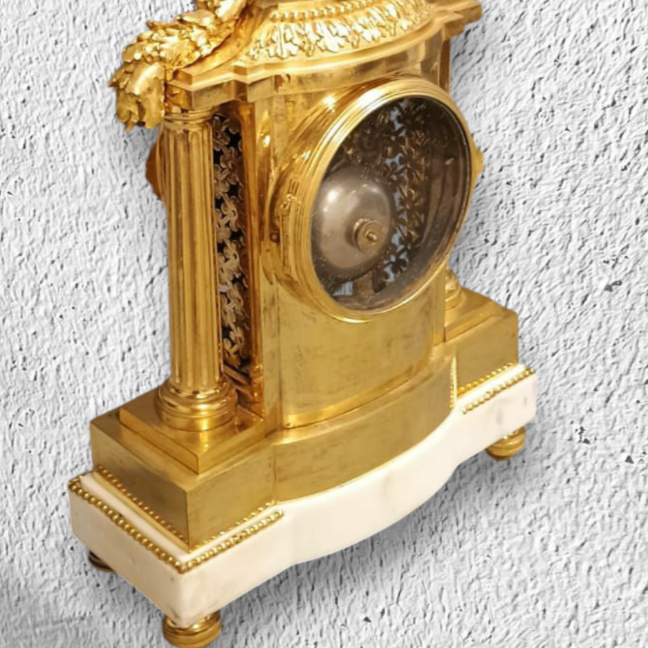 Zegar kominkowy, styl Ludwik XVI . Obudowa oryginalna z epoki, brąz złocony. Przykład wysokiej jakości pracy rzemieślniczej, perfekcyjnie wypracowana cyzelka, precyzyjnie wykonane ornamenty z wyjątkową dbałością o detale.
