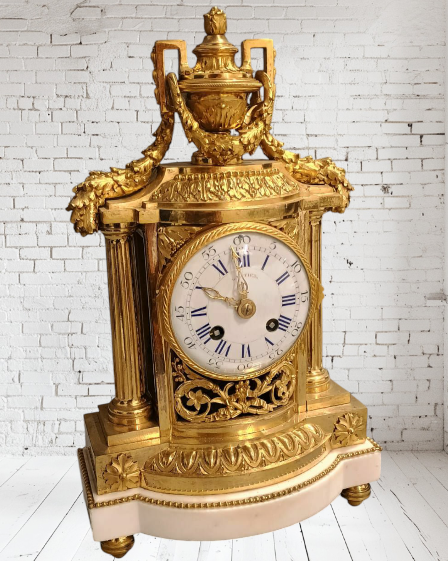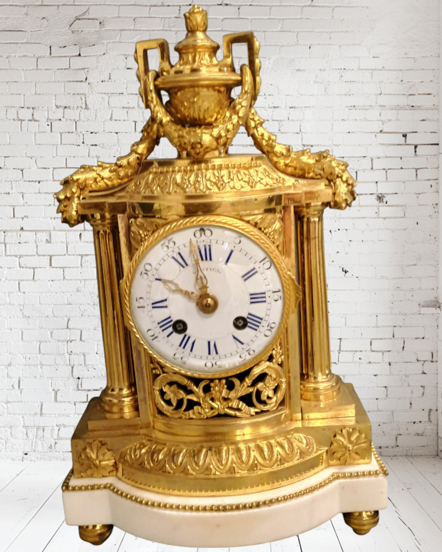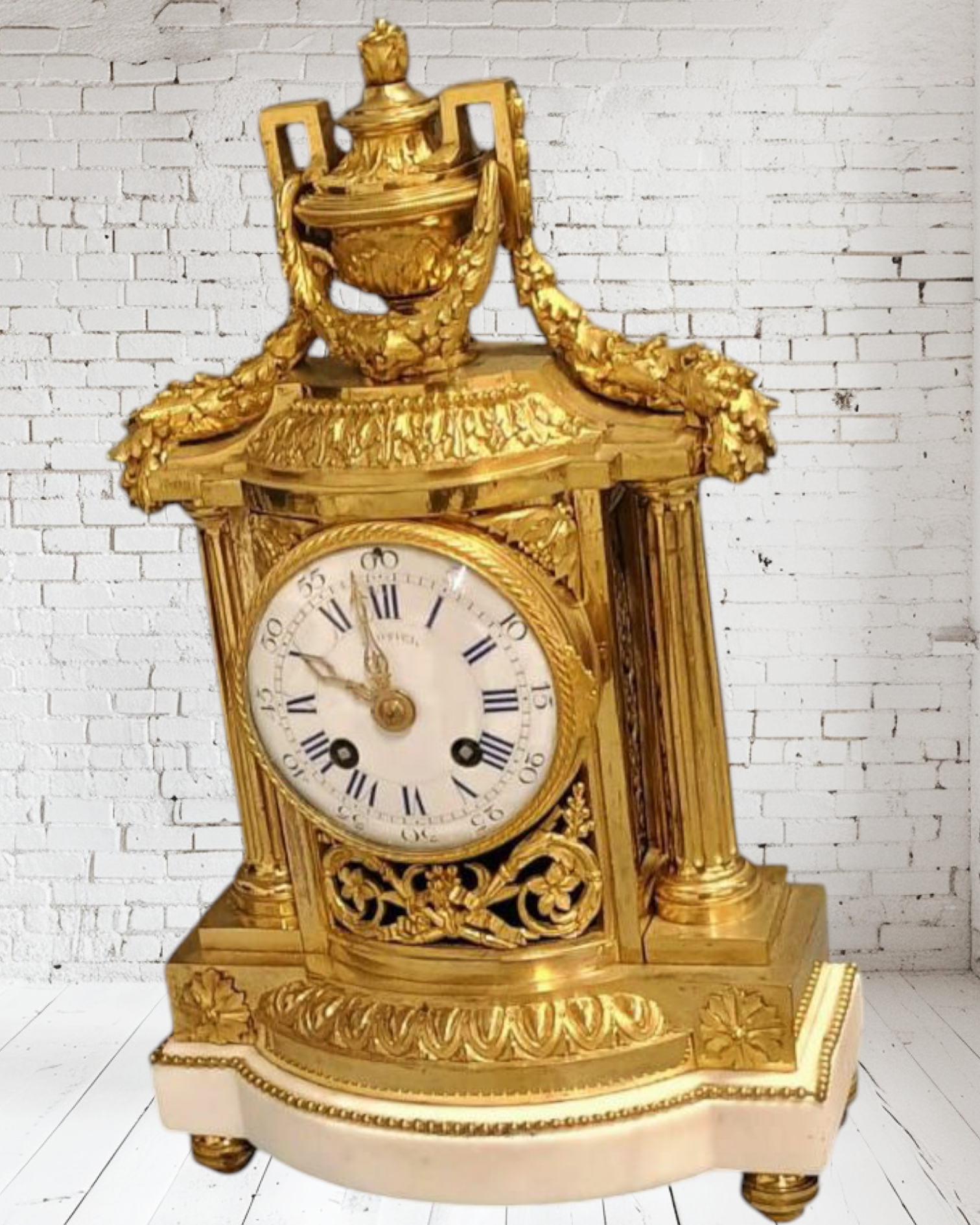 Zegar kominkowy, styl Ludwik XVI . Obudowa oryginalna z epoki, brąz złocony. Przykład wysokiej jakości pracy rzemieślniczej, perfekcyjnie wypracowana cyzelka, precyzyjnie wykonane ornamenty z wyjątkową dbałością o detale.