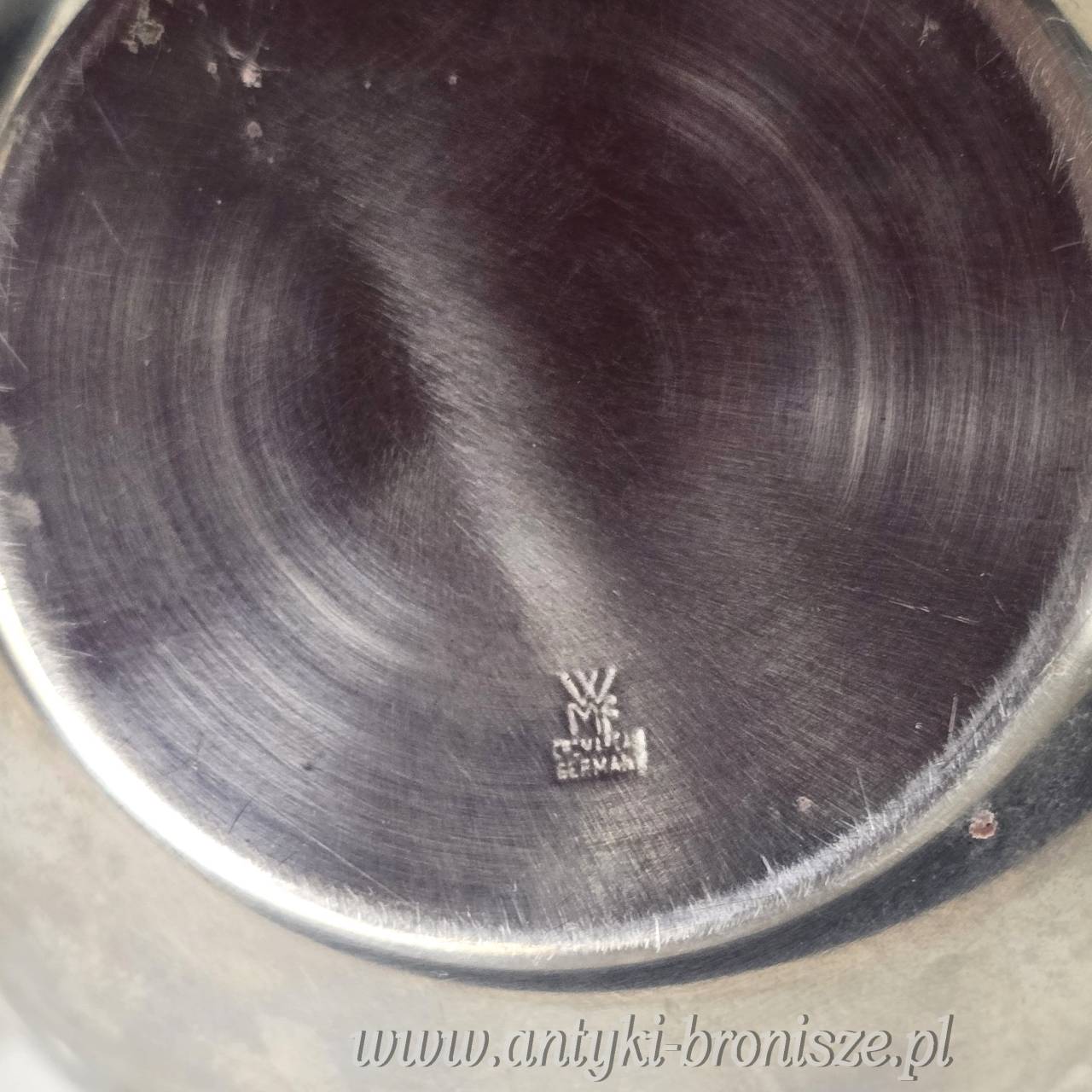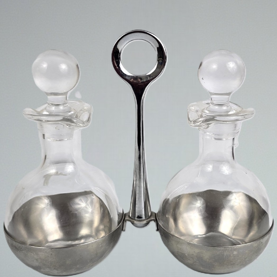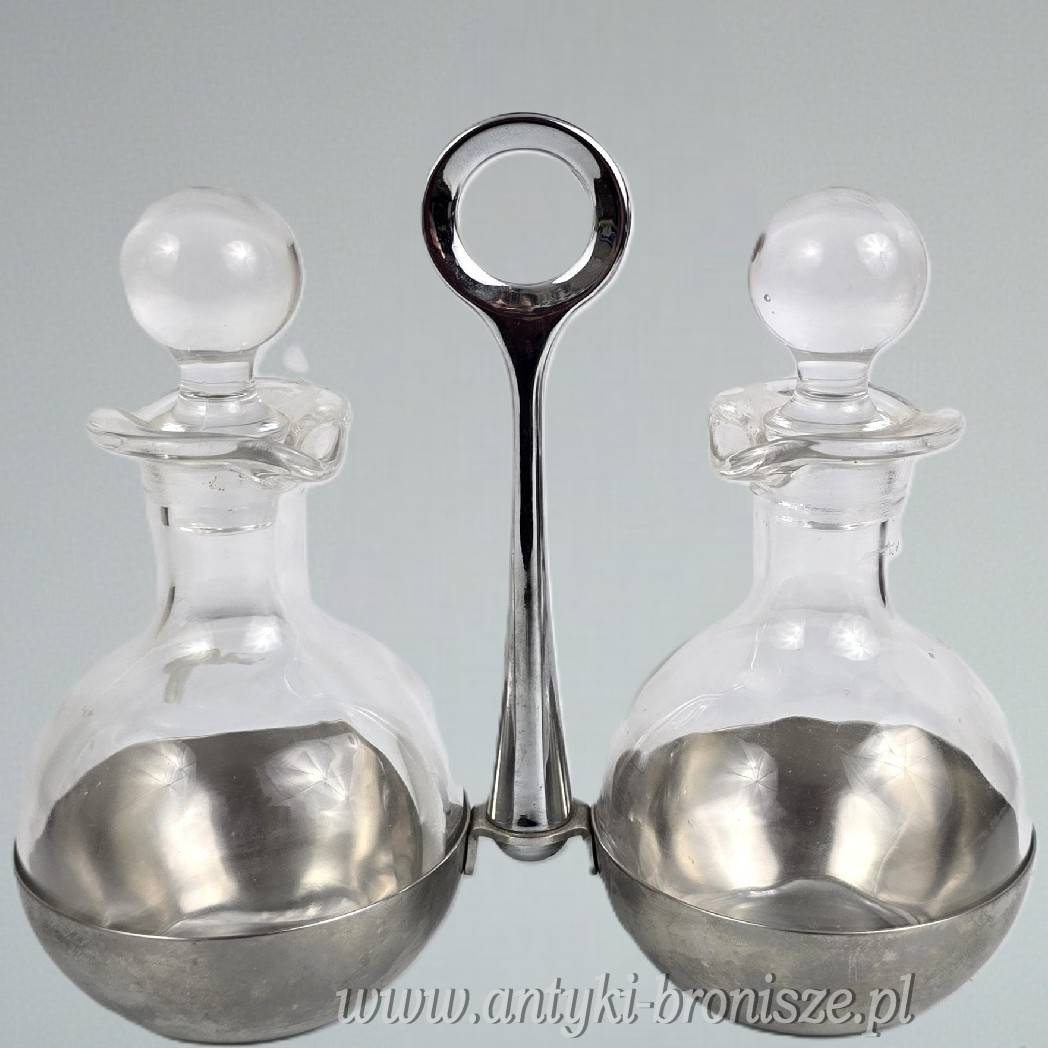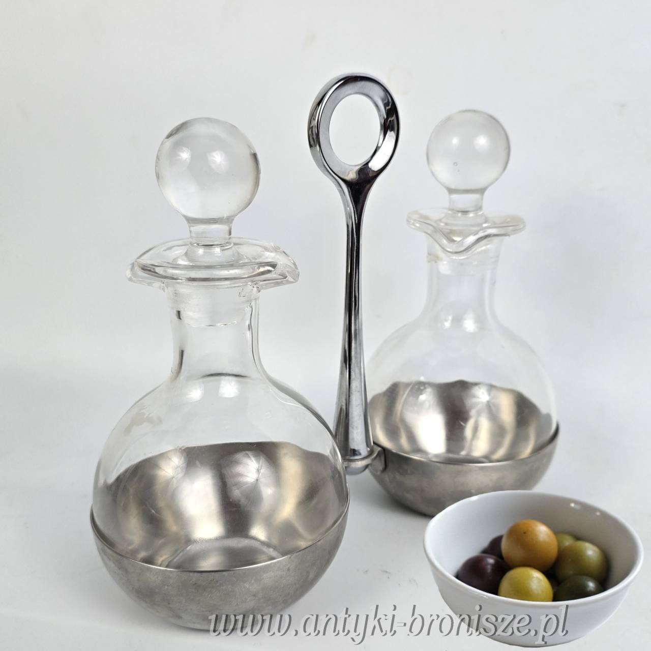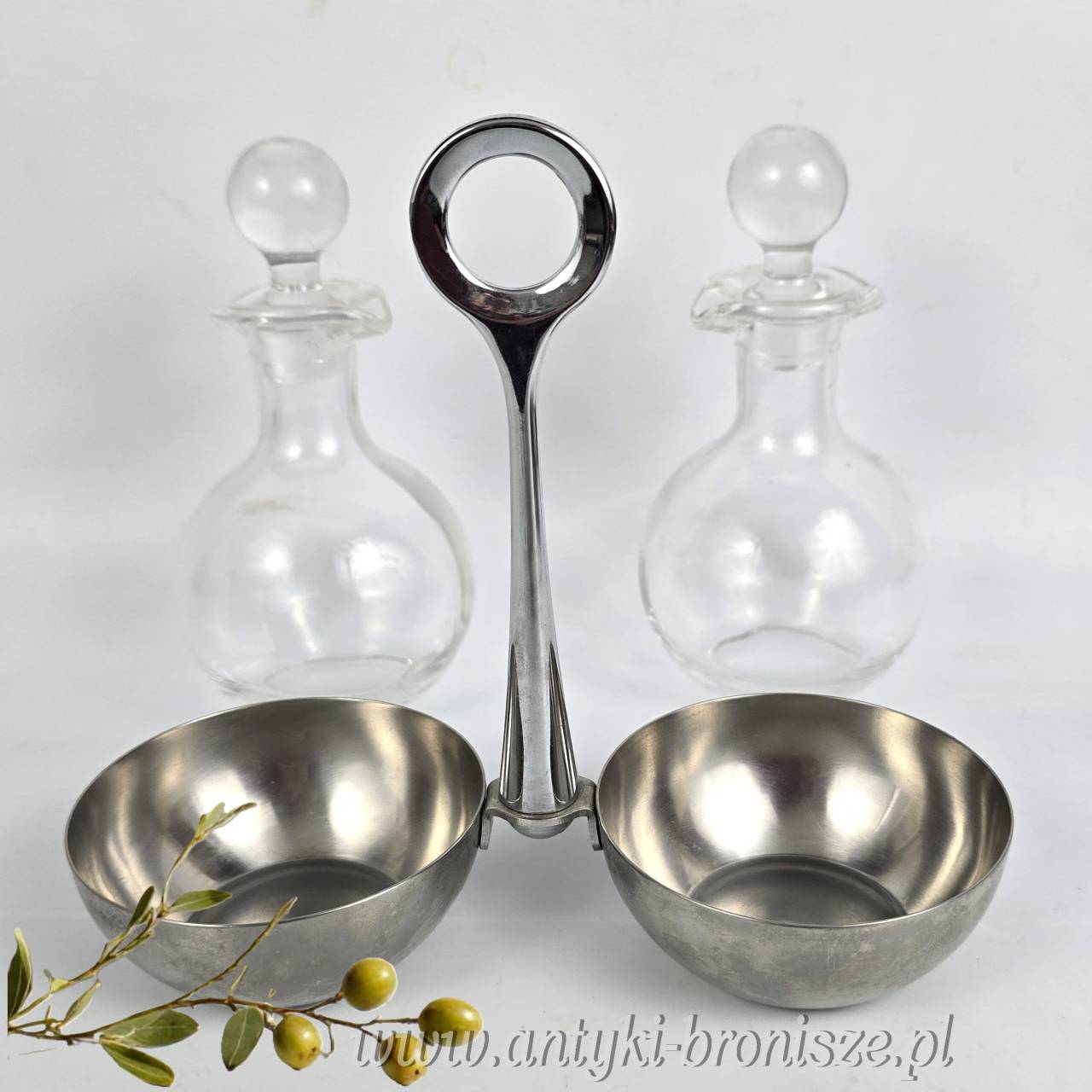 Nowoczesny design z połowy ubiegłego wieku, sygnowany znakiem słynnej niemieckiej wytwórni WMF. Zestaw składa się ze szklanych butelek z korkami umieszczonych w stojaku wykonanym z wysokiej jakości stali nierdzewnej Cromargan ( patent WMF od 1930r. ).